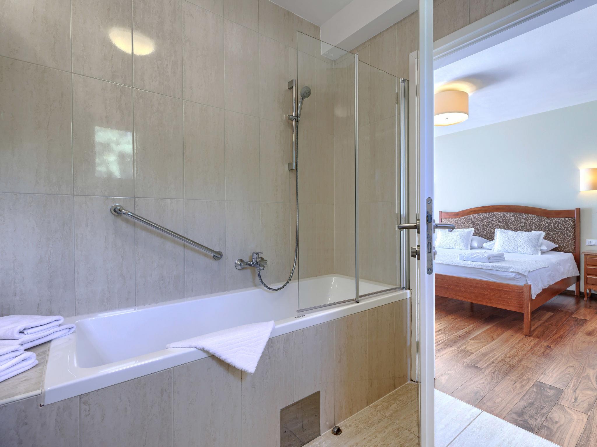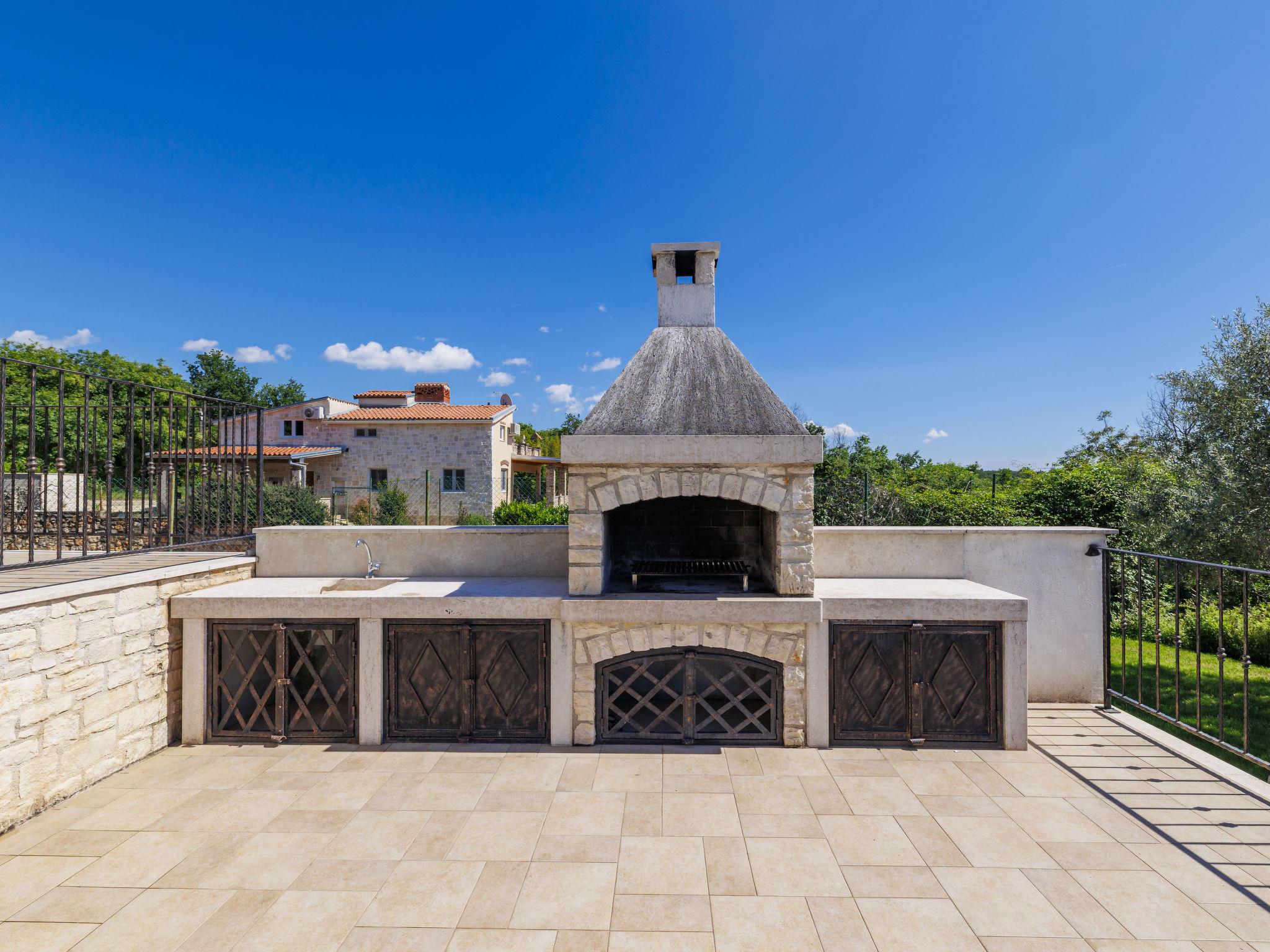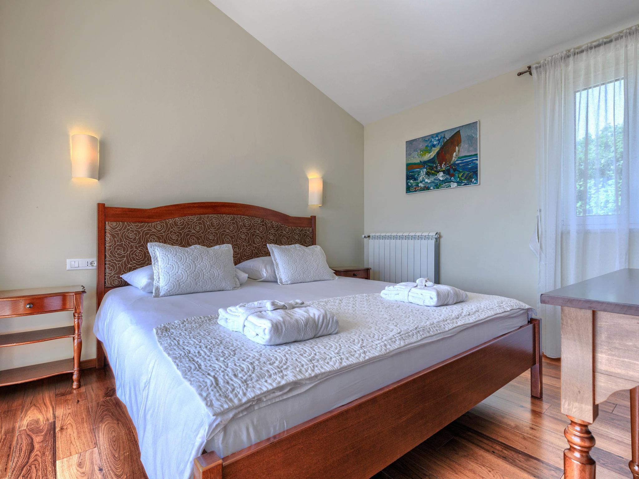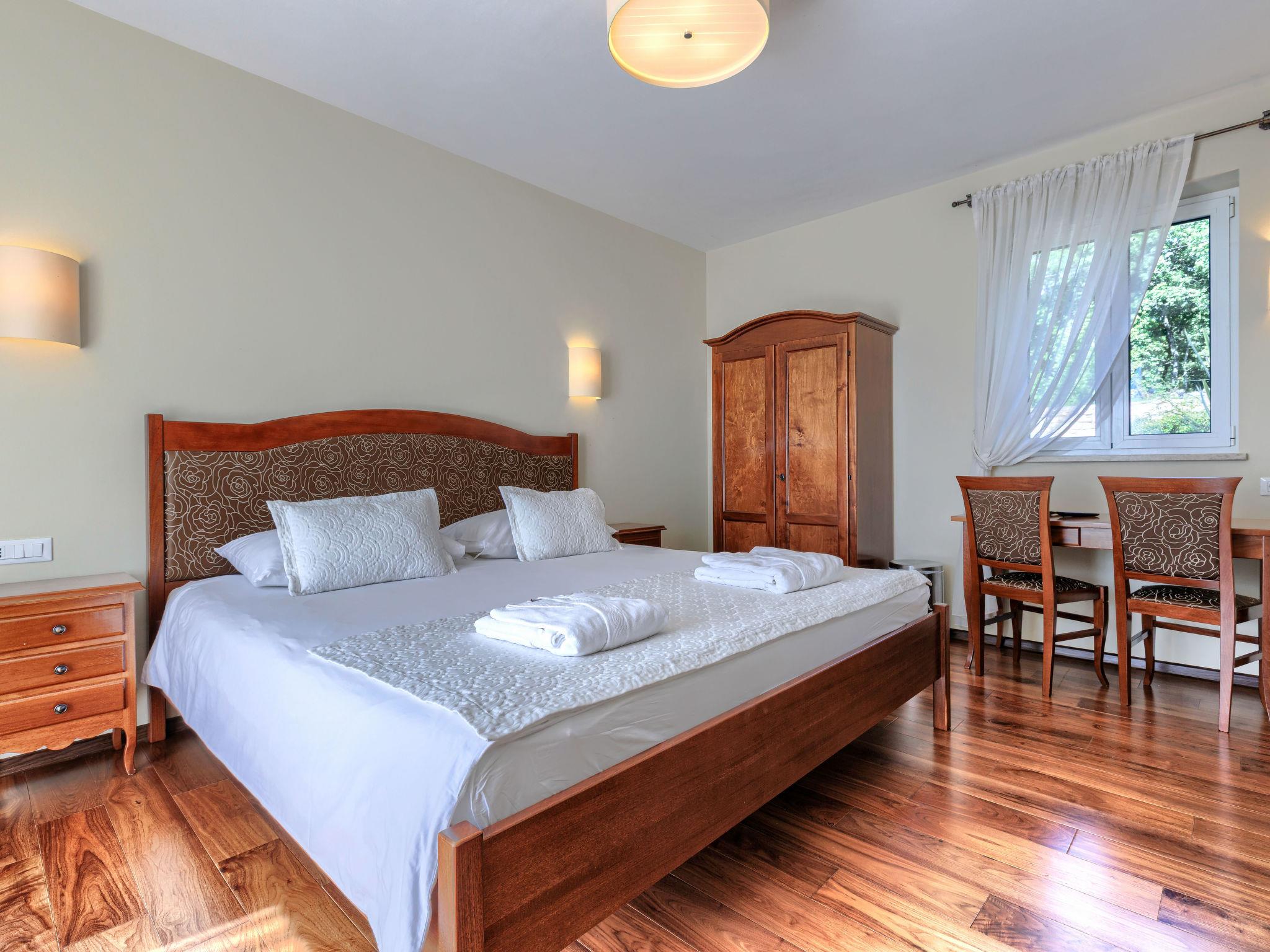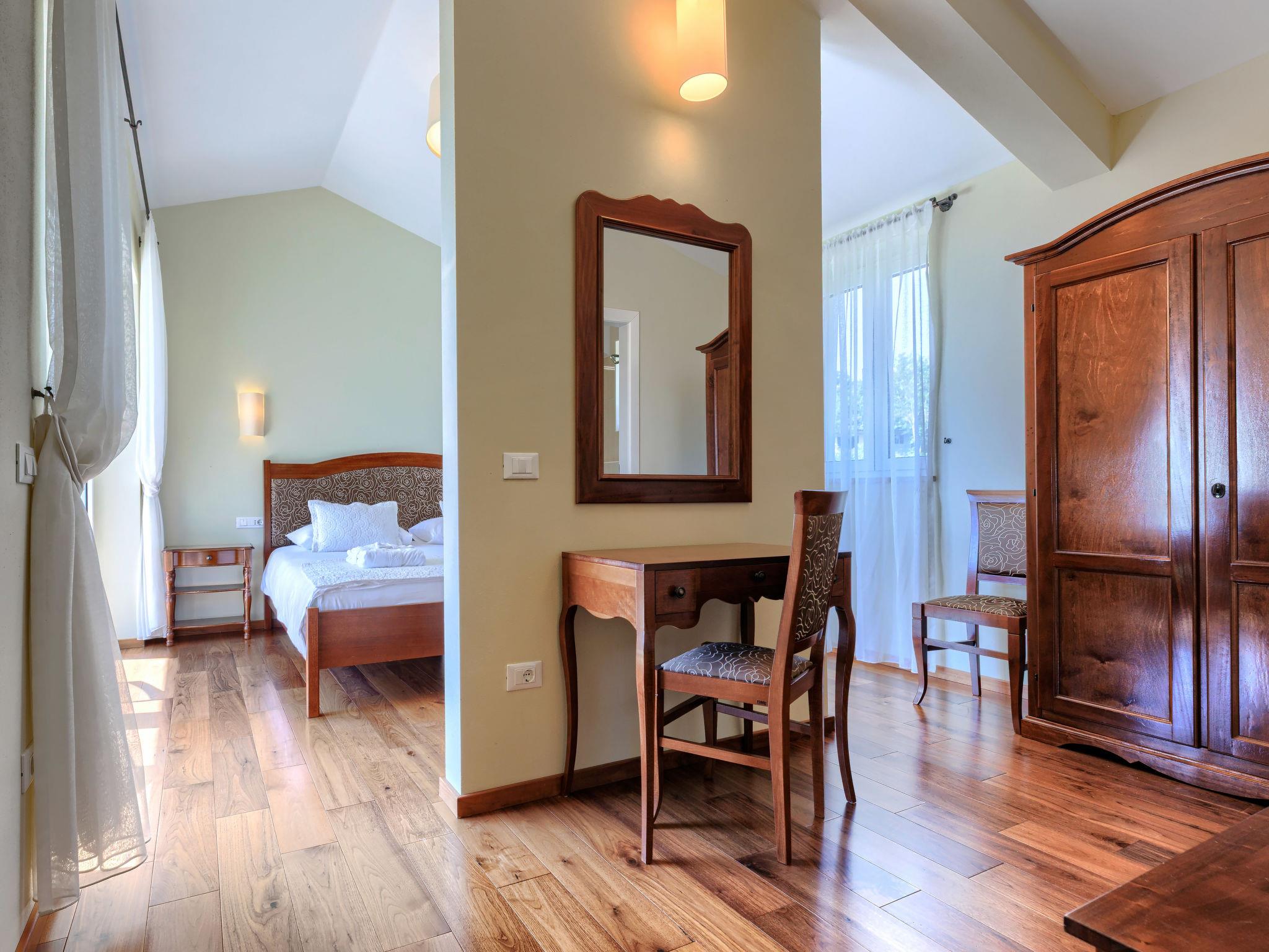Beautiful villa "Babudri", 2 storeys. In the hamlet Strpacici 2 km from the centre of Višnjan, 12 km from the centre of Porec, in a sunny position, 15 km from the sea, 15 km from the beach. Private: property 1'120 m2 (fenced) with lawn, swimming pool angular, heated (4 x 8 m, depth 140 cm, seasonal availability: 01.May. - 01.Nov.) with internal staircase. Outdoor shower, hot tub, garden furniture, barbecue. In the house: internet access, sauna, washing machine, tumble dryer. Parking (for 3 cars) at the house on the premises. Supermarket 2 km, restaurant 2 km, bus stop 3 km, pebble beach 15 km, rocky beach 15 km. Walking paths from the house 100 m, cycle lane 150 m. Swimming pool heated (extra).