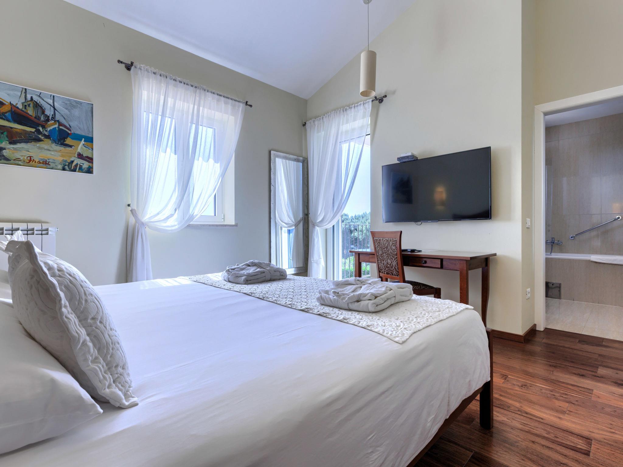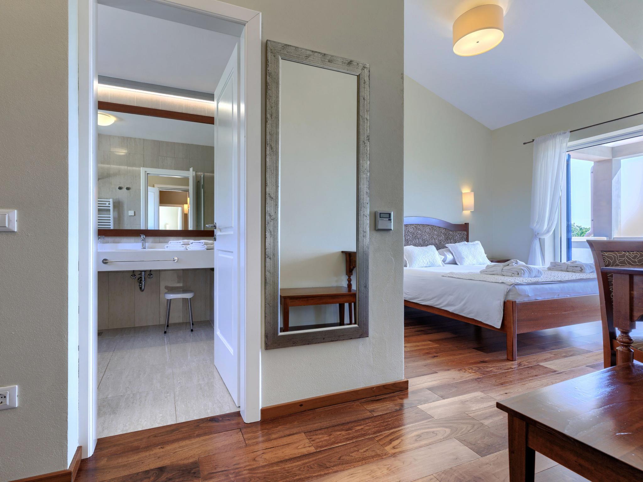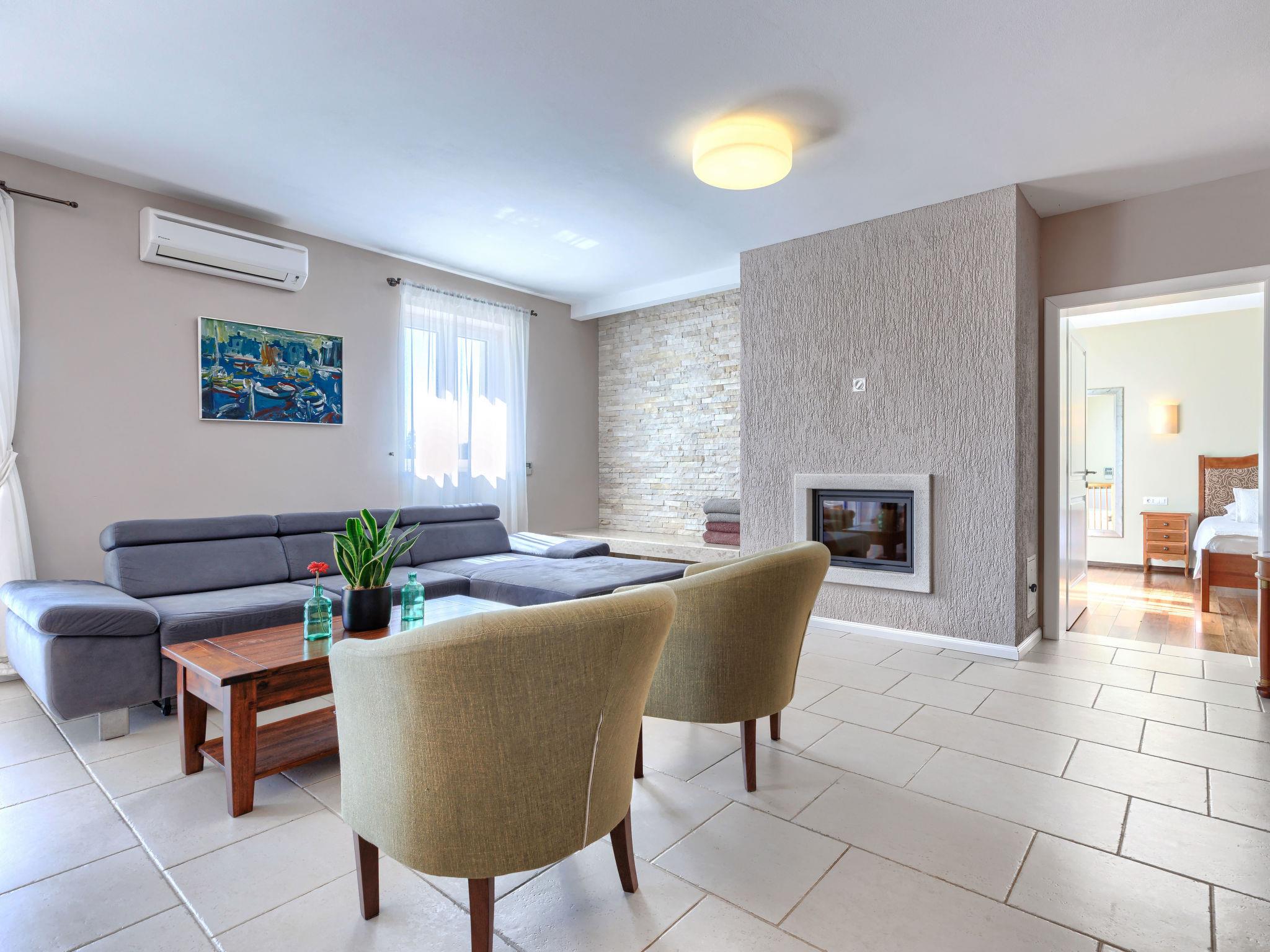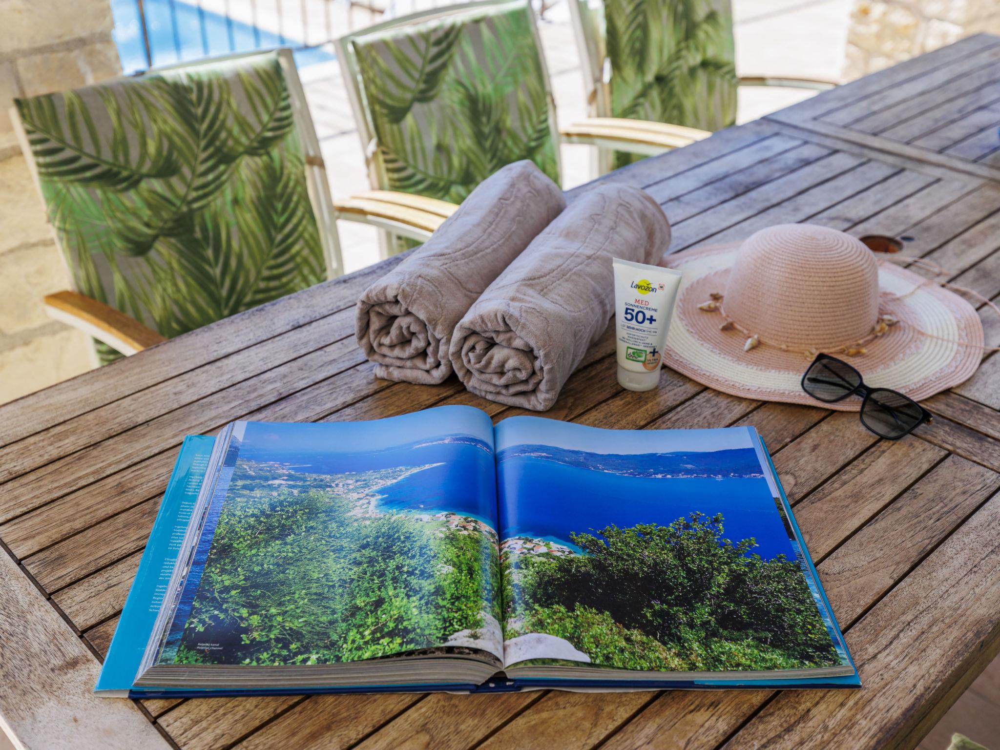 6-room villa 250 m2 on 2 levels. Tasteful and cosy furnishings: living/dining room with 1 double sofabed (180 cm, length 200 cm), open-hearth fireplace (only for decoration), satellite TV and air conditioning. Exit to the terrace. 1 room with 1 french bed (200 cm, length 210 cm), bath/WC, double hand-basin, satellite TV and air conditioning. Exit to the swimming pool. Open kitchen (oven, dishwasher, 4 ceramic glass hob hotplates, kettle, microwave, freezer, electric coffee machine). Sep. WC. Upper floor: 1 room with 1 french bed (200 cm, length 210 cm), bath/bidet/WC, double hand-basin, satellite TV and air conditioning. Exit to the terrace. 1 room with 1 french bed (200 cm, length 210 cm), bath/WC, double hand-basin, satellite TV and air conditioning. Exit to the terrace. 1 room with 1 french bed (200 cm, length 210 cm), bath/bidet/WC, double hand-basin, satellite TV and air conditioning. Exit to the terrace. Floor heating, forced-air heating. 2 terraces 3 m2, terrace 12 m2. Terrace furniture, deck chairs. Distant view of the sea. Facilities: safe, iron, mosquito net, children's high chair, baby cot, hair dryer. Internet (WiFi, free). Maximum 1 pet/ dog allowed.