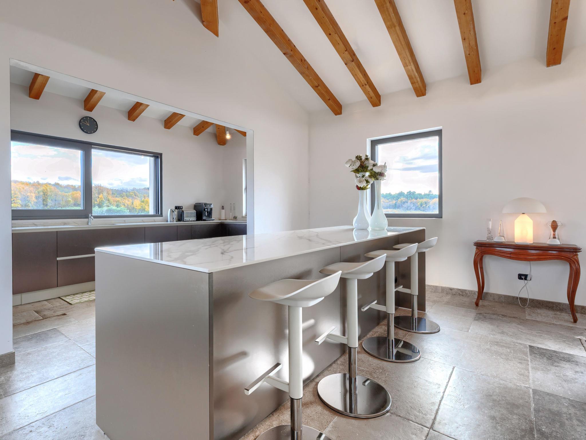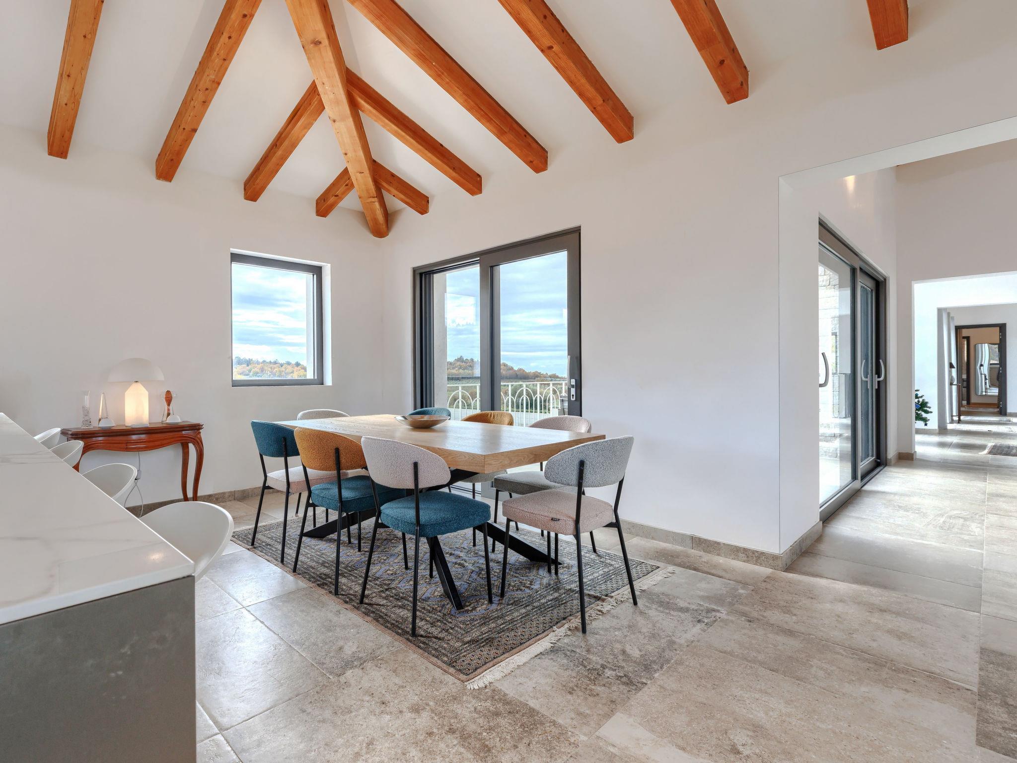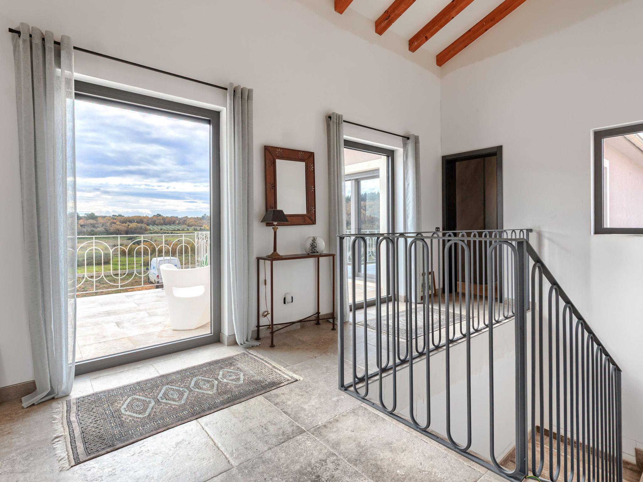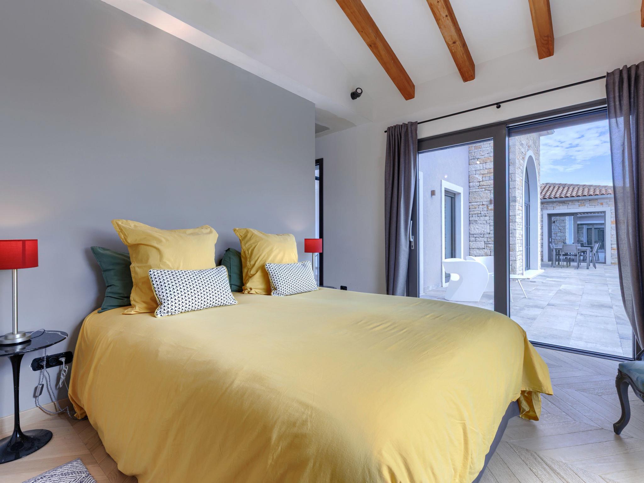 5-room villa 400 m2 on 2 levels. Living/dining room with satellite TV (flat screen), air conditioning. Exit to the terrace. 1 room with 1 french bed (160 cm, length 200 cm), bath/shower/bidet/WC and satellite TV (flat screen), air conditioning. Open kitchen (oven, dishwasher, 4 induction hot plates, kettle, microwave, freezer, electric coffee machine). Sep. WC. On the lower ground floor: 3 rooms, each room with 1 french bed (160 cm, length 200 cm), bath/shower/bidet/WC and satellite TV (flat screen), air conditioning. Exit to the swimming pool. 1 room with 2 beds (80 cm, length 200 cm), satellite TV (flat screen), air conditioning. Exit to the swimming pool. View of the swimming pool and the countryside. Facilities: children's high chair, baby cot. Internet (WiFi, free).
