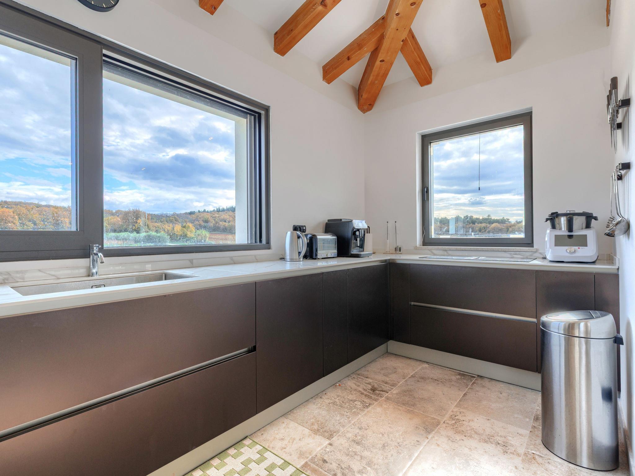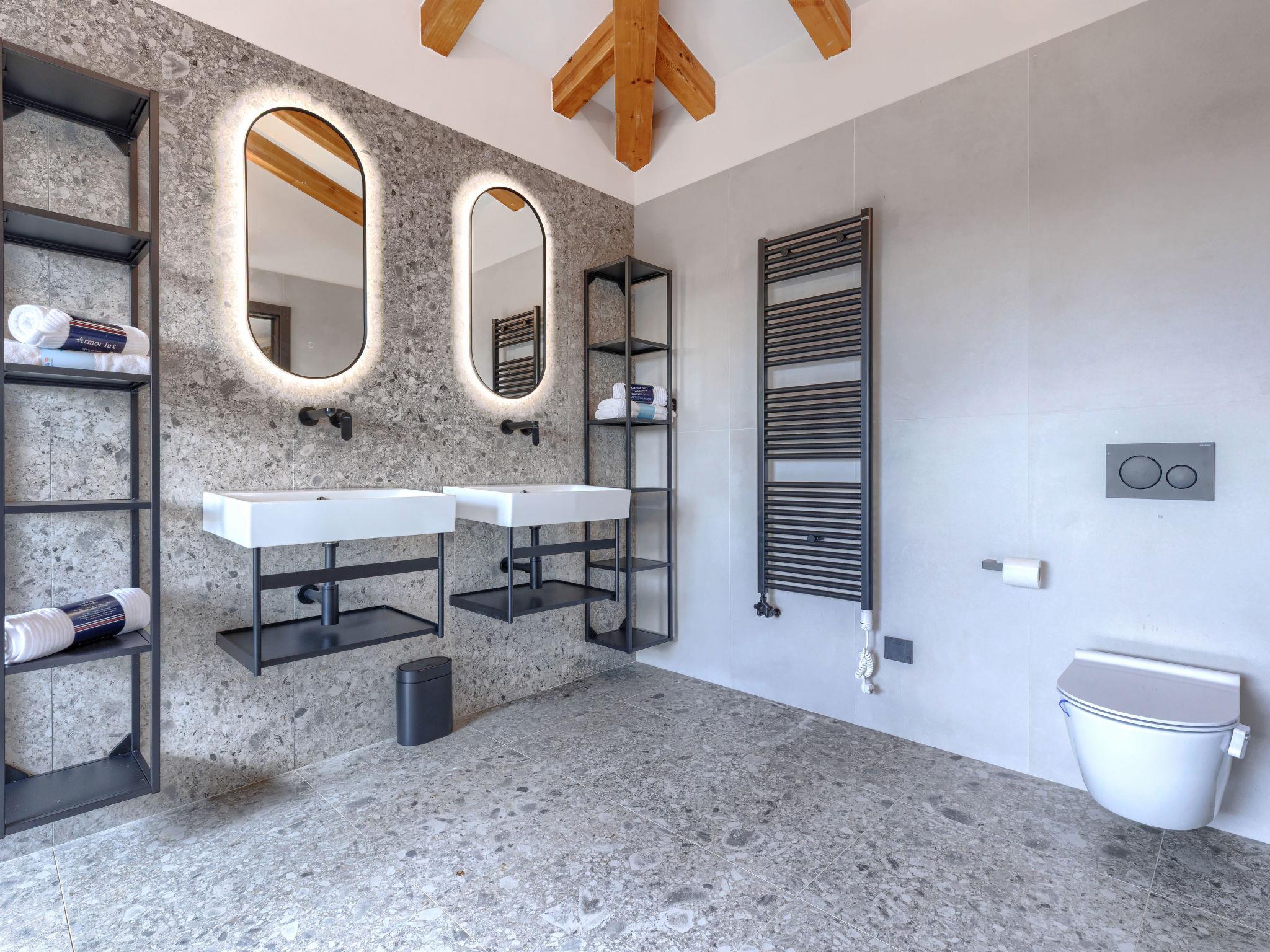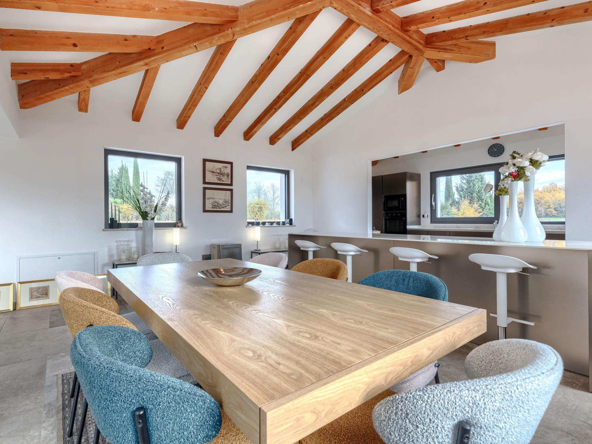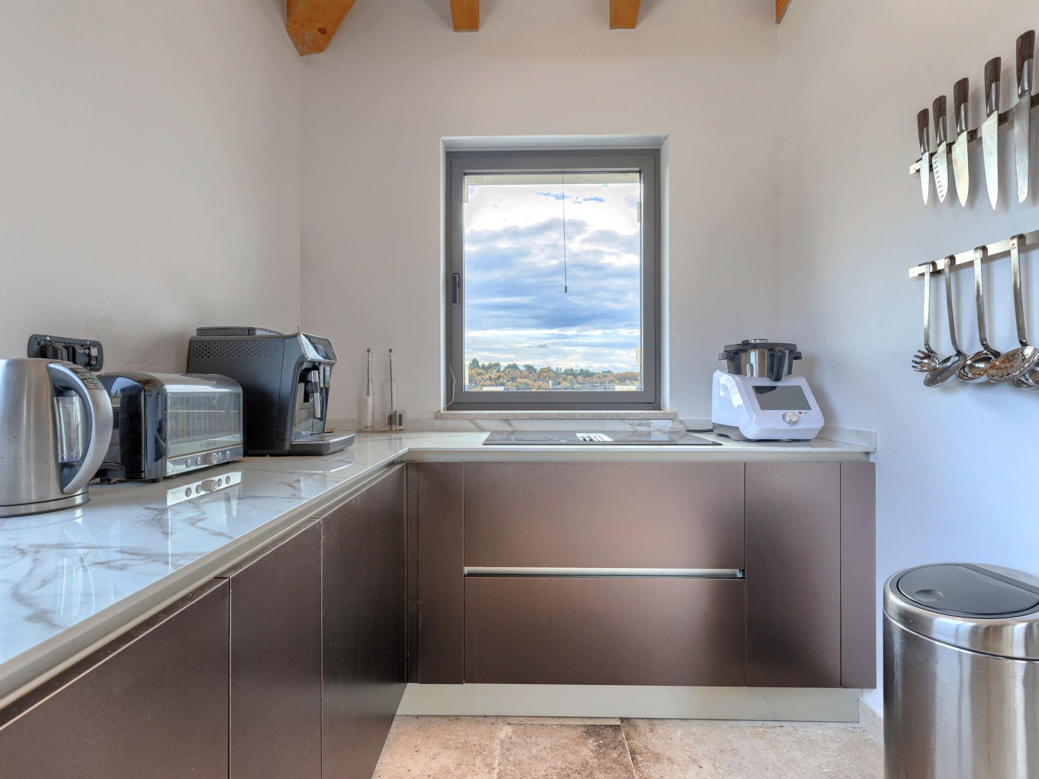 5-room villa 400 m2 on 2 levels. Living/dining room with satellite TV (flat screen), air conditioning. Exit to the terrace. 1 room with 1 french bed (160 cm, length 200 cm), bath/shower/bidet/WC and satellite TV (flat screen), air conditioning. Open kitchen (oven, dishwasher, 4 induction hot plates, kettle, microwave, freezer, electric coffee machine). Sep. WC. On the lower ground floor: 3 rooms, each room with 1 french bed (160 cm, length 200 cm), bath/shower/bidet/WC and satellite TV (flat screen), air conditioning. Exit to the swimming pool. 1 room with 2 beds (80 cm, length 200 cm), satellite TV (flat screen), air conditioning. Exit to the swimming pool. View of the swimming pool and the countryside. Facilities: children's high chair, baby cot. Internet (WiFi, free).