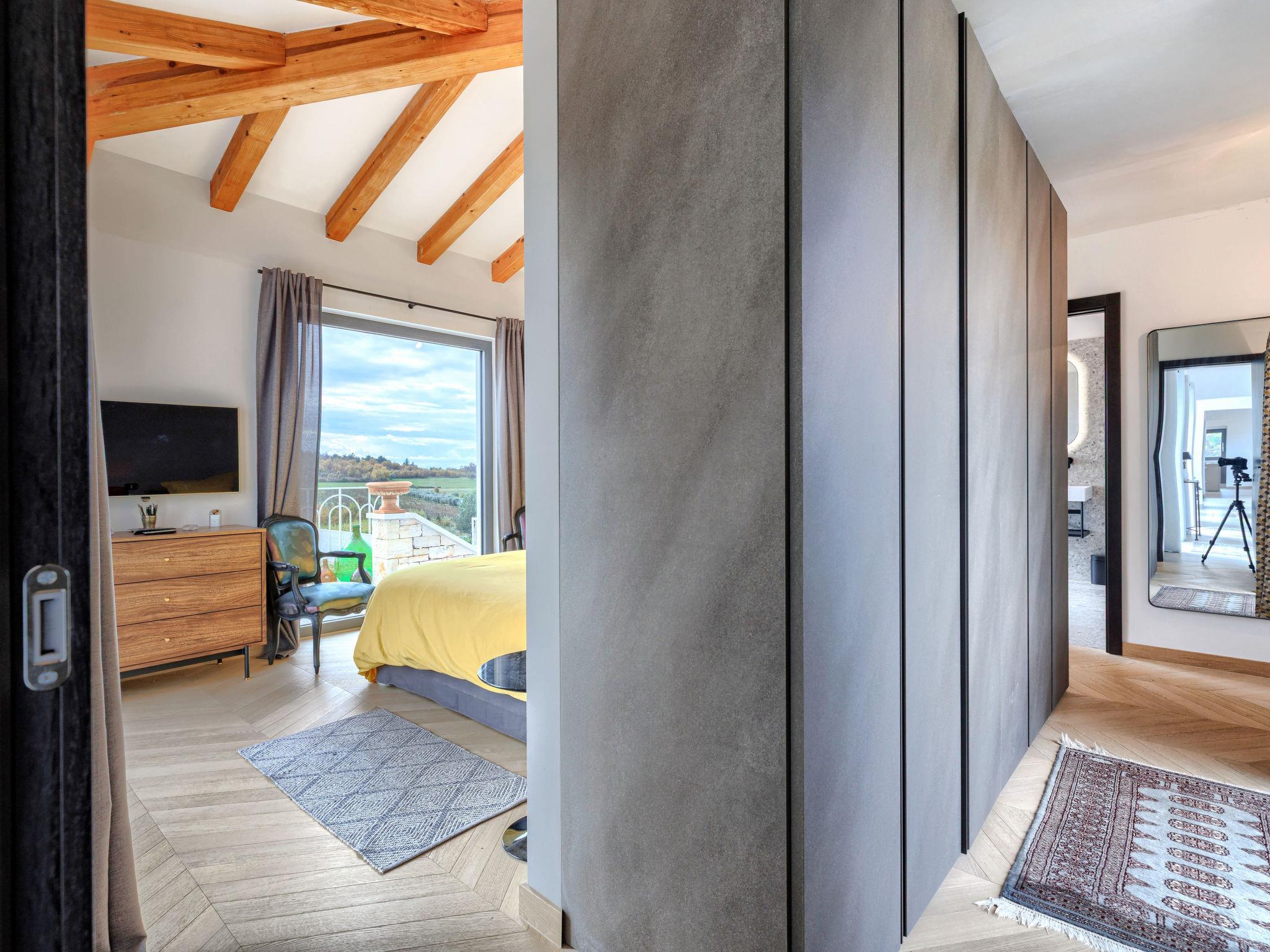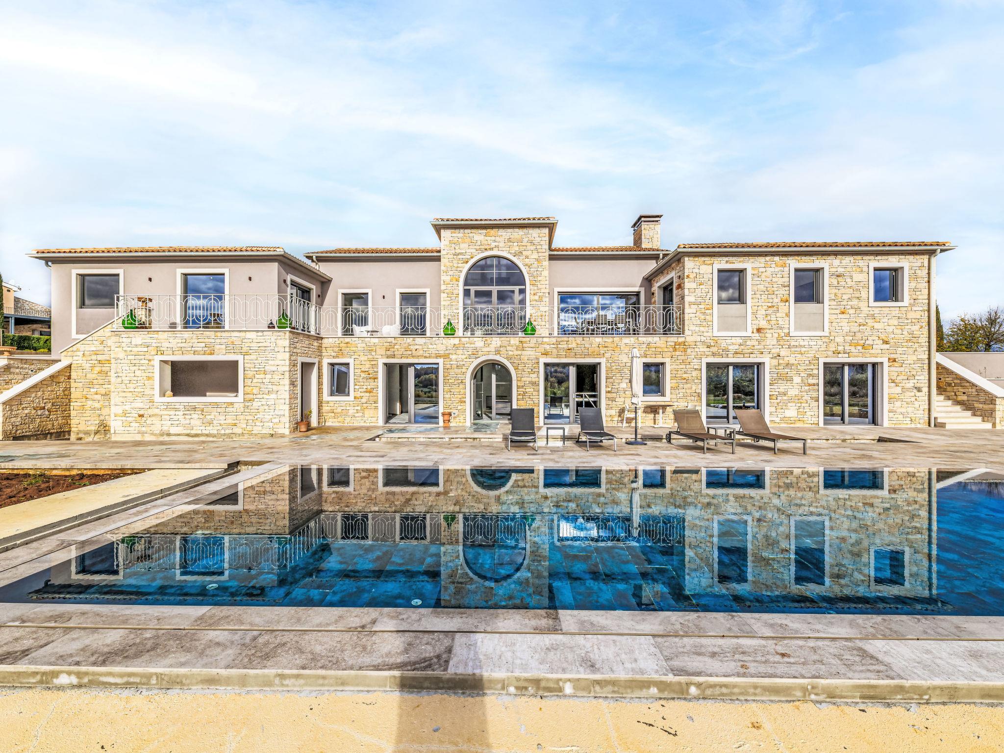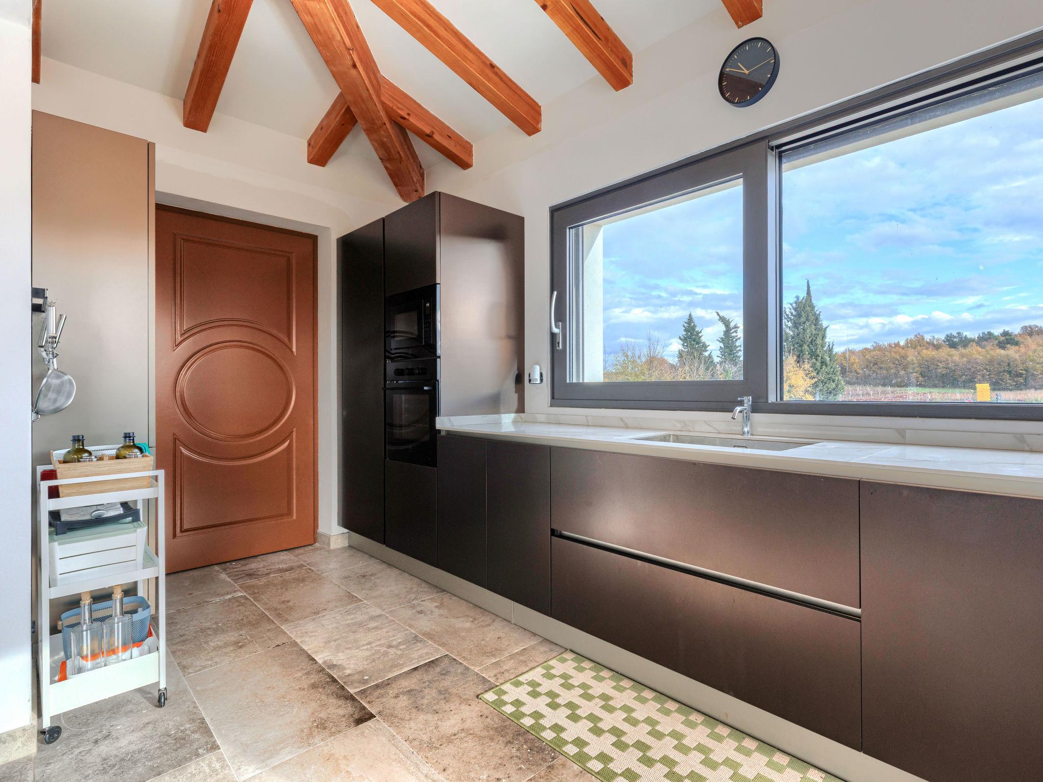 Luxurious villa "Maison Paradis", 2 storeys. In the hamlet Bacva 3 km from the centre of Višnjan, 12 km from the centre of Porec, in a sunny position, 15 km from the sea, 15 km from the beach. Private: property 3'100 m2 (fenced) with lawn, swimming pool angular, heated (12 x 5 m, depth 200 cm, seasonal availability: 01.May. - 01.Nov.) with internal staircase and salt-electrolysis pool-cleaning system. Outdoor shower, hot tub, garden furniture, barbecue. In the house: internet access, sauna, washing machine, tumble dryer. Parking (for 4 cars) at the house on the premises. Shop 3 km, supermarket 12 km, restaurant 100 m, bus stop 3 km, pebble beach 15 km, rocky beach 15 km. Walking paths from the house 100 m, cycle lane 150 m. Swimming pool heated (extra).