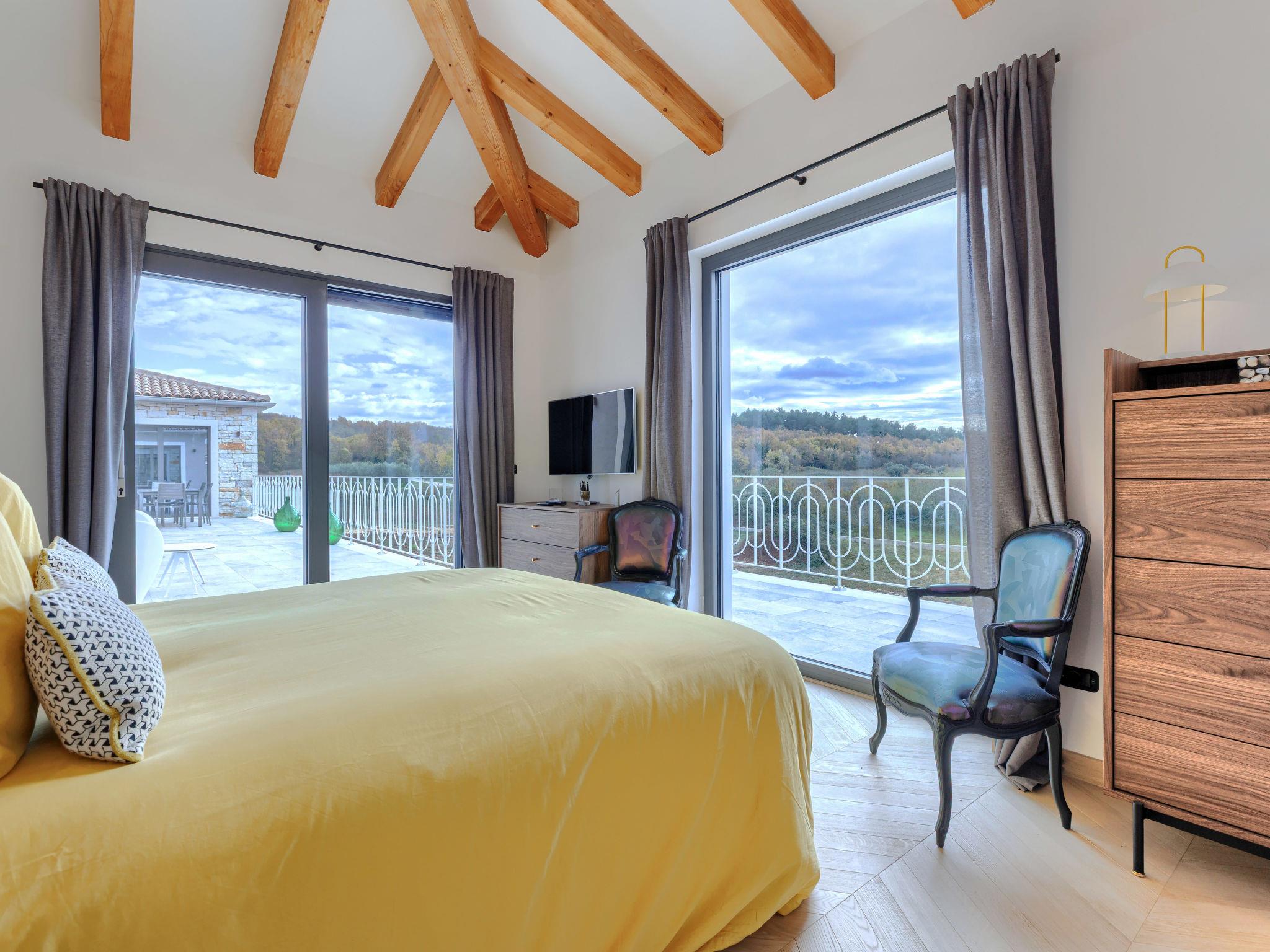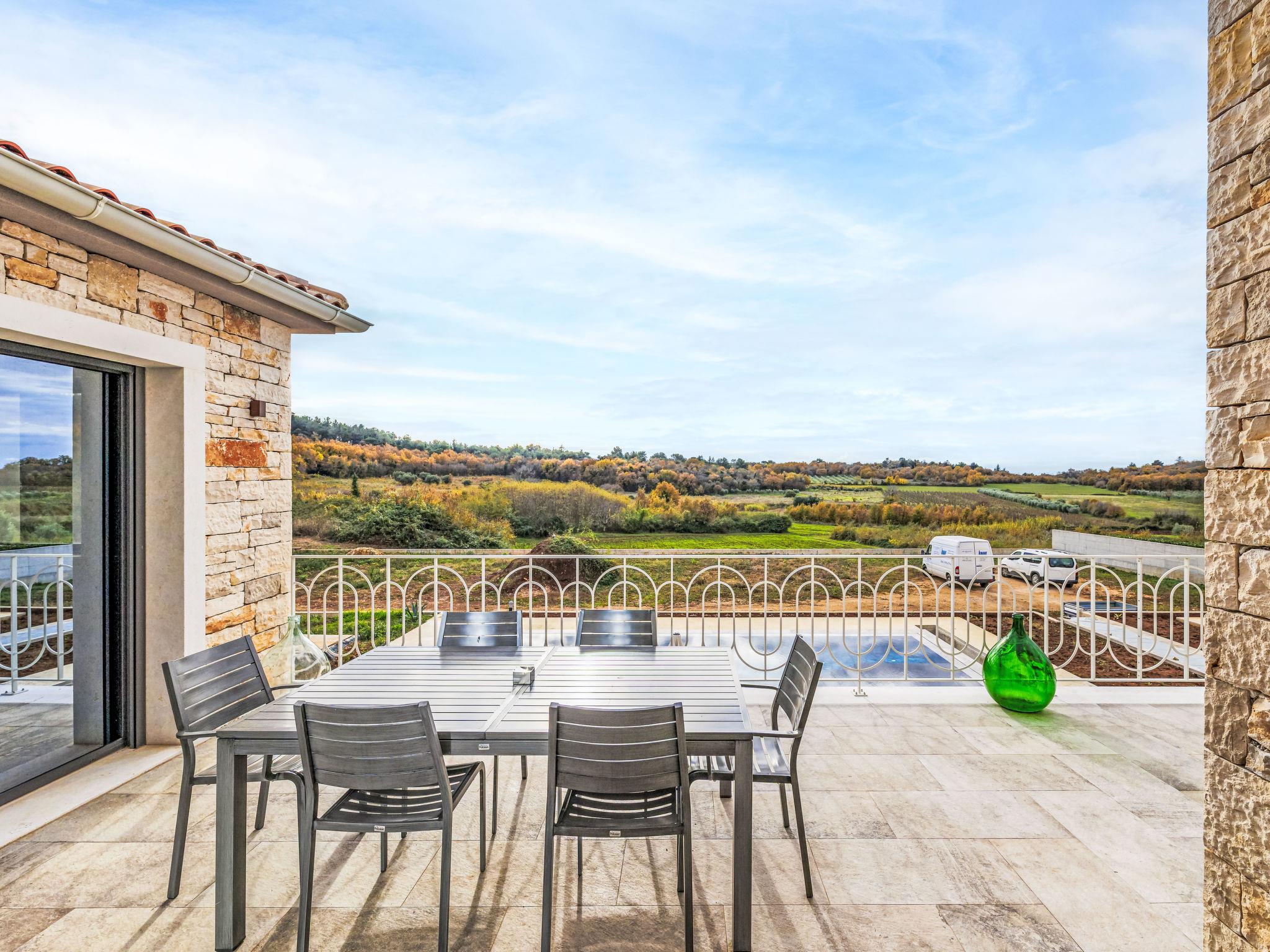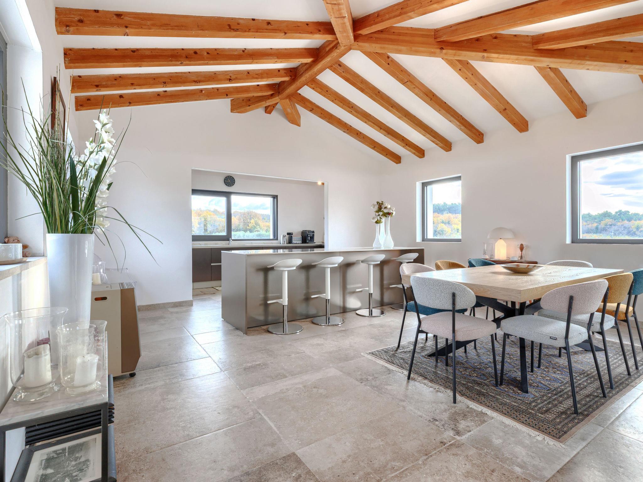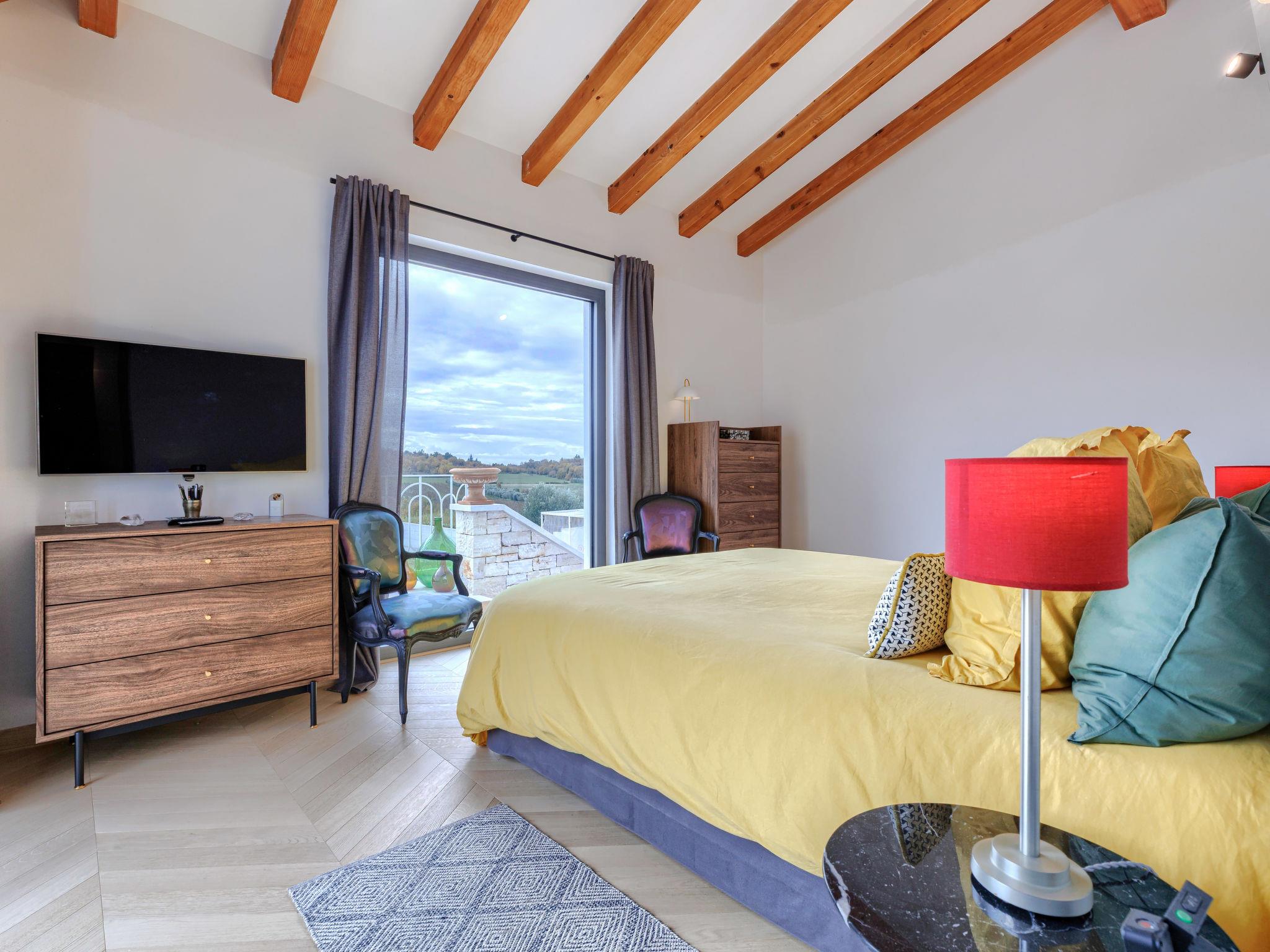 Luxurious villa "Maison Paradis", 2 storeys. In the hamlet Bacva 3 km from the centre of Višnjan, 12 km from the centre of Porec, in a sunny position, 15 km from the sea, 15 km from the beach. Private: property 3'100 m2 (fenced) with lawn, swimming pool angular, heated (12 x 5 m, depth 200 cm, seasonal availability: 01.May. - 01.Nov.) with internal staircase and salt-electrolysis pool-cleaning system. Outdoor shower, hot tub, garden furniture, barbecue. In the house: internet access, sauna, washing machine, tumble dryer. Parking (for 4 cars) at the house on the premises. Shop 3 km, supermarket 12 km, restaurant 100 m, bus stop 3 km, pebble beach 15 km, rocky beach 15 km. Walking paths from the house 100 m, cycle lane 150 m. Swimming pool heated (extra).