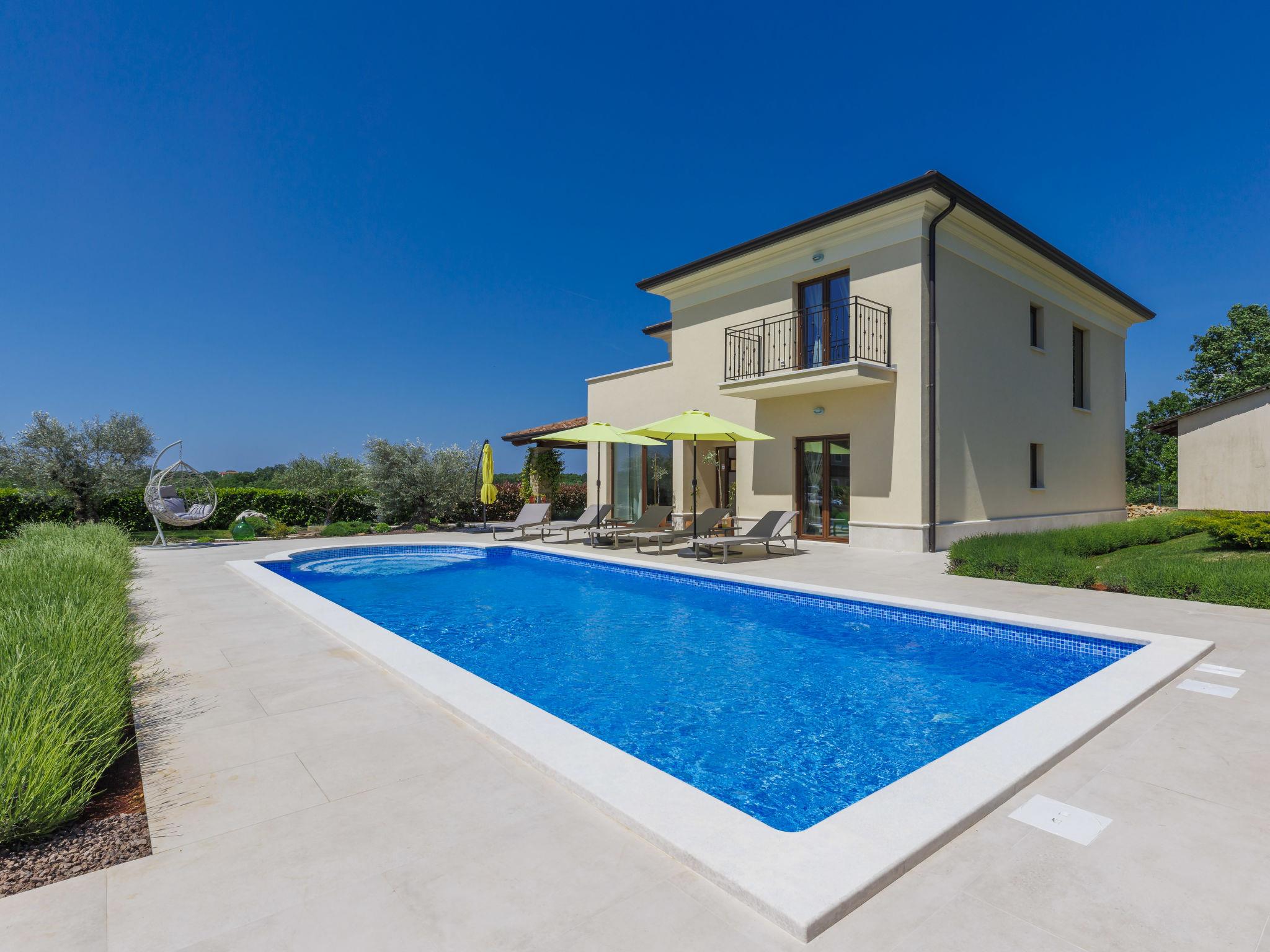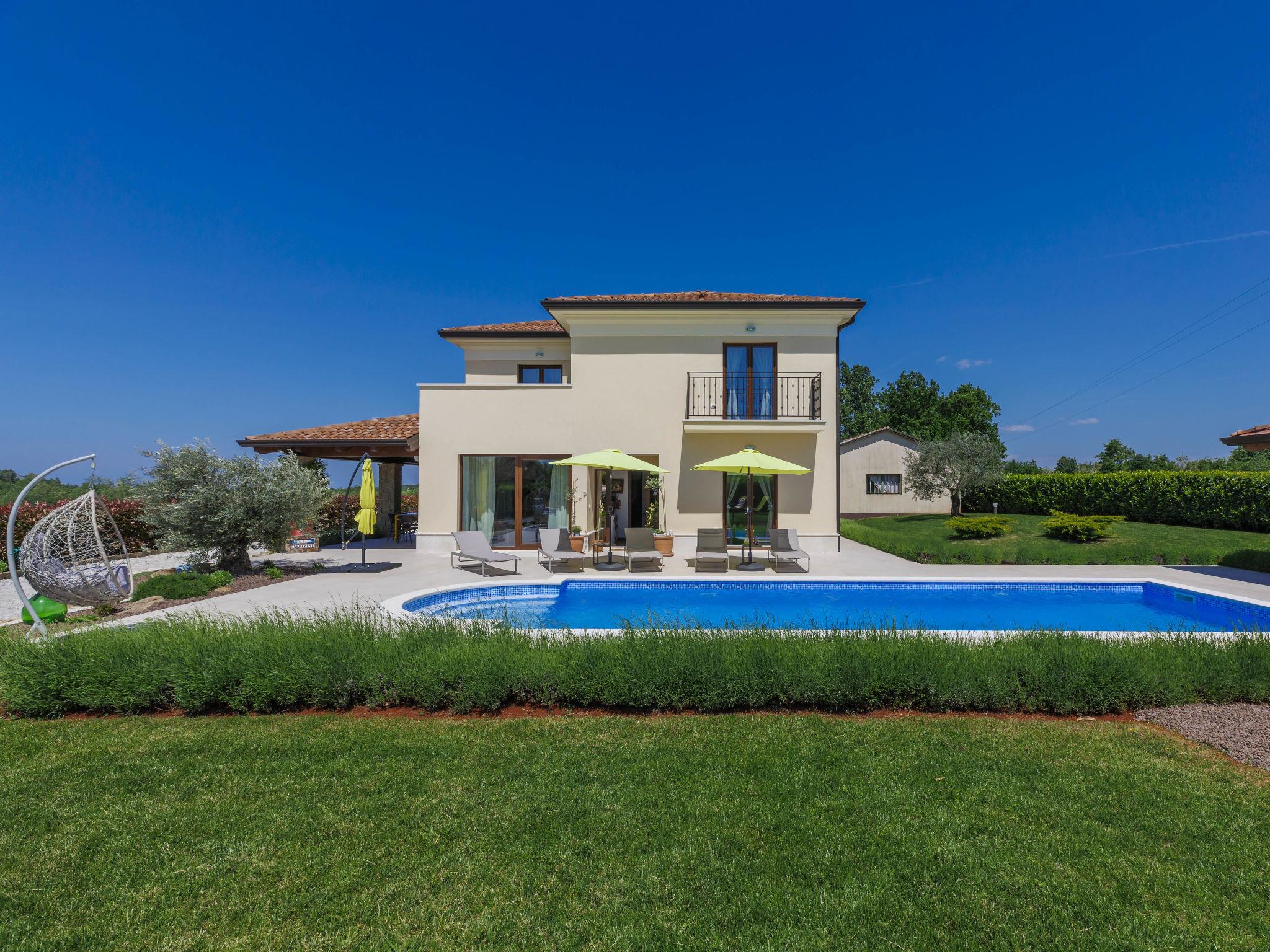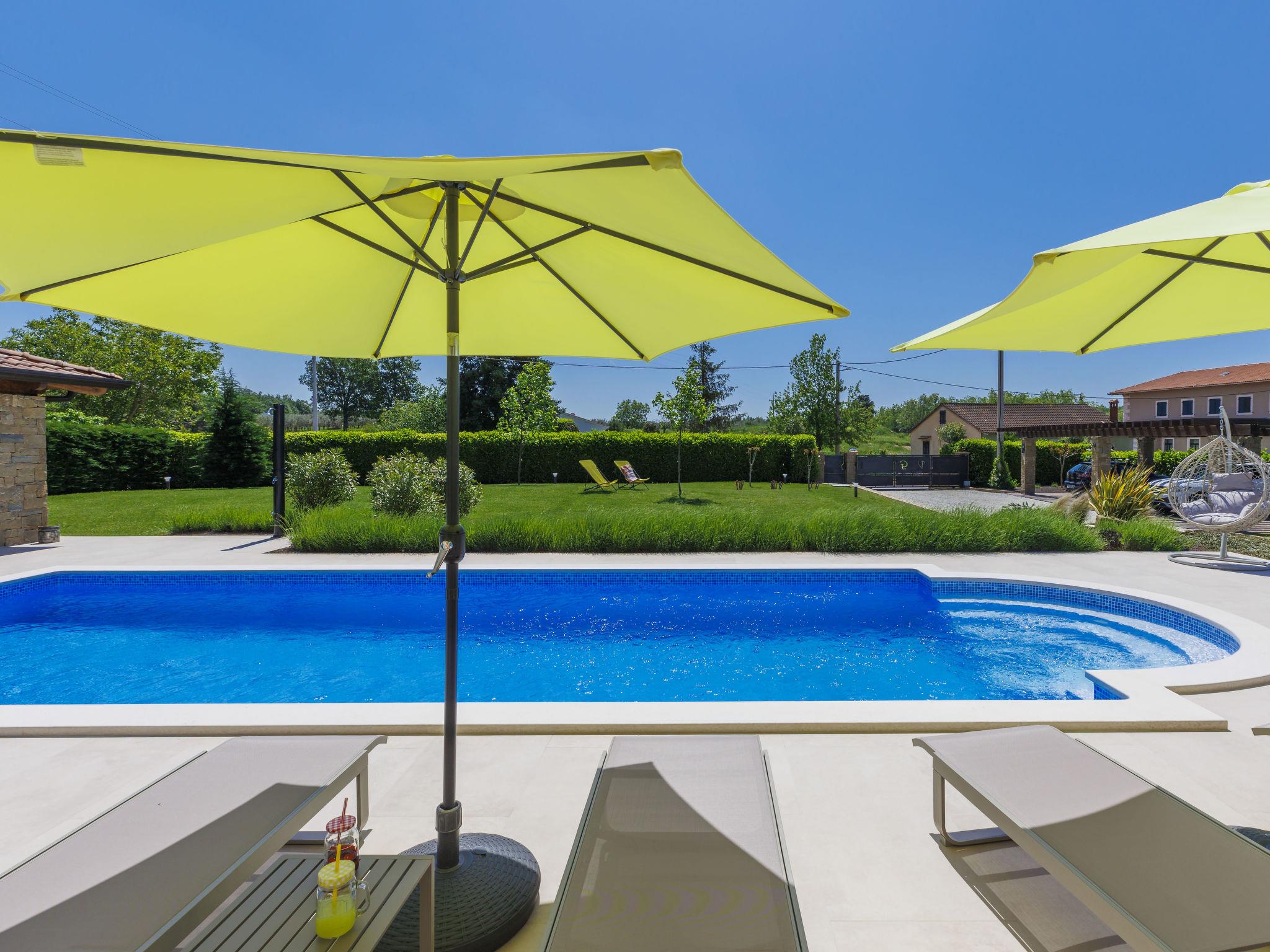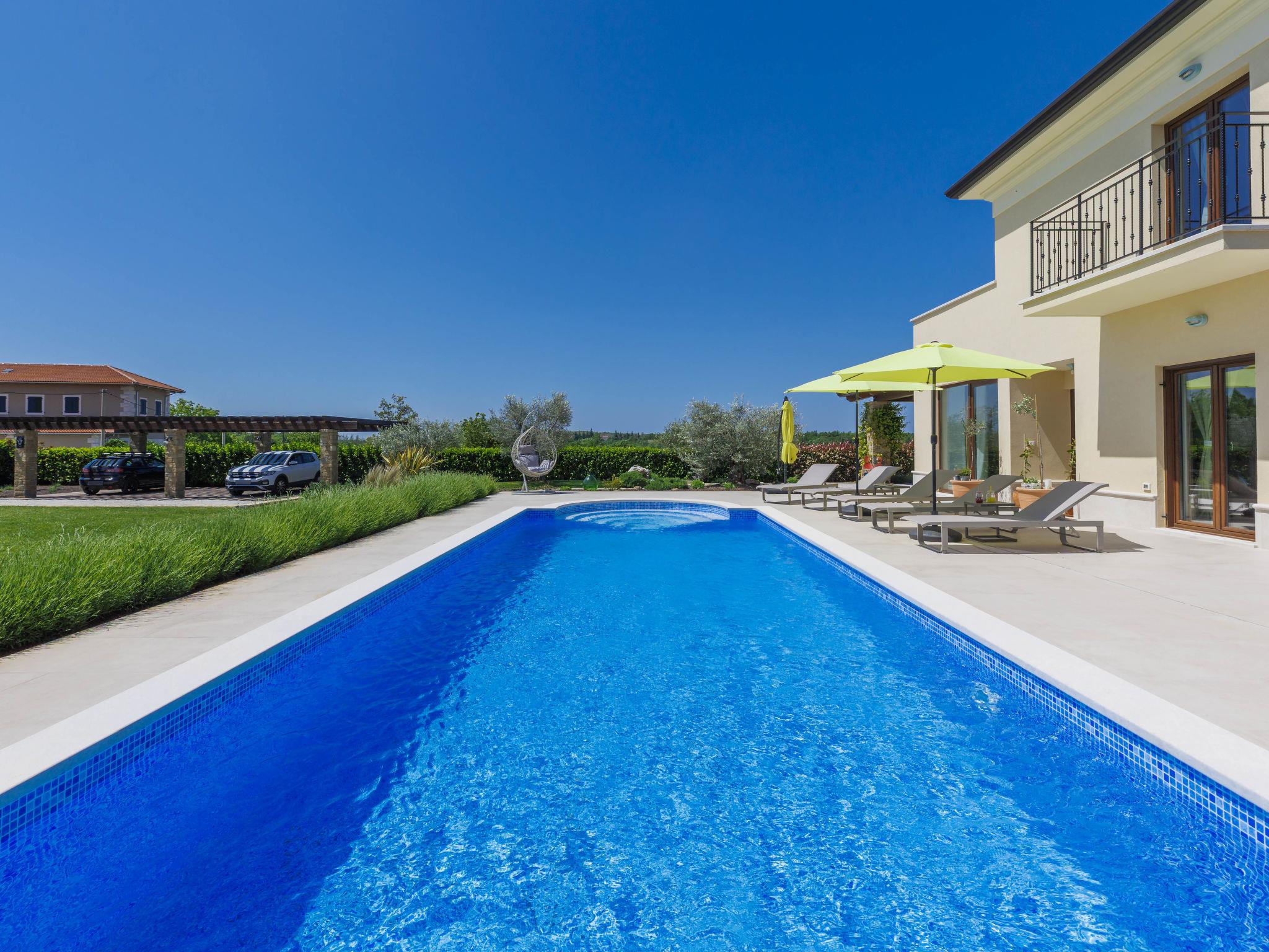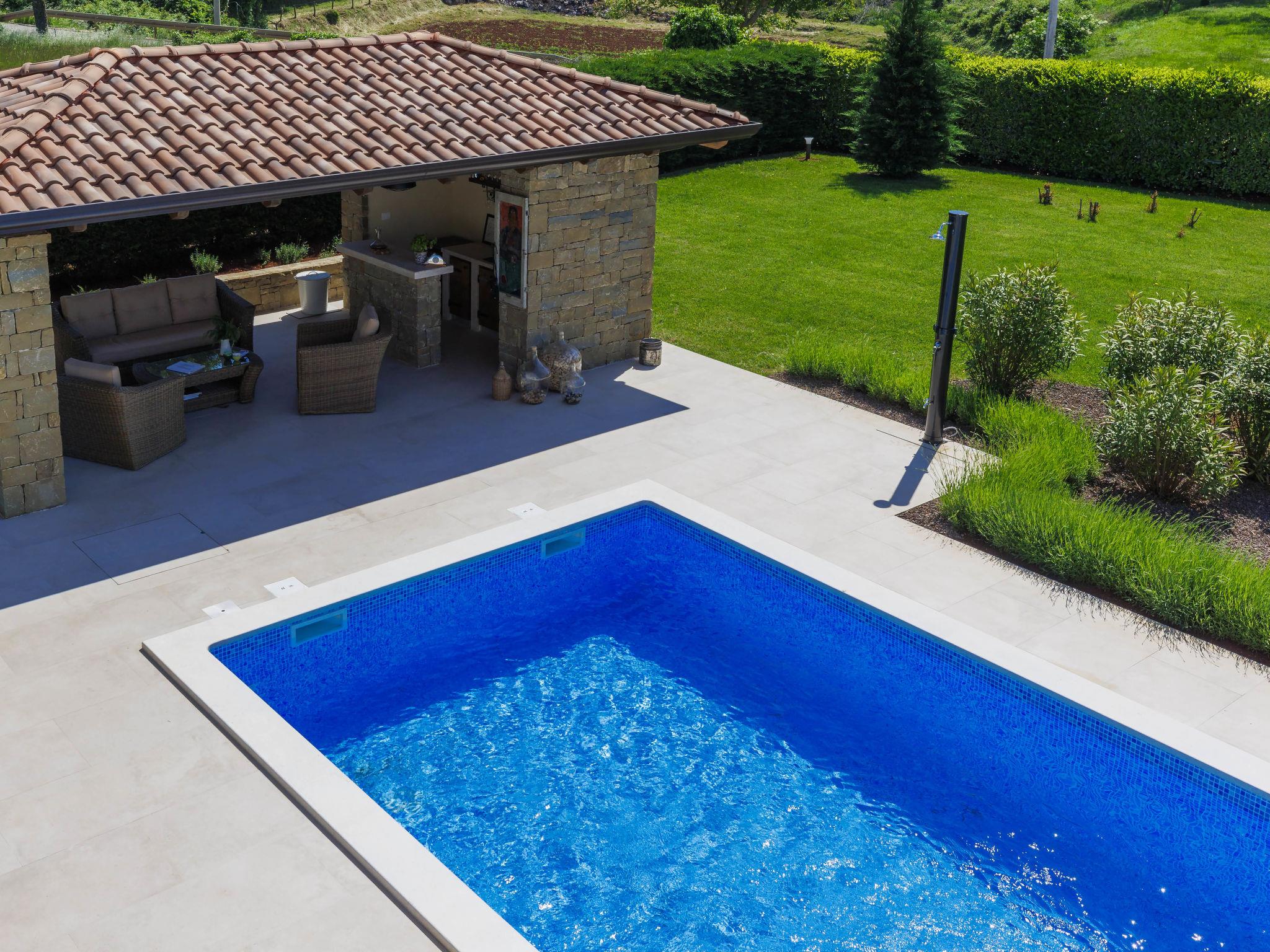 Large, beautiful single-family house "Gasparini", 2 storeys, built in 2022. In the hamlet Vranici 2 km from the centre of Višnjan, in a quiet, sunny position, 15 km from the sea, in the countryside. Private: property 3'000 m2 (fenced) with lawn and trees, swimming pool (10 x 4 m, depth 150 cm, seasonal availability: 01.May. - 15.Oct.) with internal staircase and salt-electrolysis pool-cleaning system. Outdoor shower, arbour, terrace (60 m2), garden furniture, barbecue, pool maintenance by the owner/gardener. In the house: internet access, burglar alarm system, washing machine. Parking (for 4 cars) at the house on the premises. Shop 2 km, supermarket 2 km, restaurant 2 km, bus stop 7.1 km, pebble beach 15 km. Please note: airfield 50 km from the property.