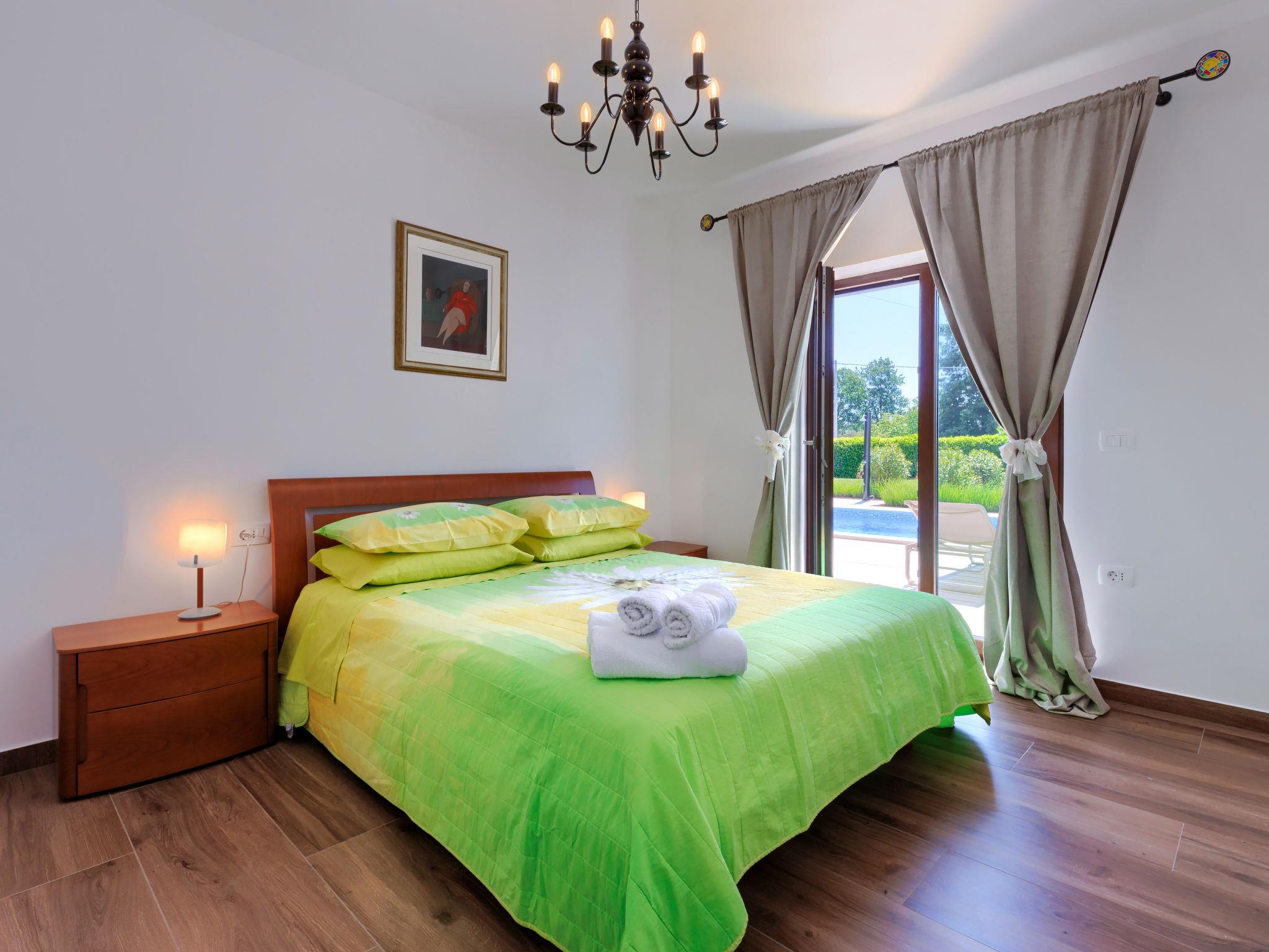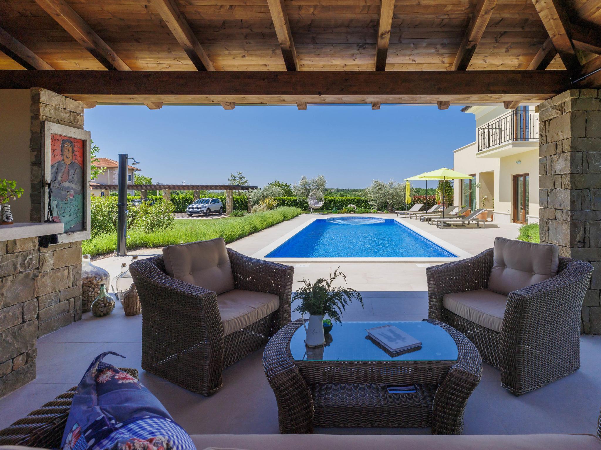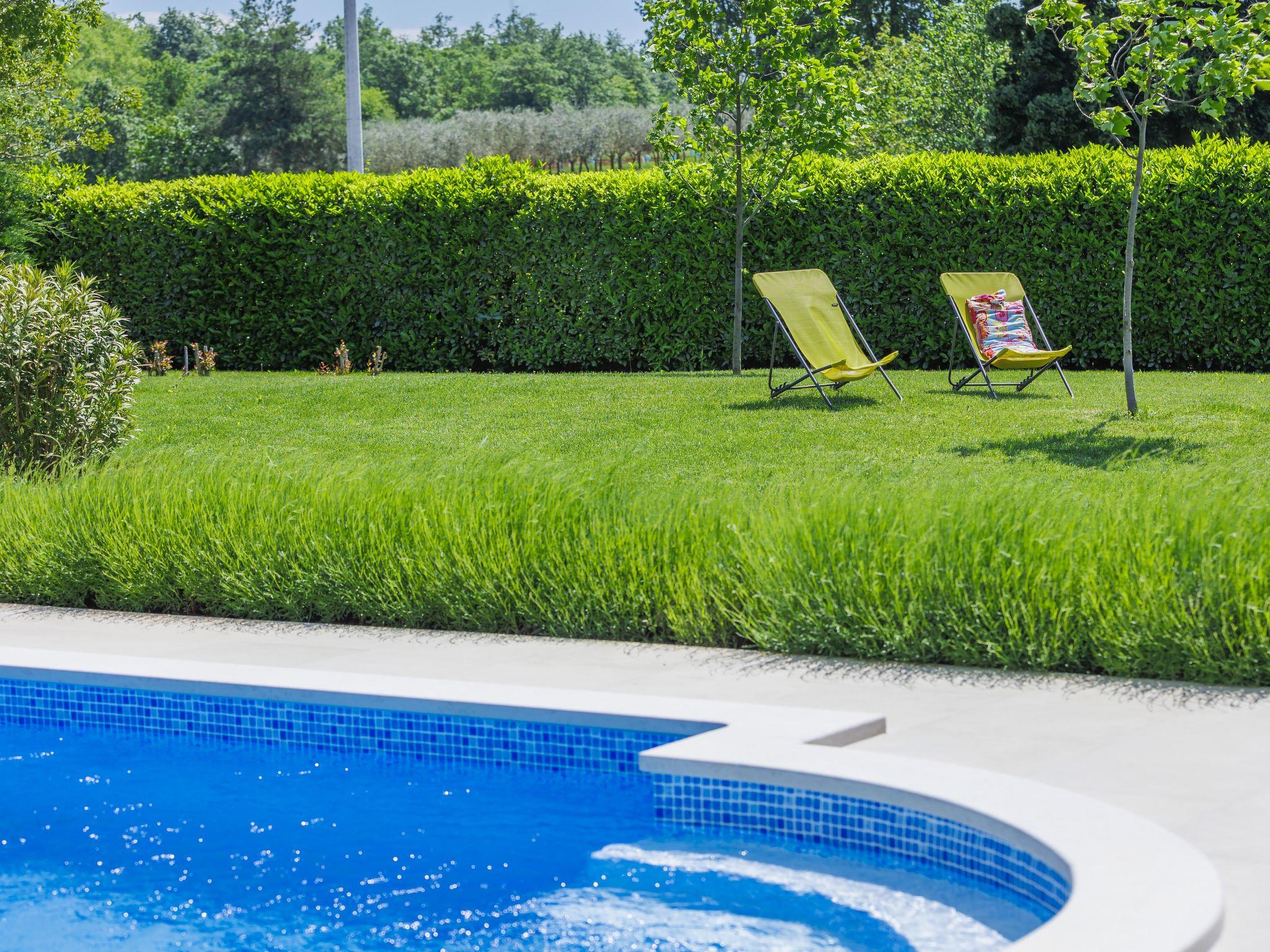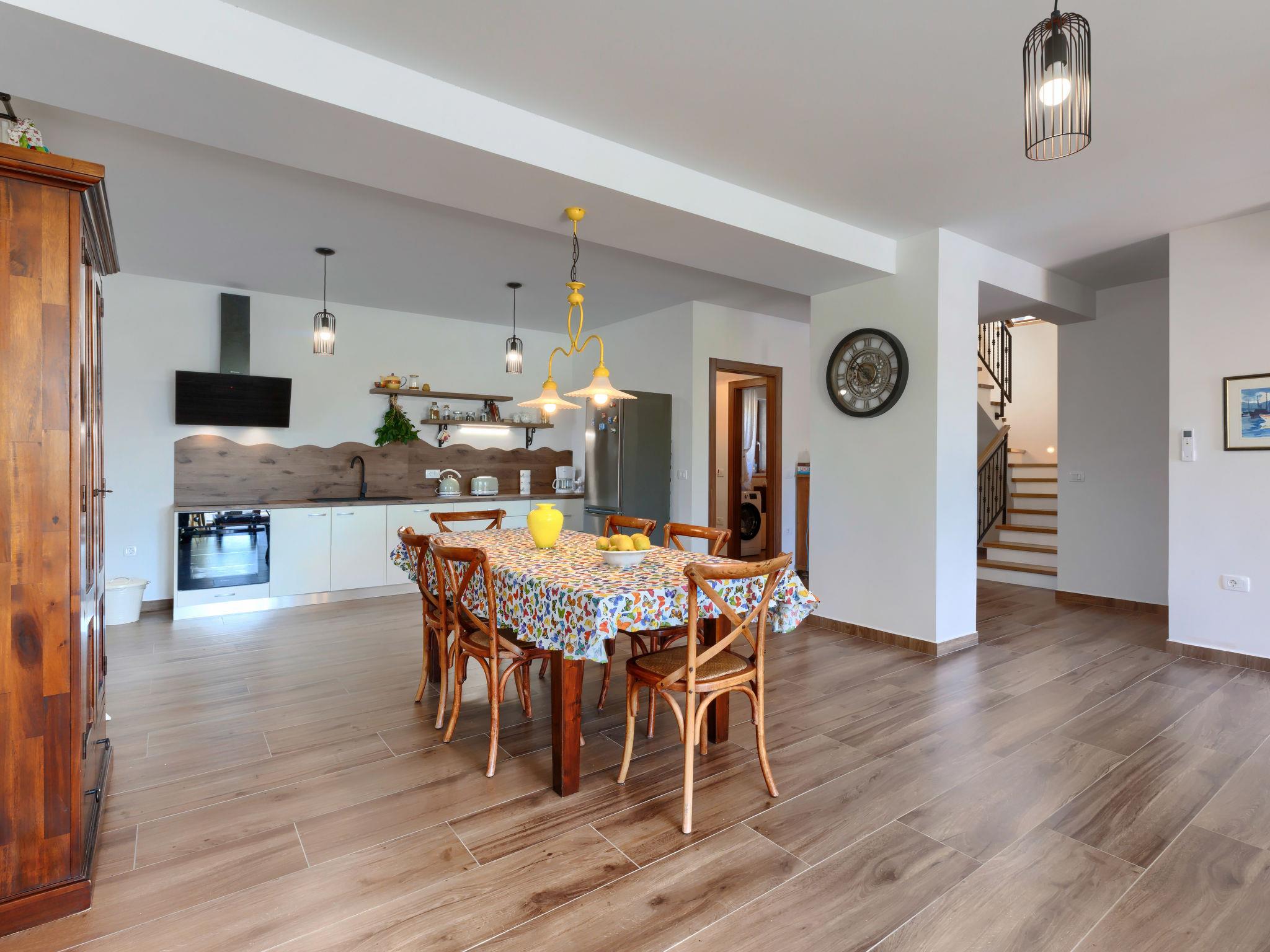 Large, beautiful single-family house "Gasparini", 2 storeys, built in 2022. In the hamlet Vranici 2 km from the centre of Višnjan, in a quiet, sunny position, 15 km from the sea, in the countryside. Private: property 3'000 m2 (fenced) with lawn and trees, swimming pool (10 x 4 m, depth 150 cm, seasonal availability: 01.May. - 15.Oct.) with internal staircase and salt-electrolysis pool-cleaning system. Outdoor shower, arbour, terrace (60 m2), garden furniture, barbecue, pool maintenance by the owner/gardener. In the house: internet access, burglar alarm system, washing machine. Parking (for 4 cars) at the house on the premises. Shop 2 km, supermarket 2 km, restaurant 2 km, bus stop 7.1 km, pebble beach 15 km. Please note: airfield 50 km from the property.