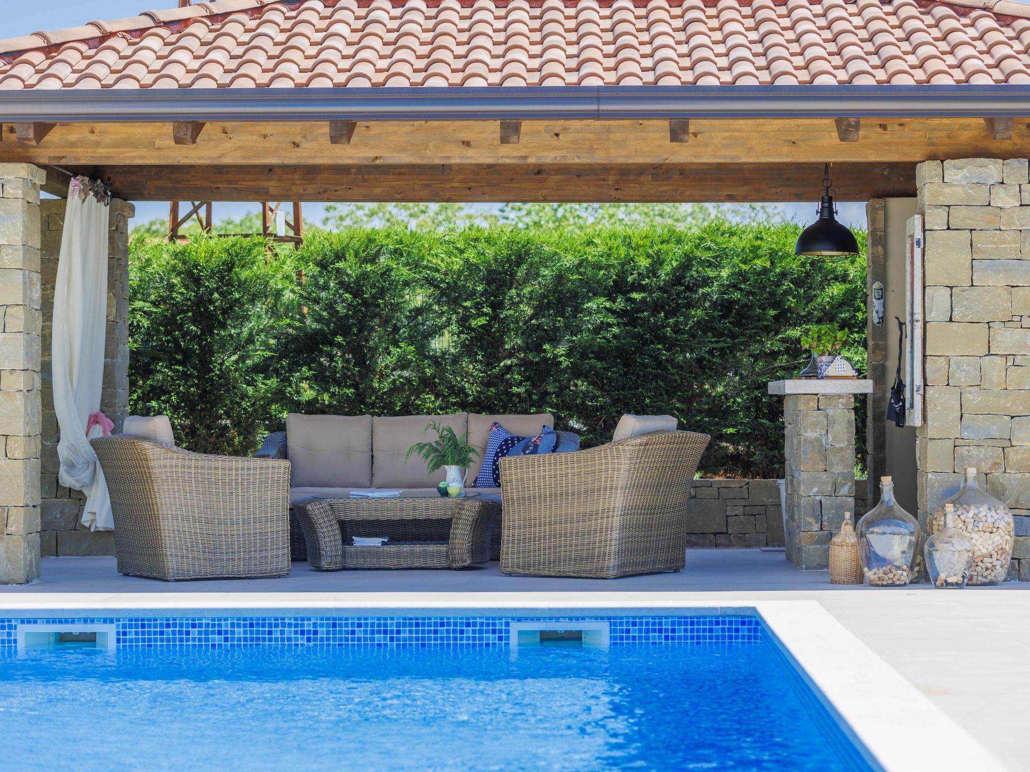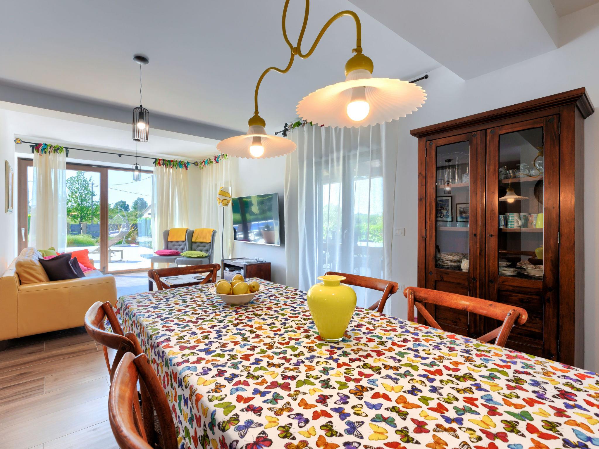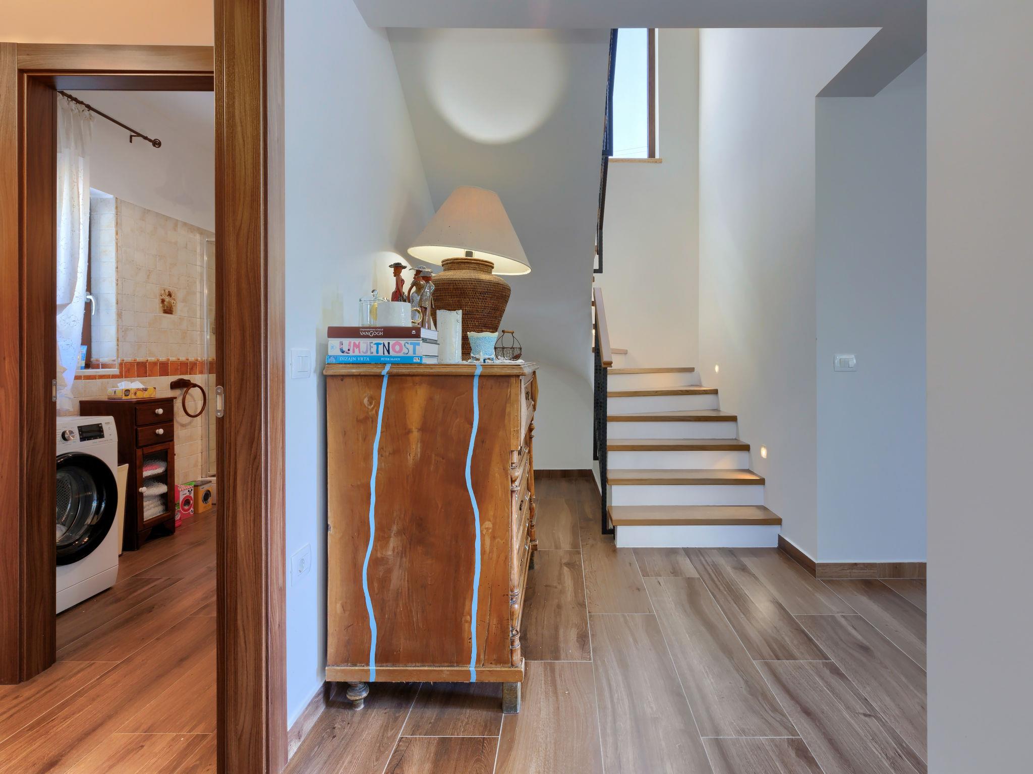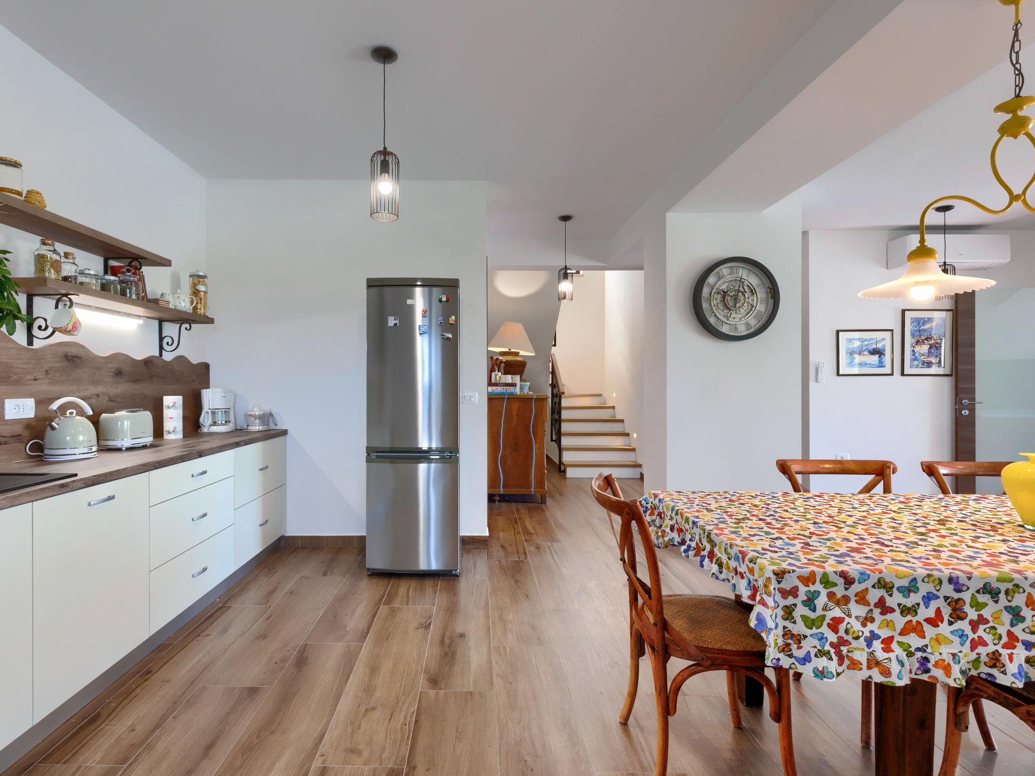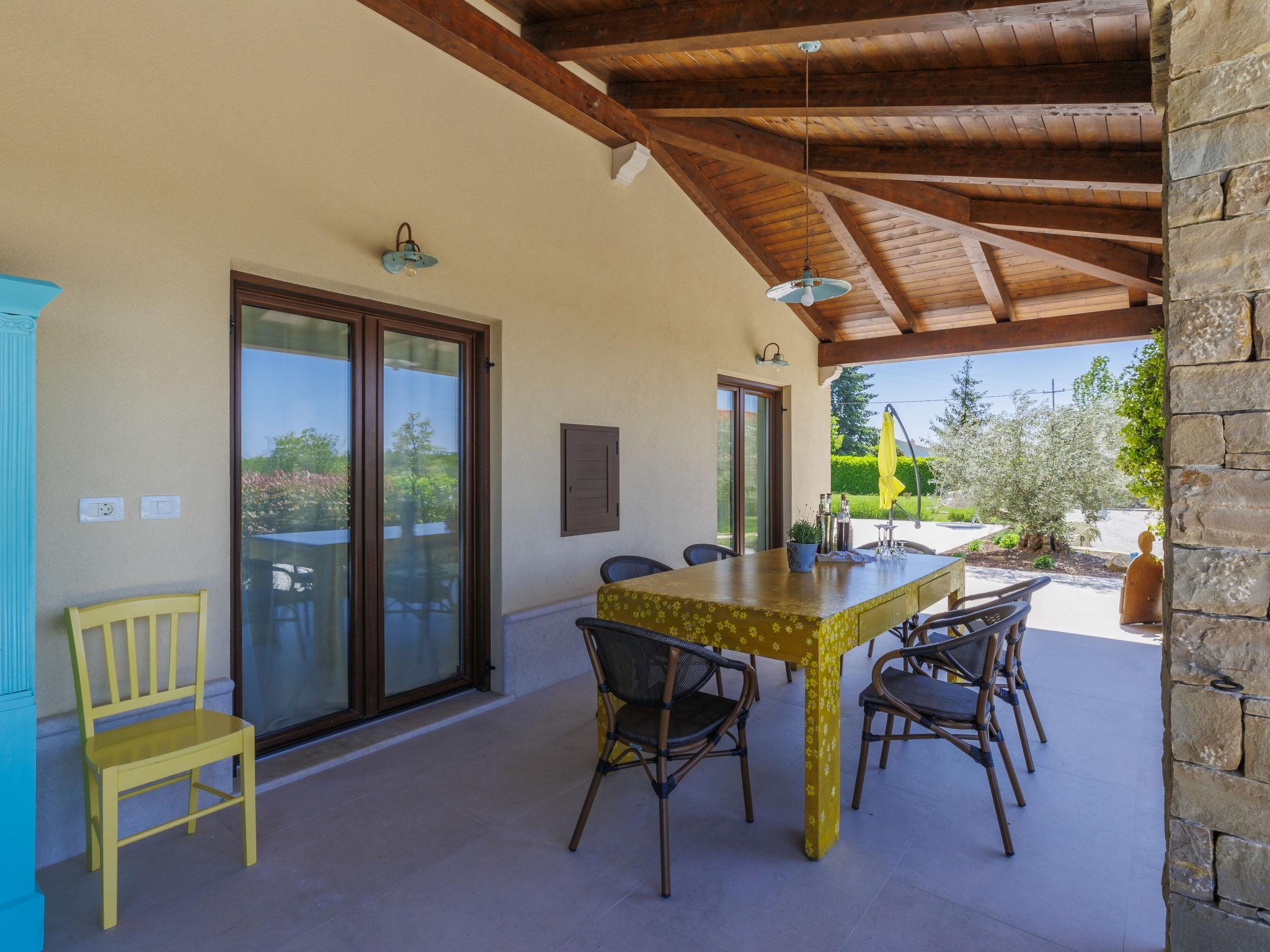 Large, beautiful single-family house "Gasparini", 2 storeys, built in 2022. In the hamlet Vranici 2 km from the centre of Višnjan, in a quiet, sunny position, 15 km from the sea, in the countryside. Private: property 3'000 m2 (fenced) with lawn and trees, swimming pool (10 x 4 m, depth 150 cm, seasonal availability: 01.May. - 15.Oct.) with internal staircase and salt-electrolysis pool-cleaning system. Outdoor shower, arbour, terrace (60 m2), garden furniture, barbecue, pool maintenance by the owner/gardener. In the house: internet access, burglar alarm system, washing machine. Parking (for 4 cars) at the house on the premises. Shop 2 km, supermarket 2 km, restaurant 2 km, bus stop 7.1 km, pebble beach 15 km. Please note: airfield 50 km from the property.