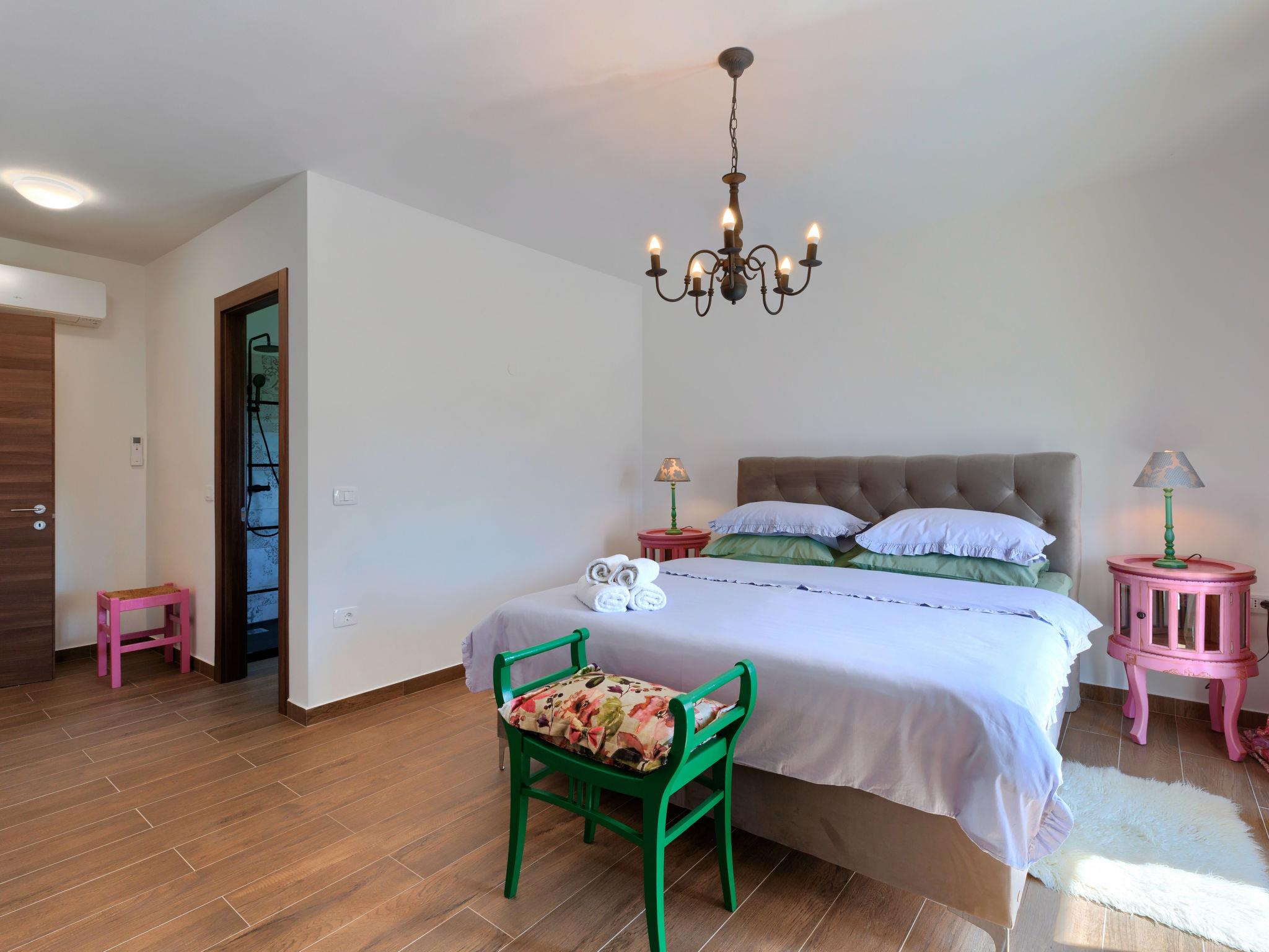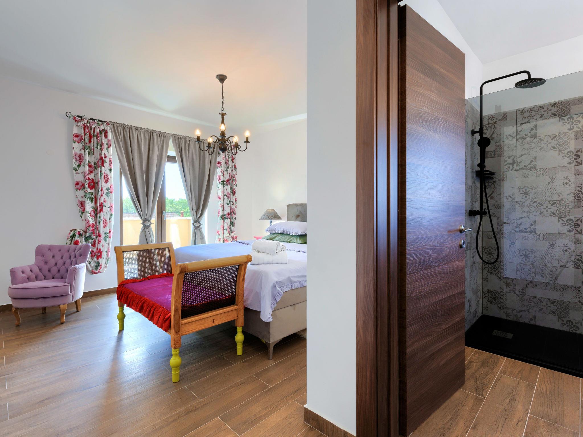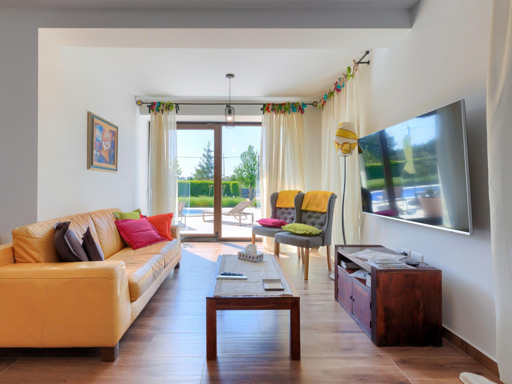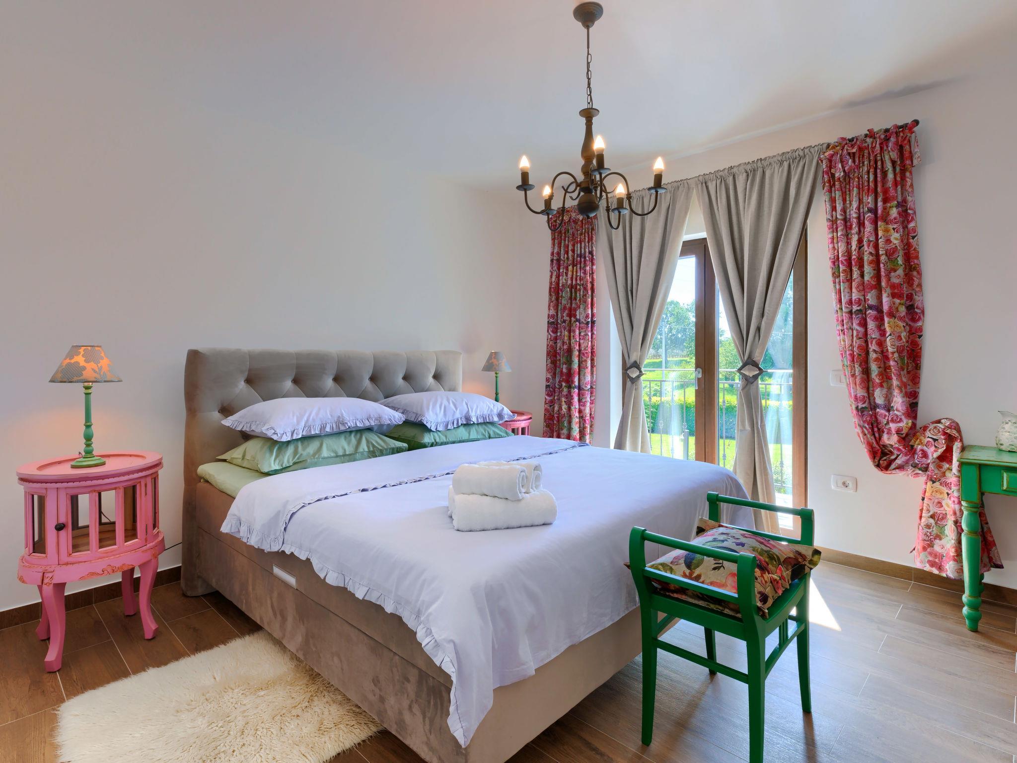 Large, beautiful single-family house "Gasparini", 2 storeys, built in 2022. In the hamlet Vranici 2 km from the centre of Višnjan, in a quiet, sunny position, 15 km from the sea, in the countryside. Private: property 3'000 m2 (fenced) with lawn and trees, swimming pool (10 x 4 m, depth 150 cm, seasonal availability: 01.May. - 15.Oct.) with internal staircase and salt-electrolysis pool-cleaning system. Outdoor shower, arbour, terrace (60 m2), garden furniture, barbecue, pool maintenance by the owner/gardener. In the house: internet access, burglar alarm system, washing machine. Parking (for 4 cars) at the house on the premises. Shop 2 km, supermarket 2 km, restaurant 2 km, bus stop 7.1 km, pebble beach 15 km. Please note: airfield 50 km from the property.
