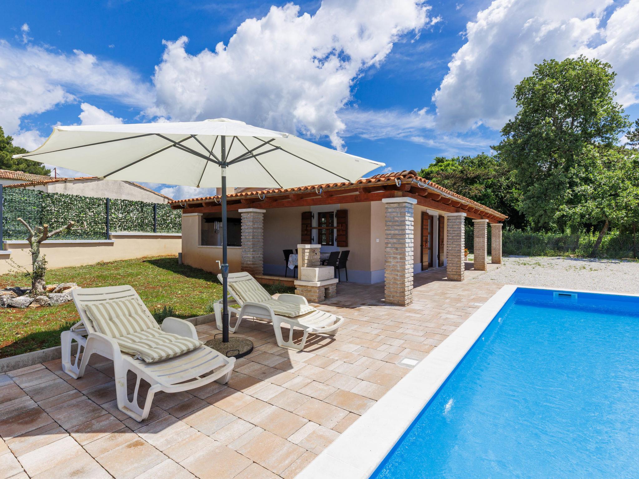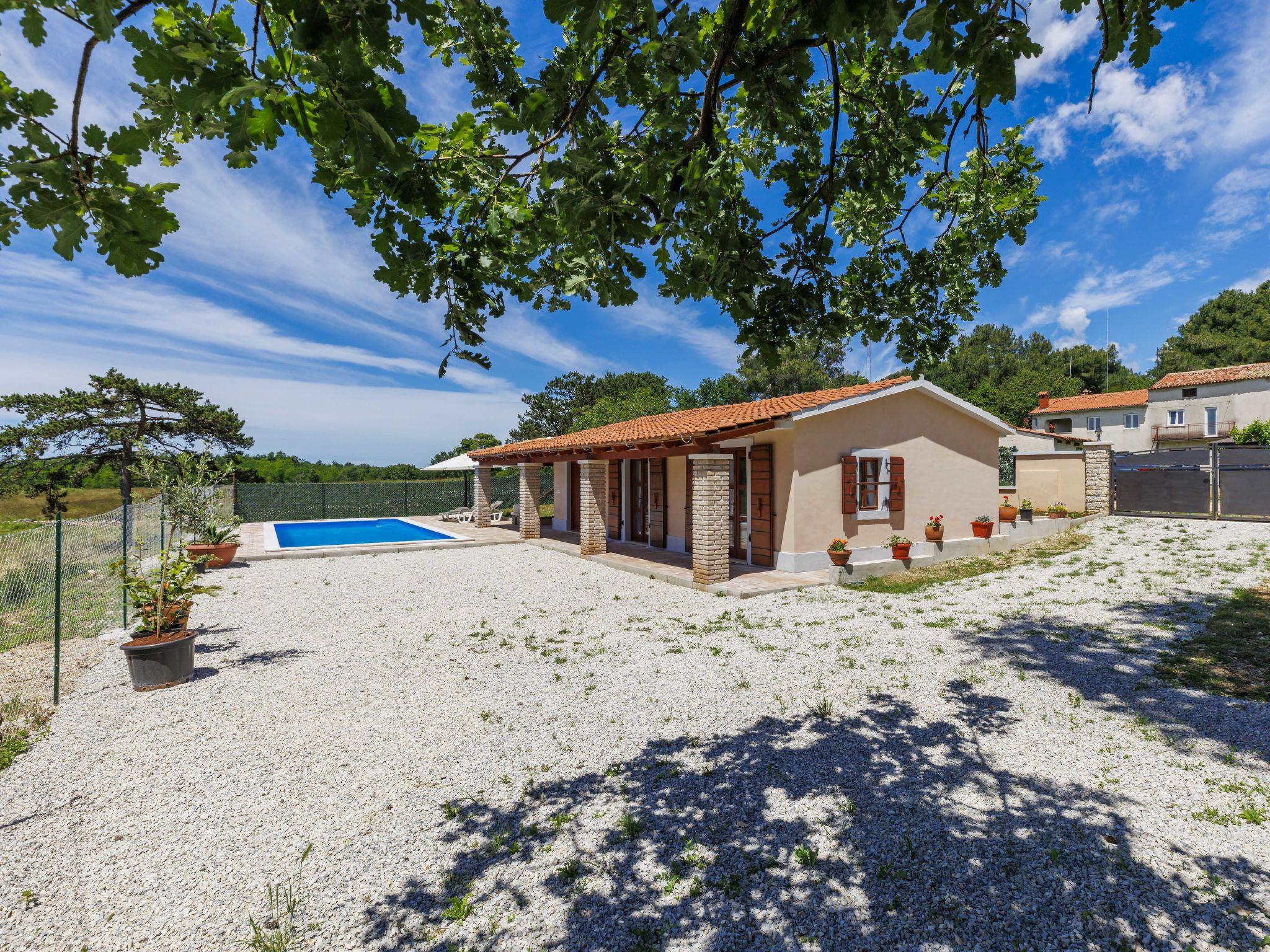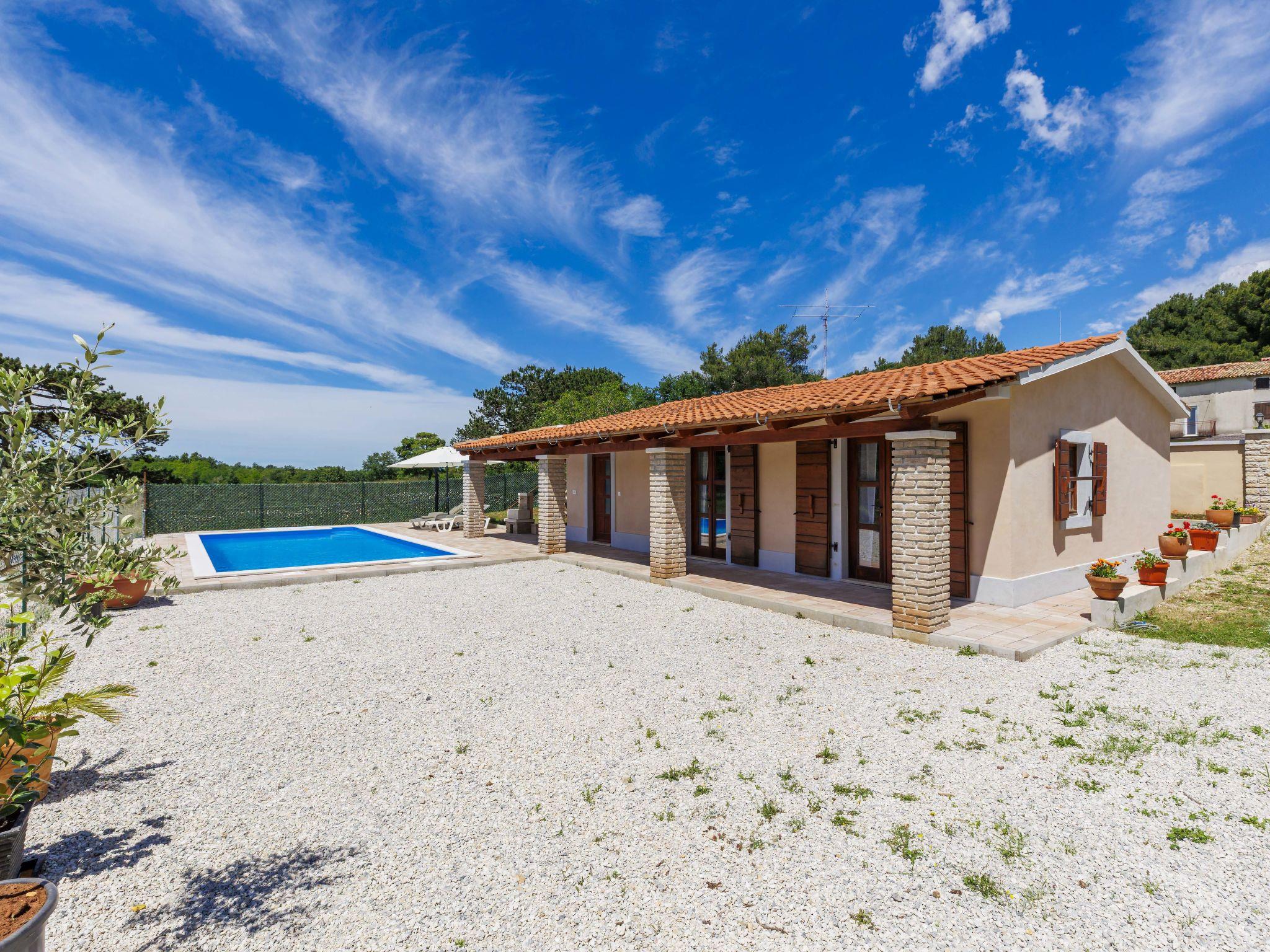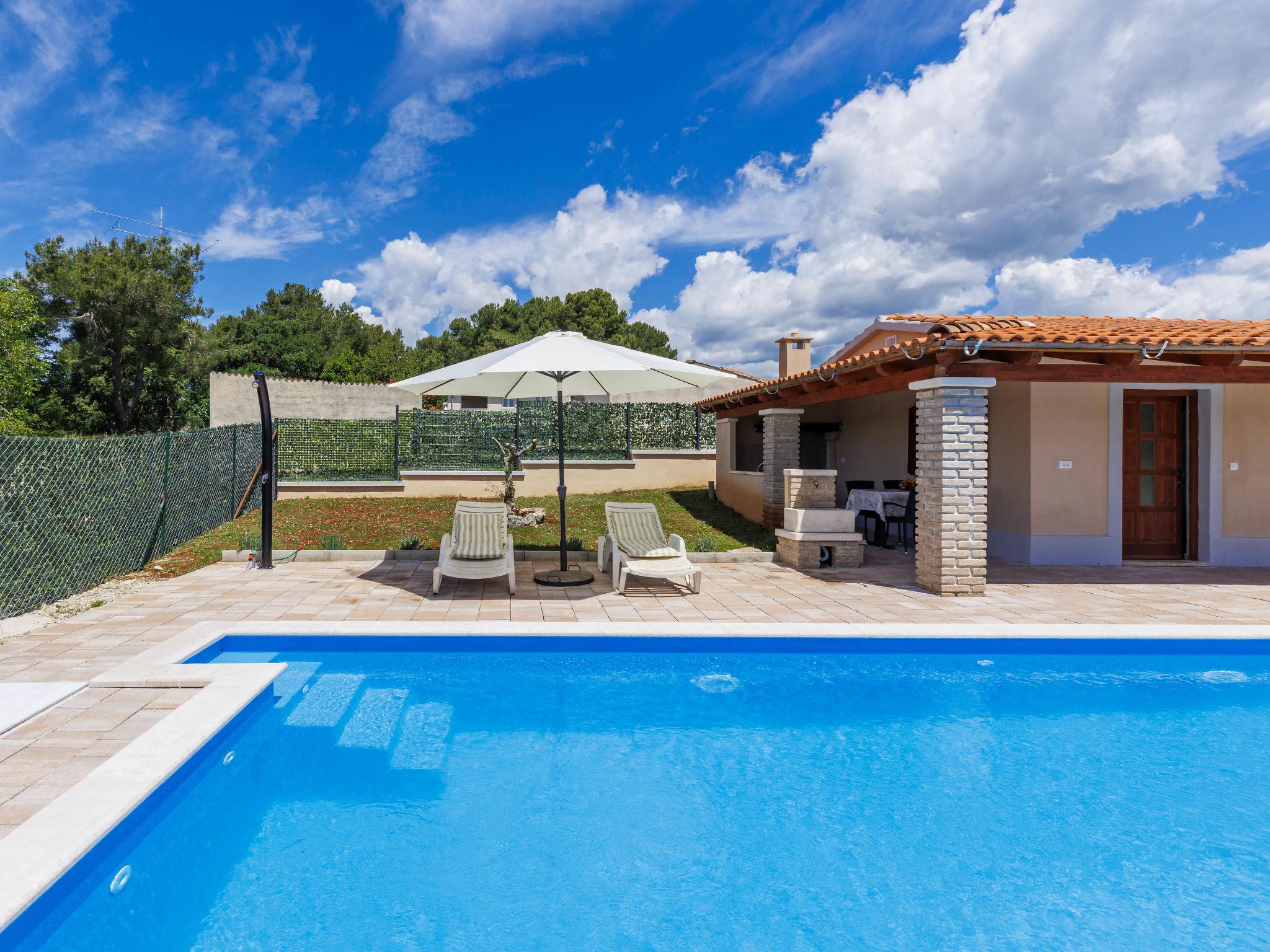 Single-family house "Santina", built in 2023. In the hamlet Cvitani 8 km from the centre of Višnjan, 13 km from the centre of Kaštelir, 15 km from the centre of Porec, 15 km from the sea. Private: property 600 m2, swimming pool (9 x 4 m, depth 135 cm, seasonal availability: 01.May. - 01.Oct.) with internal staircase. Outdoor shower, terrace (28 m2), garden furniture, barbecue, pool maintenance by the owner/gardener. In the house: internet access, washing machine. Parking (for 2 cars) at the house on the premises. Shop 8 km, restaurant 8 km, bus stop 4.1 km, rocky beach 15 km.