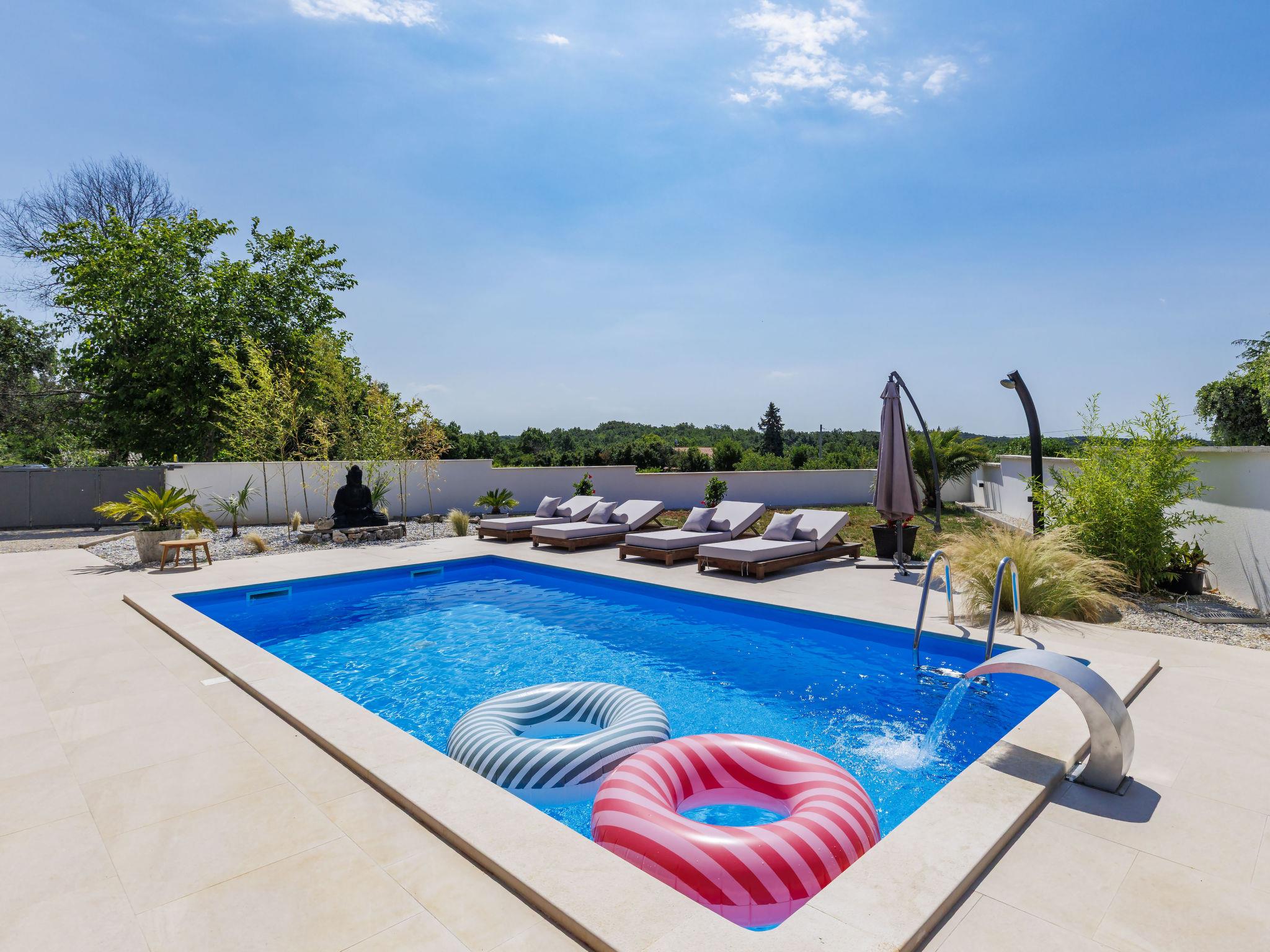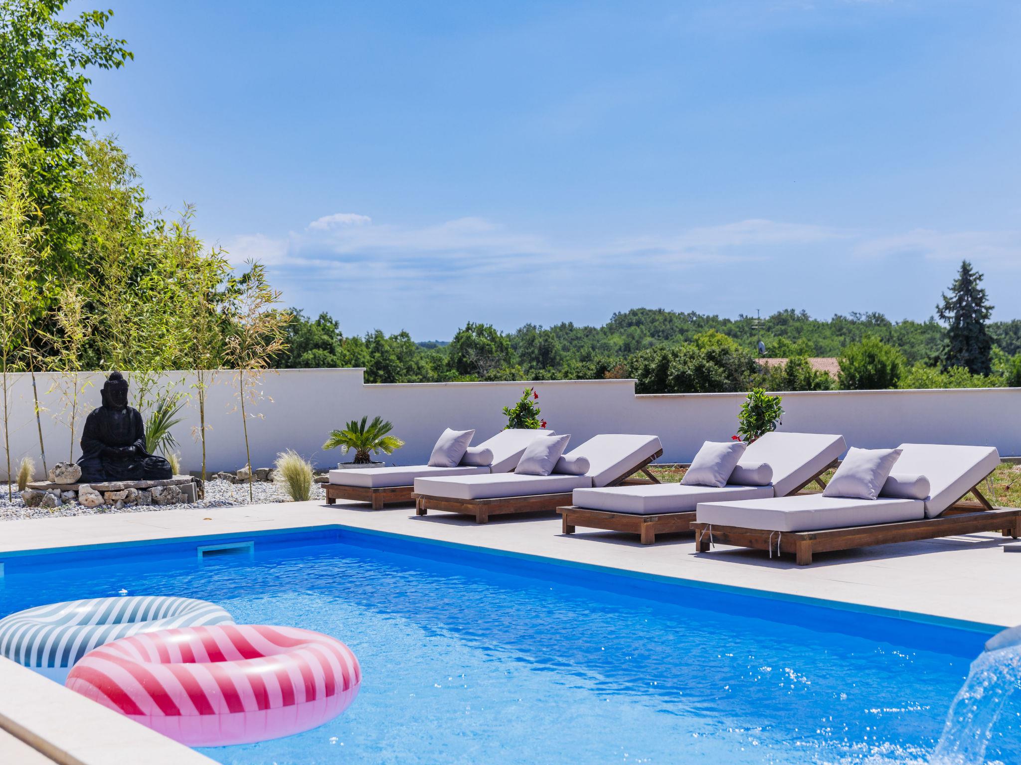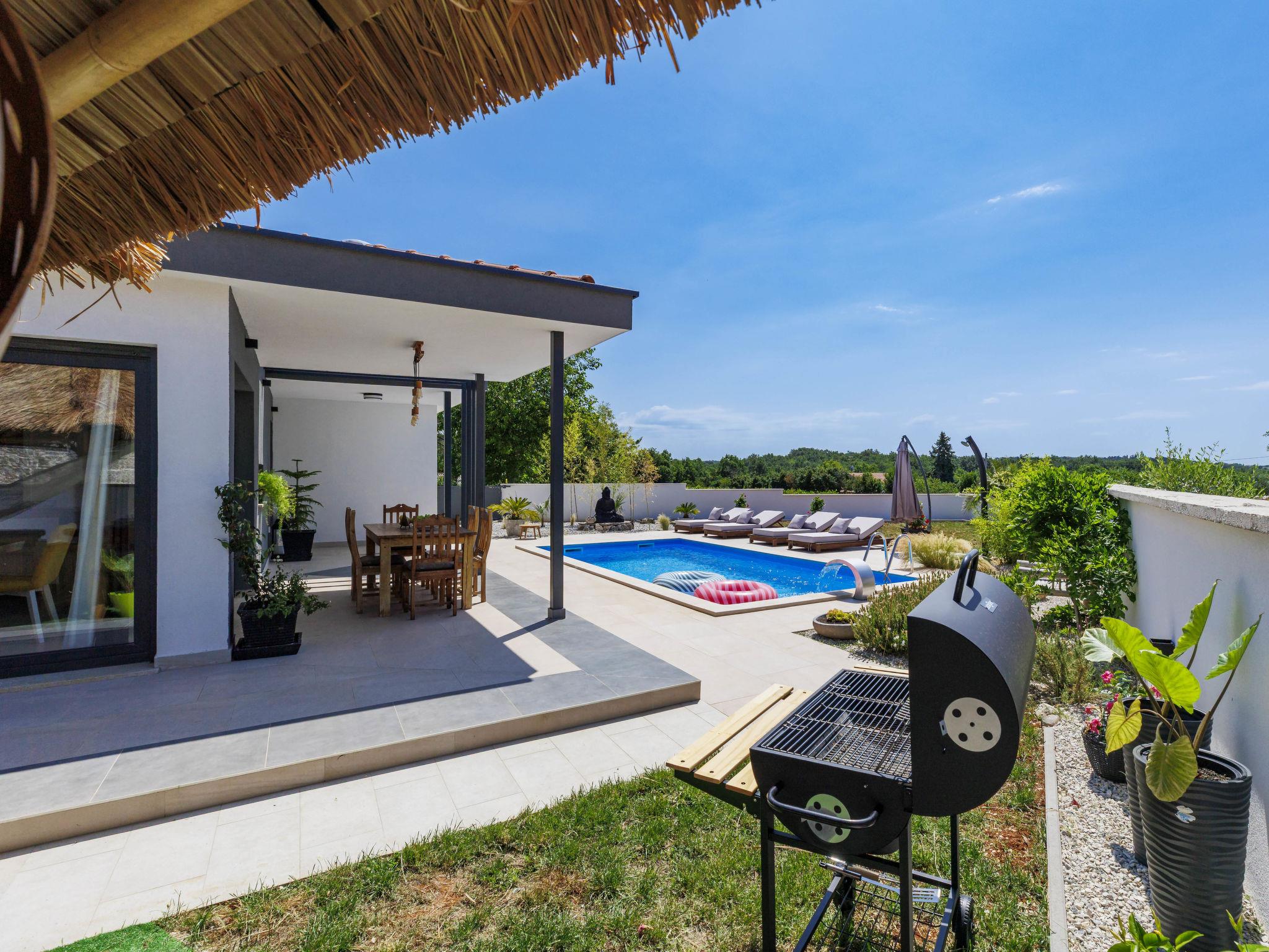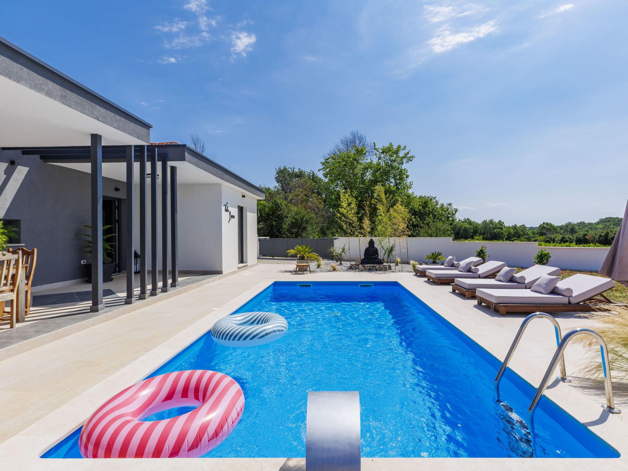 Single-family house "Villa Luna", built in 2024. In the hamlet Cvitani 8 km from the centre of Višnjan, 13 km from the centre of Kaštelir, 15 km from the centre of Porec, 15 km from the sea, in a cul-de-sac. Private: property 400 m2 (fenced), swimming pool angular (7 x 3 m, depth 145 cm, seasonal availability: 01.May. - 01.Oct.). Outdoor shower, arbour (16 m2), terrace (20 m2), garden furniture, pool maintenance by the owner/gardener. In the house: internet access, washing machine, tumble dryer. Parking (for 2 cars) at the house on the premises. Shop 8 km, restaurant 8 km, bus stop 4.1 km, rocky beach 15 km. Please note: airfield 50 km from the property.