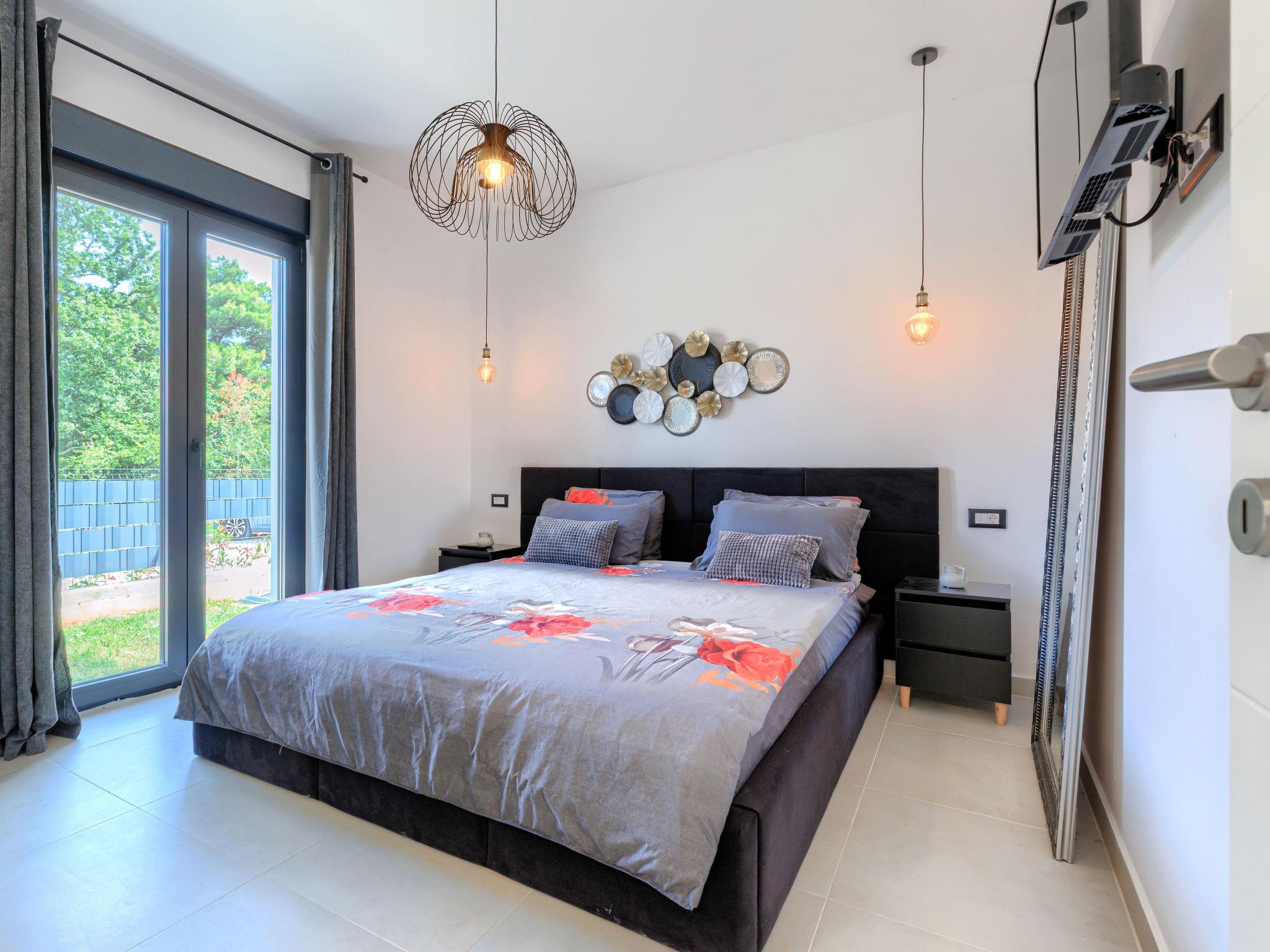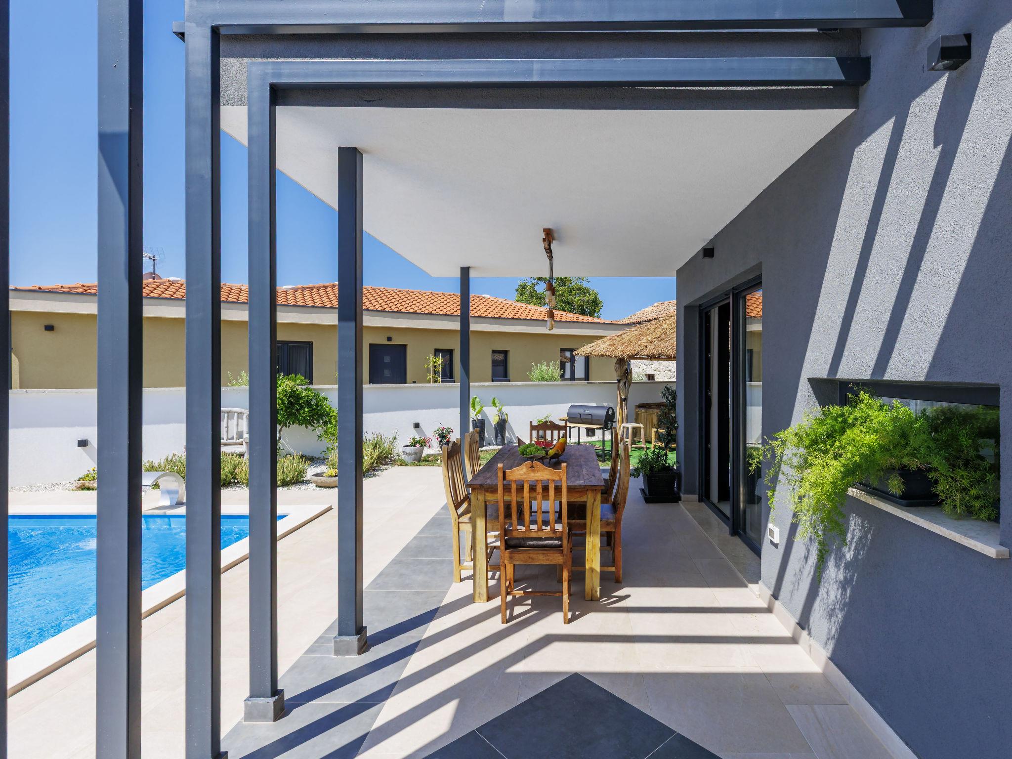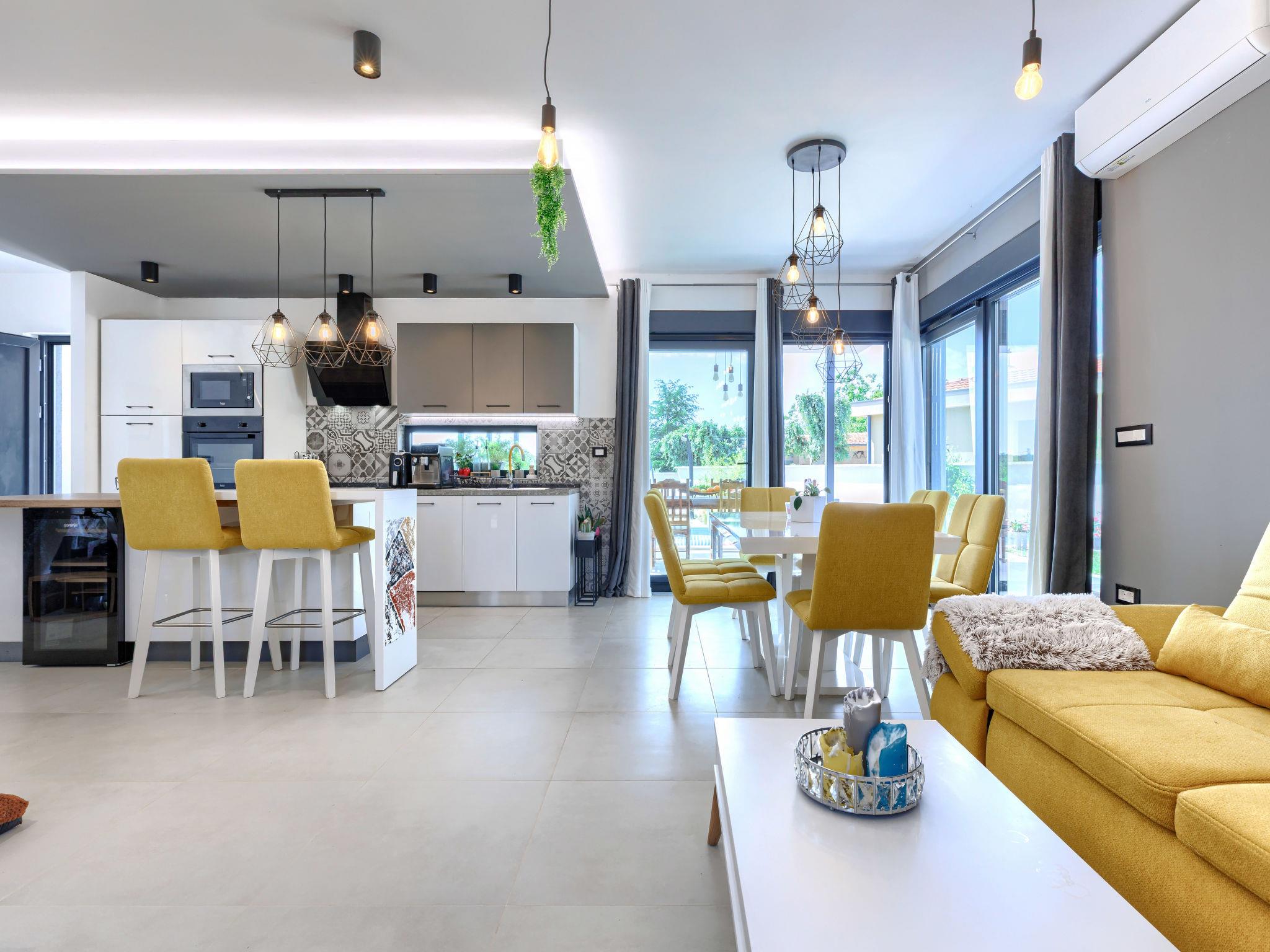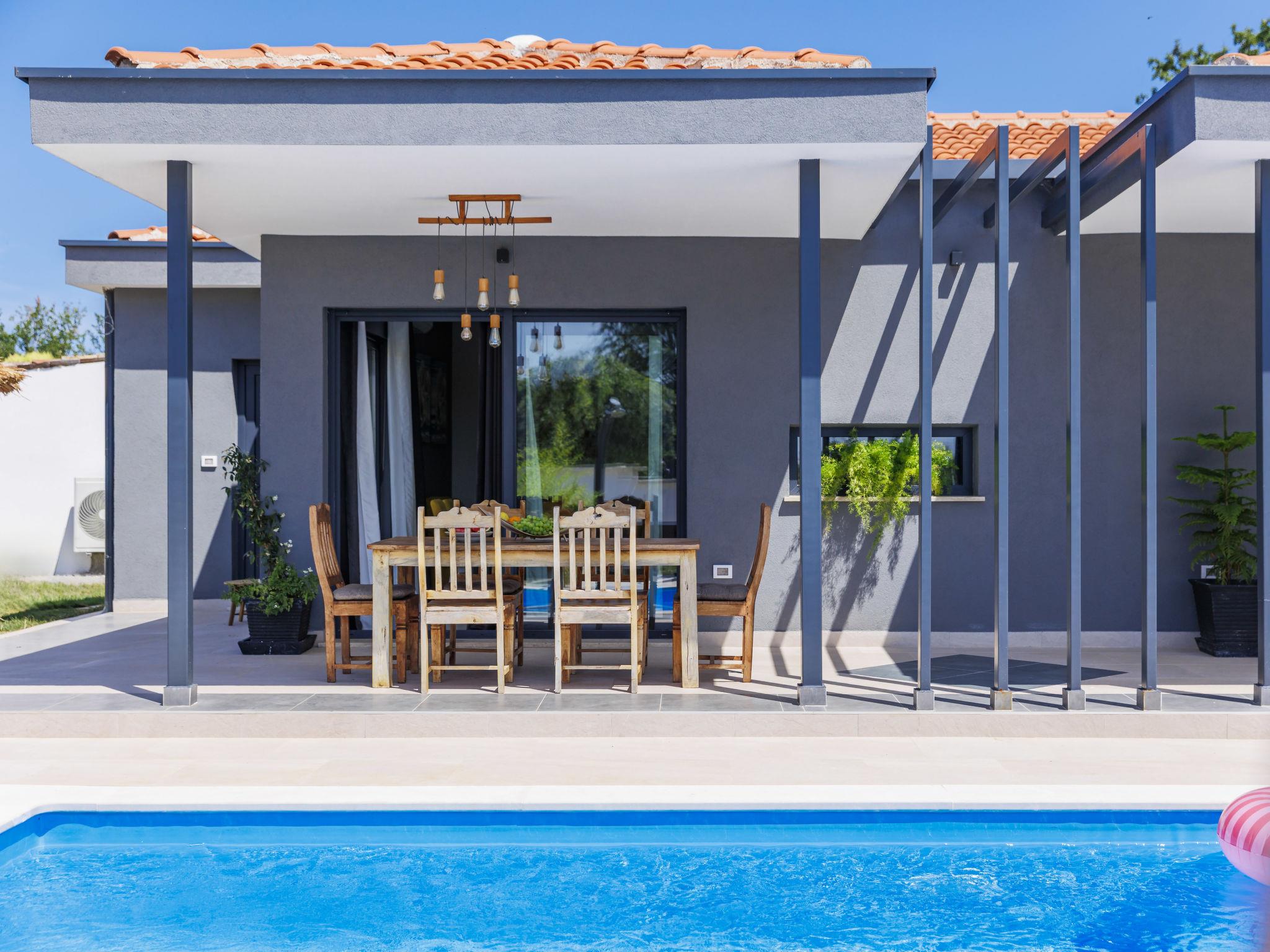 Single-family house "Villa Luna", built in 2024. In the hamlet Cvitani 8 km from the centre of Višnjan, 13 km from the centre of Kaštelir, 15 km from the centre of Porec, 15 km from the sea, in a cul-de-sac. Private: property 400 m2 (fenced), swimming pool angular (7 x 3 m, depth 145 cm, seasonal availability: 01.May. - 01.Oct.). Outdoor shower, arbour (16 m2), terrace (20 m2), garden furniture, pool maintenance by the owner/gardener. In the house: internet access, washing machine, tumble dryer. Parking (for 2 cars) at the house on the premises. Shop 8 km, restaurant 8 km, bus stop 4.1 km, rocky beach 15 km. Please note: airfield 50 km from the property.