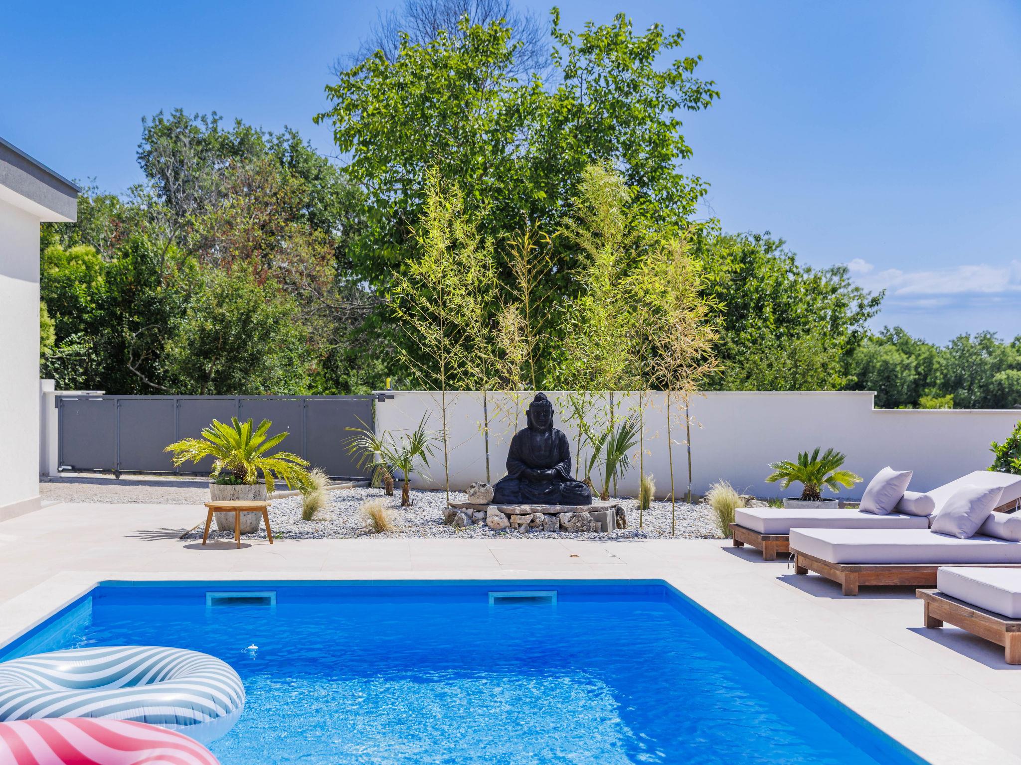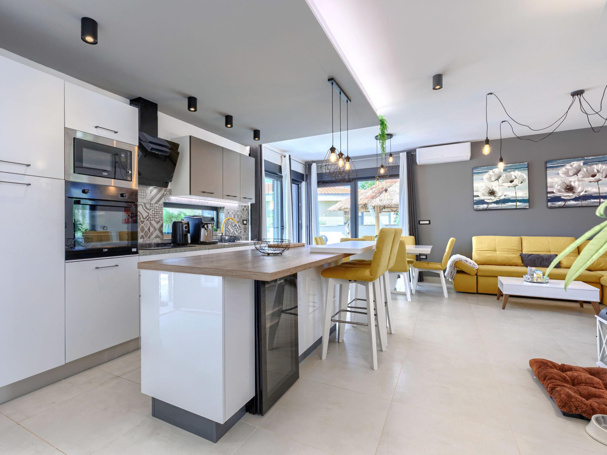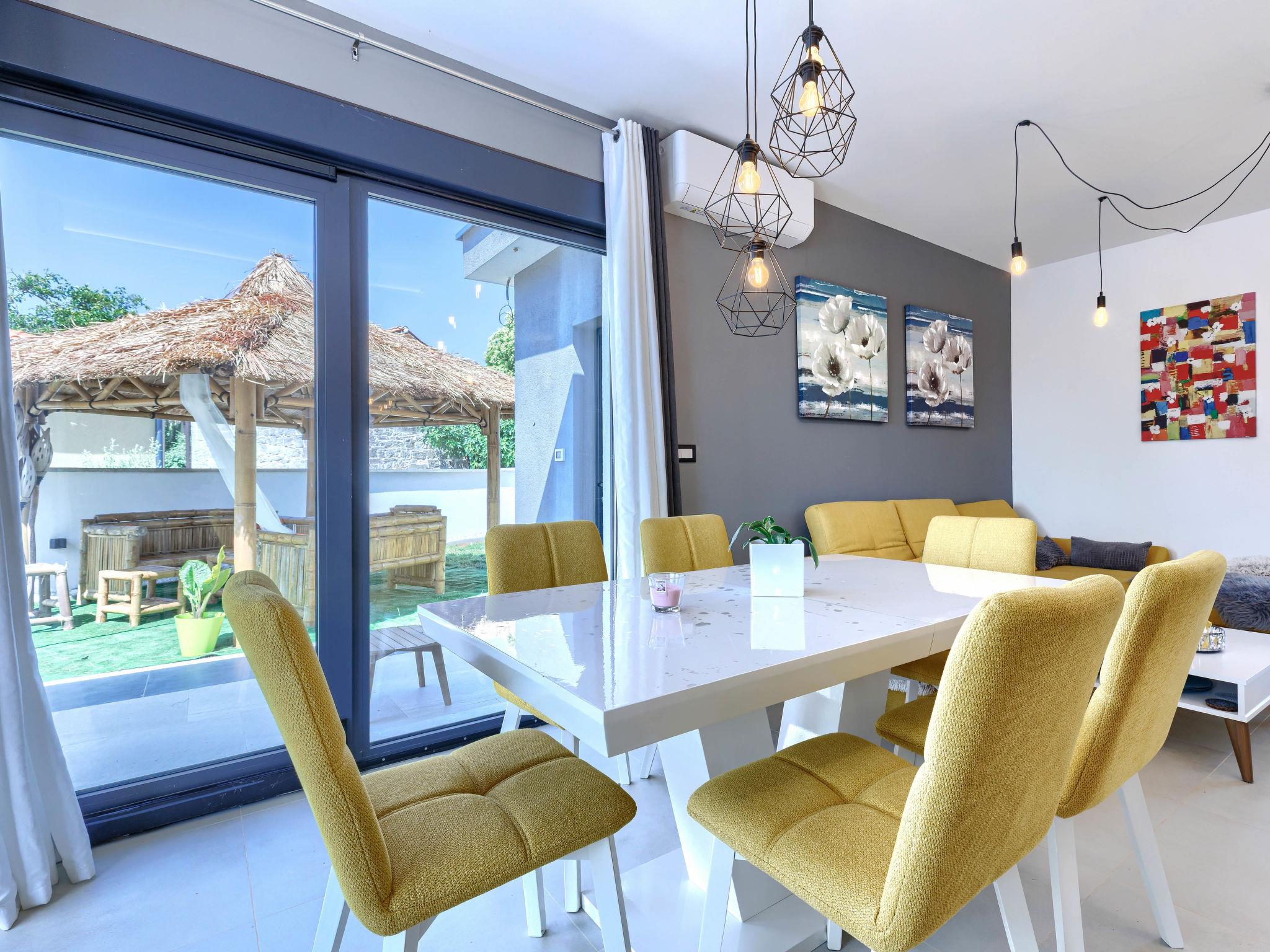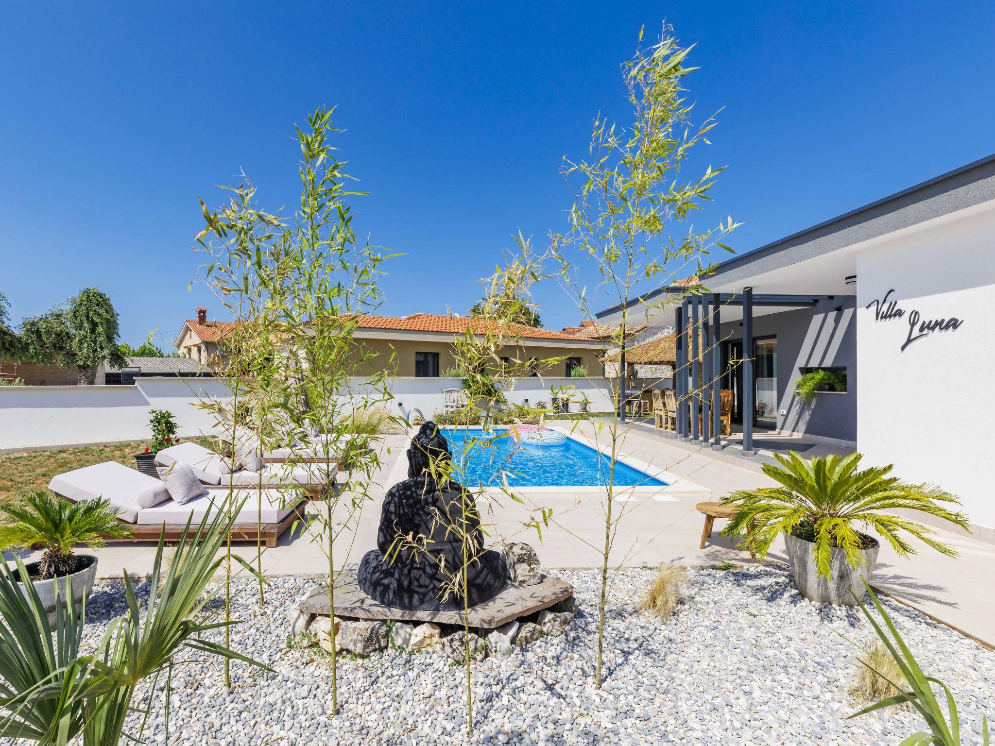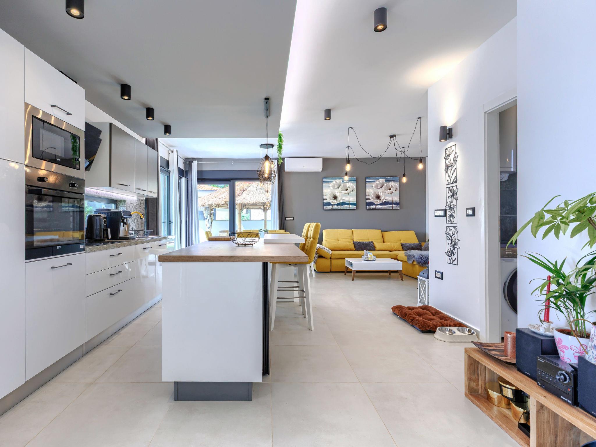 Single-family house "Villa Luna", built in 2024. In the hamlet Cvitani 8 km from the centre of Višnjan, 13 km from the centre of Kaštelir, 15 km from the centre of Porec, 15 km from the sea, in a cul-de-sac. Private: property 400 m2 (fenced), swimming pool angular (7 x 3 m, depth 145 cm, seasonal availability: 01.May. - 01.Oct.). Outdoor shower, arbour (16 m2), terrace (20 m2), garden furniture, pool maintenance by the owner/gardener. In the house: internet access, washing machine, tumble dryer. Parking (for 2 cars) at the house on the premises. Shop 8 km, restaurant 8 km, bus stop 4.1 km, rocky beach 15 km. Please note: airfield 50 km from the property.
