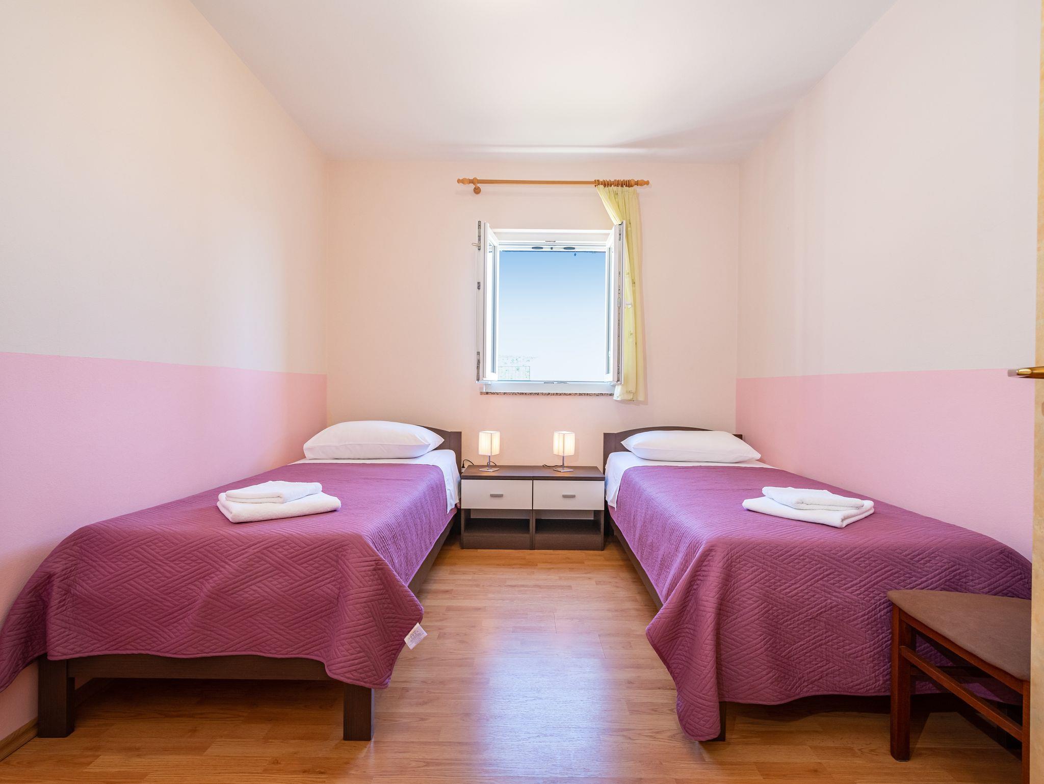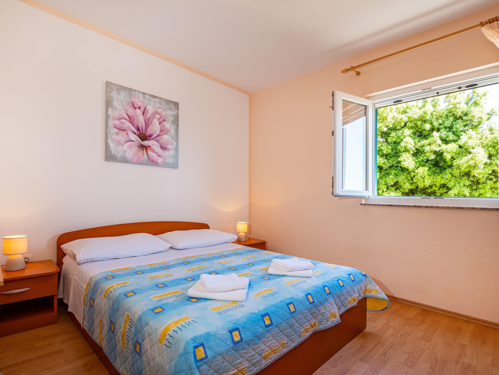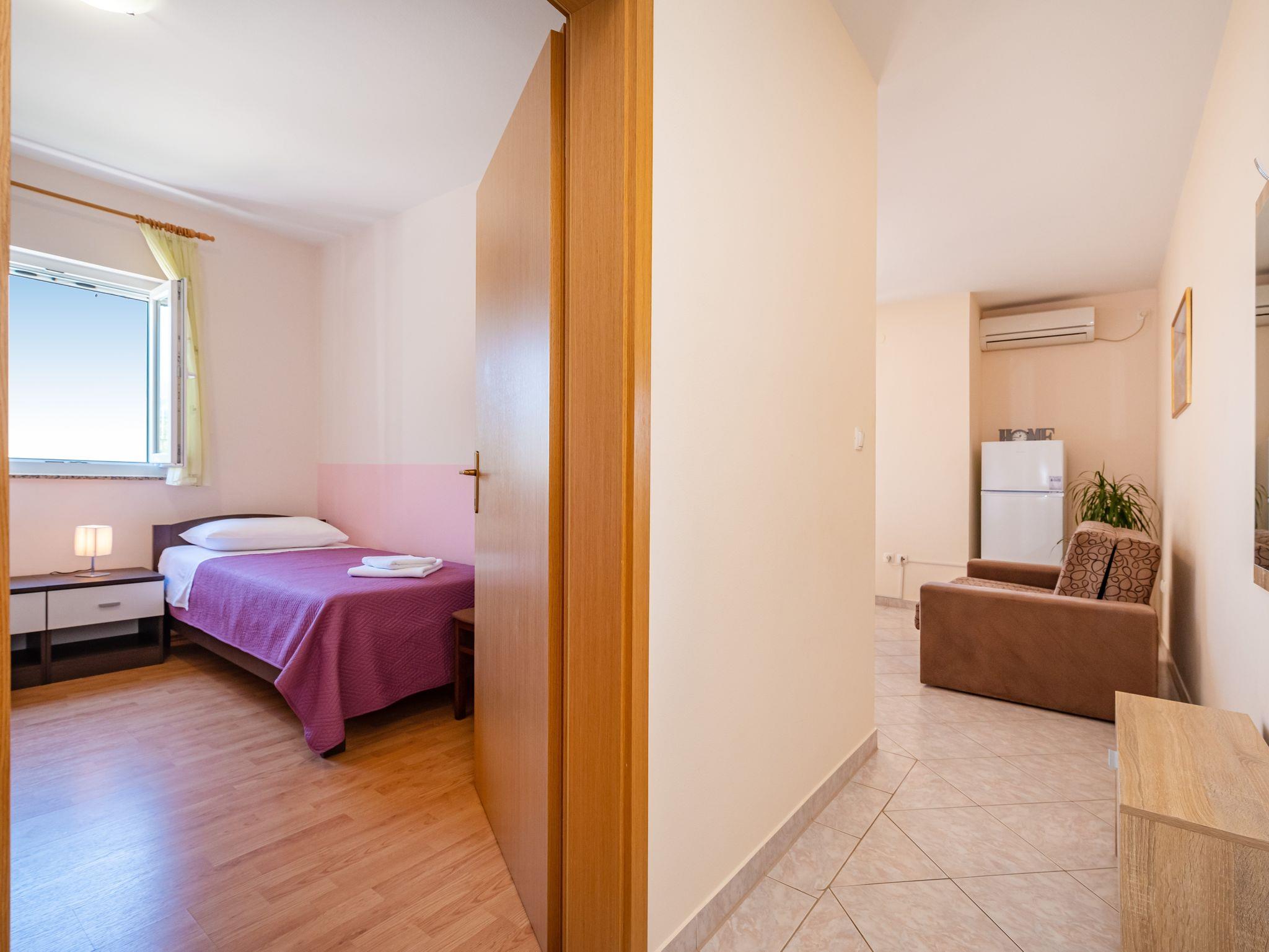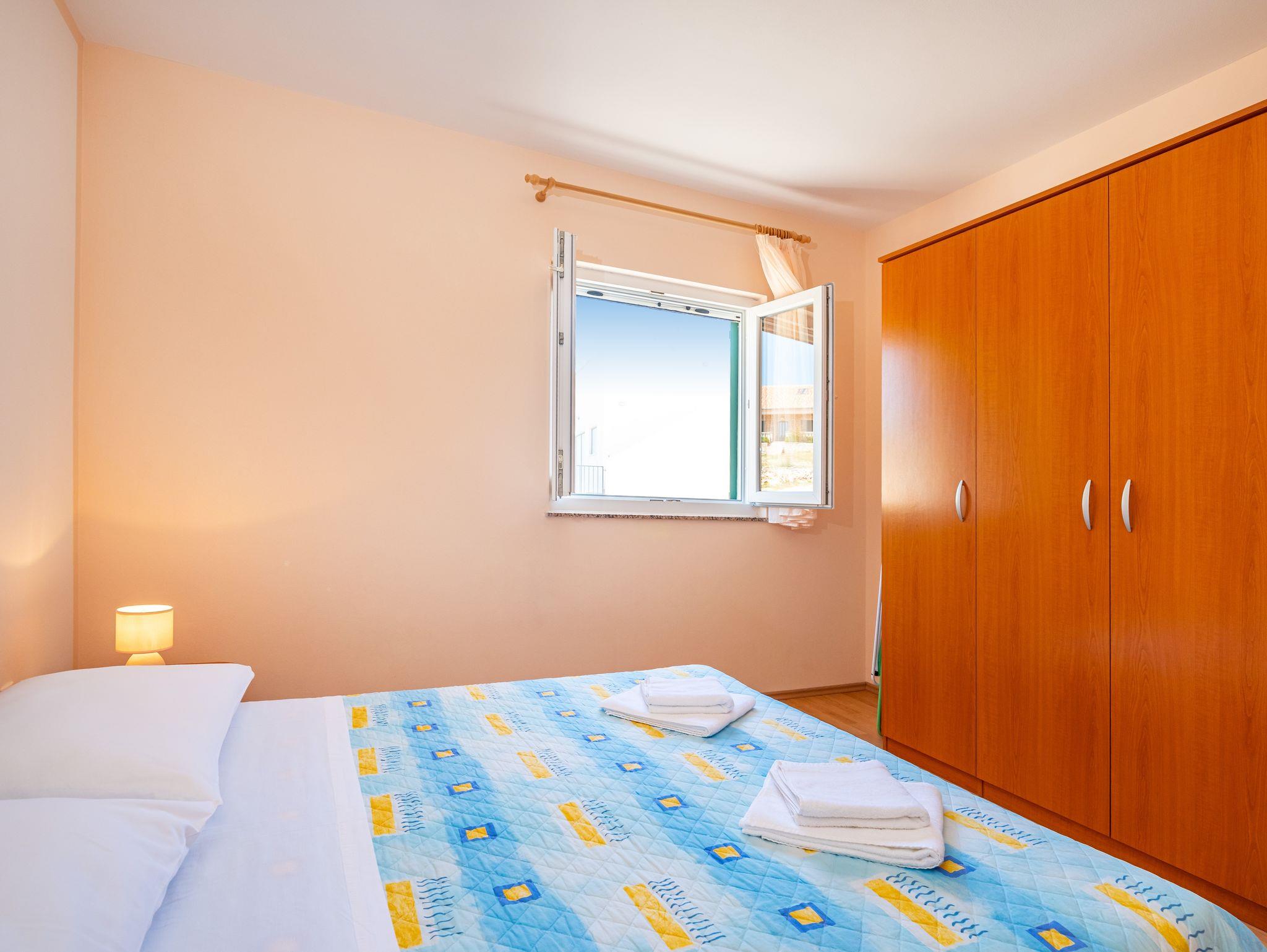 Ferienwohnung bietet Platz für 4 Gäste. Die Betten sind in Schlafzimmern, die es 2 gibt, innerhalb einer Gesamtfläche von 48m2, angeordnet. Die Gäste haben eine eigene Terrasse zur Verfügung, auf der sie in warmen Sommernächten genießen können. Das Apartment bietet Meerblick. Es ist erlaubt, Speisen auf dem Gemeinschafts-Grill vorzubereiten. Während ihres Aufenthalts können Gäste das gemeinsam zur Nutzung stehende Schwimmbad benutzen. IM PREIS INBEGRIFFEN: Kurtaxe, Endreinigung, Klimatisierung, Pool, Parkplatz, Internet, Kinderbett, Bügeleisen, Bügelbrett, Föhn, Sonnenschirm, Liegestühle. VERBINDLICHE ZUSÄTZLICHE KOSTEN: Aufzahlung für Kurzaufenthalte (prozentualer Zuschlag pro Nächtigungsanzahl: 30% - 1, 20% - 2, 10% - 3). Die Verfügbarkeit zusätzlicher Dienstleistungen in Ihrem reservierten Termin und die Preise derselben (falls nicht aufgeführt) müssen im Voraus überprüft werden. Zusätzliche Dienstleistungen die in der Zahlungsaufforderung nicht aufgeführt sind werden direkt beim Vermieter bezahlt, angenommen der Gast nutzt auch diese. Ermäßigung auf den Grundpreis: Gratistag 14=13 (bei einem Aufenthalt von 14 Tagen oder mehr erhalten Sie einen Gratistag für den Aufenthalt bis 31.12.26).