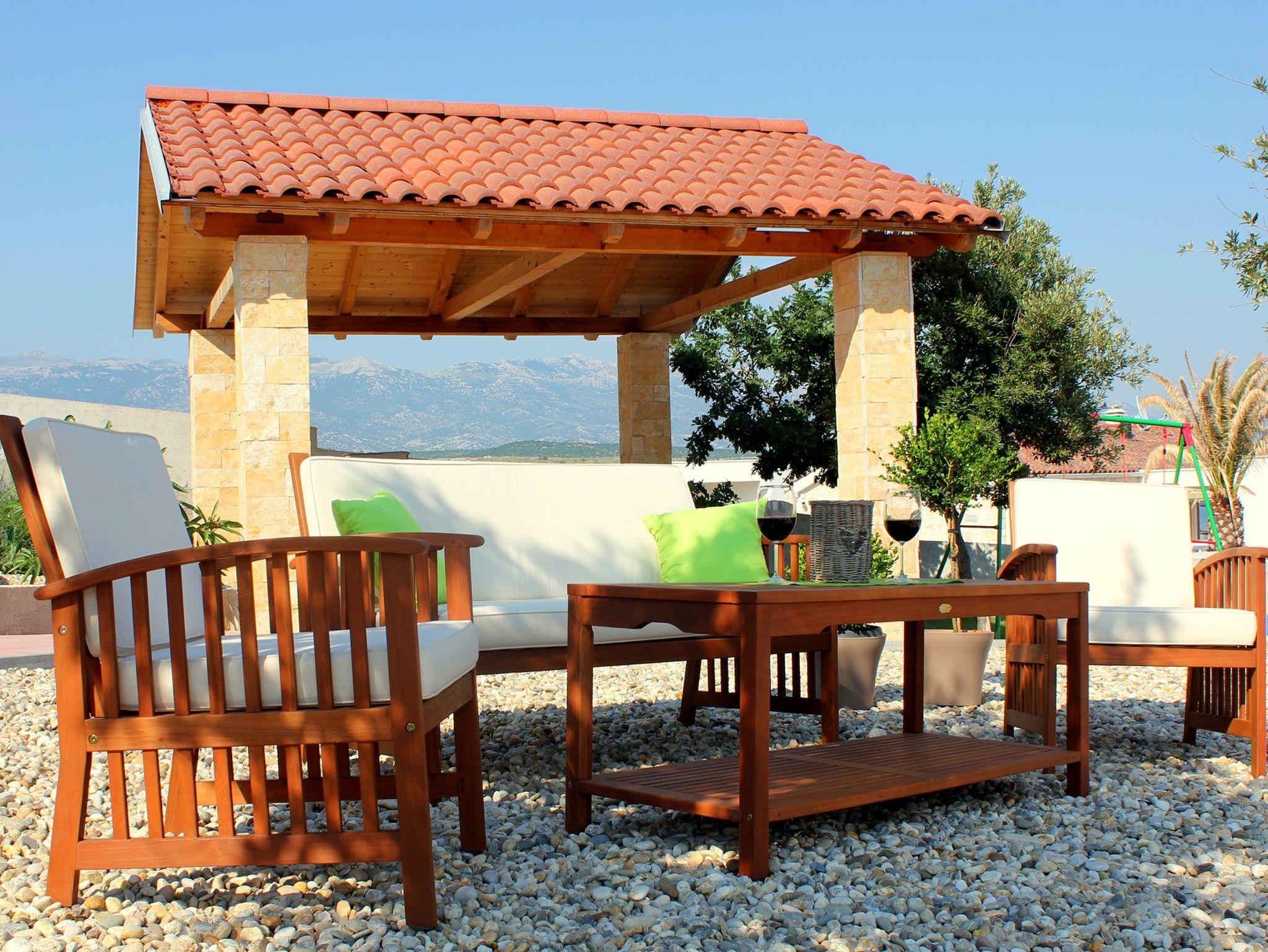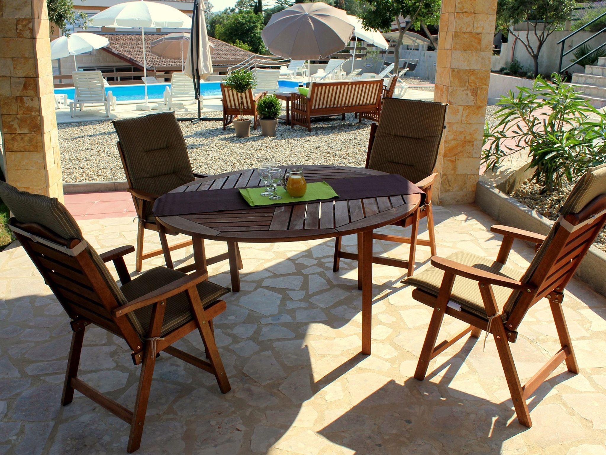 Hof (400m2, Sitzbereich), Parkplatz (Anzahl der Parkplätze: 4, Entfernung vom Objekt: im Hof), Pool: gemeinsam, Dimensionen: 8.2m x 4.2m x 1.4m, Wassertyp: Süßwasser, Grill: gemeinsam, WiFi Internet, Föhn, Bügeleisen, Bügelbrett, Sonnenschirm, Liegestühle, Kinderbett