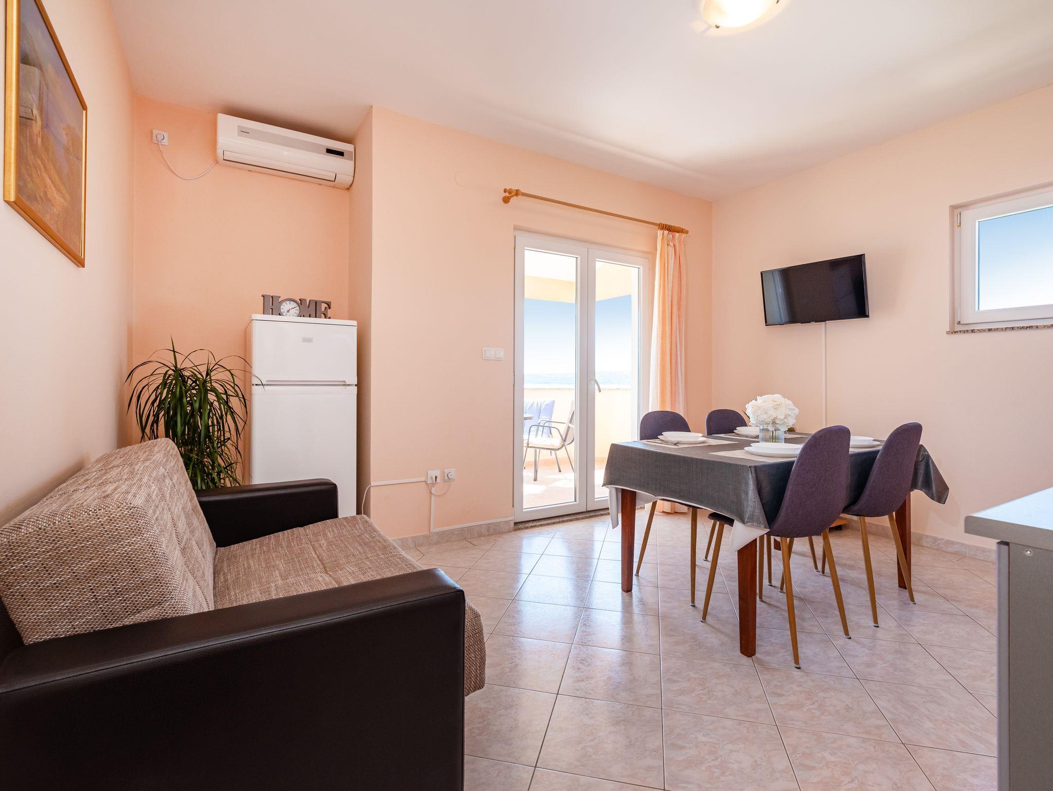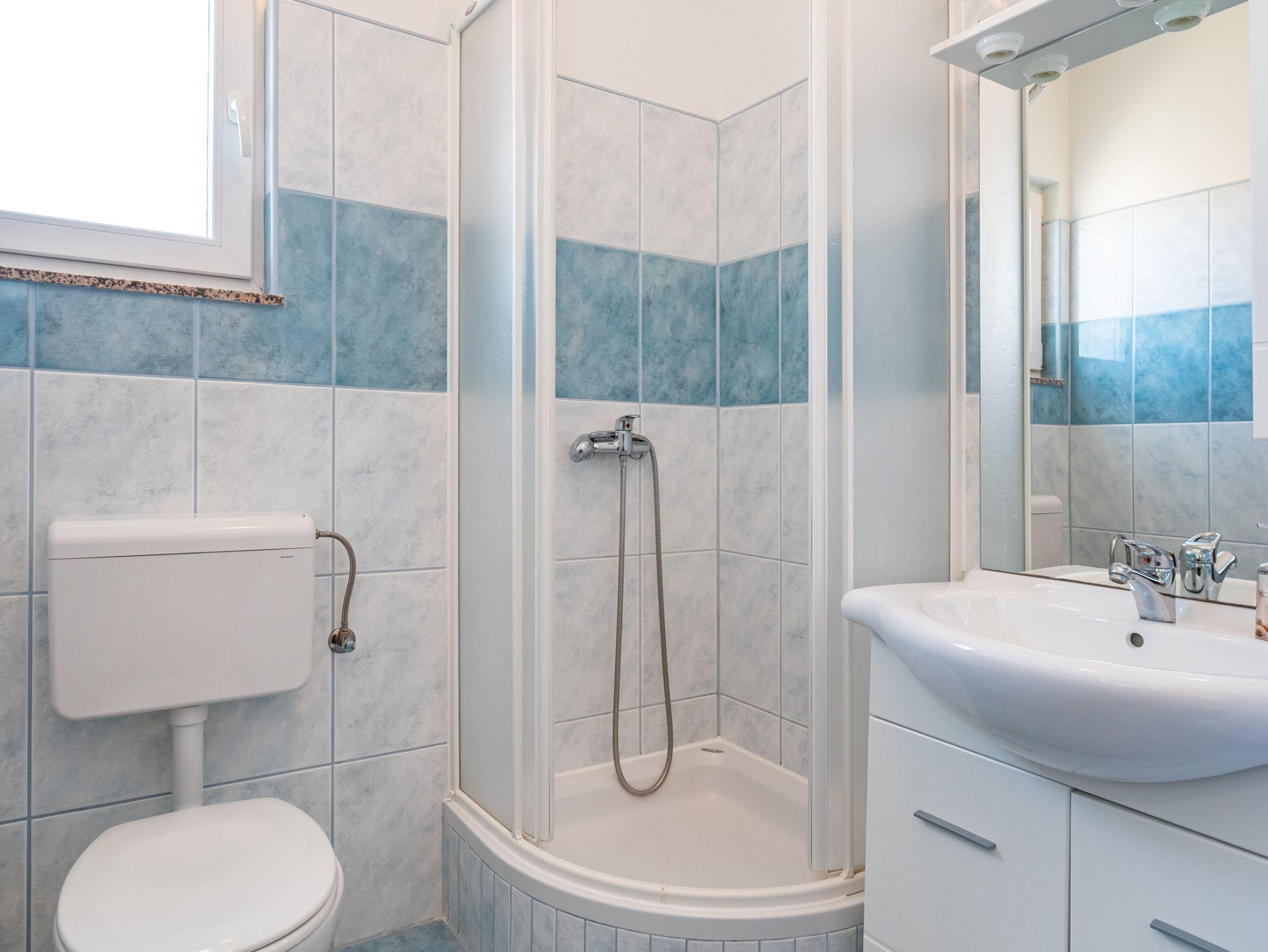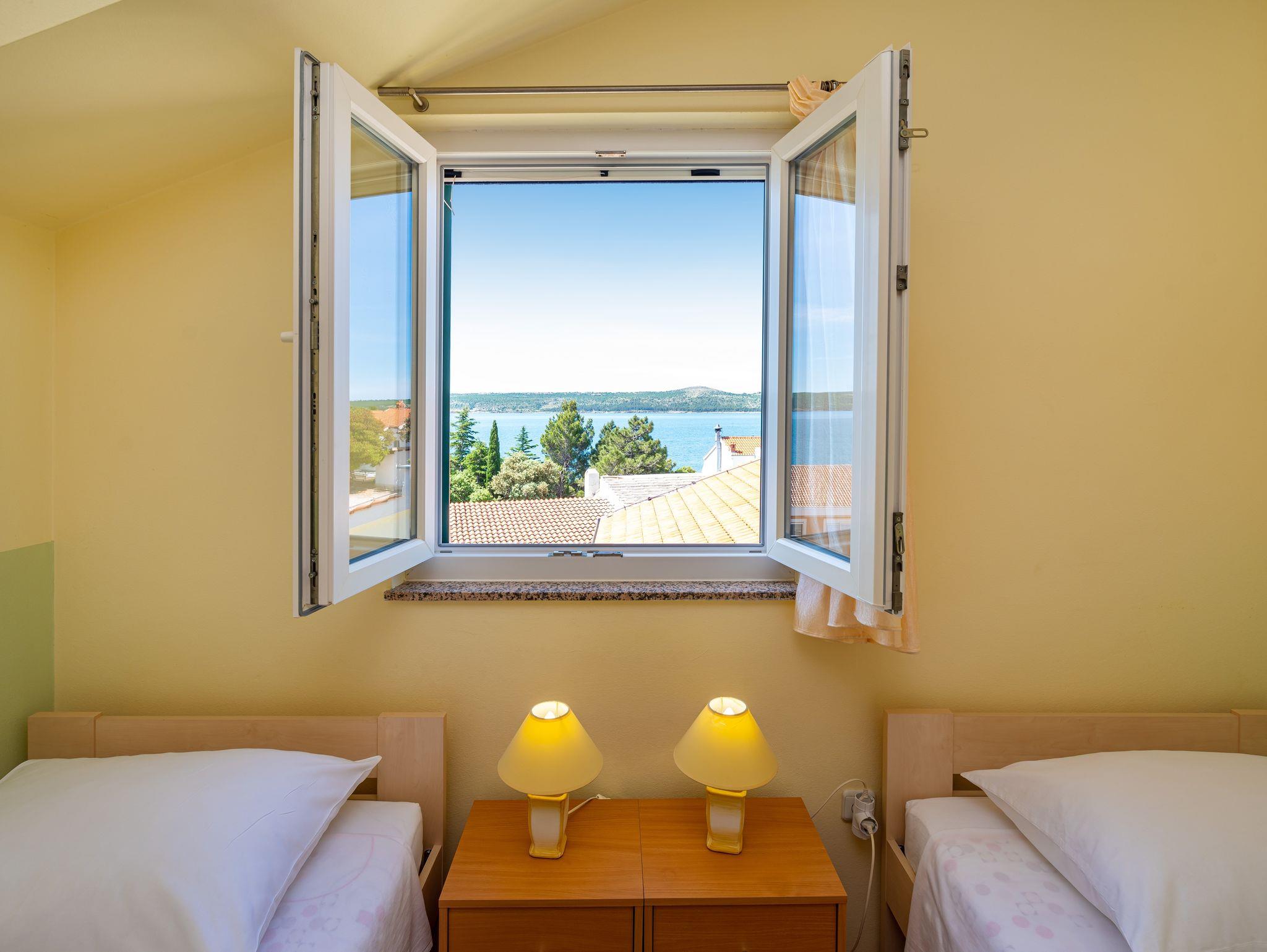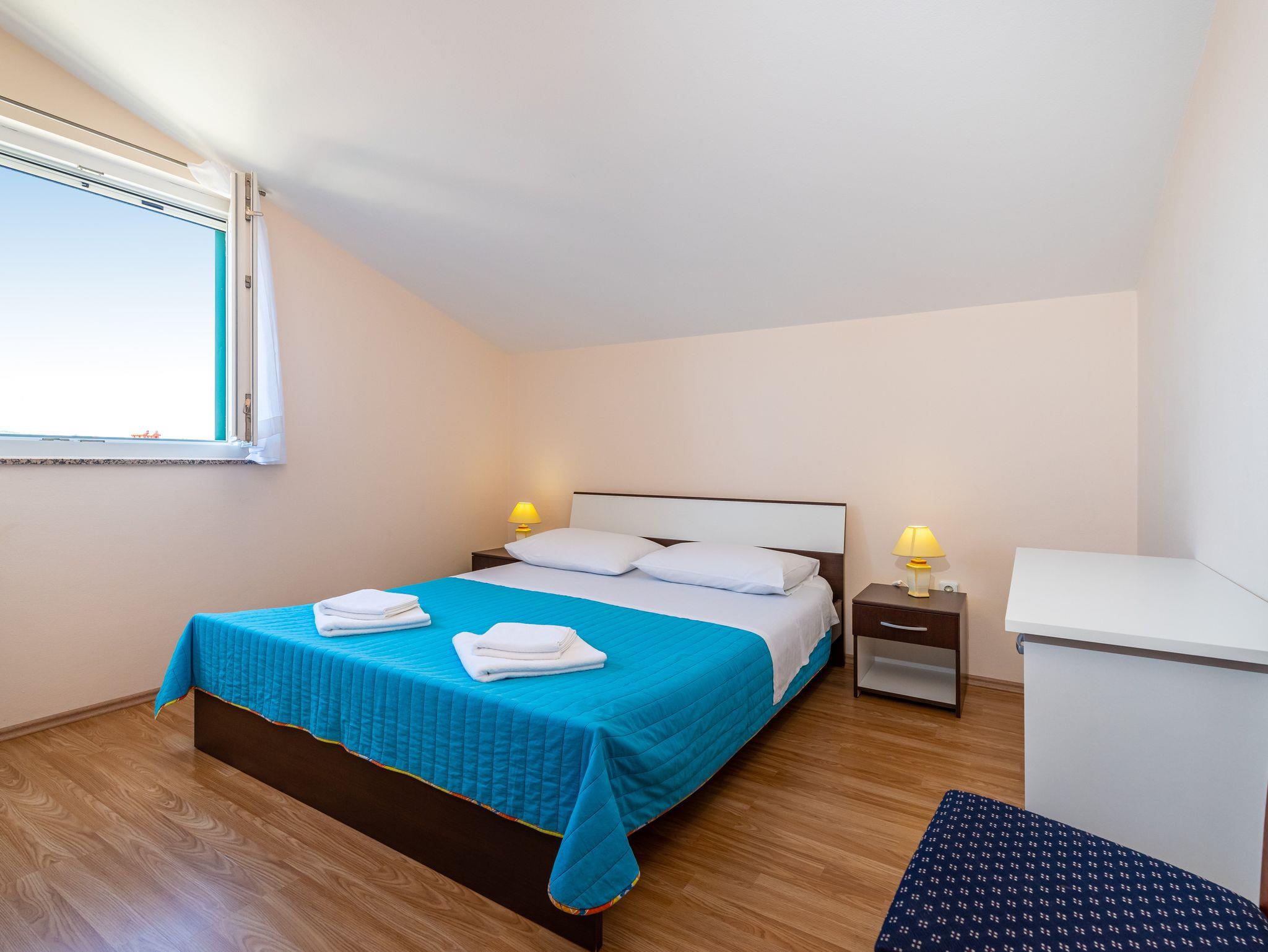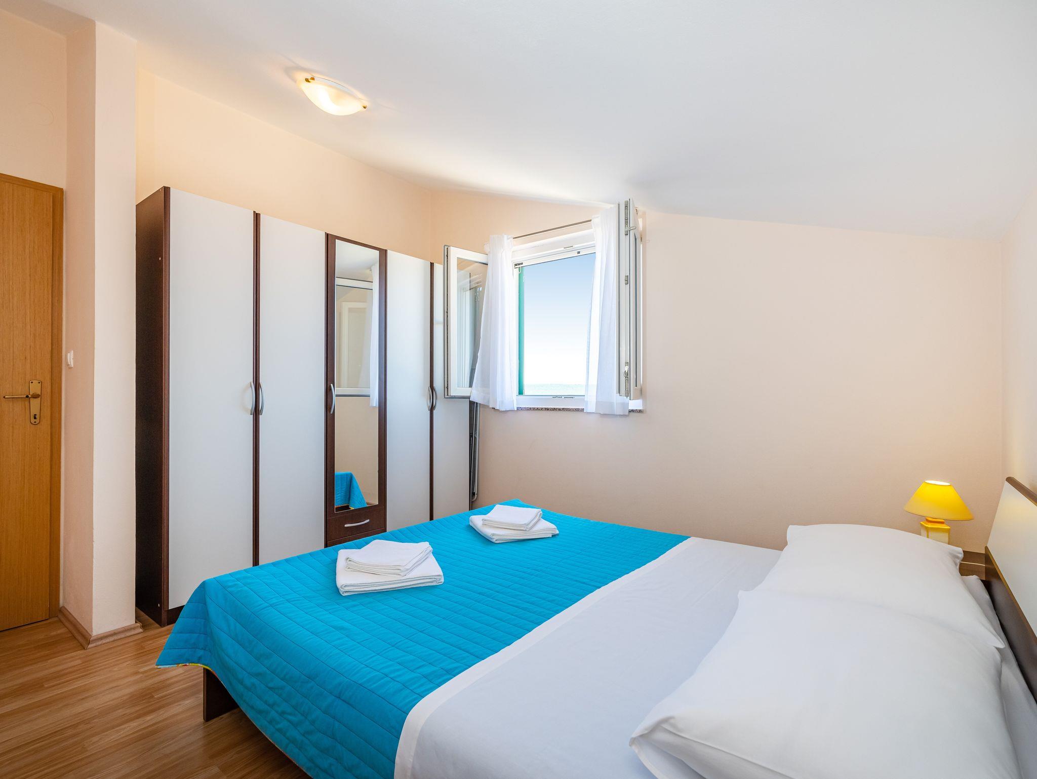 Ferienwohnung bietet Platz für 4 Gäste. Die Betten sind in Schlafzimmern, die es 2 gibt, innerhalb einer Gesamtfläche von 48m2, angeordnet. Die Gäste haben eine eigene Terrasse zur Verfügung, auf der sie in warmen Sommernächten genießen können. Das Apartment bietet Meerblick. Es ist erlaubt, Speisen auf dem Gemeinschafts-Grill vorzubereiten. Während ihres Aufenthalts können Gäste das gemeinsam zur Nutzung stehende Schwimmbad benutzen. IM PREIS INBEGRIFFEN: Kurtaxe, Endreinigung, Klimatisierung, Pool, Parkplatz, Internet, Kinderbett, Bügeleisen, Bügelbrett, Föhn, Sonnenschirm, Liegestühle. VERBINDLICHE ZUSÄTZLICHE KOSTEN: Aufzahlung für Kurzaufenthalte (prozentualer Zuschlag pro Nächtigungsanzahl: 30% - 1, 20% - 2, 10% - 3). Die Verfügbarkeit zusätzlicher Dienstleistungen in Ihrem reservierten Termin und die Preise derselben (falls nicht aufgeführt) müssen im Voraus überprüft werden. Zusätzliche Dienstleistungen die in der Zahlungsaufforderung nicht aufgeführt sind werden direkt beim Vermieter bezahlt, angenommen der Gast nutzt auch diese. Ermäßigung auf den Grundpreis: Gratistag 14=13 (bei einem Aufenthalt von 14 Tagen oder mehr erhalten Sie einen Gratistag für den Aufenthalt bis 31.12.26).
