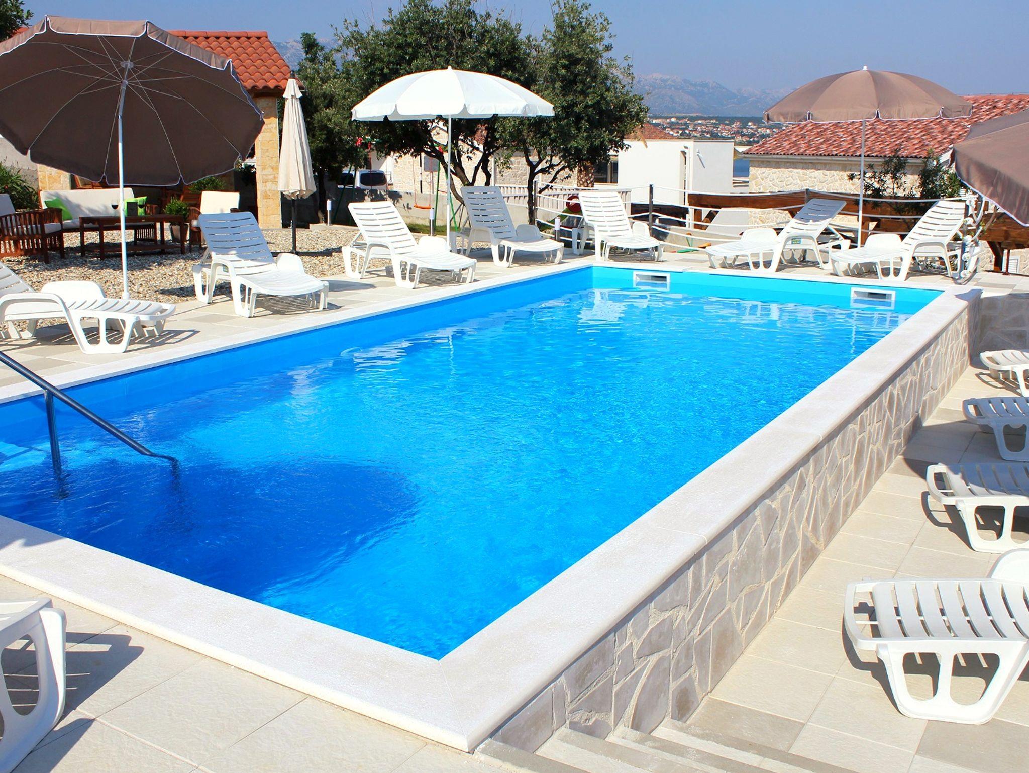 Hof (400m2, Sitzbereich), Parkplatz (Anzahl der Parkplätze: 4, Entfernung vom Objekt: im Hof), Pool: gemeinsam, Dimensionen: 8.2m x 4.2m x 1.4m, Wassertyp: Süßwasser, Grill: gemeinsam, WiFi Internet, Föhn, Bügeleisen, Bügelbrett, Sonnenschirm, Liegestühle, Kinderbett