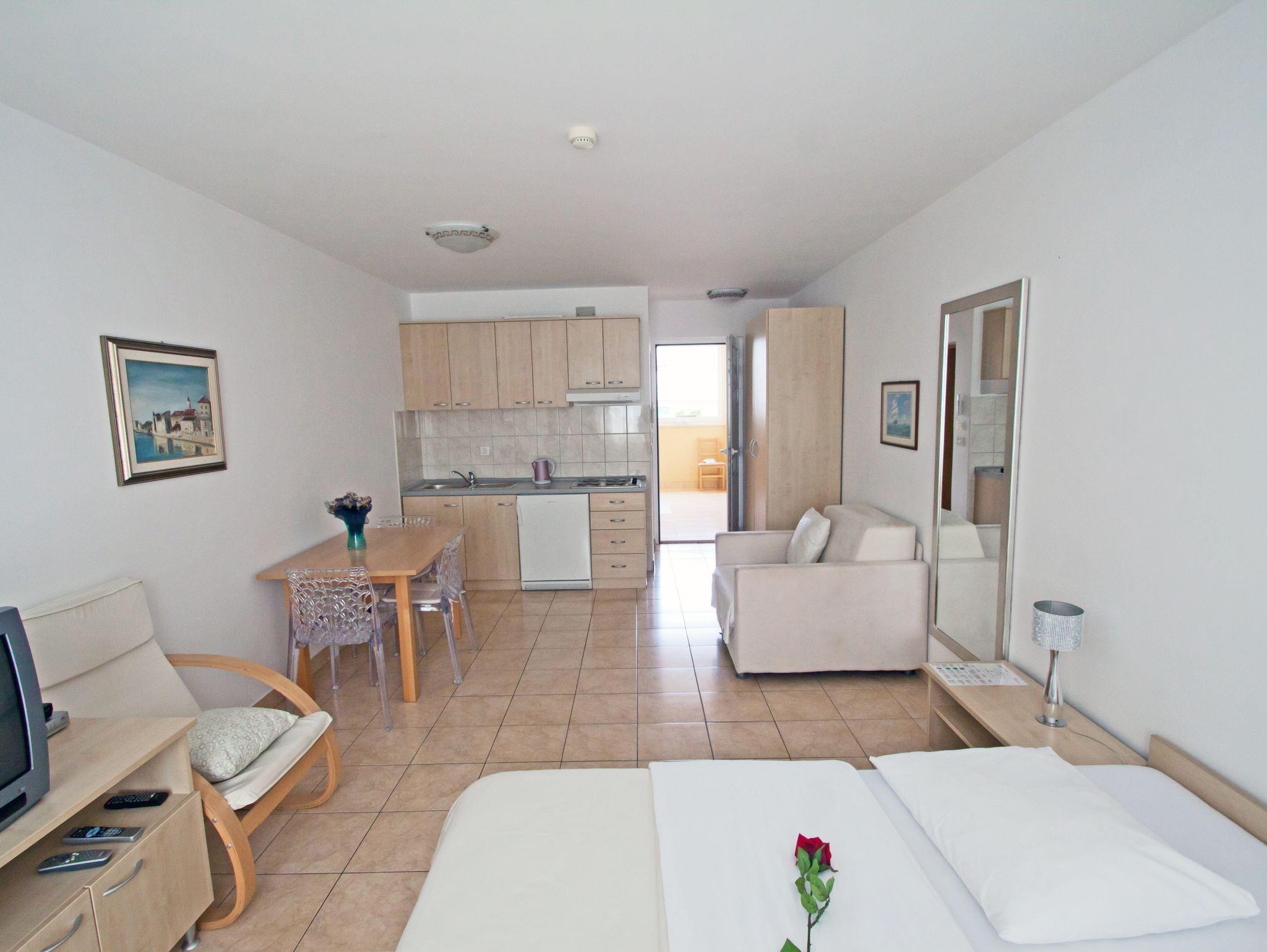 Studio bietet Platz für 2 Gäste. Die Betten sind in Schlafzimmern, die es 1 gibt, innerhalb einer Gesamtfläche von 27m2, angeordnet. Die reservierte Unterkunftseinheit hat keinen Balkon und keine Terrasse. IM PREIS INBEGRIFFEN: Endreinigung, Klimatisierung, Parkplatz, Internet, Bügeleisen, Bügelbrett, Föhn, Sonnenschirm, Liegestühle. VERBINDLICHE ZUSÄTZLICHE KOSTEN: Kurtaxe (Erwachsene 0,93 € - 1,50 € Nacht/Person, Kinderermäßigung 12 - 17 Jahre), Aufzahlung für Kurzaufenthalte (prozentualer Zuschlag pro Nächtigungsanzahl: 30% - 1, 20% - 2, 10% - 3). UNVERBINDLICHE ZUSÄTZLICHE KOSTEN: Zusatzbett (35,00 € pro Nacht). Die Verfügbarkeit zusätzlicher Dienstleistungen in Ihrem reservierten Termin und die Preise derselben (falls nicht aufgeführt) müssen im Voraus überprüft werden. Zusätzliche Dienstleistungen die in der Zahlungsaufforderung nicht aufgeführt sind werden direkt beim Vermieter bezahlt, angenommen der Gast nutzt auch diese.