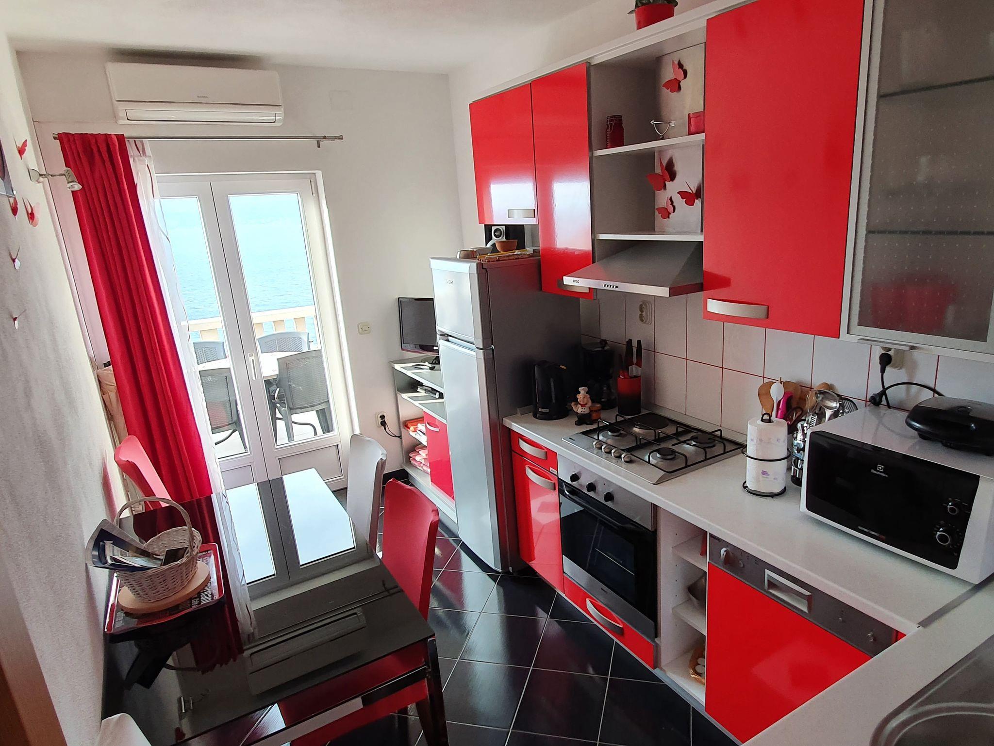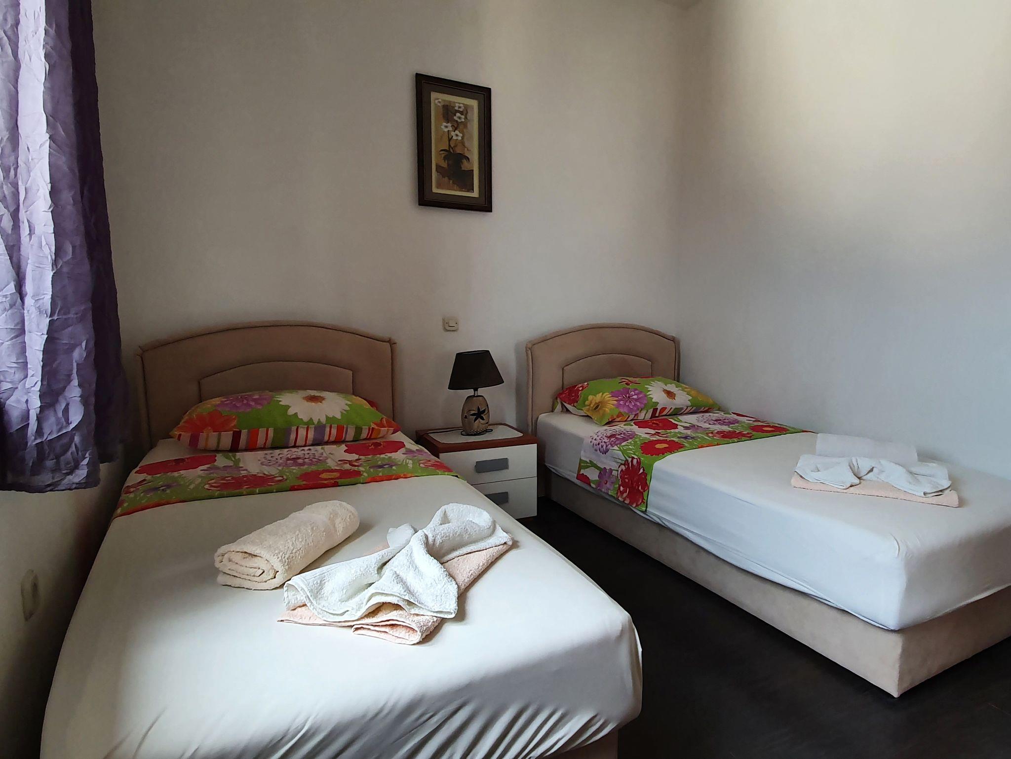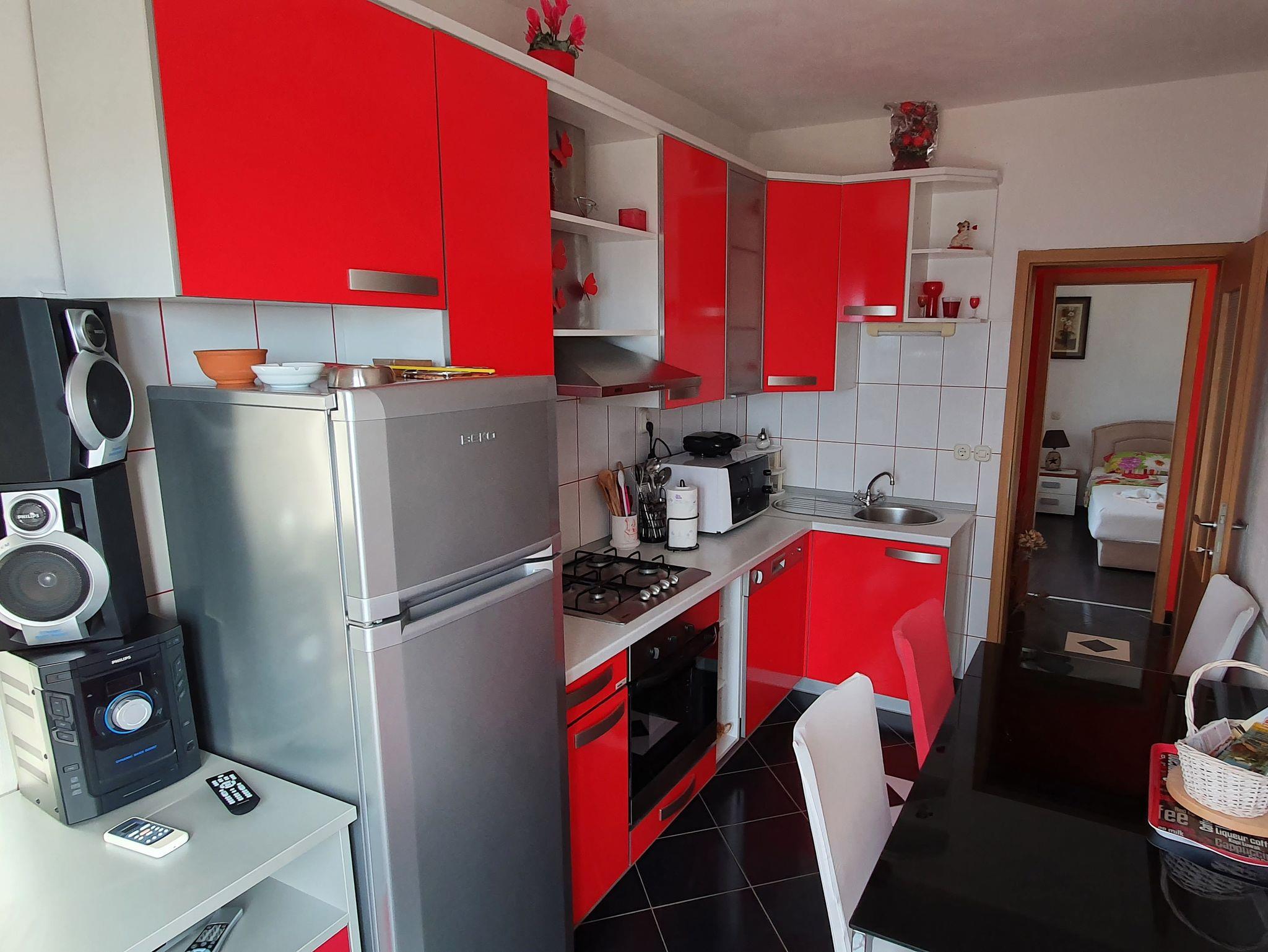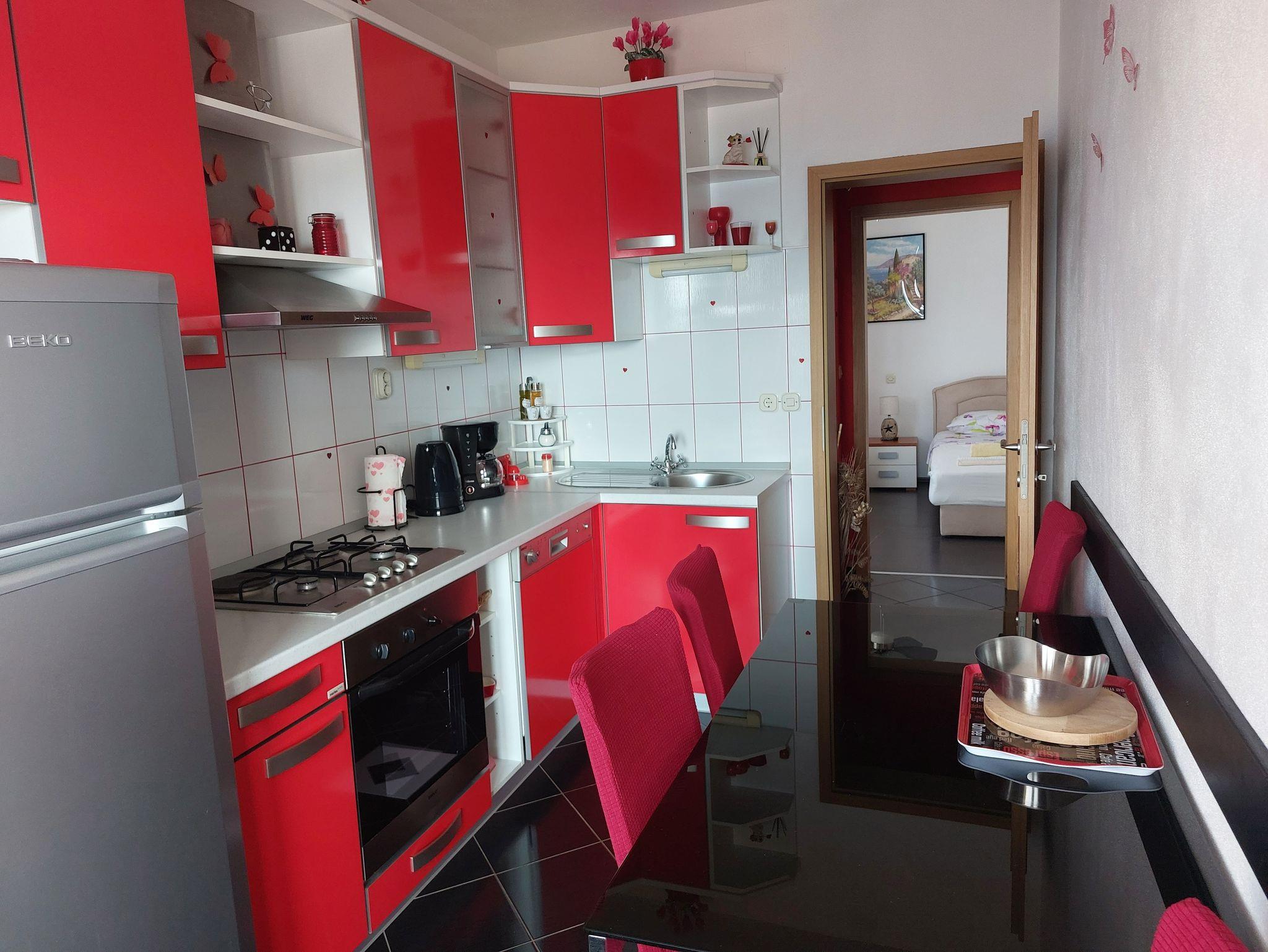 Ferienwohnung bietet Platz für 4 Gäste. Die Betten sind in Schlafzimmern, die es 2 gibt, innerhalb einer Gesamtfläche von 41m2, angeordnet. Die Gäste haben eine eigene Terrasse zur Verfügung, auf der sie in warmen Sommernächten genießen können. Das Apartment bietet Meerblick. Es ist erlaubt, Speisen auf dem Gemeinschafts-Grill vorzubereiten. IM PREIS INBEGRIFFEN: Kurtaxe, Endreinigung, Klimatisierung, Parkplatz, Internet, Kinderbett, Bügeleisen, Bügelbrett, Föhn. VERBINDLICHE ZUSÄTZLICHE KOSTEN: Aufzahlung für Kurzaufenthalte (prozentualer Zuschlag pro Nächtigungsanzahl: 30% - 1, 20% - 2, 10% - 3). Die Verfügbarkeit zusätzlicher Dienstleistungen in Ihrem reservierten Termin und die Preise derselben (falls nicht aufgeführt) müssen im Voraus überprüft werden. Zusätzliche Dienstleistungen die in der Zahlungsaufforderung nicht aufgeführt sind werden direkt beim Vermieter bezahlt, angenommen der Gast nutzt auch diese. Ermäßigung auf den Grundpreis: Gratistag 14=13 (bei einem Aufenthalt von 14 Tagen oder mehr erhalten Sie einen Gratistag für den Aufenthalt bis 31.12.26).