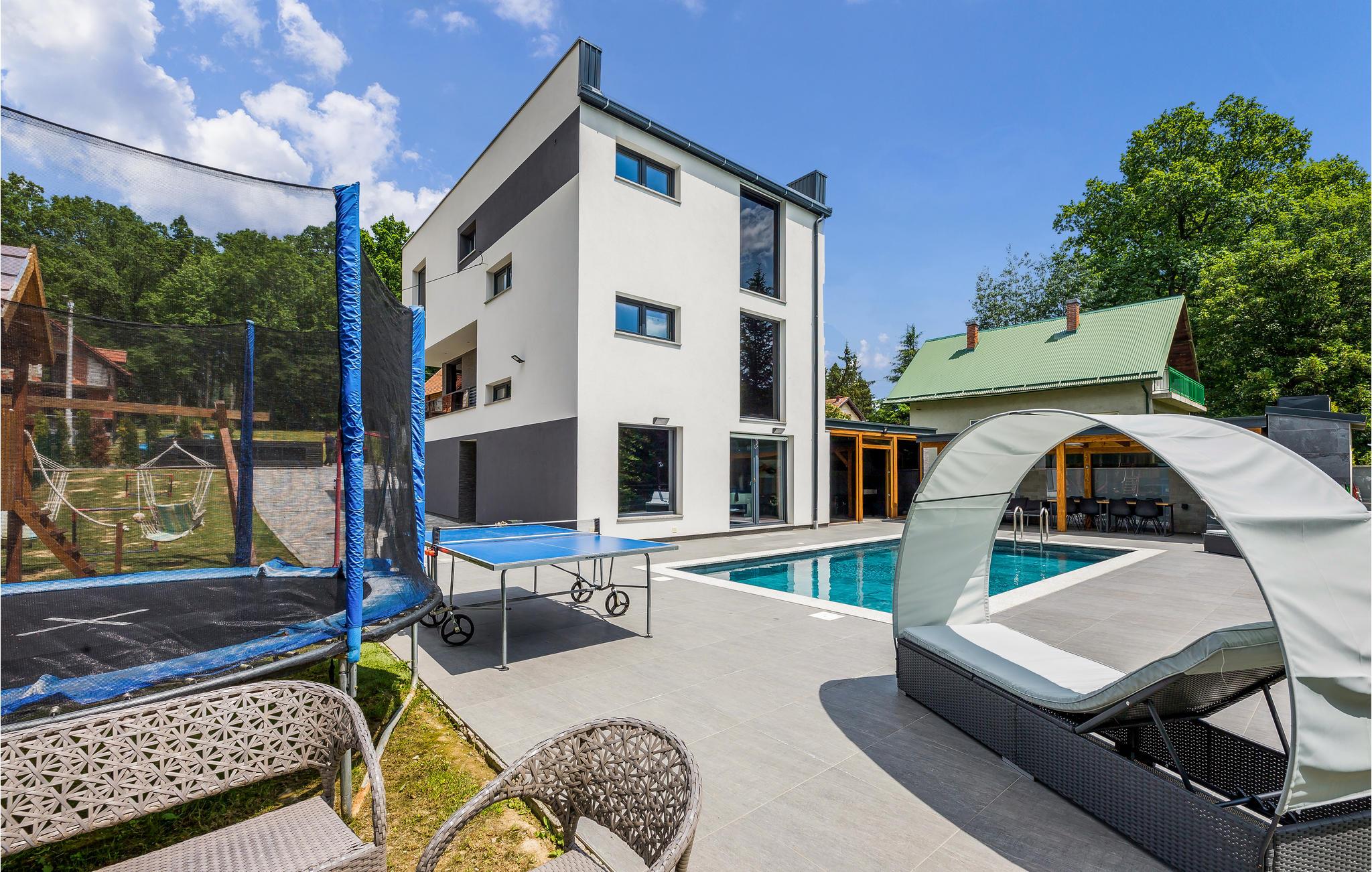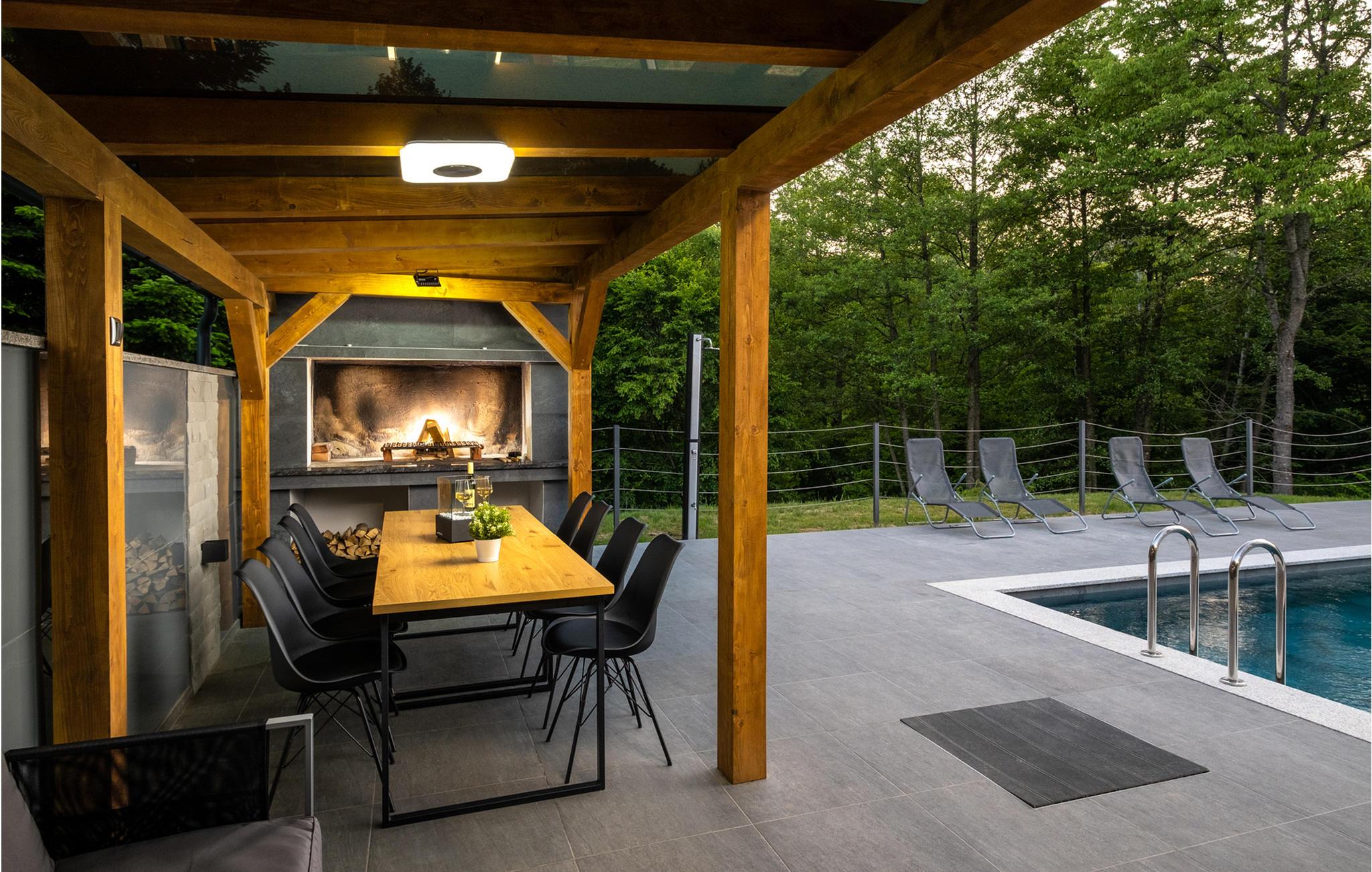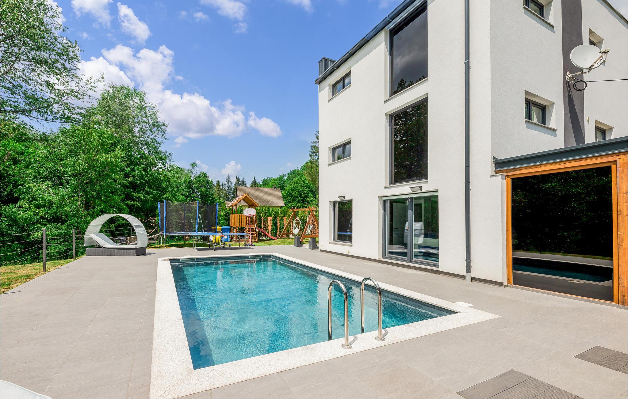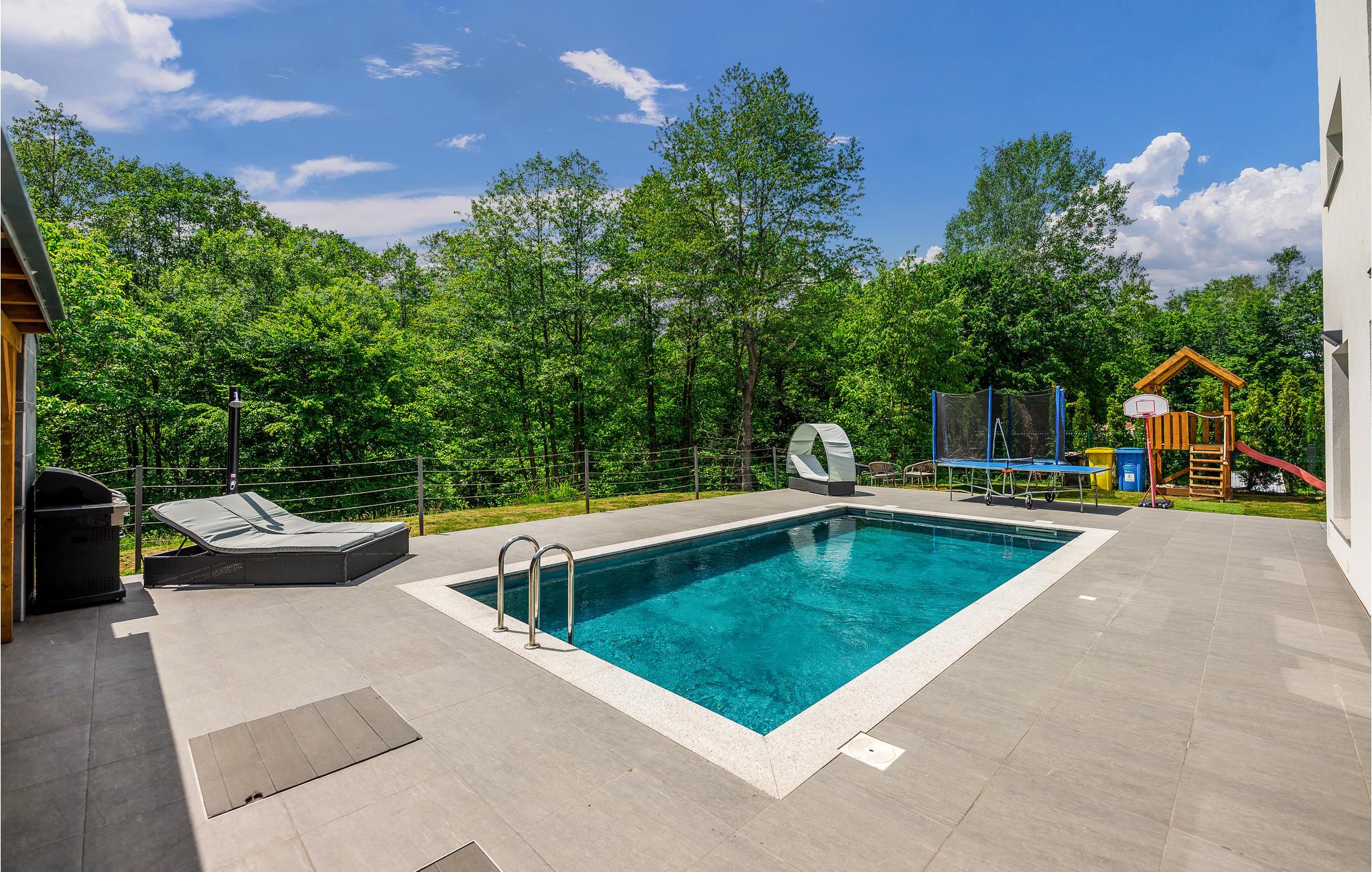 Den opvarmede udendørs pool er endnu et højdepunkt i feriehuset, og det velplejede område er ideelt til længere ophold udendørs.