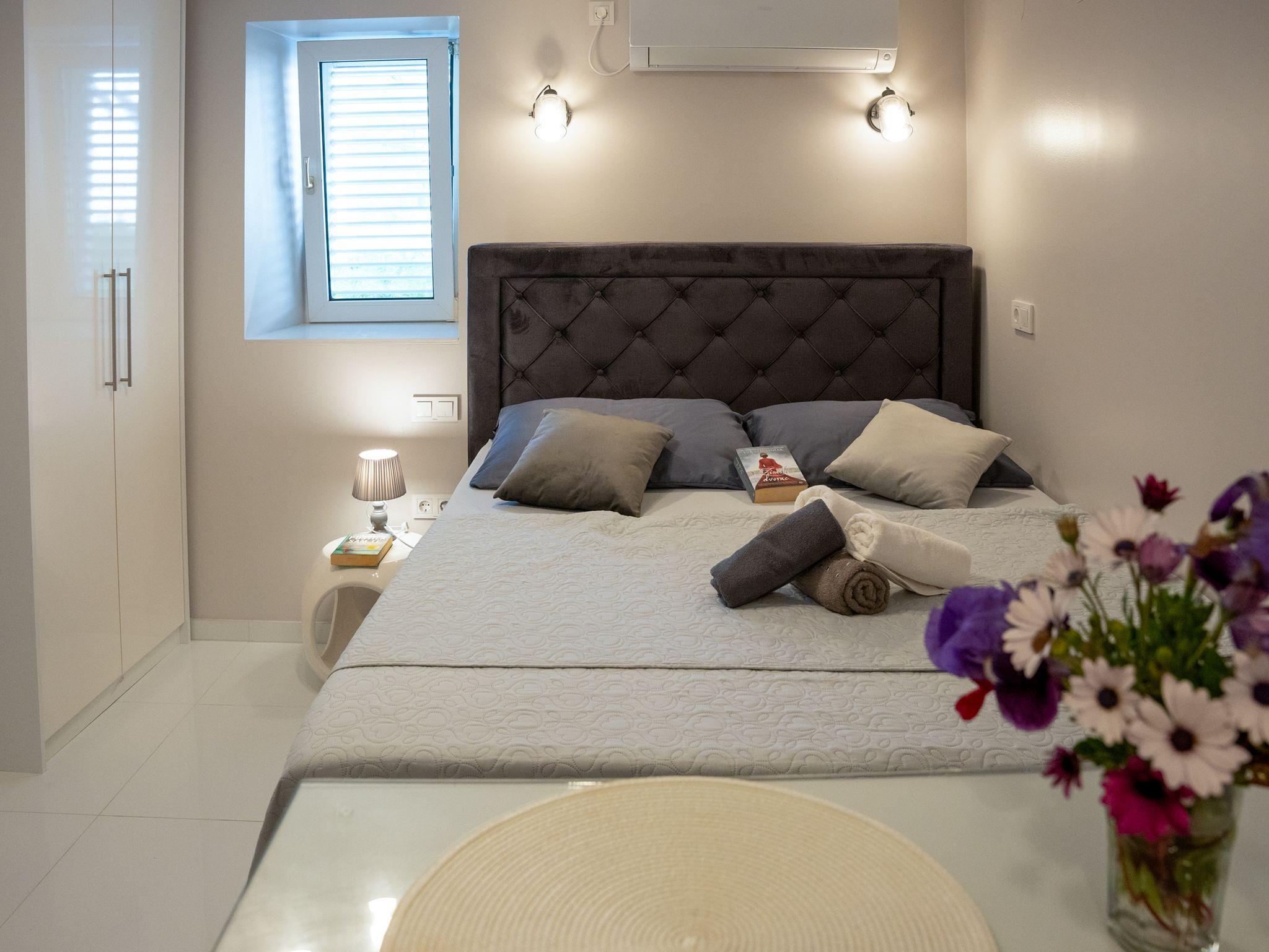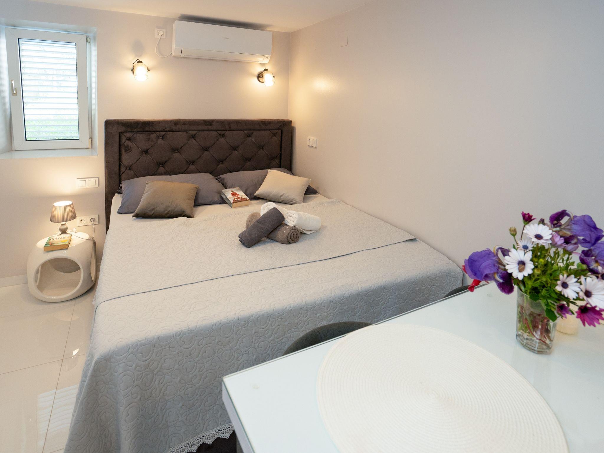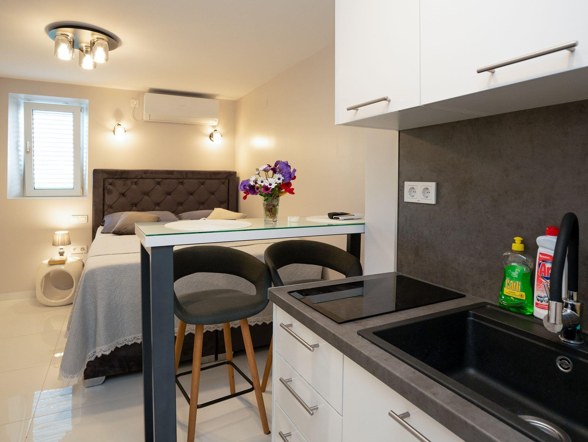 Studio bietet Platz für 2 Gäste. Die Betten sind in Schlafzimmern, die es 1 gibt, innerhalb einer Gesamtfläche von 22m2, angeordnet. Das Studio-Apartment bietet Meerblick. Es ist erlaubt, Speisen auf dem Gemeinschafts-Grill vorzubereiten. Die reservierte Unterkunftseinheit verfügt über einen gemeinsame Terrasse. IM PREIS INBEGRIFFEN: Kurtaxe, Endreinigung, Klimatisierung, Internet, Wäschewaschen, Bootsanlegeplatz, Bügeleisen, Bügelbrett, Föhn. VERBINDLICHE ZUSÄTZLICHE KOSTEN: Aufzahlung für Kurzaufenthalte (prozentualer Zuschlag pro Nächtigungsanzahl: 30% - 1, 20% - 2, 10% - 3). Die Verfügbarkeit zusätzlicher Dienstleistungen in Ihrem reservierten Termin und die Preise derselben (falls nicht aufgeführt) müssen im Voraus überprüft werden. Zusätzliche Dienstleistungen die in der Zahlungsaufforderung nicht aufgeführt sind werden direkt beim Vermieter bezahlt, angenommen der Gast nutzt auch diese.
