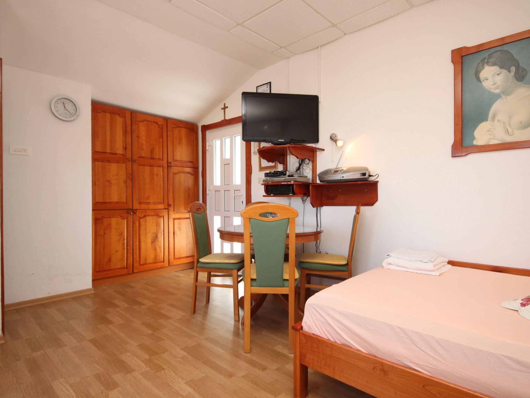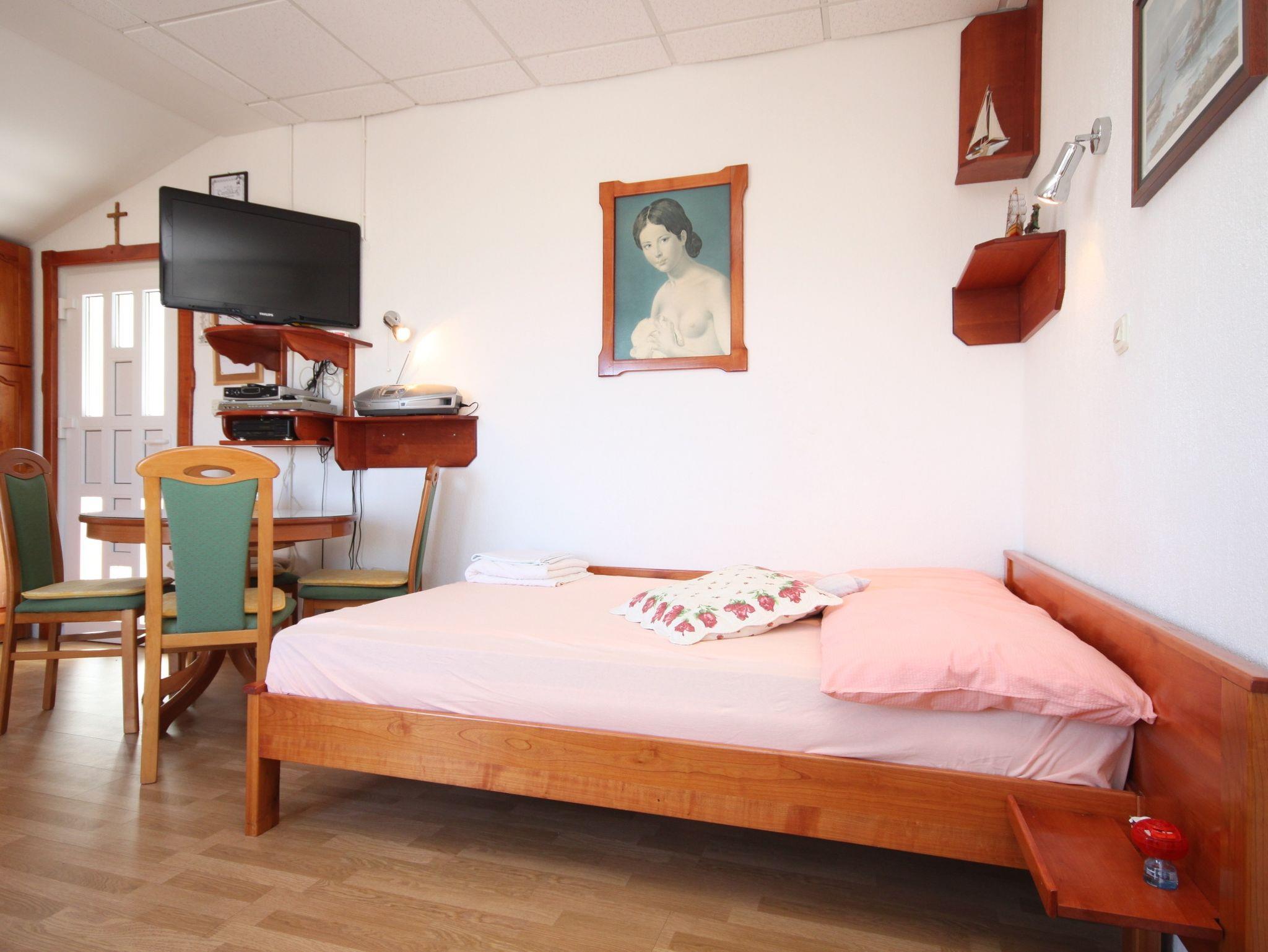Studio bietet Platz für 3 Gäste. Die Betten sind in Schlafzimmern, die es 1 gibt, innerhalb einer Gesamtfläche von 19m2, angeordnet. Die Gäste haben eine eigene Terrasse zur Verfügung, auf der sie in warmen Sommernächten genießen können. Das Studio-Apartment bietet Meerblick. Für vollen Genuss und Entspannung gibt es einen privaten Grill für Gäste dieser Unterkunft. IM PREIS INBEGRIFFEN: Kurtaxe, Endreinigung, Klimatisierung, Parkplatz, Internet, Wäschewaschen, Kinderbett, Bügeleisen, Bügelbrett, Föhn. VERBINDLICHE ZUSÄTZLICHE KOSTEN: Aufzahlung für Kurzaufenthalte (prozentualer Zuschlag pro Nächtigungsanzahl: 30% - 1, 20% - 2, 10% - 3). Die Verfügbarkeit zusätzlicher Dienstleistungen in Ihrem reservierten Termin und die Preise derselben (falls nicht aufgeführt) müssen im Voraus überprüft werden. Zusätzliche Dienstleistungen die in der Zahlungsaufforderung nicht aufgeführt sind werden direkt beim Vermieter bezahlt, angenommen der Gast nutzt auch diese.