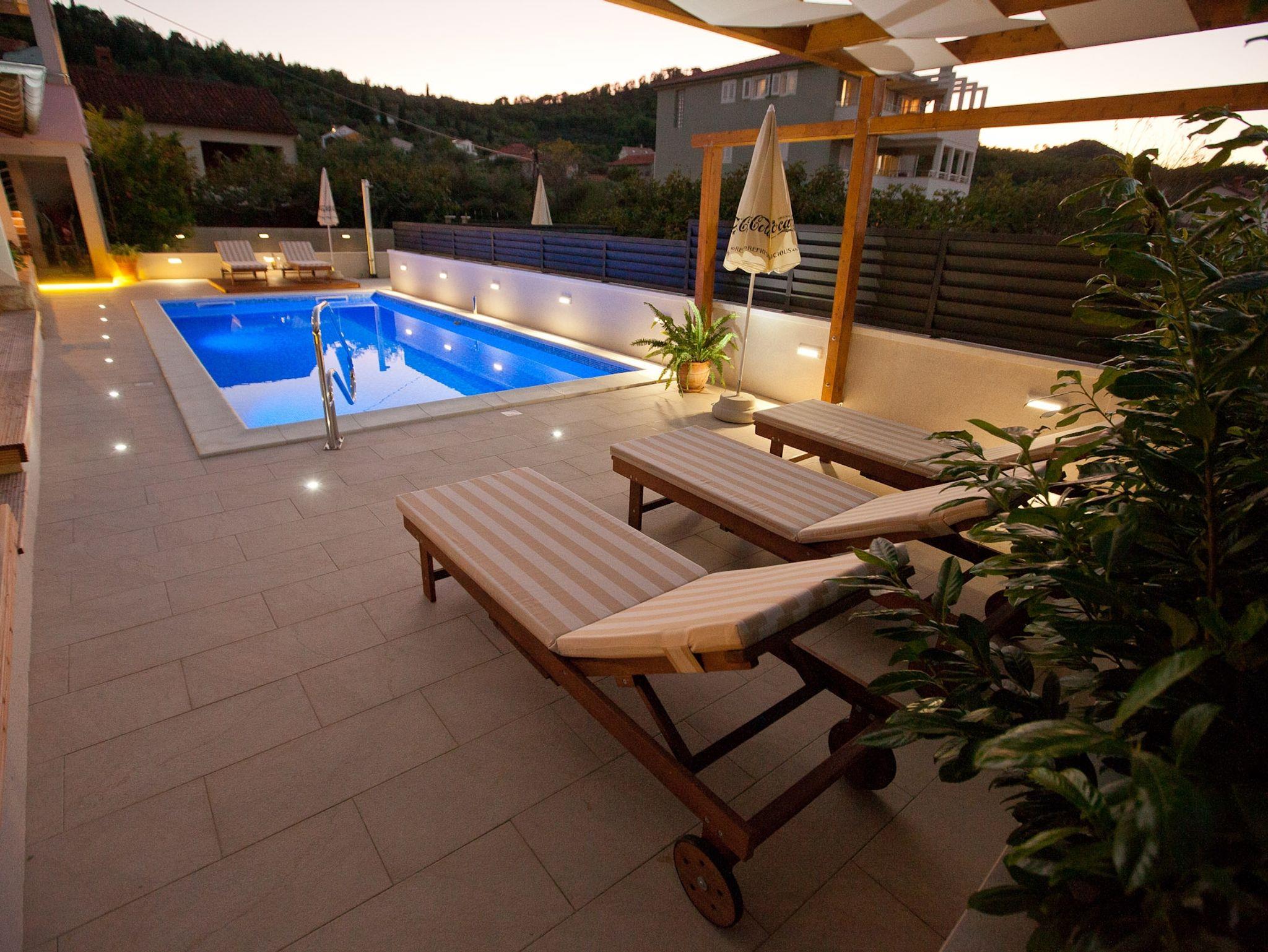 Hof (50m2, Sitzbereich), Parkplatz (Anzahl der Parkplätze: 5, Entfernung vom Objekt: im Hof), Pool: gemeinsam, Dimensionen: 8m x 3.5m x 1.45m, Wassertyp: Süßwasser, Grill: gemeinsam, WiFi Internet, Föhn, Bügeleisen, Bügelbrett, Tragbarer Grill