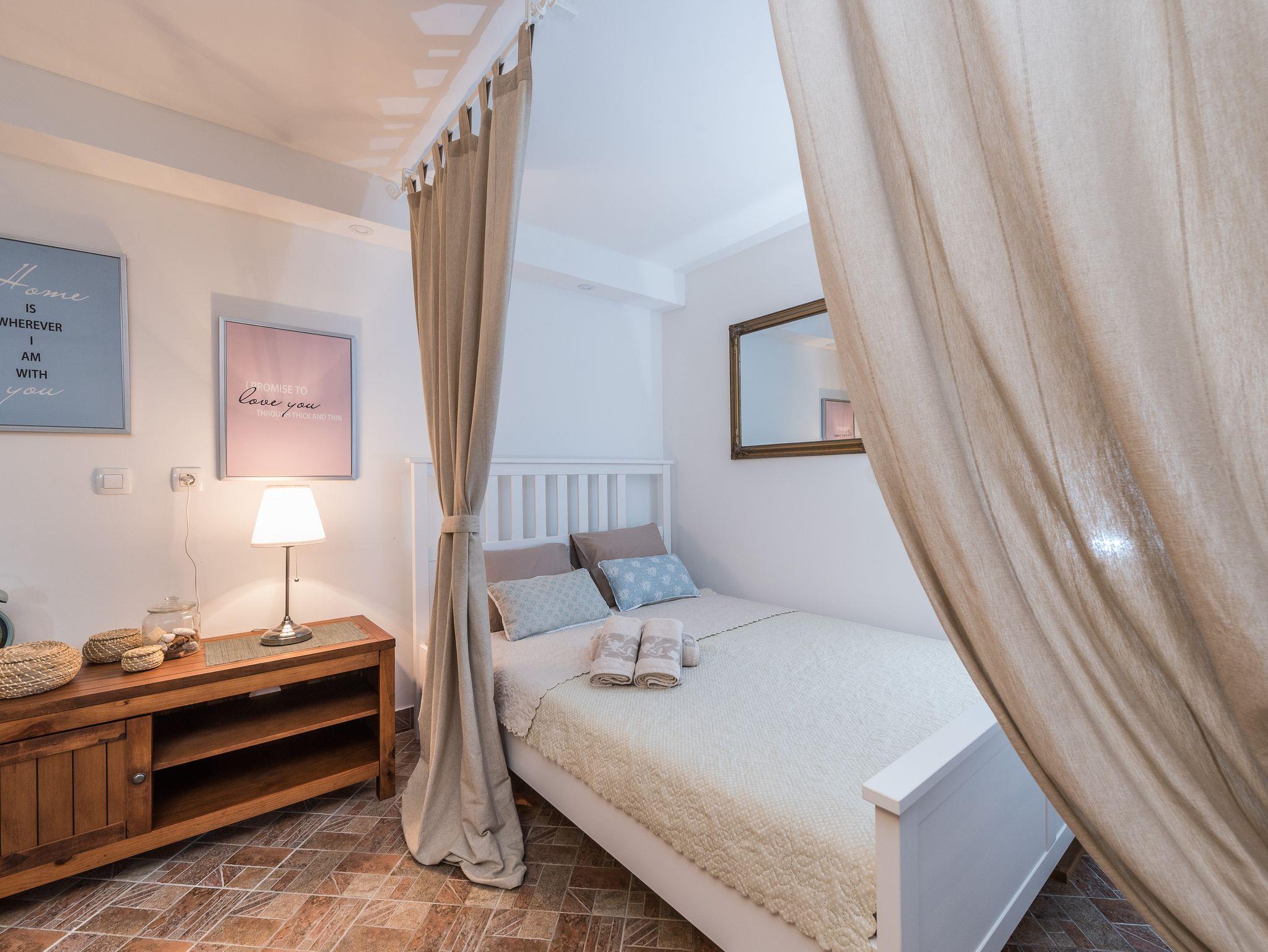 Ferienwohnung bietet Platz für 4 Gäste. Die Betten sind in Schlafzimmern, die es 1 gibt, und in Wohnzimmer, innerhalb einer Gesamtfläche von 64m2, angeordnet. Es ist erlaubt, Speisen auf dem Gemeinschafts-Grill vorzubereiten. Während ihres Aufenthalts können Gäste das gemeinsam zur Nutzung stehende Schwimmbad benutzen. Die reservierte Unterkunftseinheit hat keinen Balkon und keine Terrasse. IM PREIS INBEGRIFFEN: Kurtaxe, Endreinigung, Pool, Parkplatz, Internet, Kinderbett, Bügeleisen, Bügelbrett, Föhn, Sonnenschirm, Liegestühle. UNVERBINDLICHE ZUSÄTZLICHE KOSTEN: Klimatisierung (5,00 € pro Nacht), Boot (200,00 € pro Nacht), Bootsanlegeplatz (10,00 € pro Nacht). Die Verfügbarkeit zusätzlicher Dienstleistungen in Ihrem reservierten Termin und die Preise derselben (falls nicht aufgeführt) müssen im Voraus überprüft werden. Zusätzliche Dienstleistungen die in der Zahlungsaufforderung nicht aufgeführt sind werden direkt beim Vermieter bezahlt, angenommen der Gast nutzt auch diese. Ermäßigung auf den Grundpreis: Gratistag 14=13 (bei einem Aufenthalt von 14 Tagen oder mehr erhalten Sie einen Gratistag für den Aufenthalt bis 31.12.26).