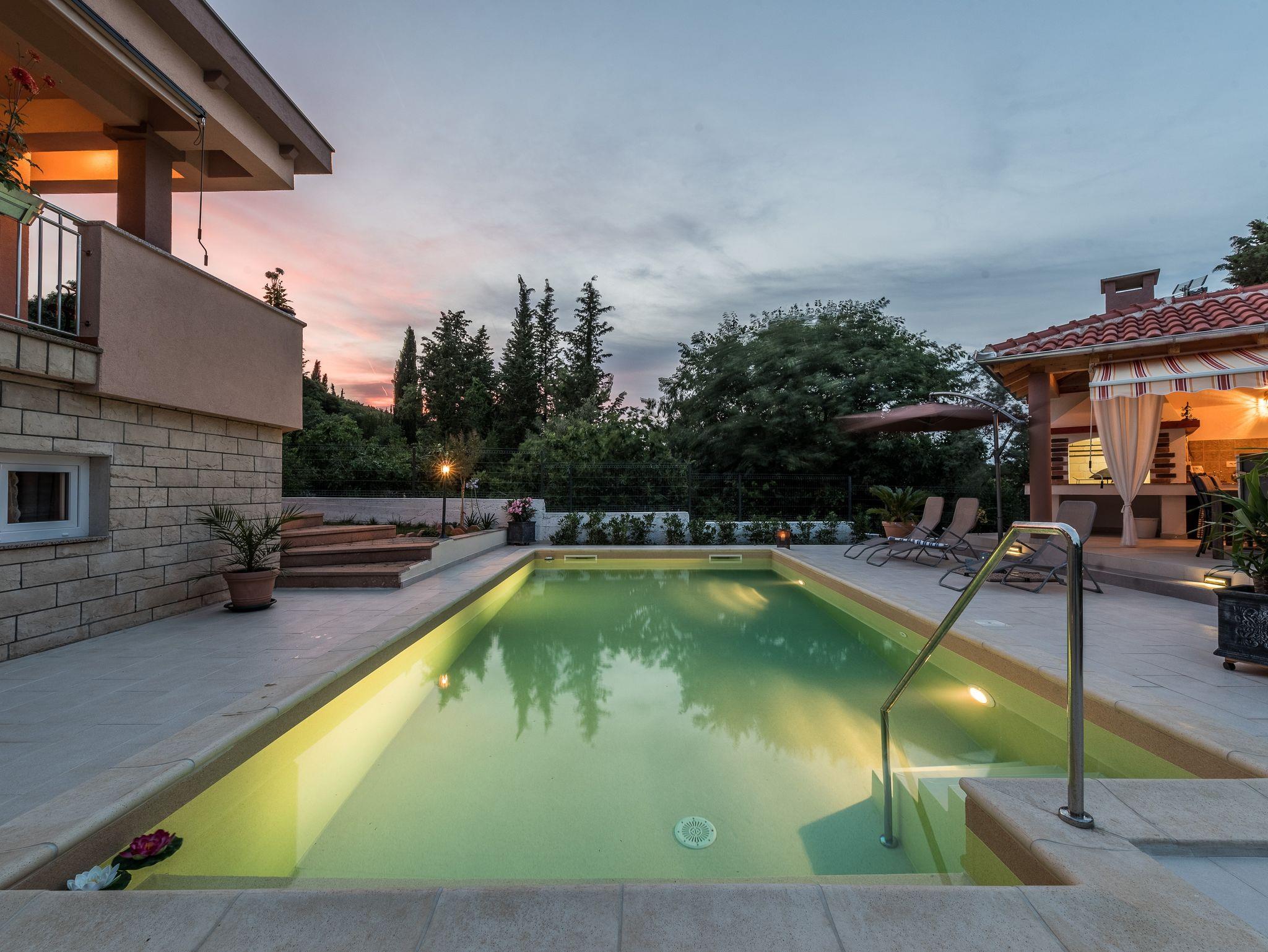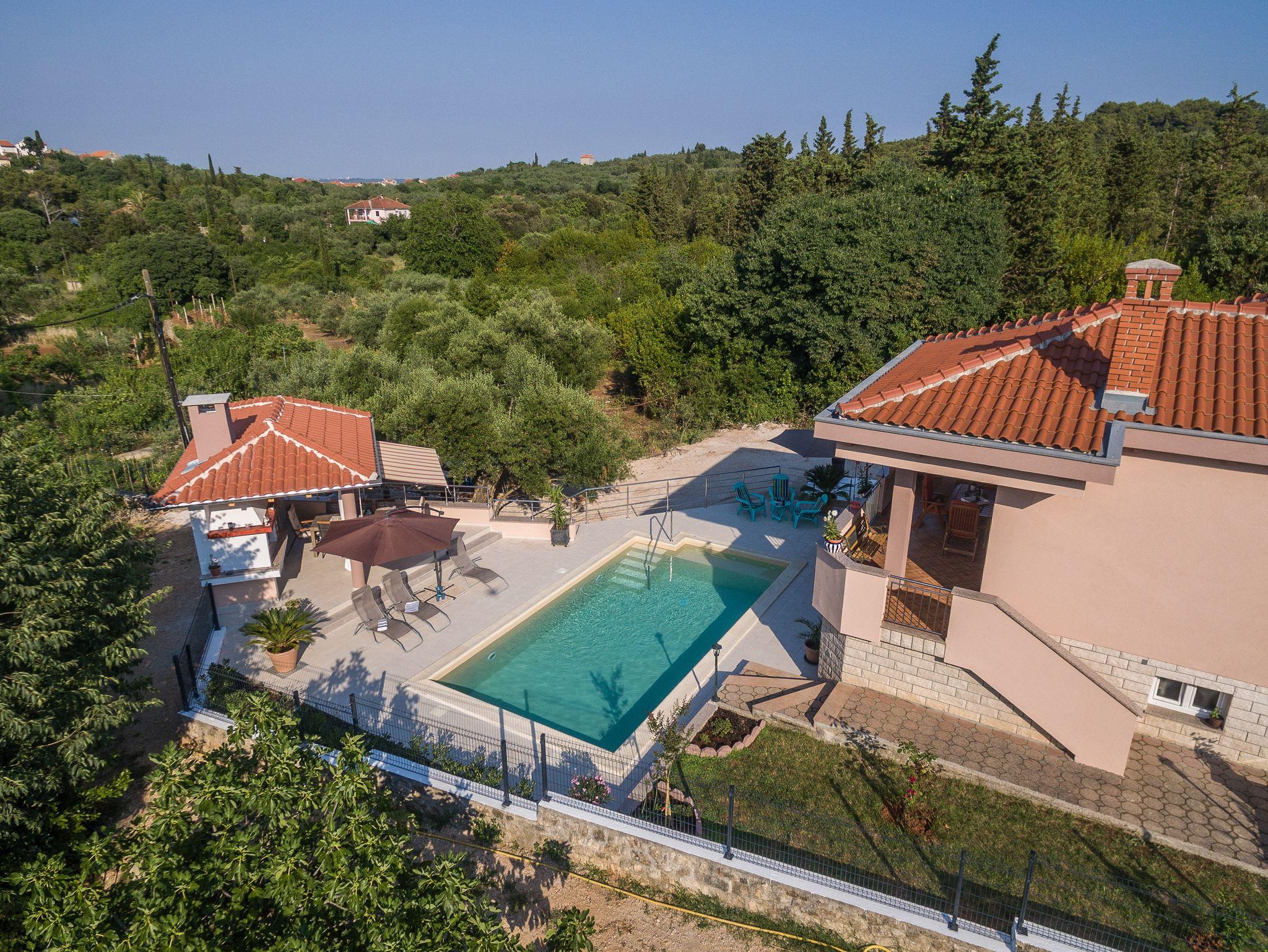 Umgebung des Objekts (Eingerichtet), Hof (600m2, Sitzbereich), Parkplatz (Anzahl der Parkplätze: 4, Entfernung vom Objekt: im Hof), Pool: gemeinsam, Dimensionen: 8m x 4m x 1.5m, Wassertyp: Süßwasser, Grill: gemeinsam, WiFi Internet, Boot, Bootsanlegeplatz (Entfernung vom Objekt: 500 m, Bootsanlegeplatztyp: Boje), Föhn, Bügeleisen, Bügelbrett, Sonnenschirm, Liegestühle, Kinderbett