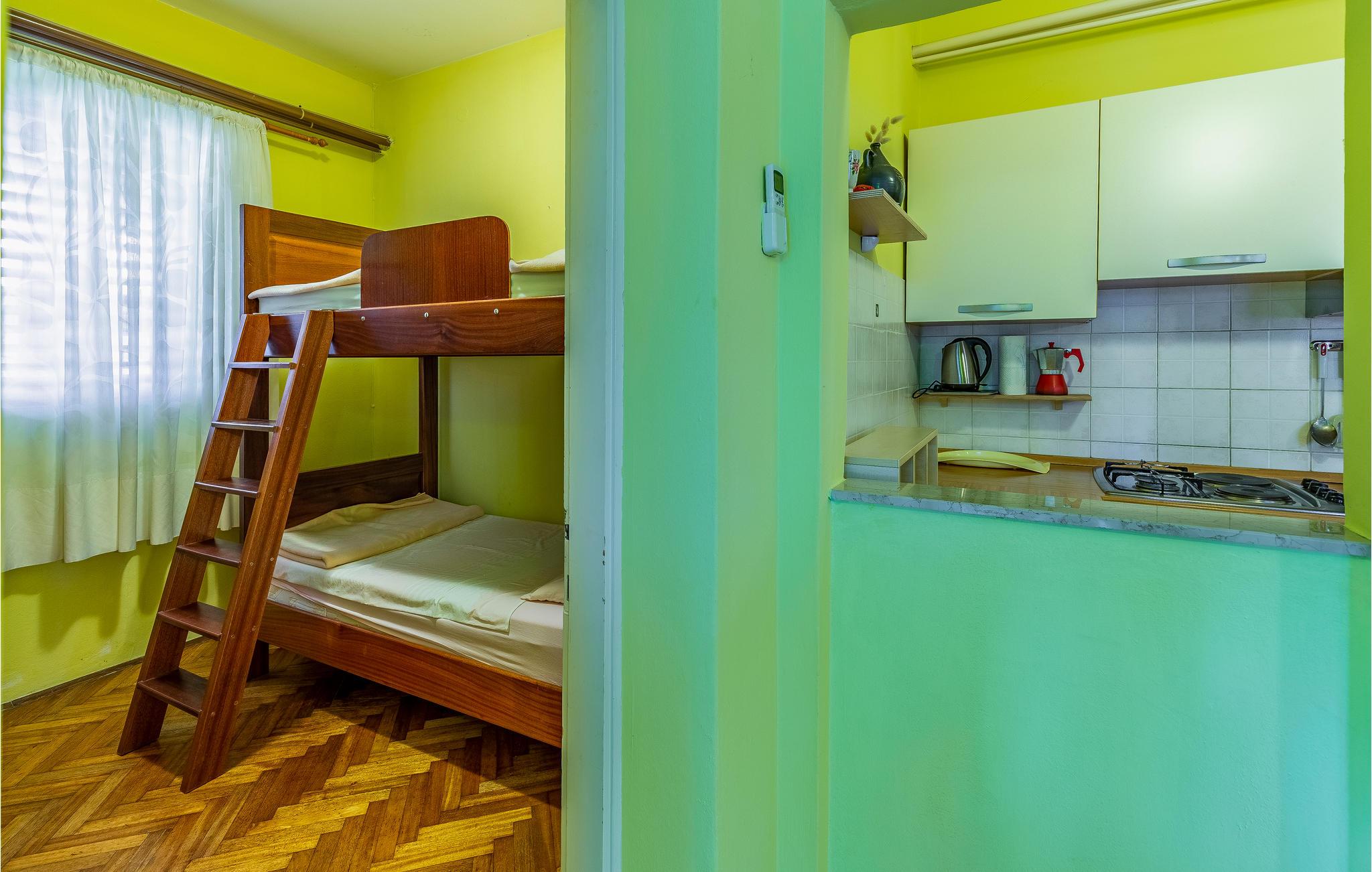 Velkommen til denne farverige lejlighed, som ligger i stueetagen til en etageejendom. Her er der gode faciliteter, og I kommer ikke til at mangle noget på jeres ferie. Der er plads til en lille familie, og hvis I gerne vil have bedsteforældrene eller jeres gode venner med, kan I reservere en lignende bolig i stueetagen.
