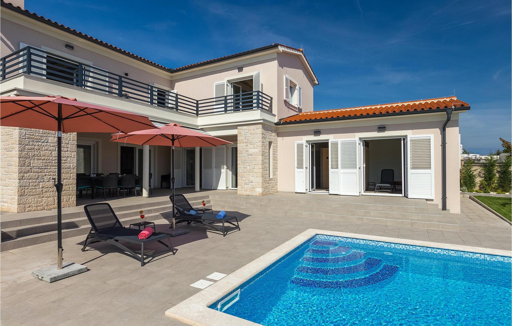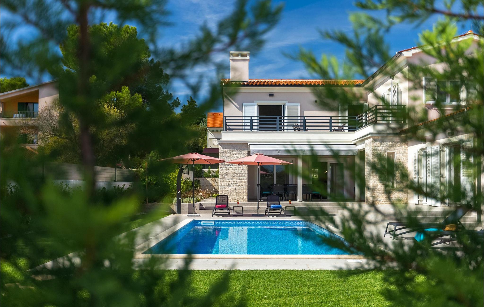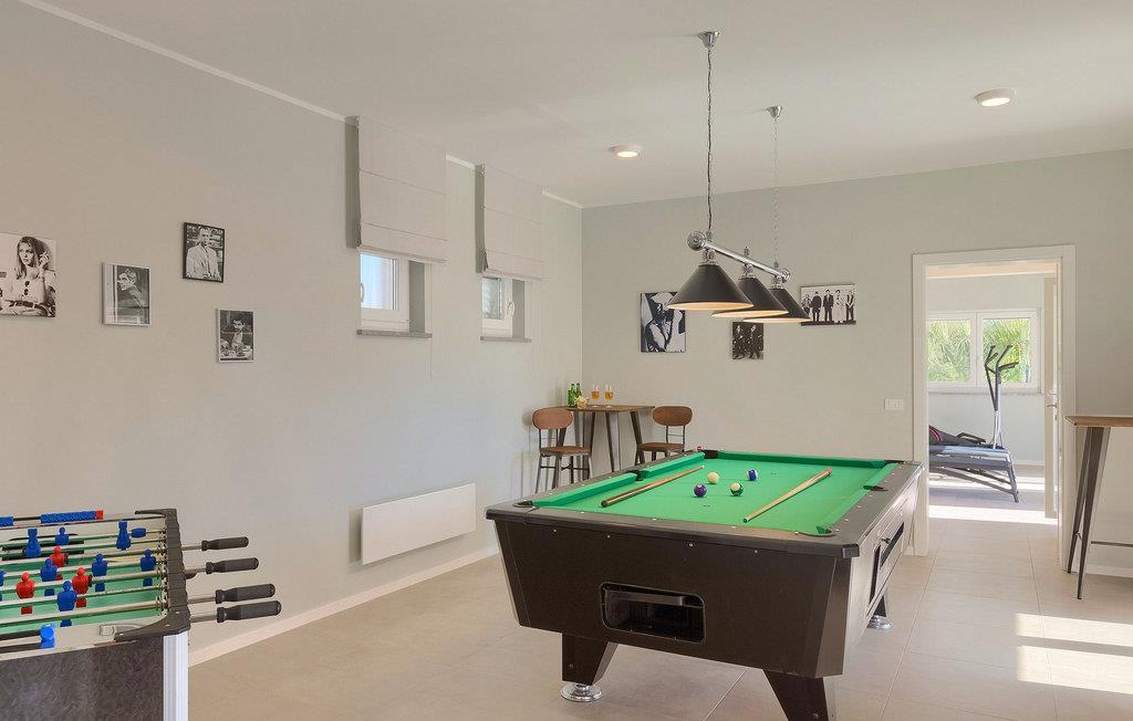 Villaen ligger på en 1100 m2 stor og helt lukket grund og har en indbydende privat pool omgivet af hyggelige liggestole. En udendørs spiseplads med en kulgrill, en havebruser og et separat udendørs toilet er alt sammen udenfor. Interiøret er smukt arrangeret og tilbyder mere end nok komfort til et afslappende ophold. Det åbne rum i stueetagen er opdelt i opholdsstue med pejs, SAT-TV og stereoanlæg, spiseplads og moderne fuldt udstyret køkken. Der er også et separat rum, der kun er dedikeret til sjov - et poolbord og bordfodbold står til din rådighed her. Et andet rum er for dem, der kan lide at forkæle sig selv - en finsk sauna og et brusebad er her for dem, der kan lide at slappe af på kølige aftener, og fitnessområdet med en cross-trainer-maskine for dem, der har tendens til at holde sig i form også i ferier. Med hensyn til soveværelserne har alle 4 soveværelser aircondition, og alle har tv og eget privat badeværelse med bruser. Et soveværelse ligger i stueetagen, mens de resterende 3 er fordelt på øverste etage og har en balkon med udsigt over poolen i haven. Hvis du er til noget spil, er der en spillekonsol i loungeområdet på øverste etage.