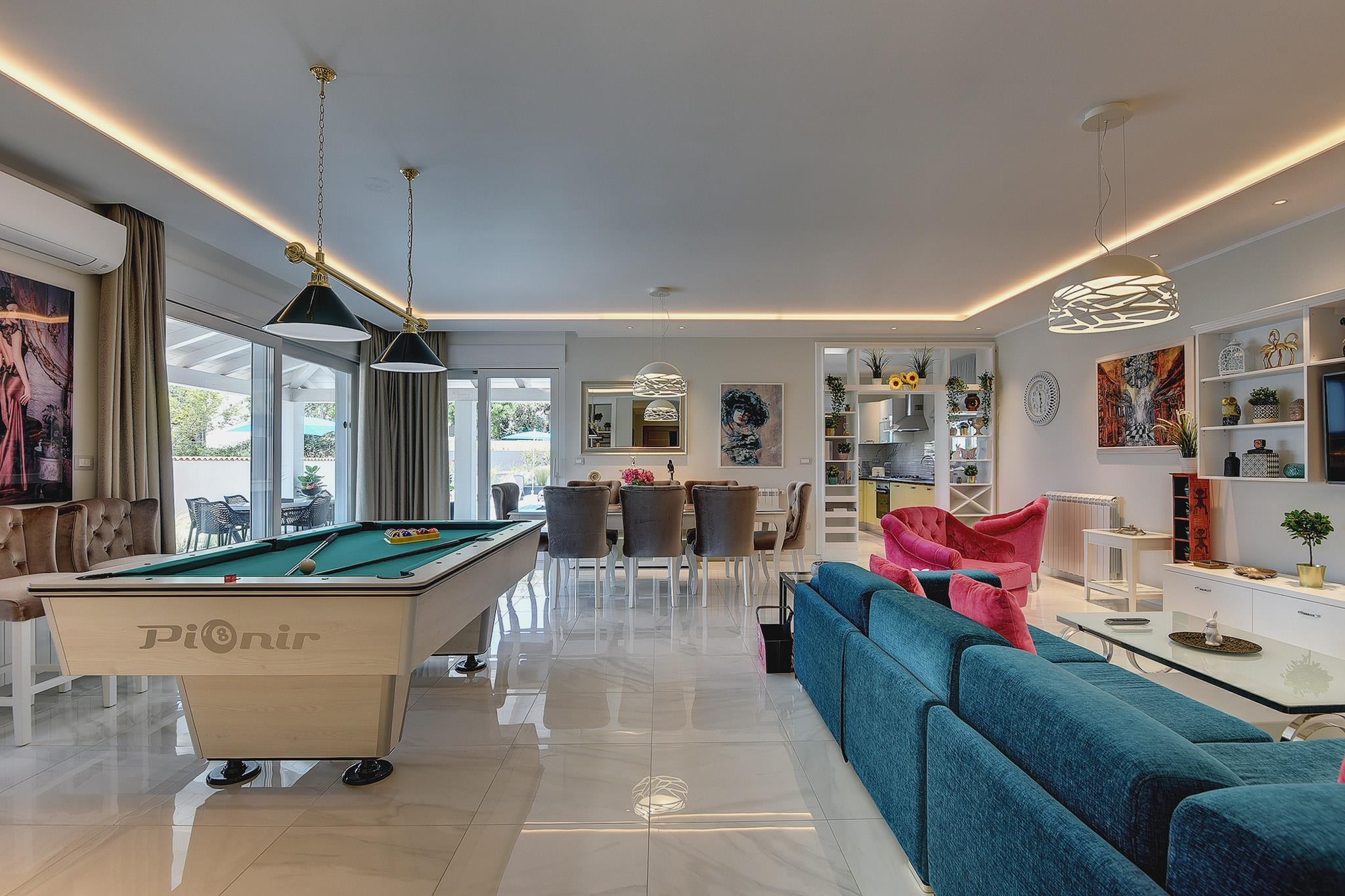 Villa Dream med privat pool ligger i det sydligste punkt i Istrien, i landsbyen Premantura. Du bor inden for gåafstand af restauranter og et par butikker og ikke langt fra de smukke strande i Kamenjak Nature Park. Den historiske by Pula med et hyggeligt centrum og med monumenter fra romertiden ligger 10 km væk. Du har et indhegnet grund med swimmingpool, solterrasse og liggestole samt en overdækket terrasse med bordfodbold, spisebord og grill på din Indvendigt i denne villa er der lyse farver og farverige møbler. I stueetagen finder du en stue med opholdsområde, spisebord og billard, et veludstyret køkken, et soveværelse med eget badeværelse og et fitnessrum. På første sal er der tre soveværelser med eget badeværelse og en privat balkon.