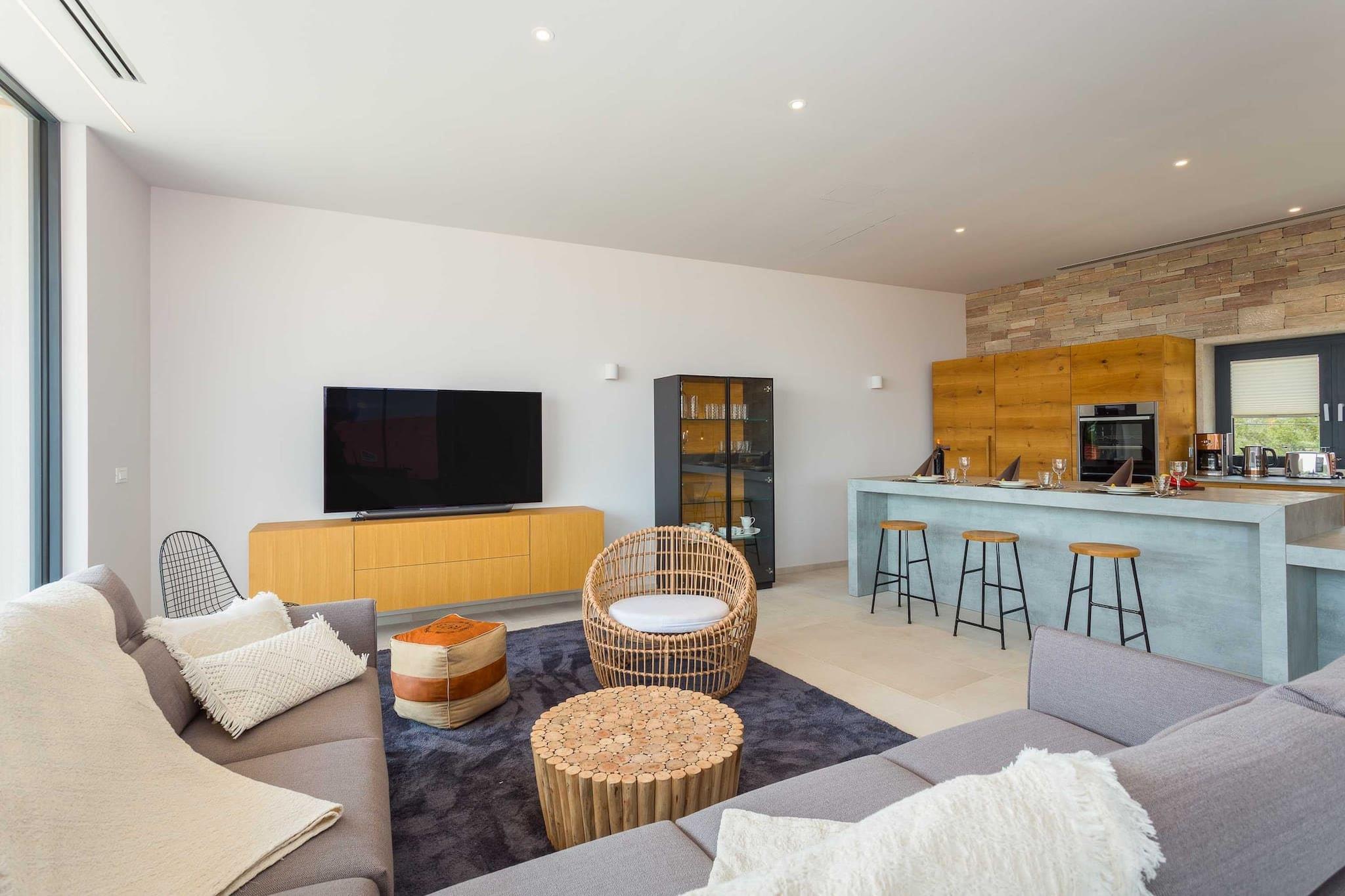 Stueetage: (Stue(enkeltsovesofa, Fjernsyn(fladskærm, parabol, Smart-TV)), åbent køkken(kogeplade, elkedel, brødrister, kaffemaskine, ovn, mikrobølgeovn, opvaskemaskine , køleskab, fryser, ()), Soveværelse med badeværelse(enkeltseng, enkeltseng, bruser), Soveværelse med badeværelse(king size-seng, bruser), Soveværelse med badeværelse(bruser, toilet, Queen Bed), Internetadgang) Havemøbler, spisebord, sofahjørne, vaskemaskine, balkon, patio, klimaanlæg, terrasse, have(indhegnet), solstole, grill, parkering, swimmingpool(privat), dart, strygebræt, strygejern, føntørrer, crib(free), Alarm, ,