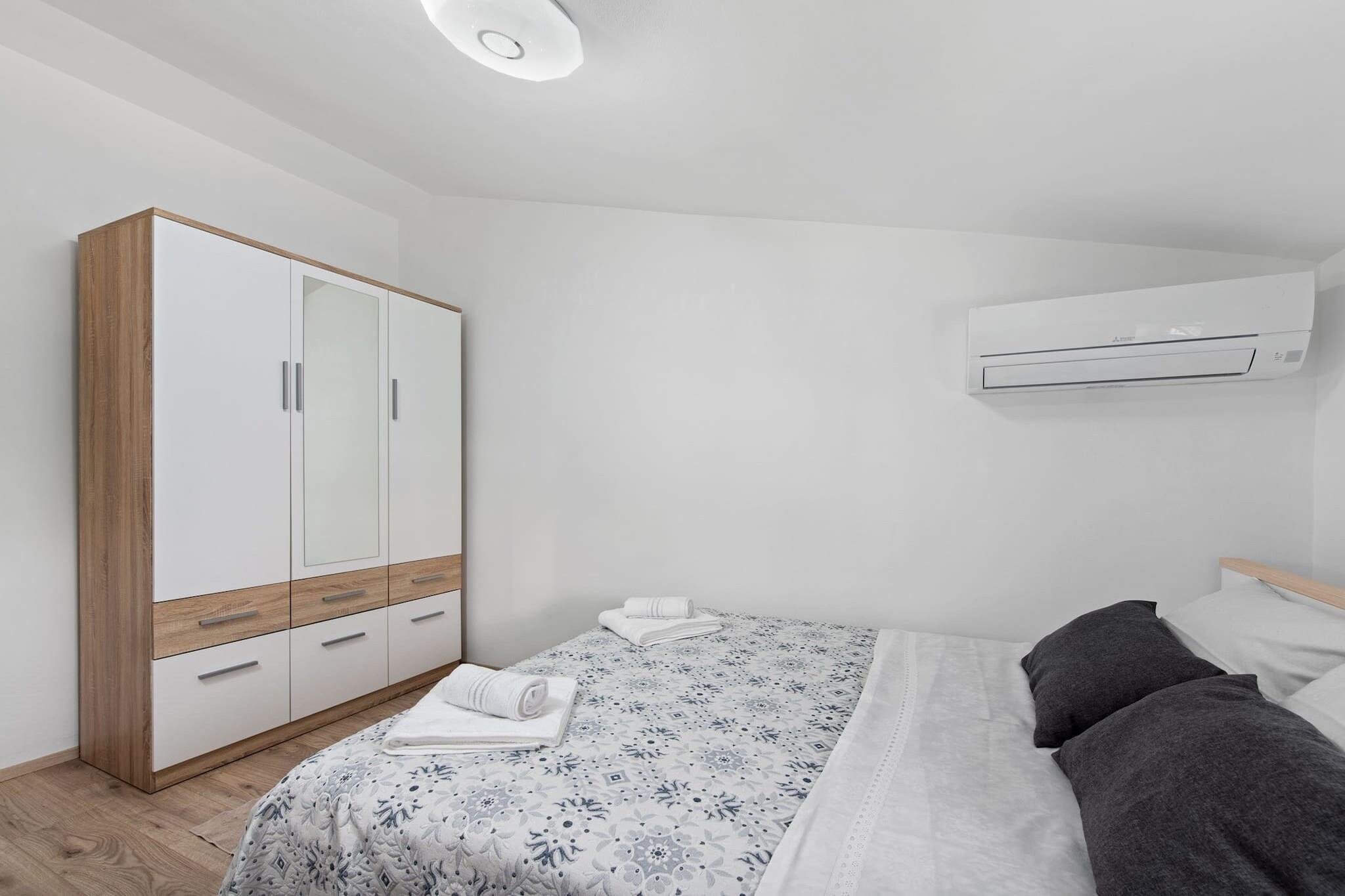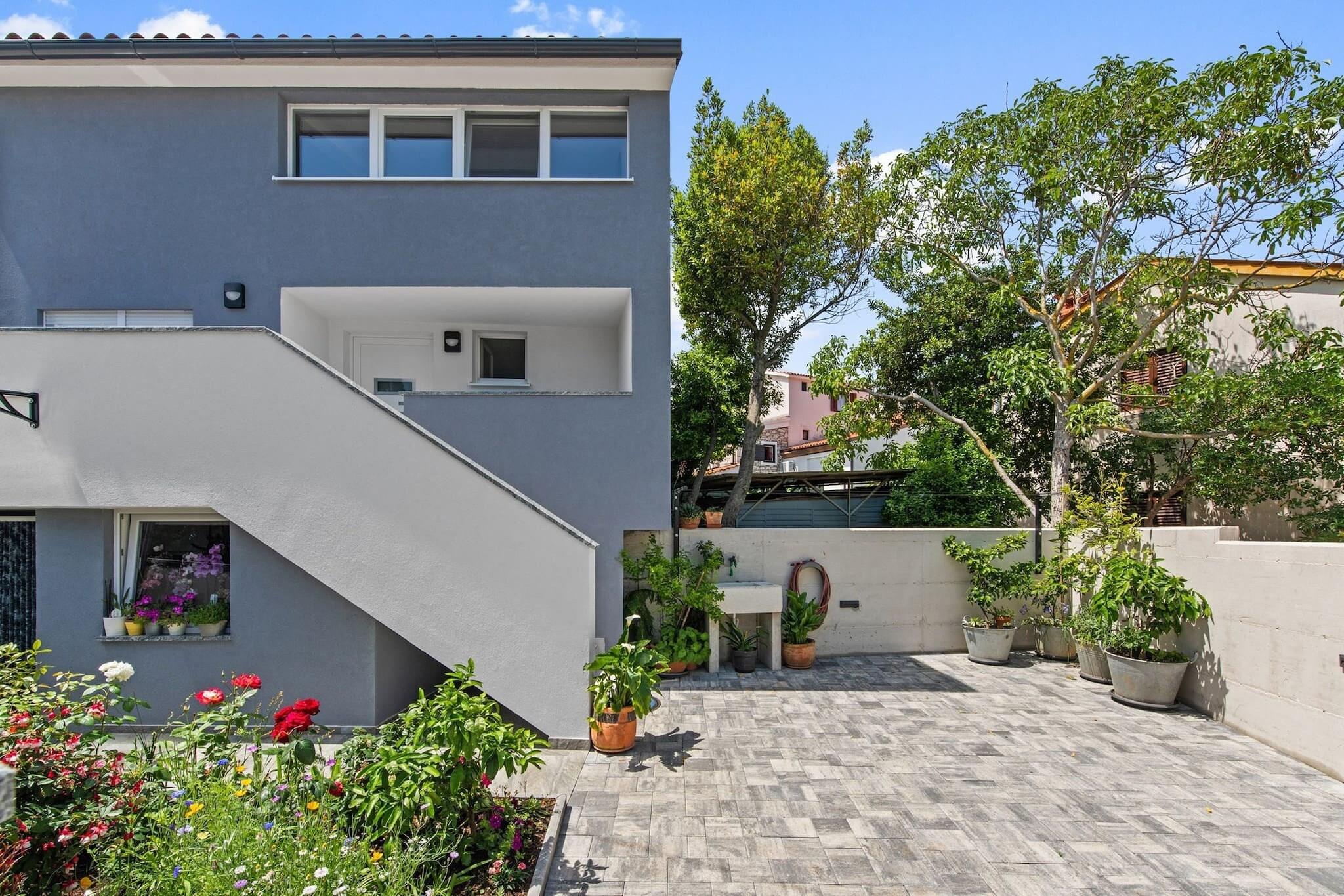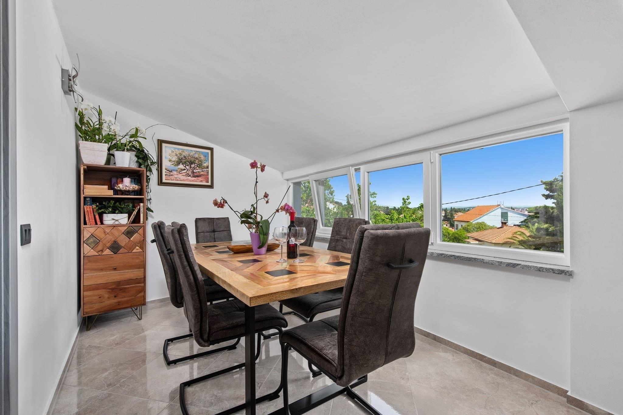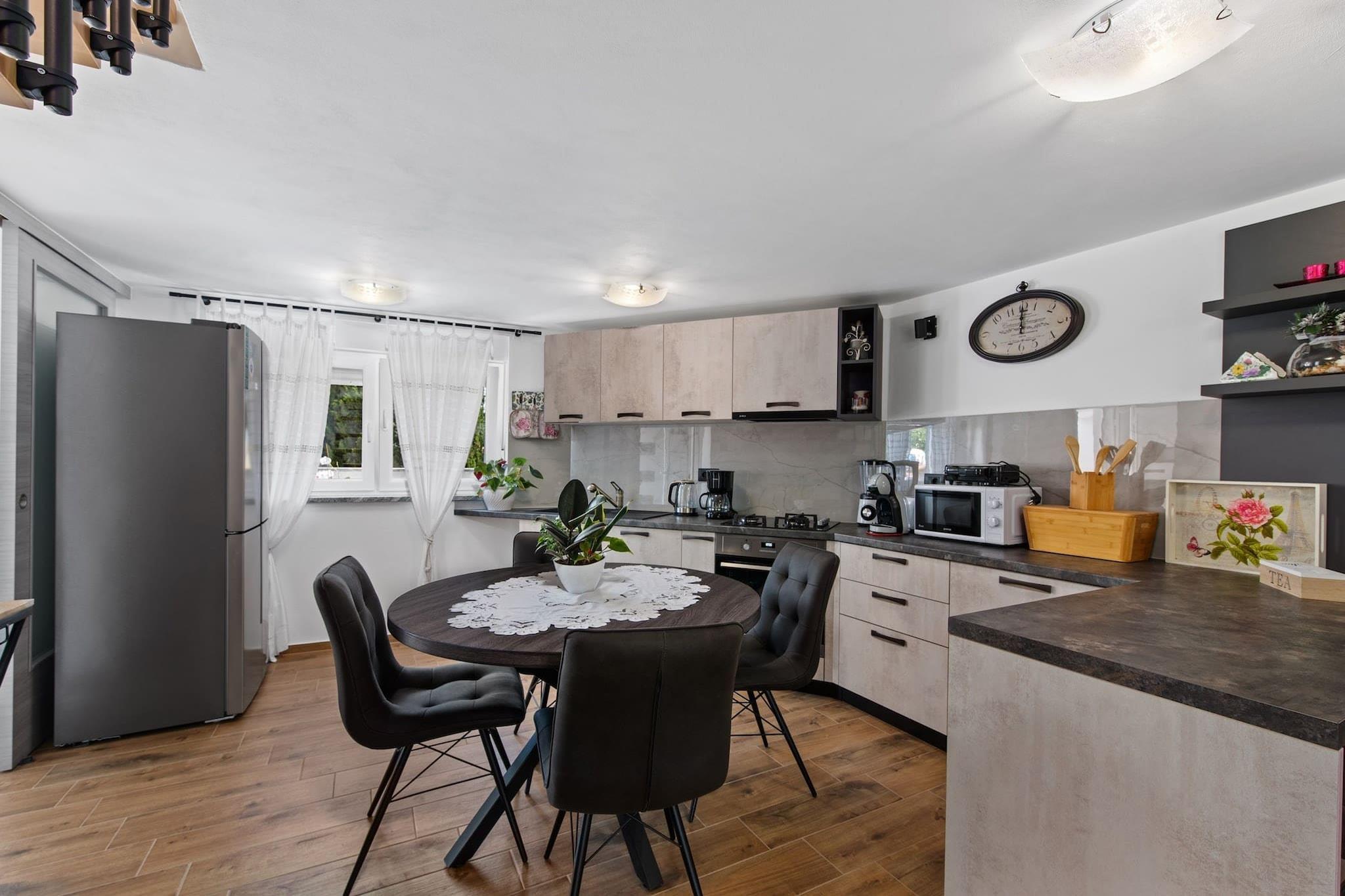 Dette moderne 3-værelses hus i Premantura tilbyder komfortabel indkvartering for op til 8 gæster (maks. 6 voksne) inden for 140 m² af veldesignet boligareal. Ejendommen er ideelt beliggende med udsigt over vandet, hvilket giver et afslappende og naturskønt miljø. Det er fuldt udstyret med væsentlige faciliteter, herunder aircondition i hele huset, en vaskemaskine, Wi-Fi og 4 tv med satellitkanaler. Køkkenet er i åbent plan og udstyret med en blanding af gas- og elektriske apparater, herunder køleskab, mikroovn, ovn, fryser og opvaskemaskine. Gæsterne kan også nyde det udendørs rum, der byder på en have, terrasse, grill og udendørsmøbler, hvilket gør det til et ideelt sted for familiesammenkomster. Huset er perfekt beliggende i en familievenlig zone, med nem adgang til forskellige faciliteter og attraktioner. Det ligger kun 20 meter fra et supermarked, 30 meter fra busstationen og 50 meter fra en restaurant. Ejendommen ligger også kun 100 meter fra byens centrum og 300 meter fra en klippestrand, der byder på masser af muligheder for udforskning og afslapning. Derudover ligger den nærmeste togstation 6 km væk, og lufthavnen ligger kun 8 km fra huset, hvilket giver bekvemme rejsemuligheder. Det fuldt udstyrede køkken er perfekt til at tilberede måltider under dit ophold, med en række apparater og køkkenudstyr, herunder en kaffemaskine, brødrister og kedel. Uanset om du slapper af indendørs eller nyder den udendørs terrasse, byder dette hus på både komfort og bekvemmelighed. Med dets rummelige layout og førsteklasses beliggenhed er det et godt valg for familier, der søger et fredeligt, men tilgængeligt tilflugtssted i Premantura.