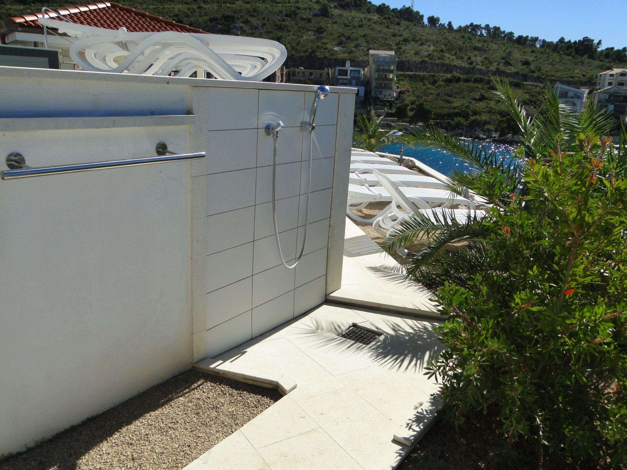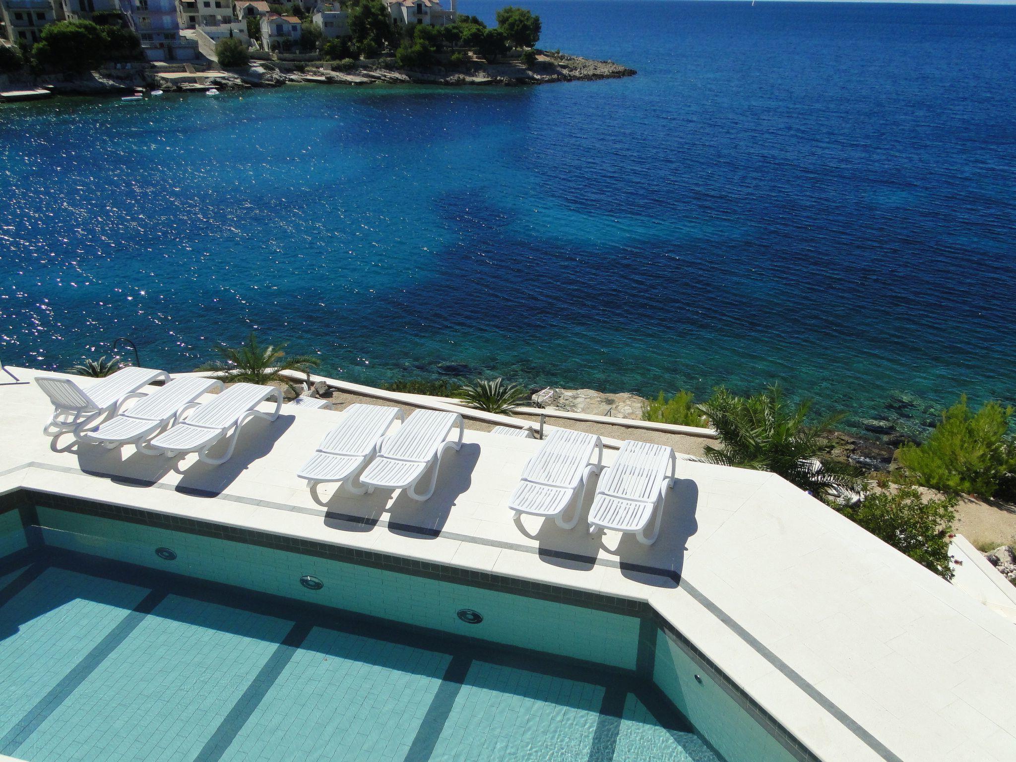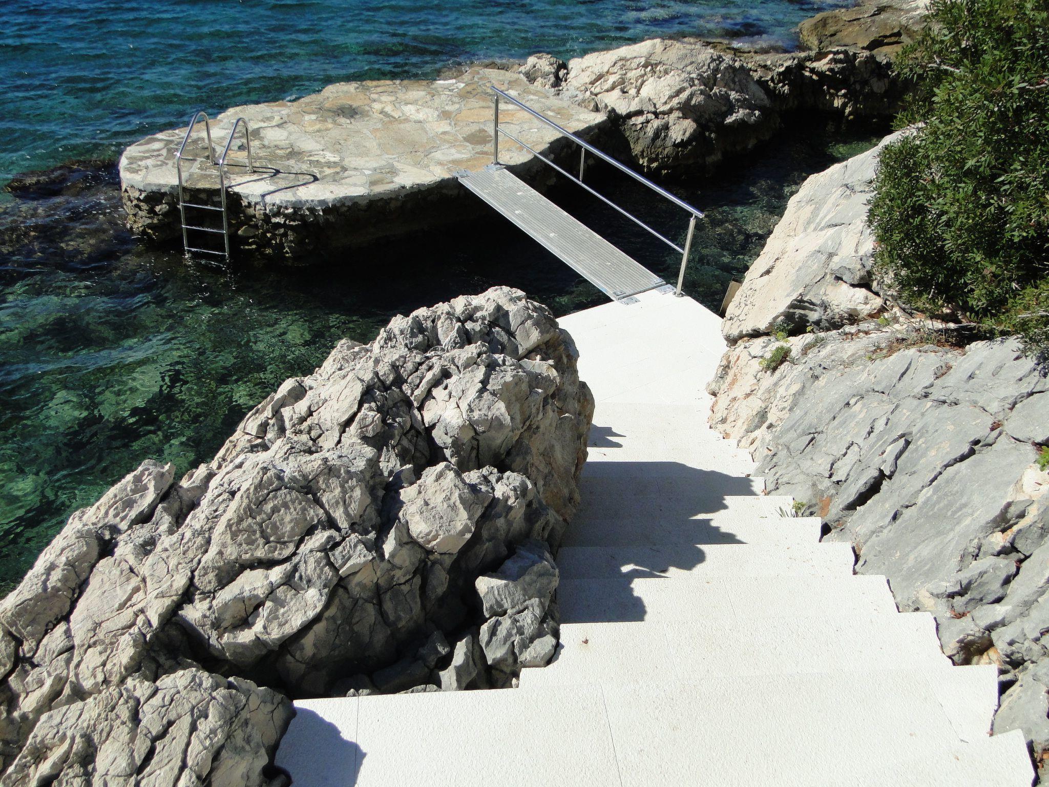 Step outside to the shared terrace, and you're greeted by the tranquil beauty of the swimming pool, framed by comfortable chairs perfect for soaking in the sun or diving into a good book. The proximity to the concrete and rocky beach invites you to immerse yourself in the refreshing waters of the sea, just a few paces away. It's an idyllic outdoor setting that perfectly complements the stunning interiors, making every moment at Villa Perla a pleasure.