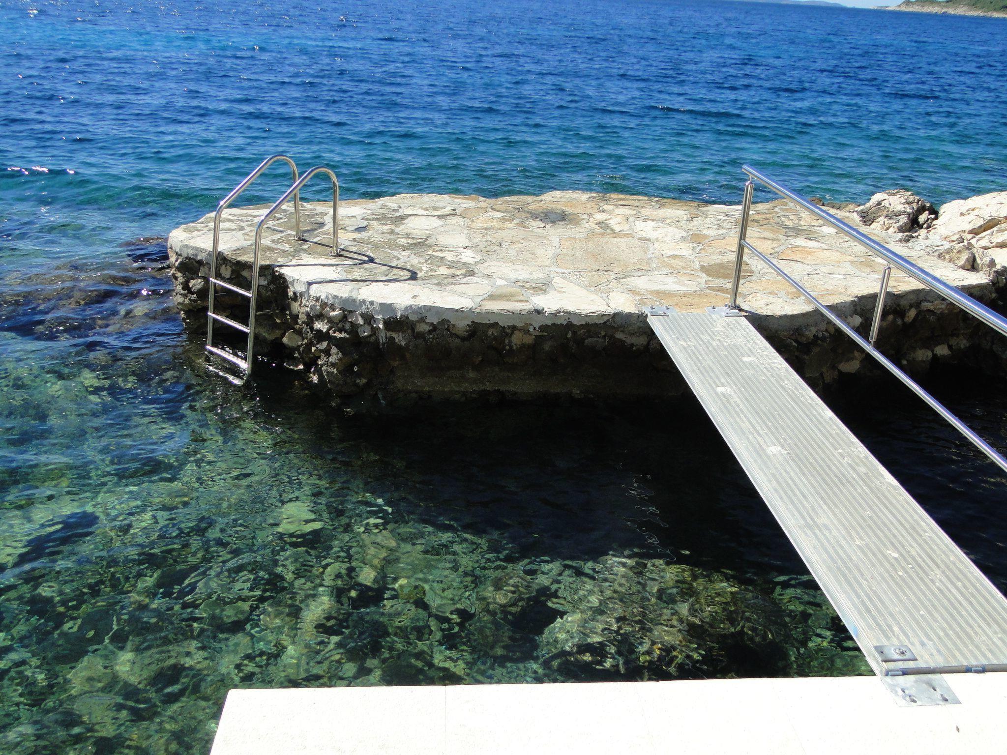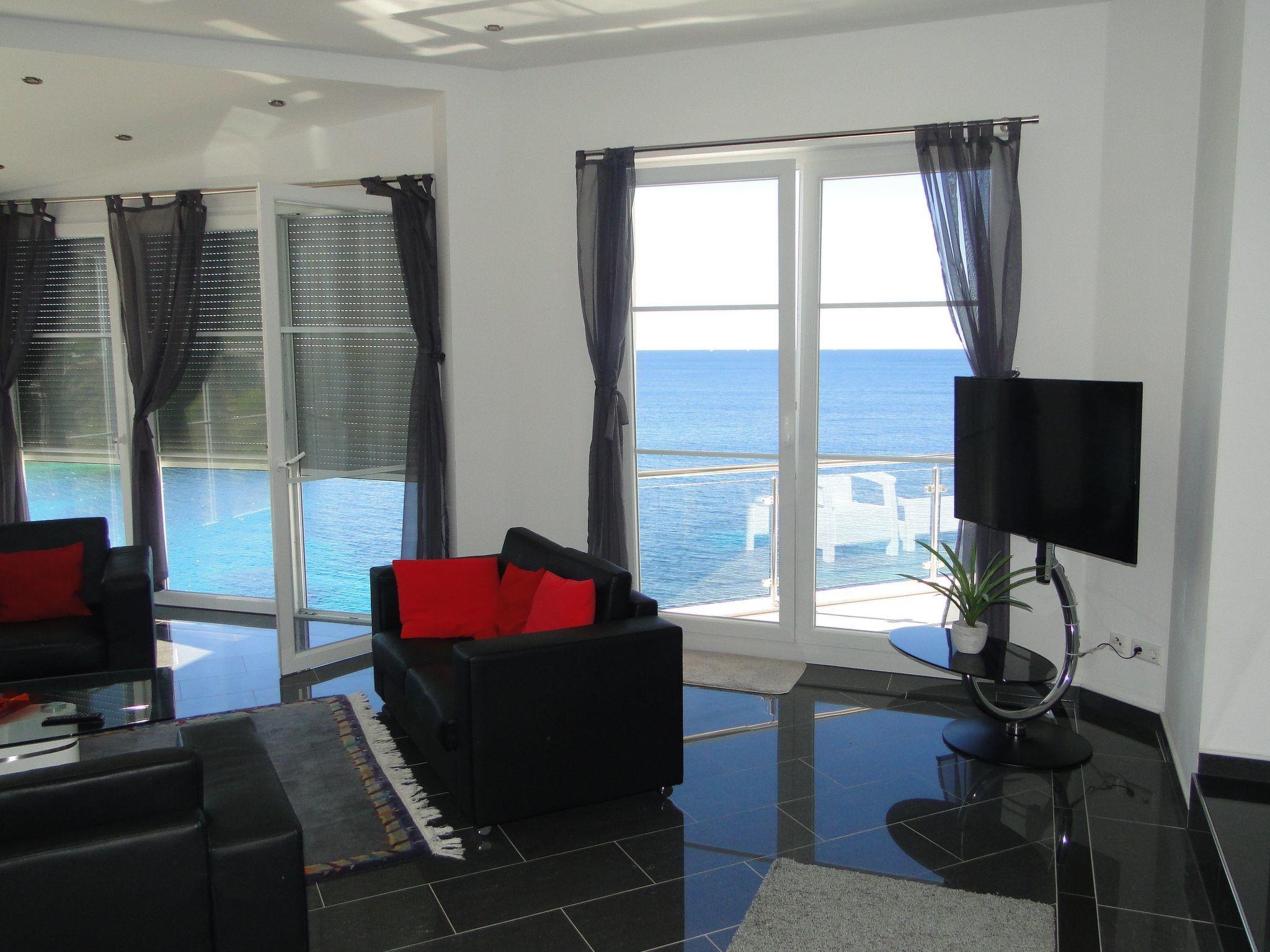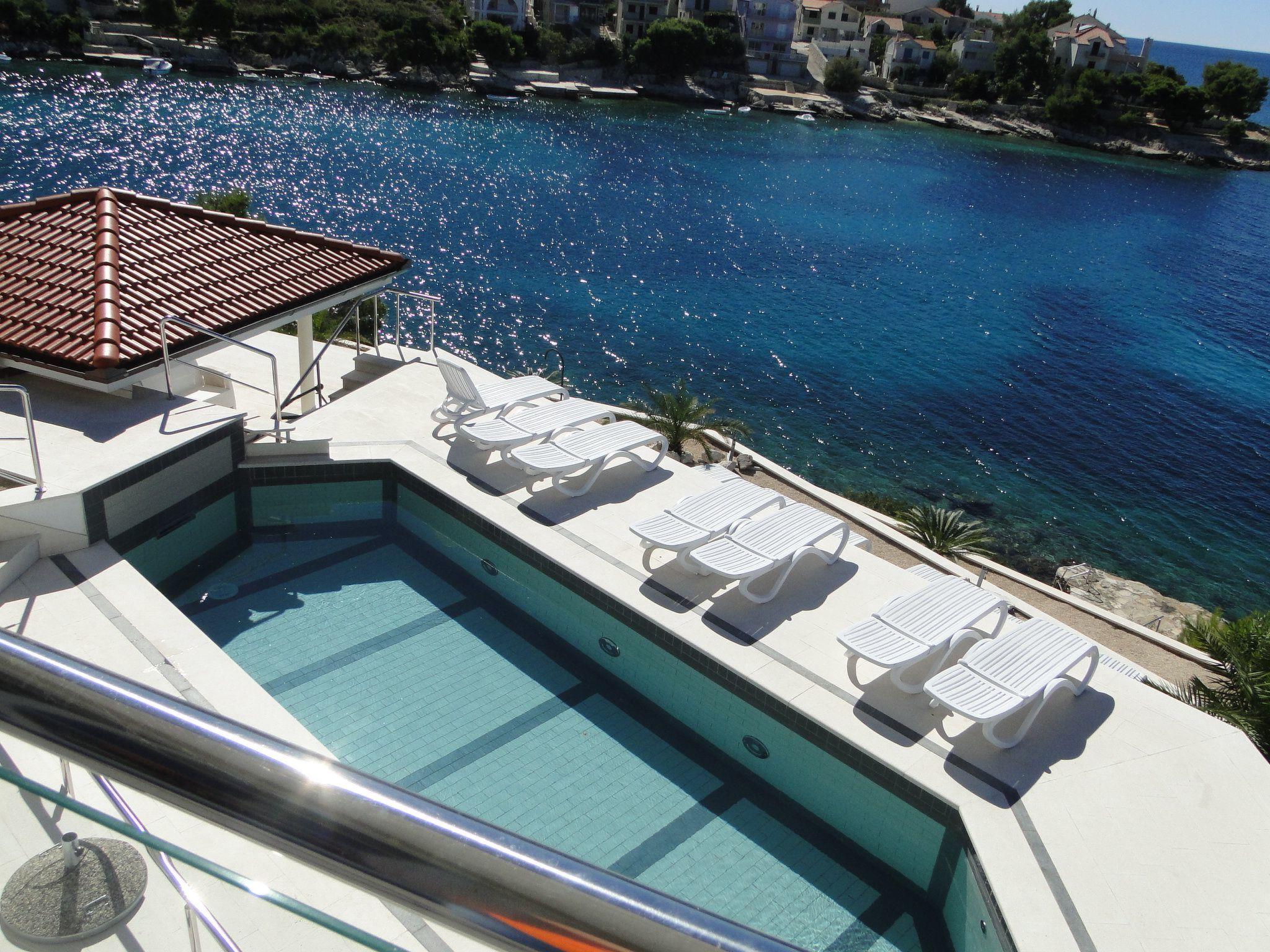 Step outside to the shared terrace, and you're greeted by the tranquil beauty of the swimming pool, framed by comfortable chairs perfect for soaking in the sun or diving into a good book. The proximity to the concrete and rocky beach invites you to immerse yourself in the refreshing waters of the sea, just a few paces away. It's an idyllic outdoor setting that perfectly complements the stunning interiors, making every moment at Villa Perla a pleasure.
