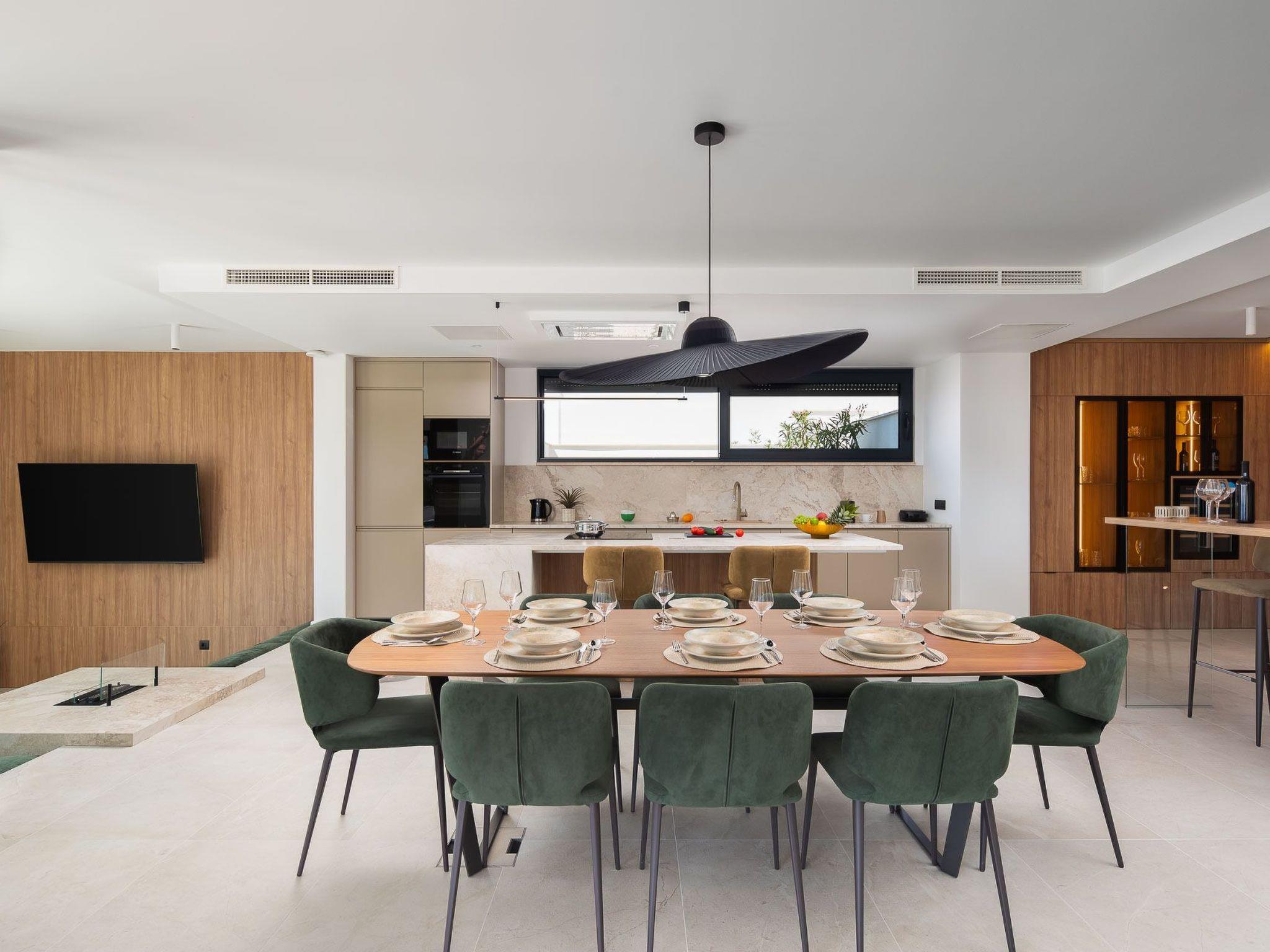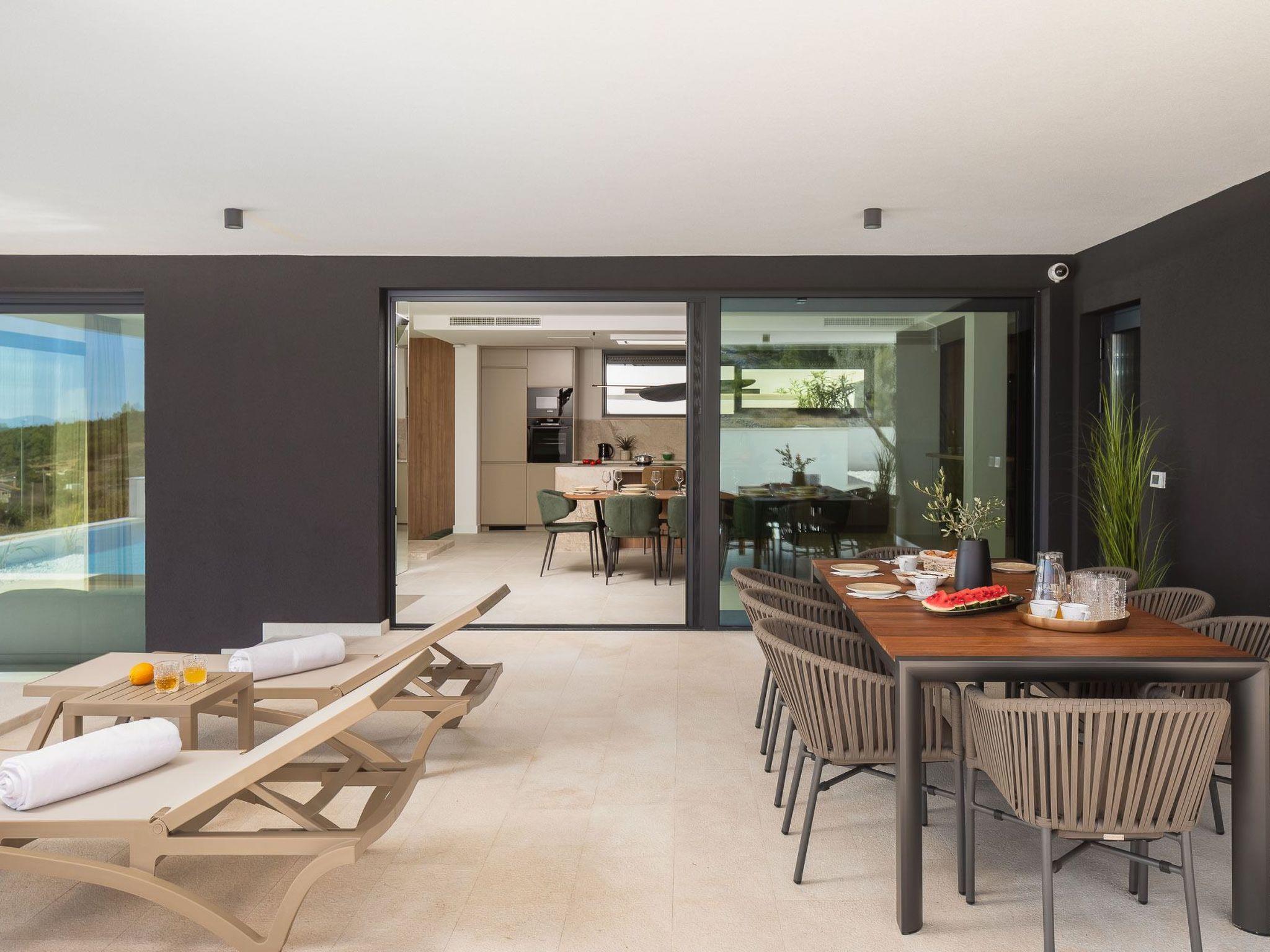 The exterior of Villa Oliva is equally impressive, featuring a private pool for sole use, promising endless fun and relaxation under the sun. The spacious terrace is an ideal spot for gatherings or enjoying quiet moments, with the serene environment adding to the overall charm of your stay. The absence of pets ensures a clean and tranquil setting for all guests.