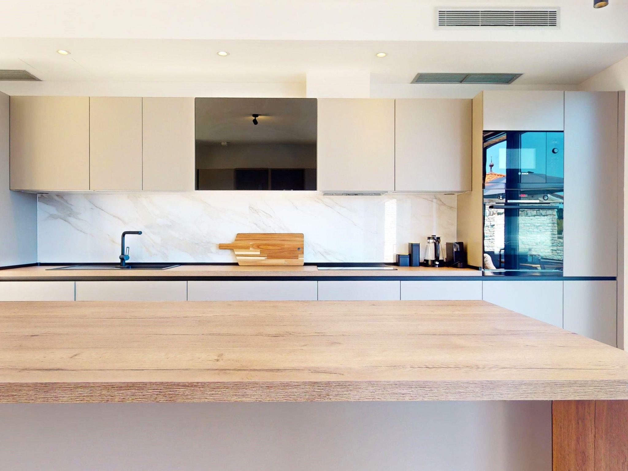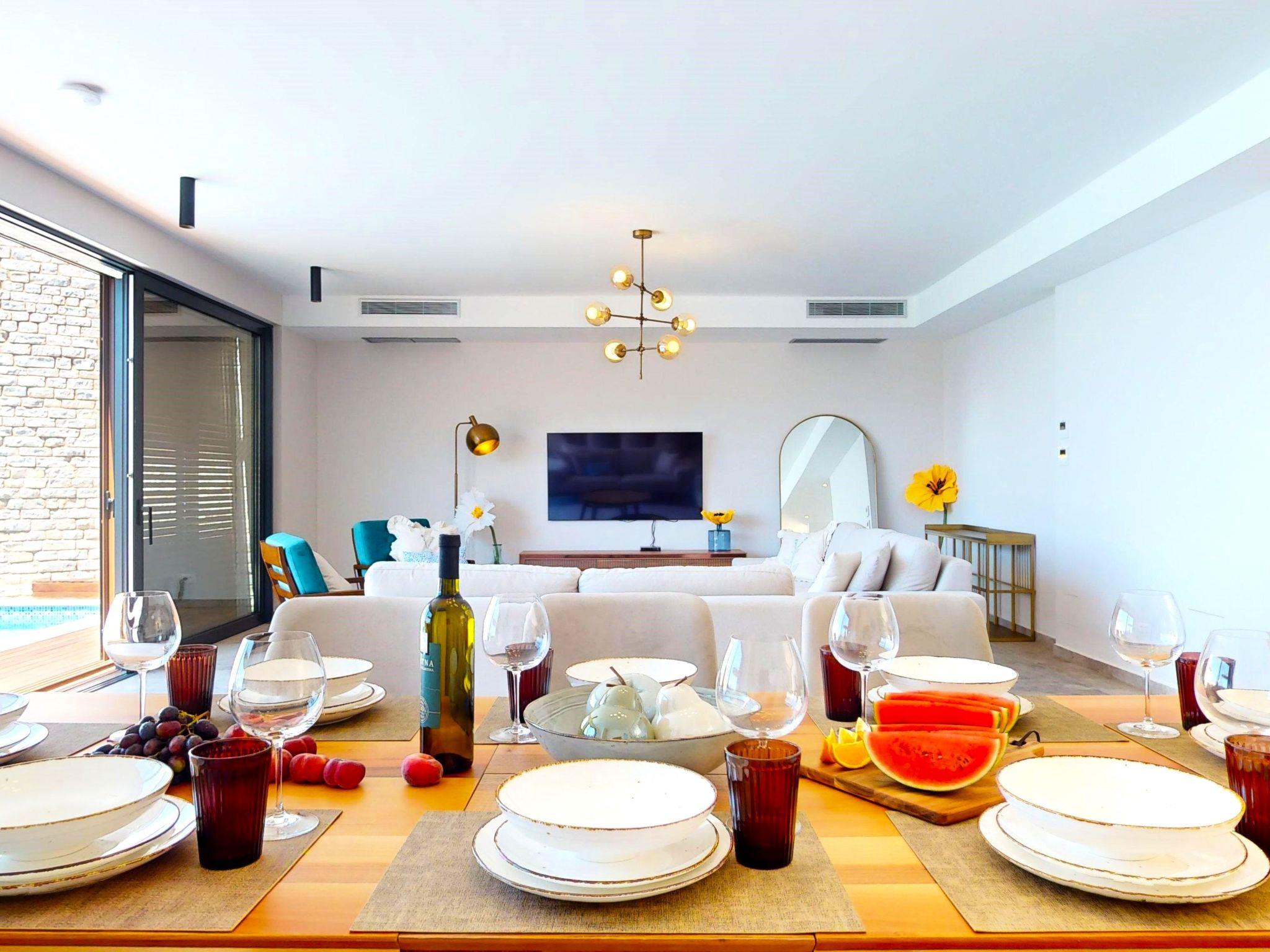 Within Villa Oleander, every detail caters to your comfort. Four well-appointed bedrooms promise restful nights, with three featuring king-sized beds and one with twin beds, each accompanied by its own bathroom equipped with a toilet, basin, and shower, ensuring privacy and convenience for all guests. The warmth of underfloor heating flows through every room, complemented by air conditioning to maintain the perfect temperature regardless of the season. The villa boasts a well-equipped kitchen for your culinary explorations, alongside a spacious dining area with enough seating for all guests. The inviting living room, equipped with a plush couch, offers a cozy space for relaxation and entertainment.