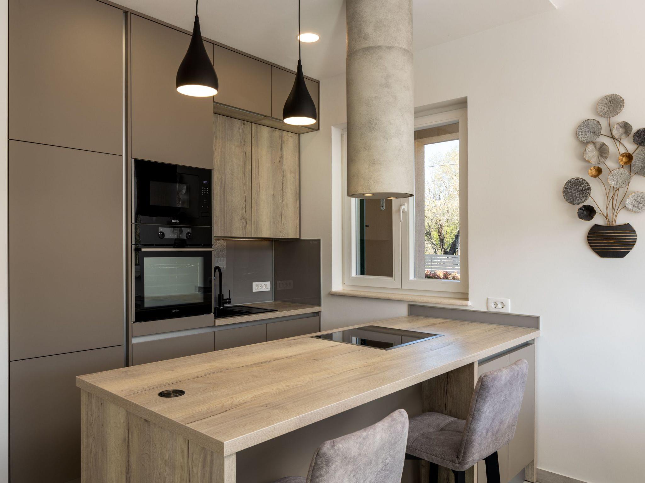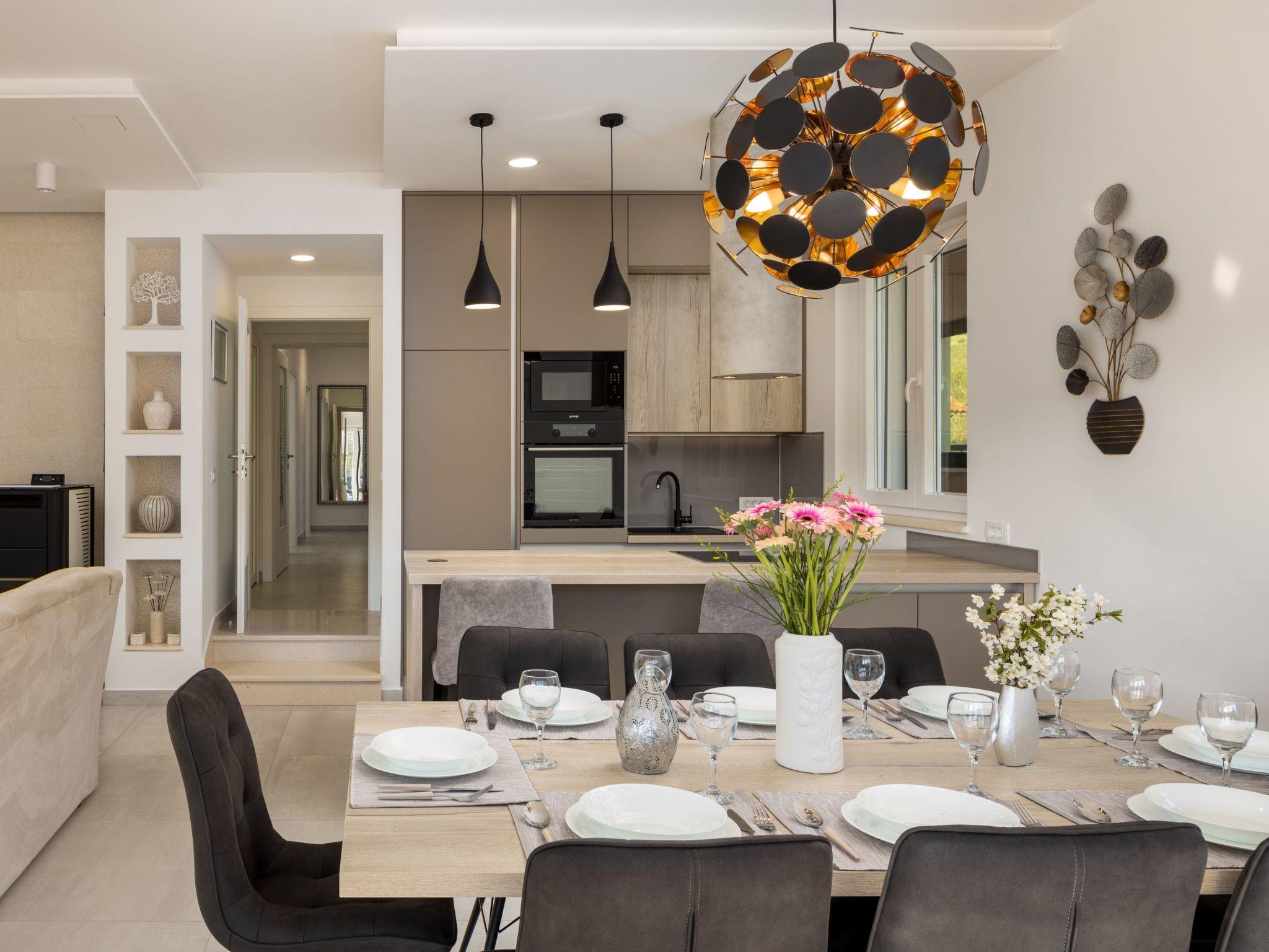 There is a fully equipped modern kitchen with a dining area and a spacious living room connected to them.