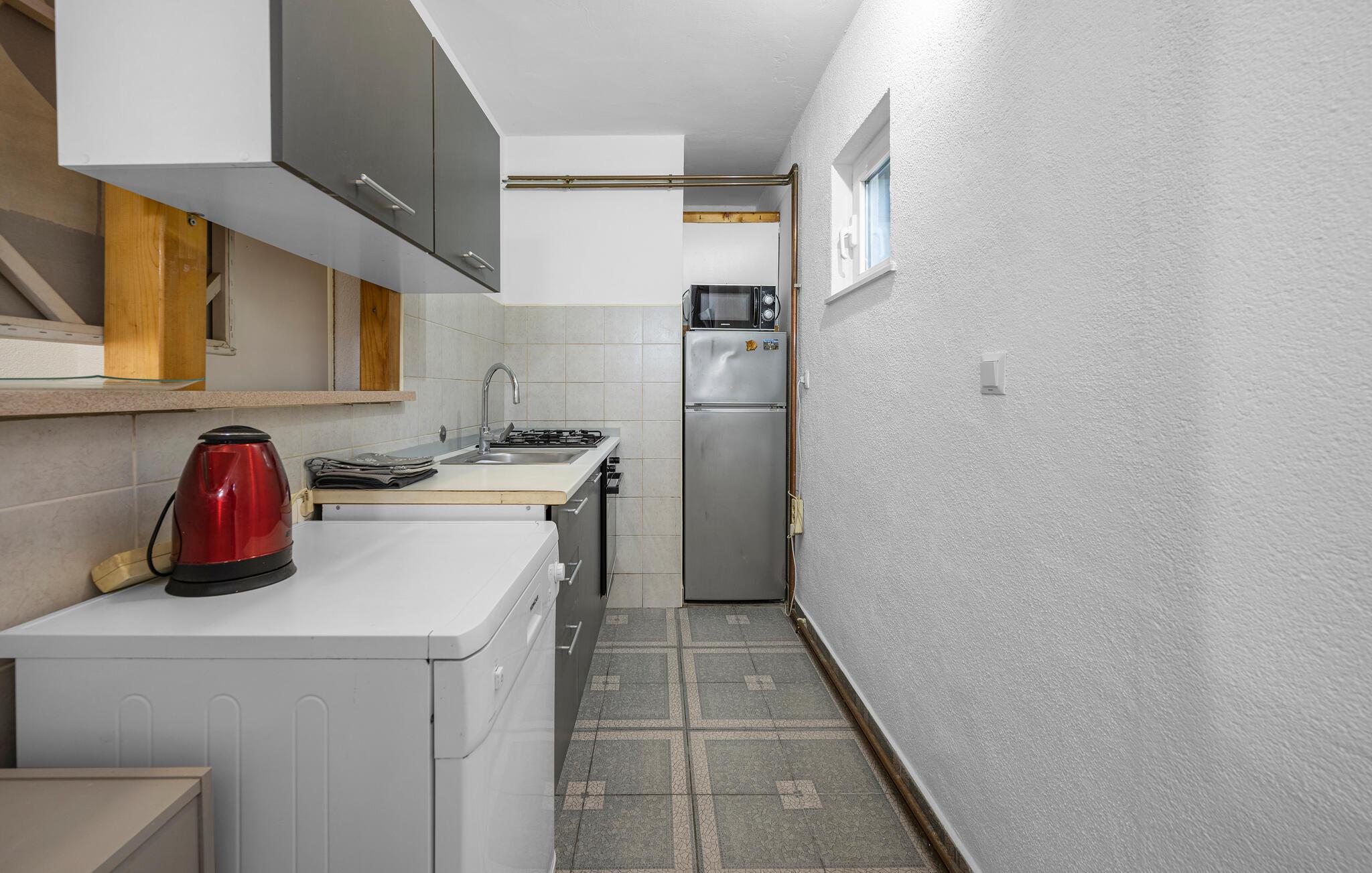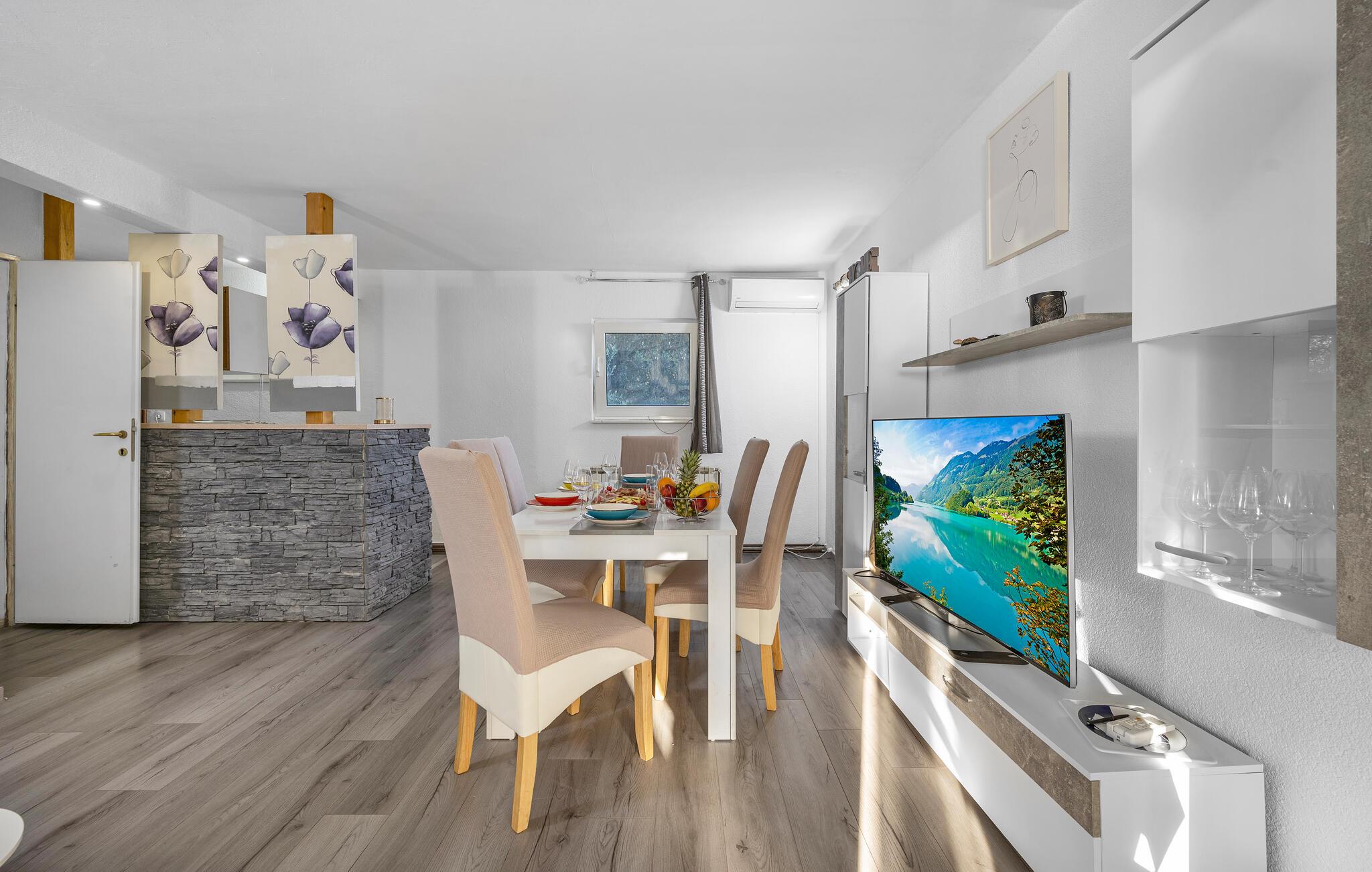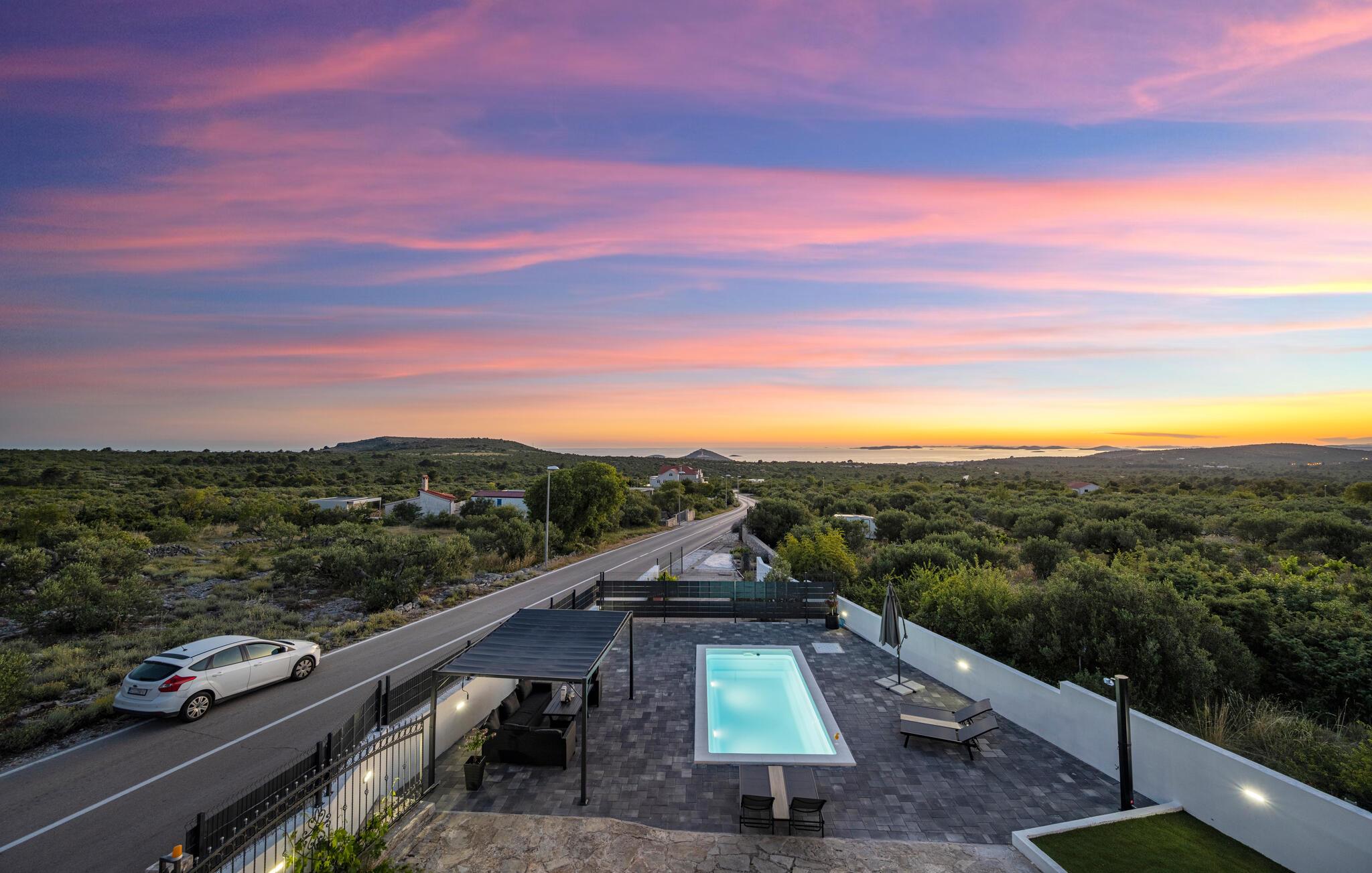 Slap af i dette attraktive feriehus med pool. I dette indbydende feriehus nær Primosten kan I nyde en harmonisk kombination af fred og komfort. Omgivet af frodige grønne områder og med en vidunderlig havudsigt byder huset på en afslappende atmosfære. Sammen med jeres udvidede familie eller venner kan I flytte ind i boligen med to boligenheder og føle jer helt tilpas. Den vellykkede blanding af klassisk og moderne indretning skaber en hyggelig atmosfære, hvor I straks vil føle jer hjemme. Uanset om I slapper af ved poolen eller spiller ved poolbordet i det overdækkede udendørsområde, vil I finde talrige muligheder for underholdning her. På balkonen kan I læse en bog i fred og ro og nyde den betagende udsigt og solnedgange. Husets beliggenhed er ideel: stille og grønt, men alligevel tæt på Primostens charmerende strande og faciliteter. Gå en tur gennem de maleriske gader i den gamle bykerne og oplev indbydende caféer og restauranter, der serverer lokale delikatesser. For de eventyrlystne er der masser af muligheder for vandsport, fra kajaksejlads til snorkling. Udforsk de omkringliggende vinmarker på en cykeltur eller besøg de historiske byer Sibenik og Trogir i nærheden. Her vil I opleve en perfekt blanding af afslapning og aktivitet i betagende omgivelser.