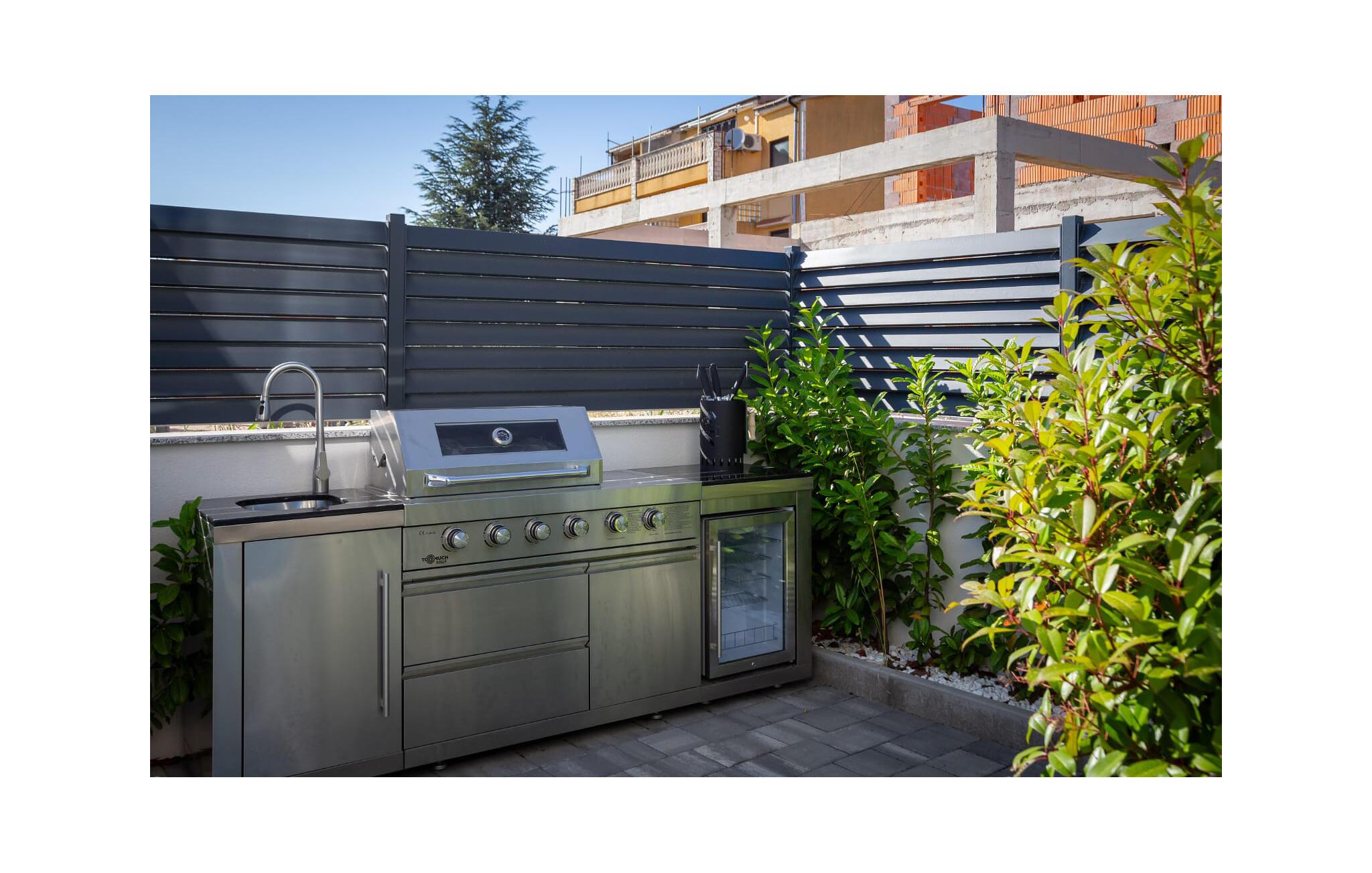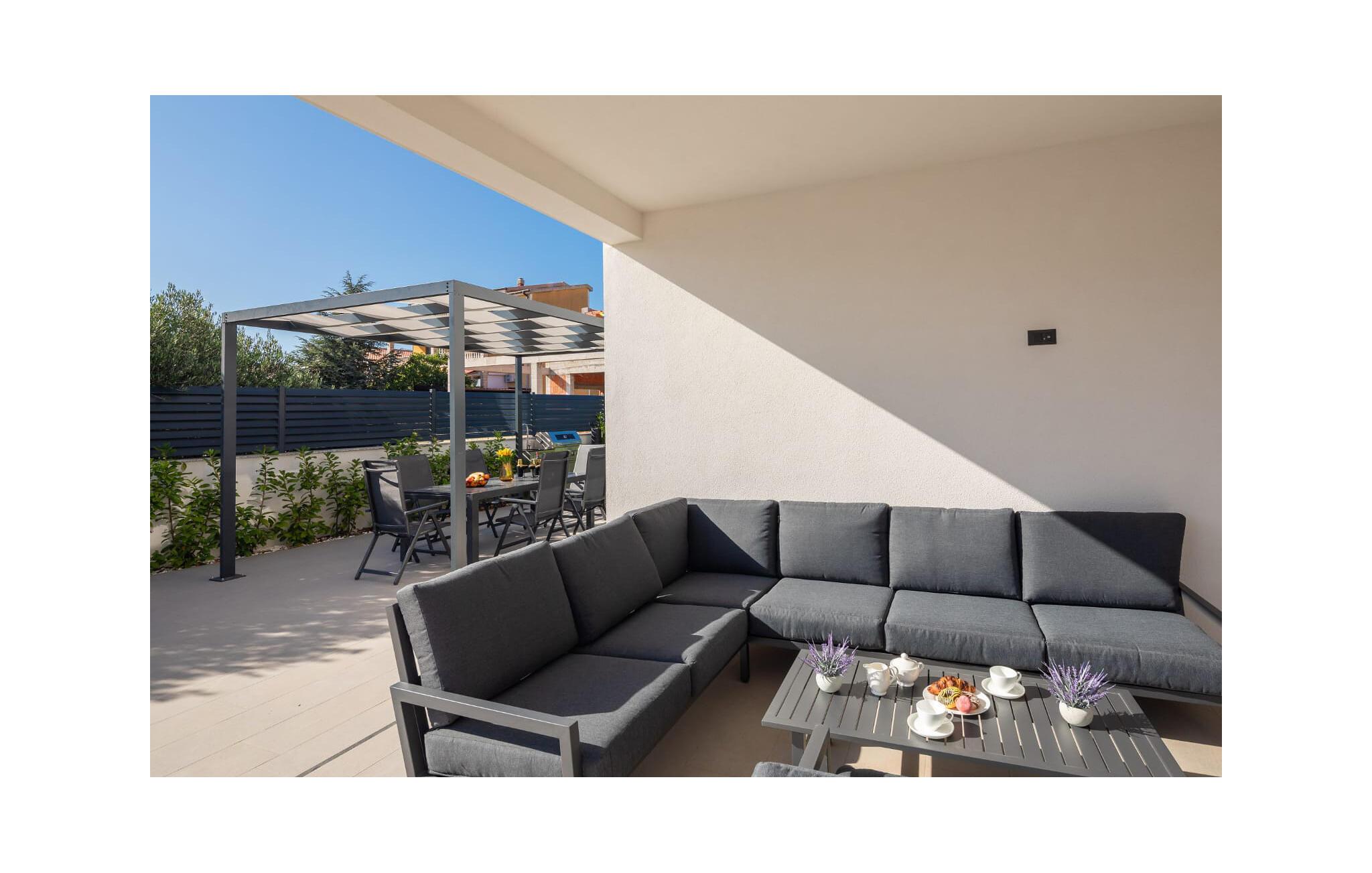 Udenfor venter der en rummelig terrasse med komfortable siddepladser og en pool, der giver en forfriskende afkøling på varme dage. Start morgenen med en dukkert i poolen, eller nyd solnedgangen om aftenen med et lækkert barbecue-måltid i grillhjørnet.