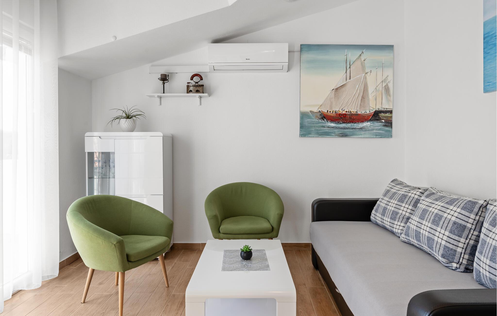 Ideelt placeret til at tilbringe en rolig pause fra hverdagen med familien, denne lyse og komfortable ferielejlighed lægger op til at tilbringe harmoniske stunder i velkendt selskab. Tilbered lækre måltider i det åbne køkken og nyd dem ved det stilfulde spisebord. Sæt jer ned i den behagelige sofa med en god bog eller et brætspil eller stream en spændende film.