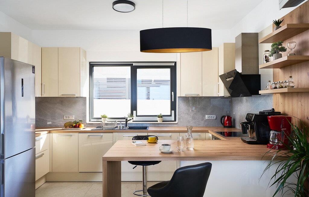 I villaen, i stueetagen, ved siden af ??en hyggelig pejs, finder du en sofa ud mod glasdøren, hvorigennem du kan se solnedgangen over havet. I samme rum er der et fuldt udstyret køkken med naturligt lys og endnu en spisestue til op til 8 personer.