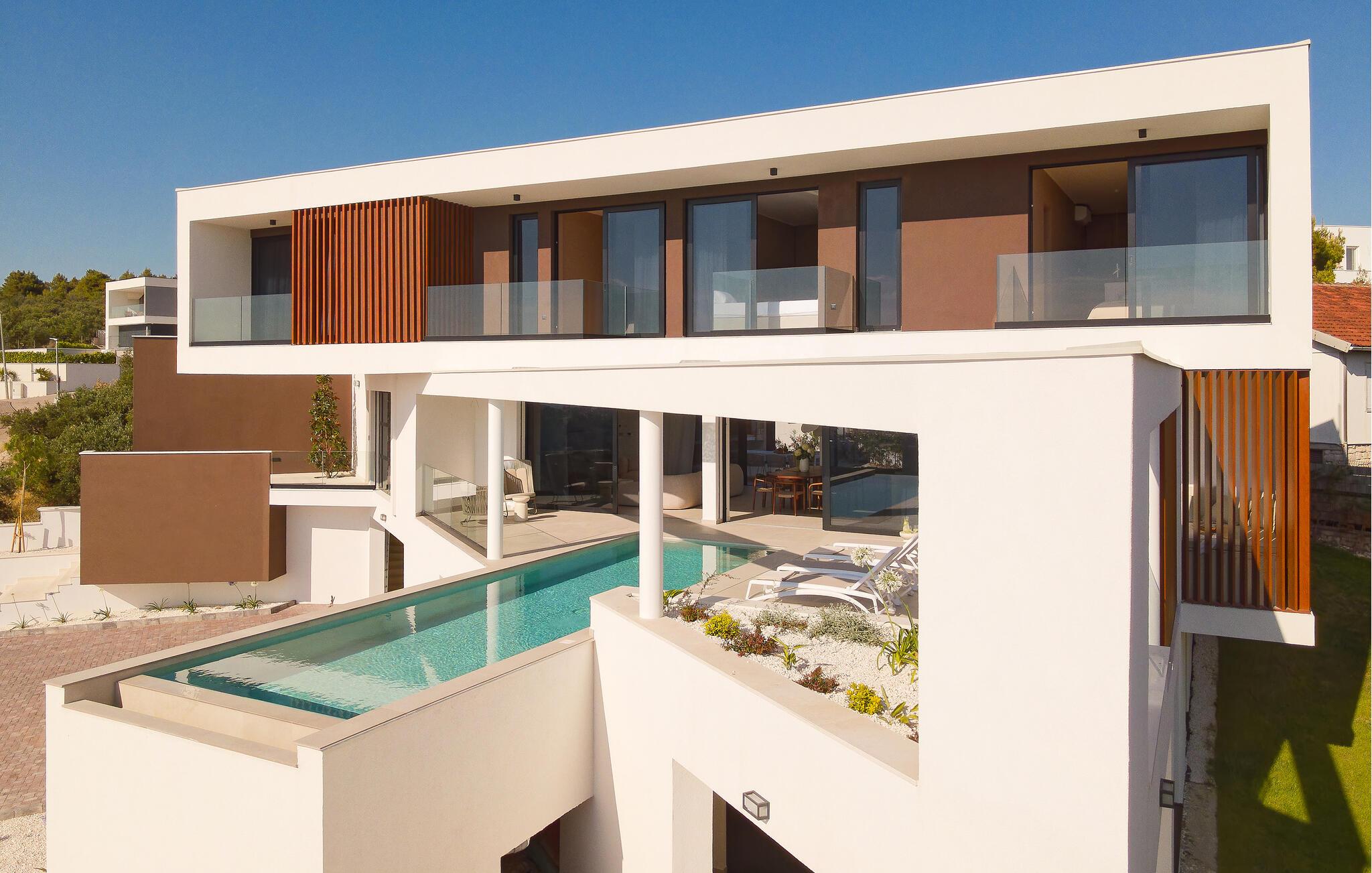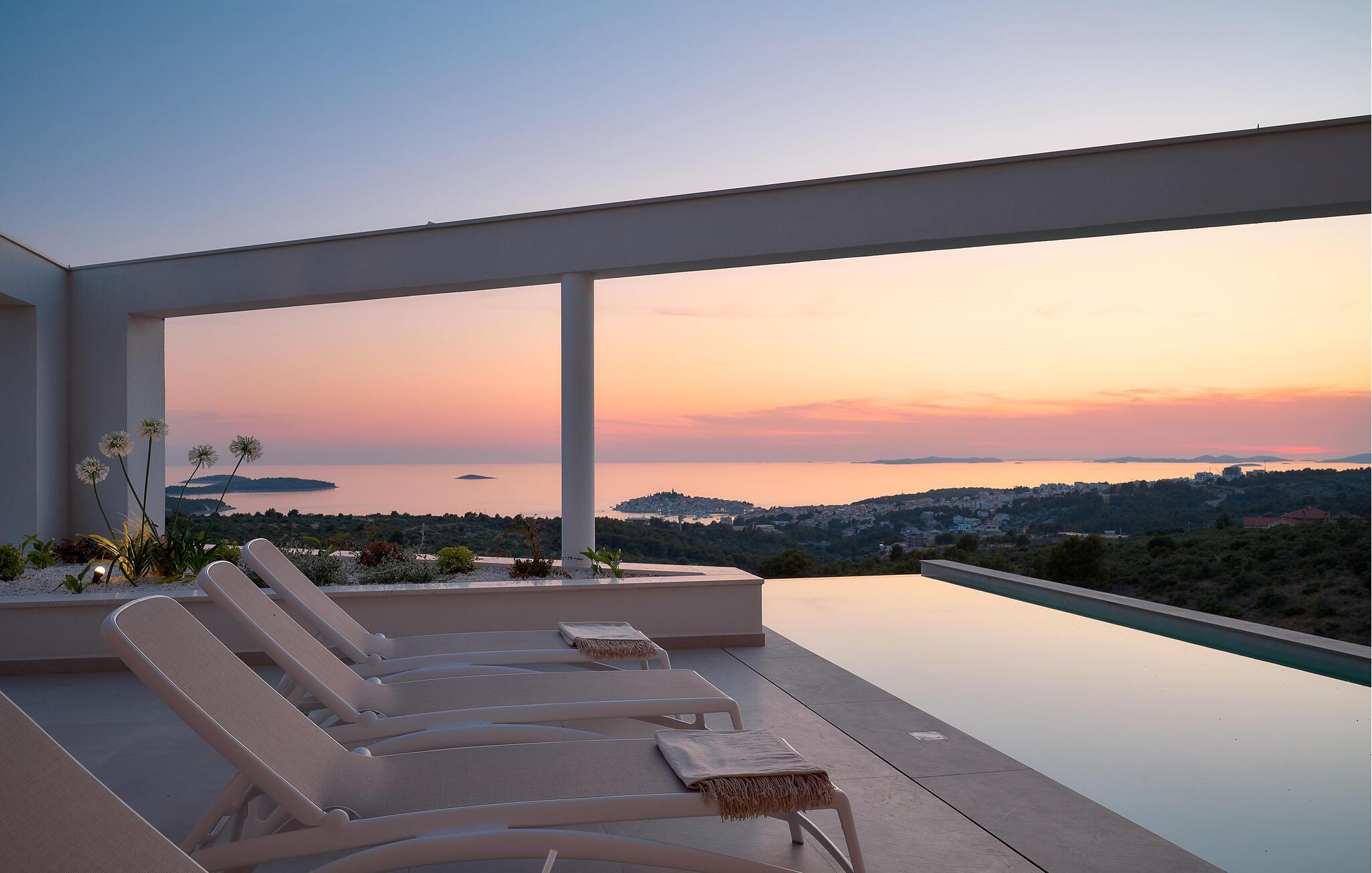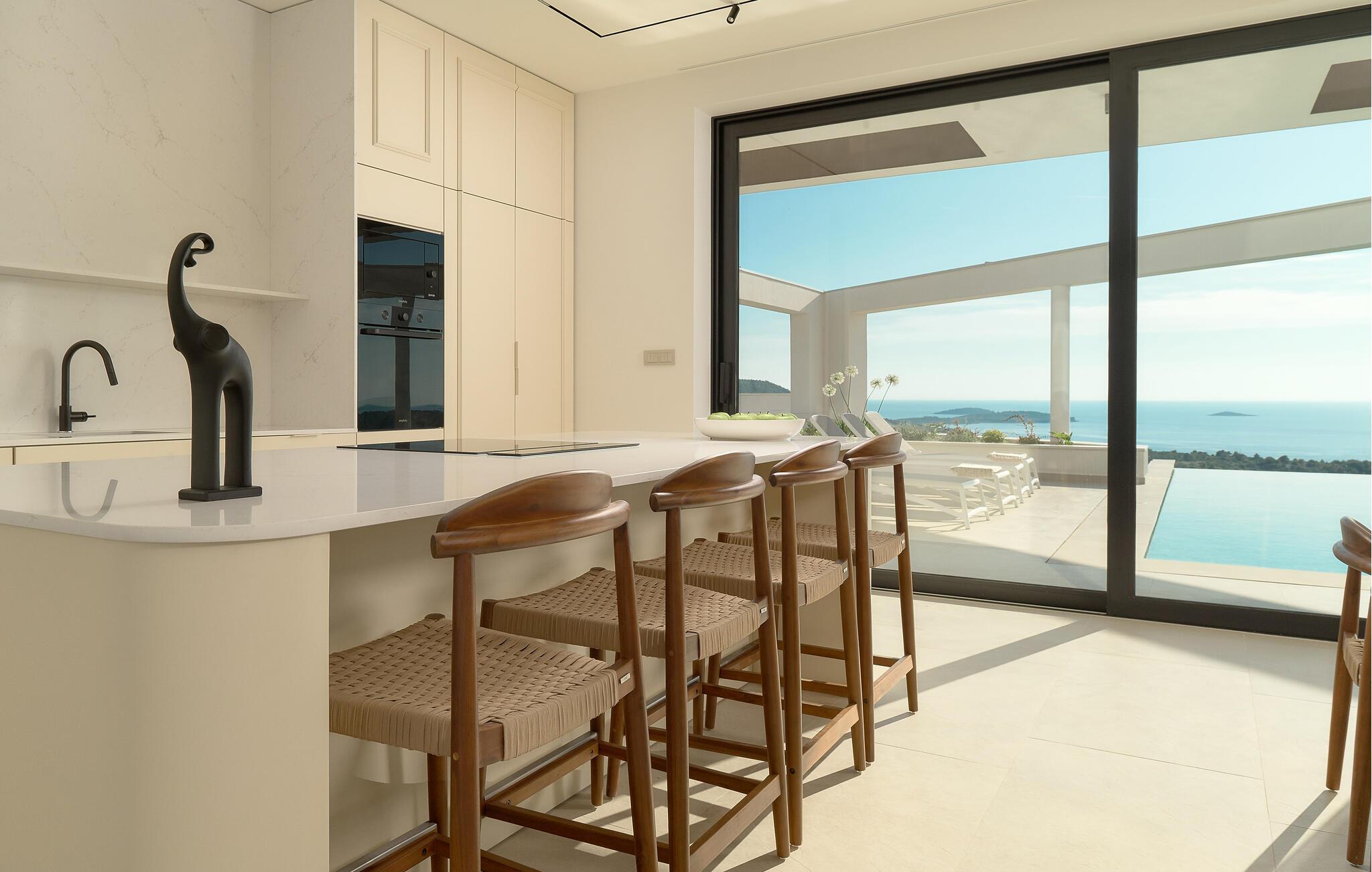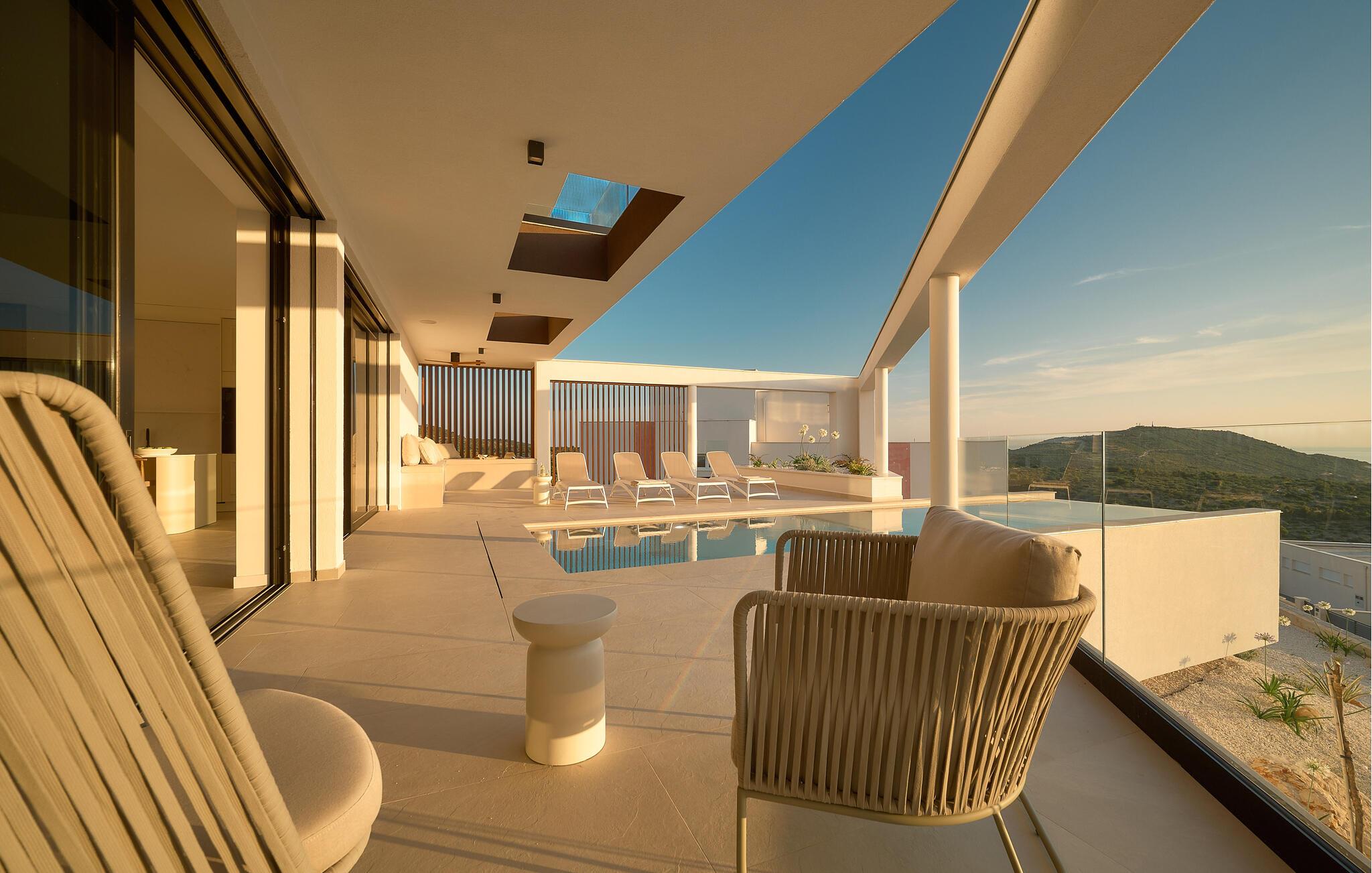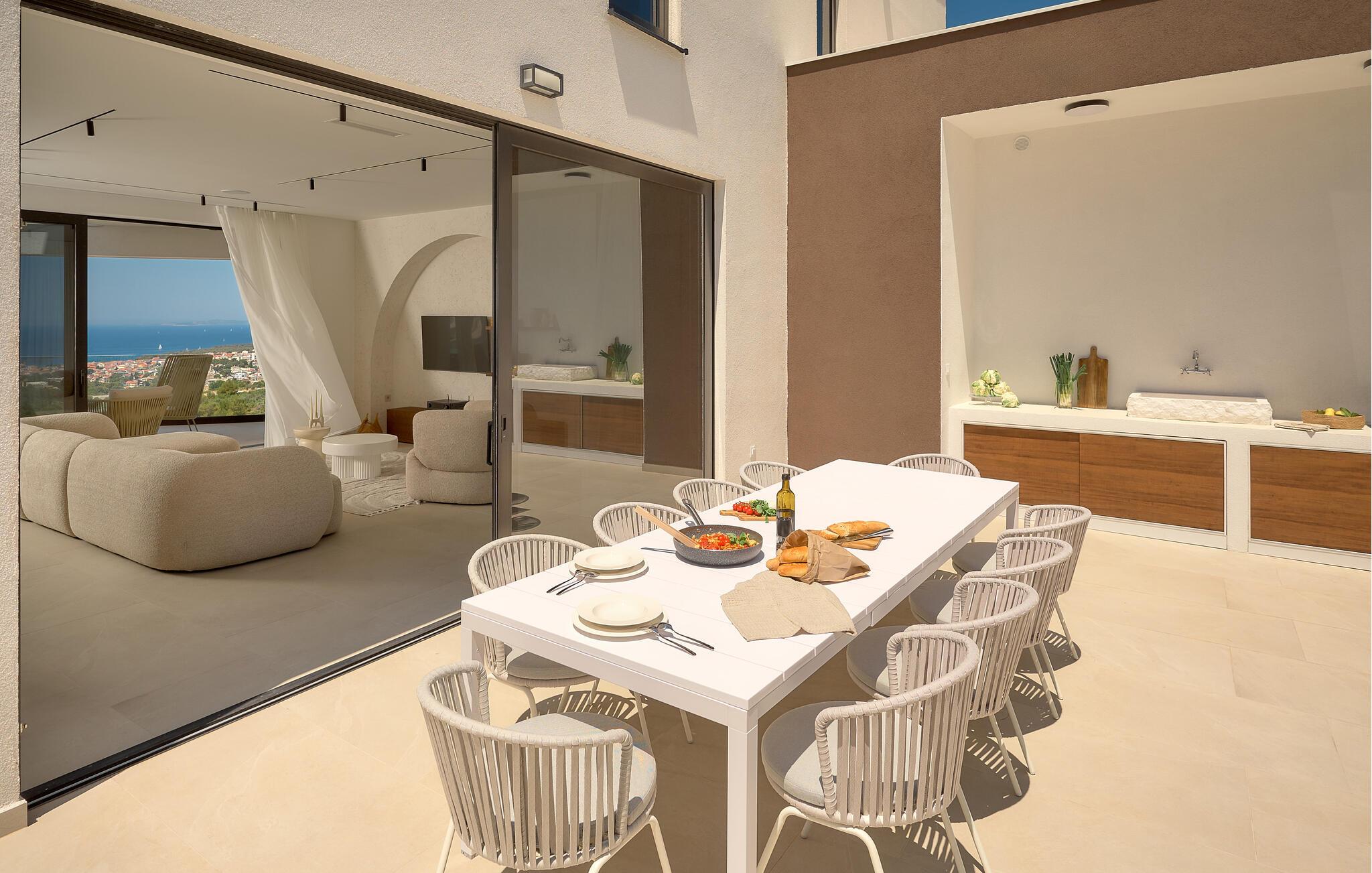Udenfor kan I nyde panoramaudsigten over Adriaterhavet. Dyk ned i infinity-poolen, der tilsyneladende smelter sammen med horisonten eller slap af på en af ??de stilfulde liggestole på solterrassen. Den velholdte have tilbyder afslapning med moderne siddepladser, mens sommerkøkkenet med grill lægger op til at nyde måltider sammen under stjernerne. Om aftenen skaber den diskrete belysning en behagelig atmosfære, mens I tilbringer hyggelige timer i spabadet.
