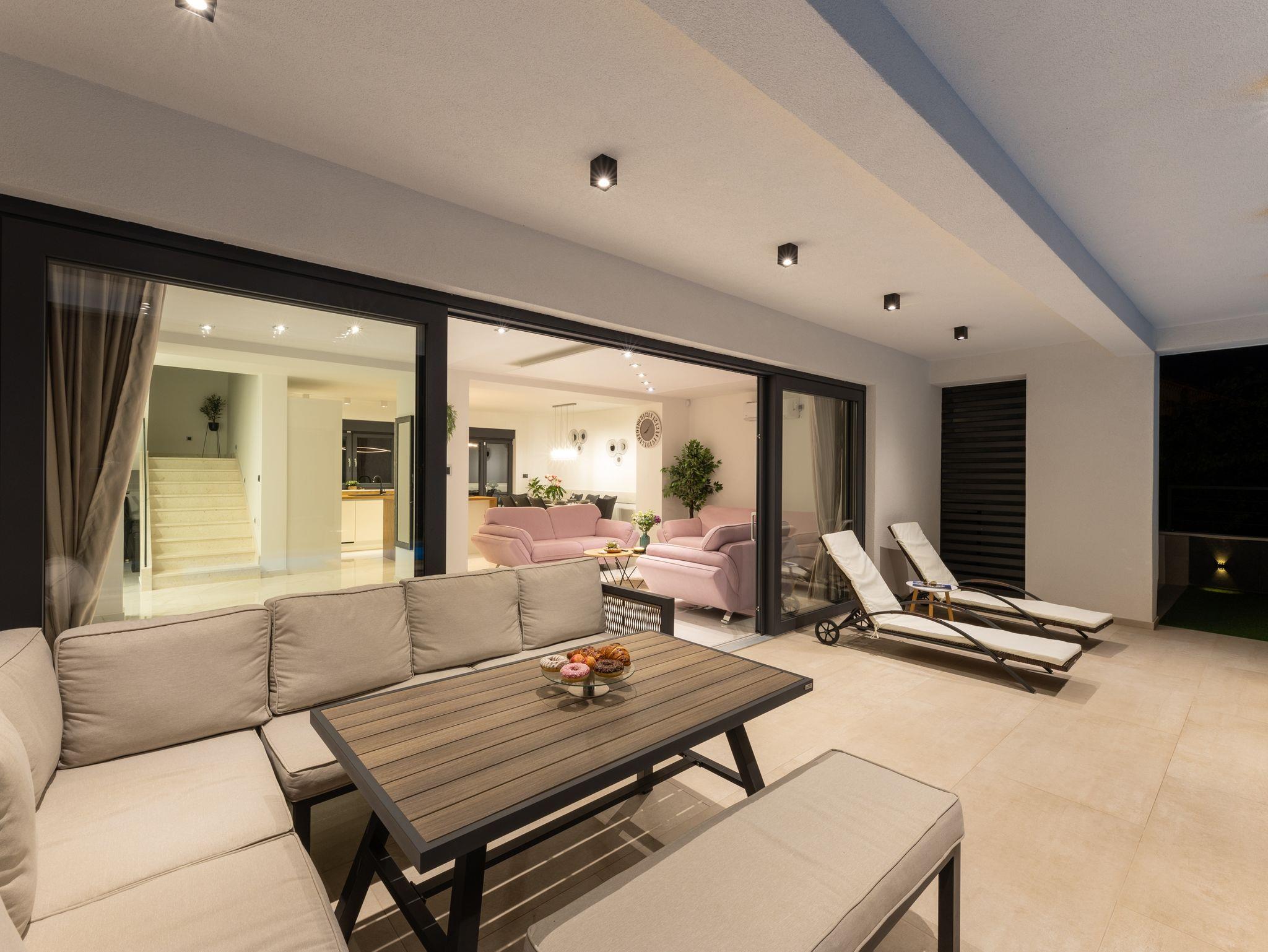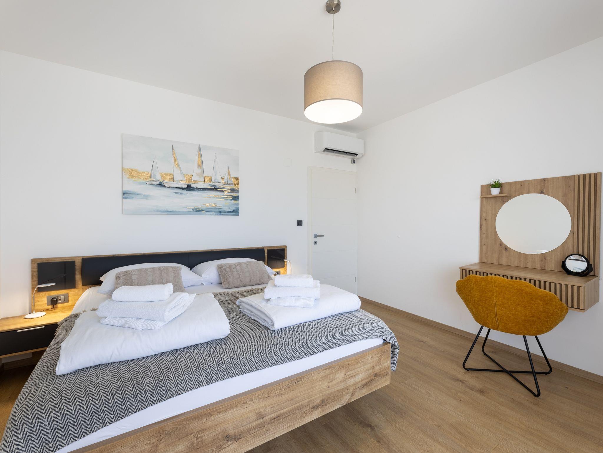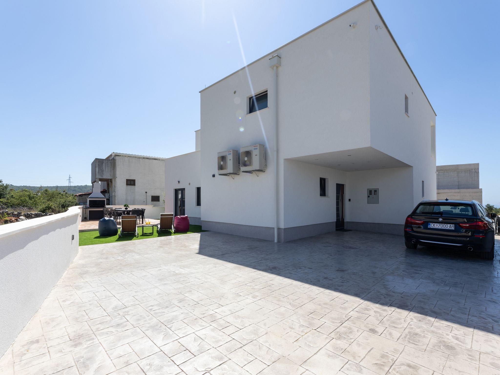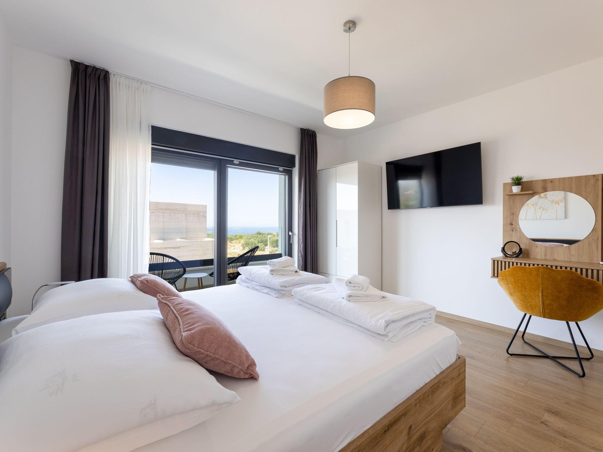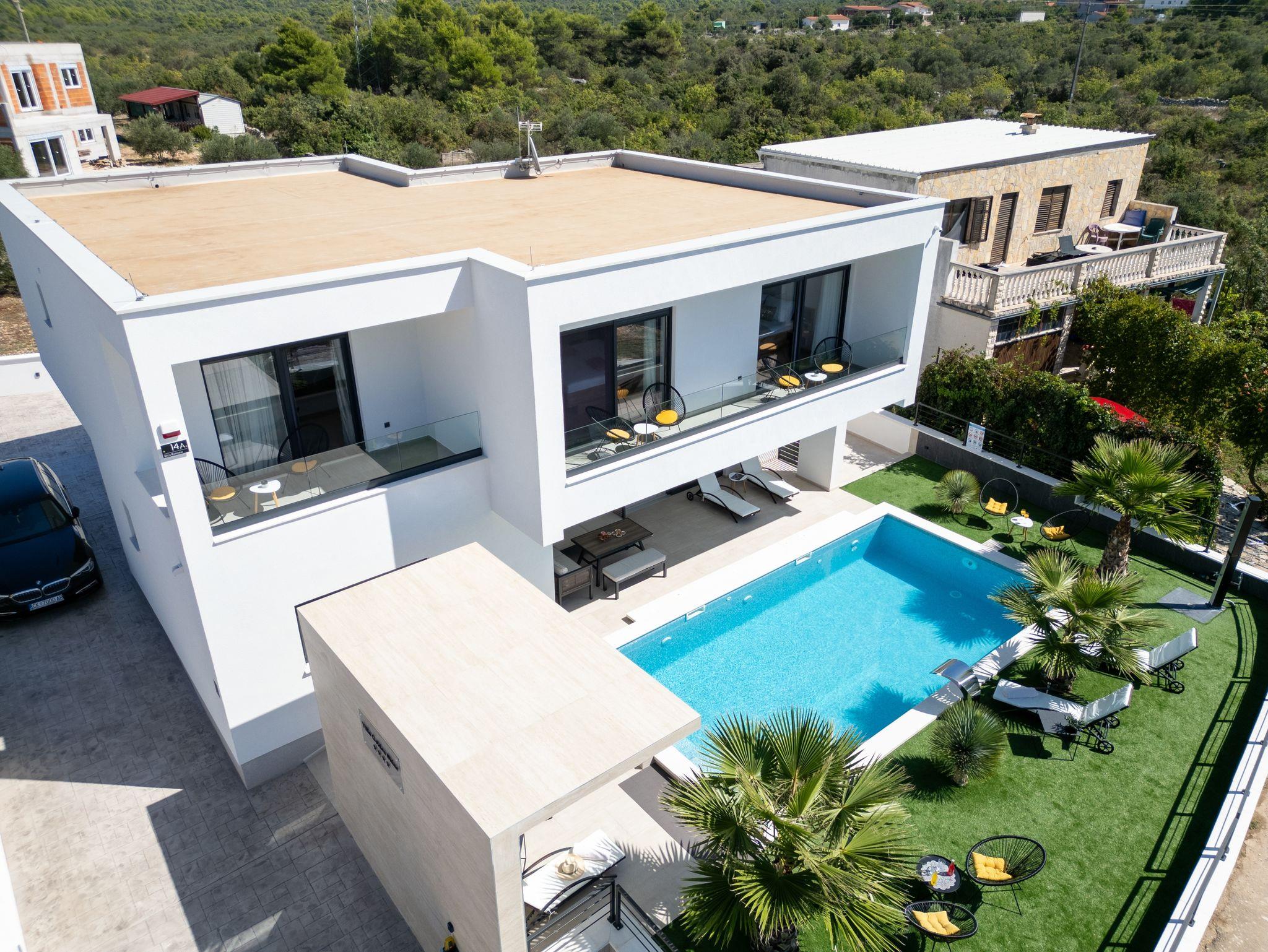 Haus bietet Platz für 10 Gäste. Die Betten sind in Schlafzimmern, die es 5 gibt, innerhalb einer Gesamtfläche von 181m2, angeordnet. Die Gäste haben eine eigene Terrasse zur Verfügung, auf der sie in warmen Sommernächten genießen können. Das Haus bietet Meerblick. Für vollen Genuss und Entspannung gibt es einen privaten Grill für Gäste dieser Unterkunft. Während ihres Aufenthalts können sich Gäste im privaten Schwimmbad entspannen. In der Unterkunftseinheit besteht die Möglichkeit des Mitbringens von Haustieren gegen Aufpreis. IM PREIS INBEGRIFFEN: Kurtaxe, Endreinigung, Klimatisierung, Pool, Parkplatz, Internet, Kinderbett, Zusatzbett, Bügeleisen, Bügelbrett, Föhn, Liegestühle. UNVERBINDLICHE ZUSÄTZLICHE KOSTEN: Haustiere (15,00 € pro Nacht). Die Verfügbarkeit zusätzlicher Dienstleistungen in Ihrem reservierten Termin und die Preise derselben (falls nicht aufgeführt) müssen im Voraus überprüft werden. Zusätzliche Dienstleistungen die in der Zahlungsaufforderung nicht aufgeführt sind werden direkt beim Vermieter bezahlt, angenommen der Gast nutzt auch diese. Ermäßigung auf den Grundpreis: Gratistag 28=25 (bei einem Aufenthalt von 28 oder mehr Tagen erhalten Sie 3 kostenlose Tage für den Aufenthalt bis 31.12.26).