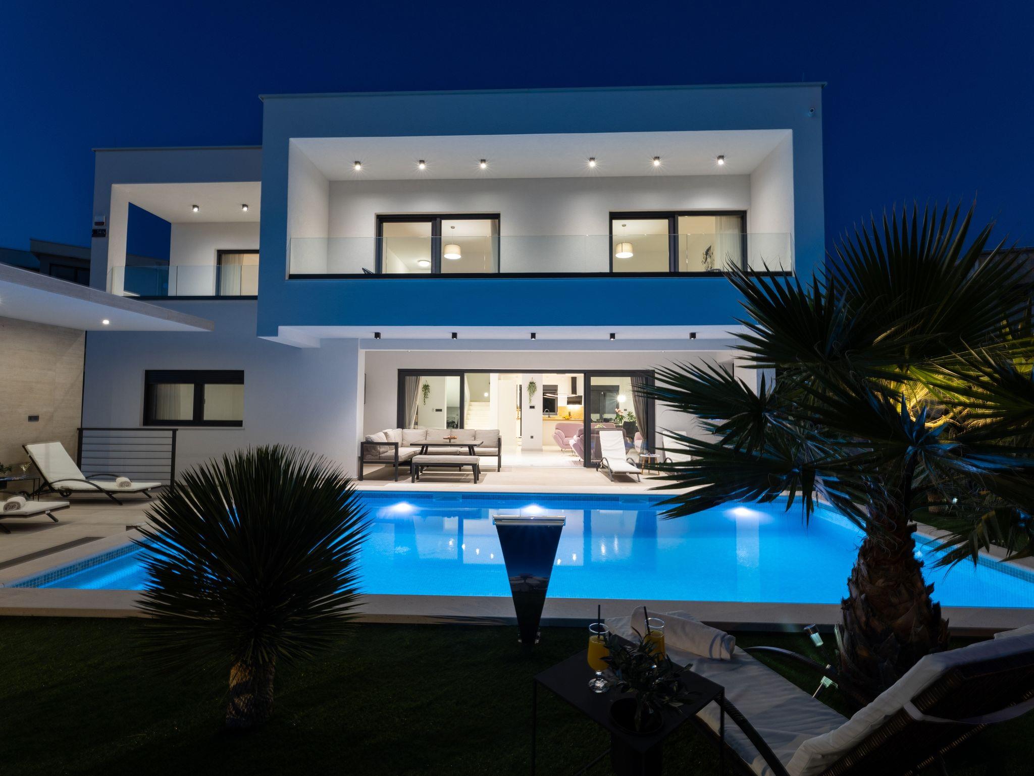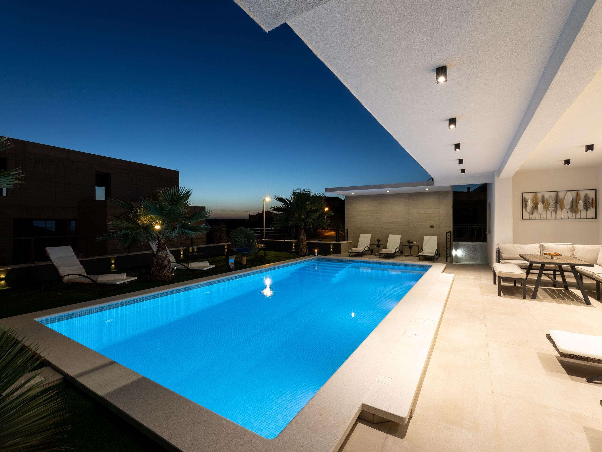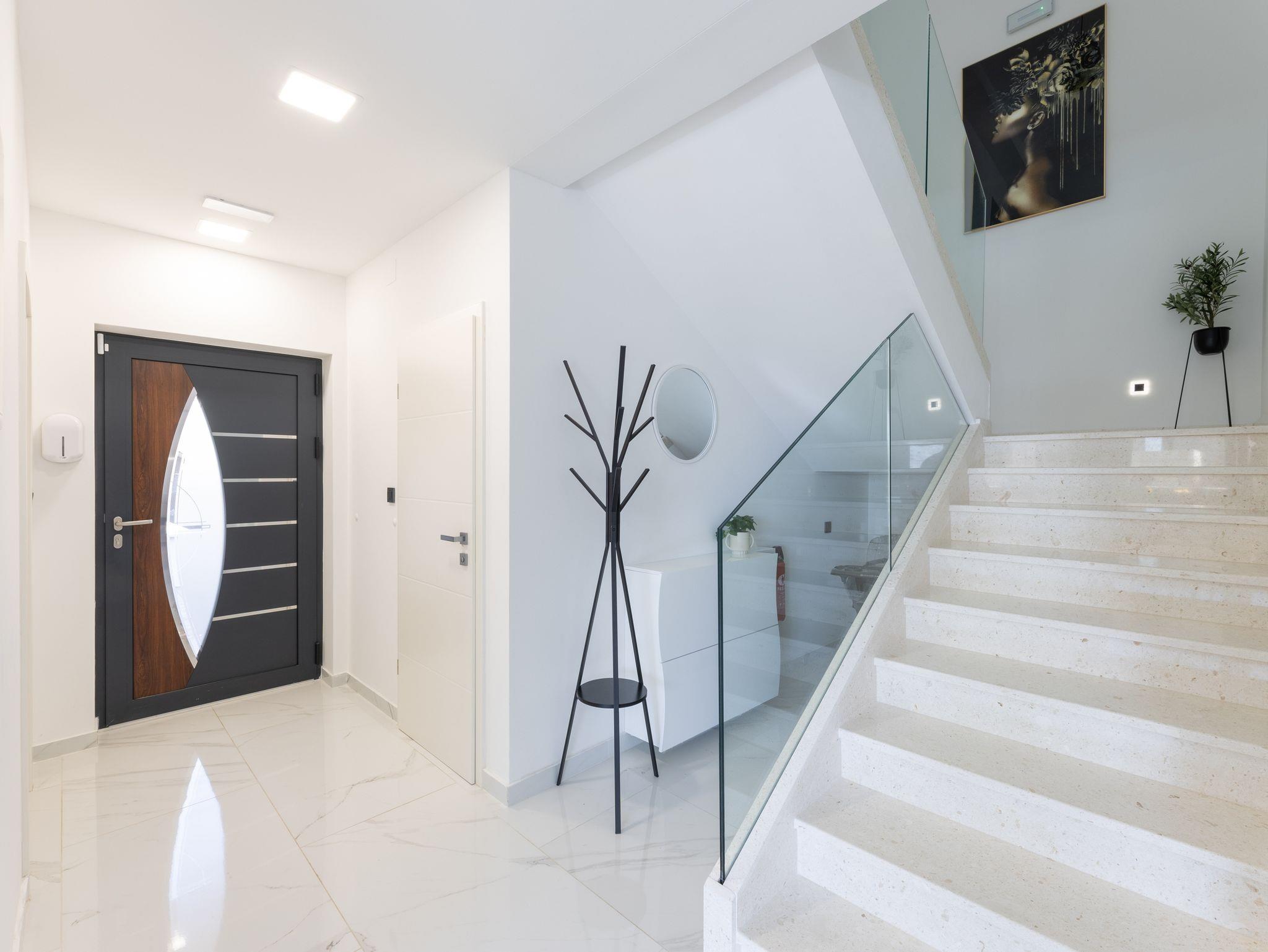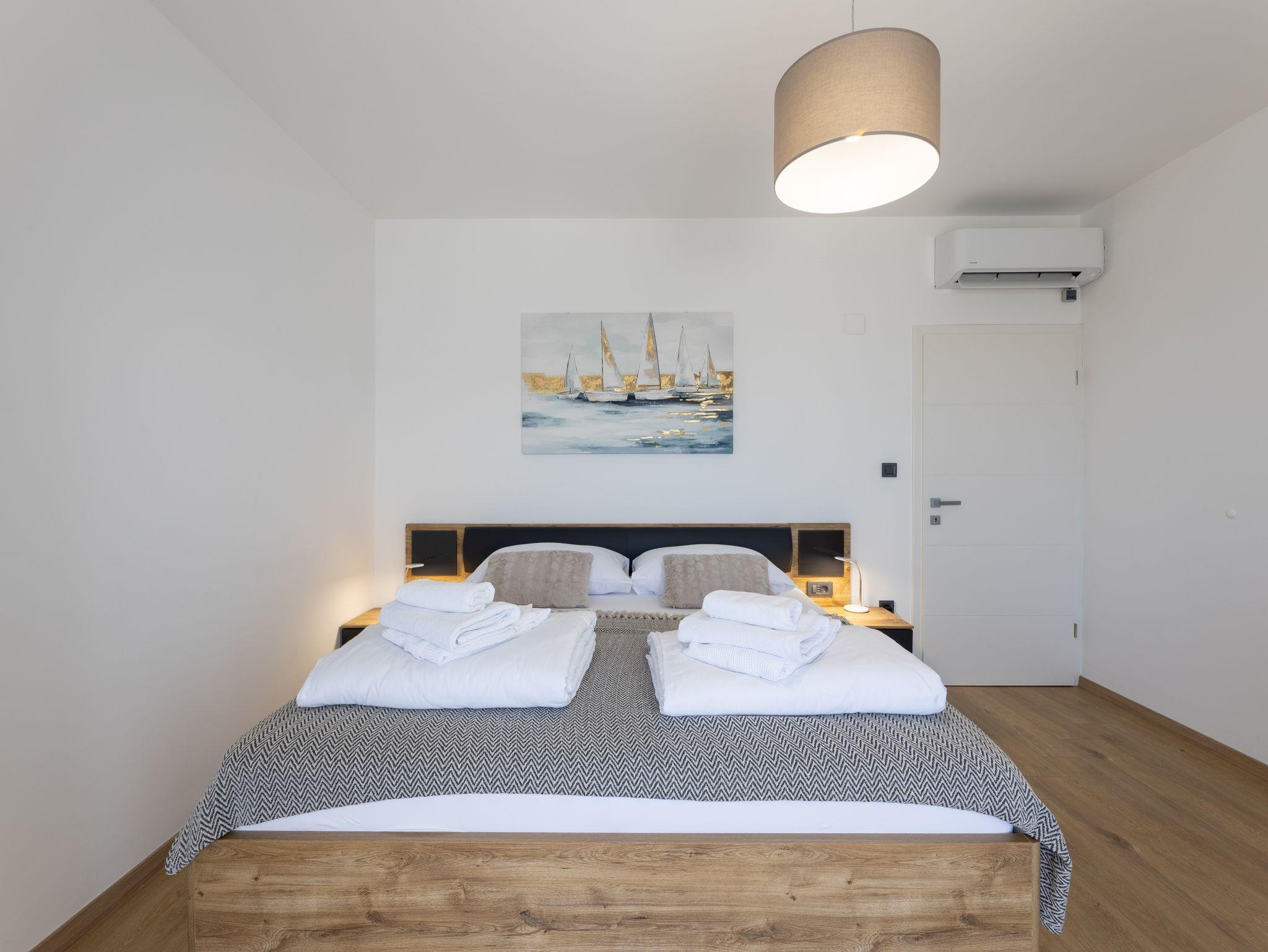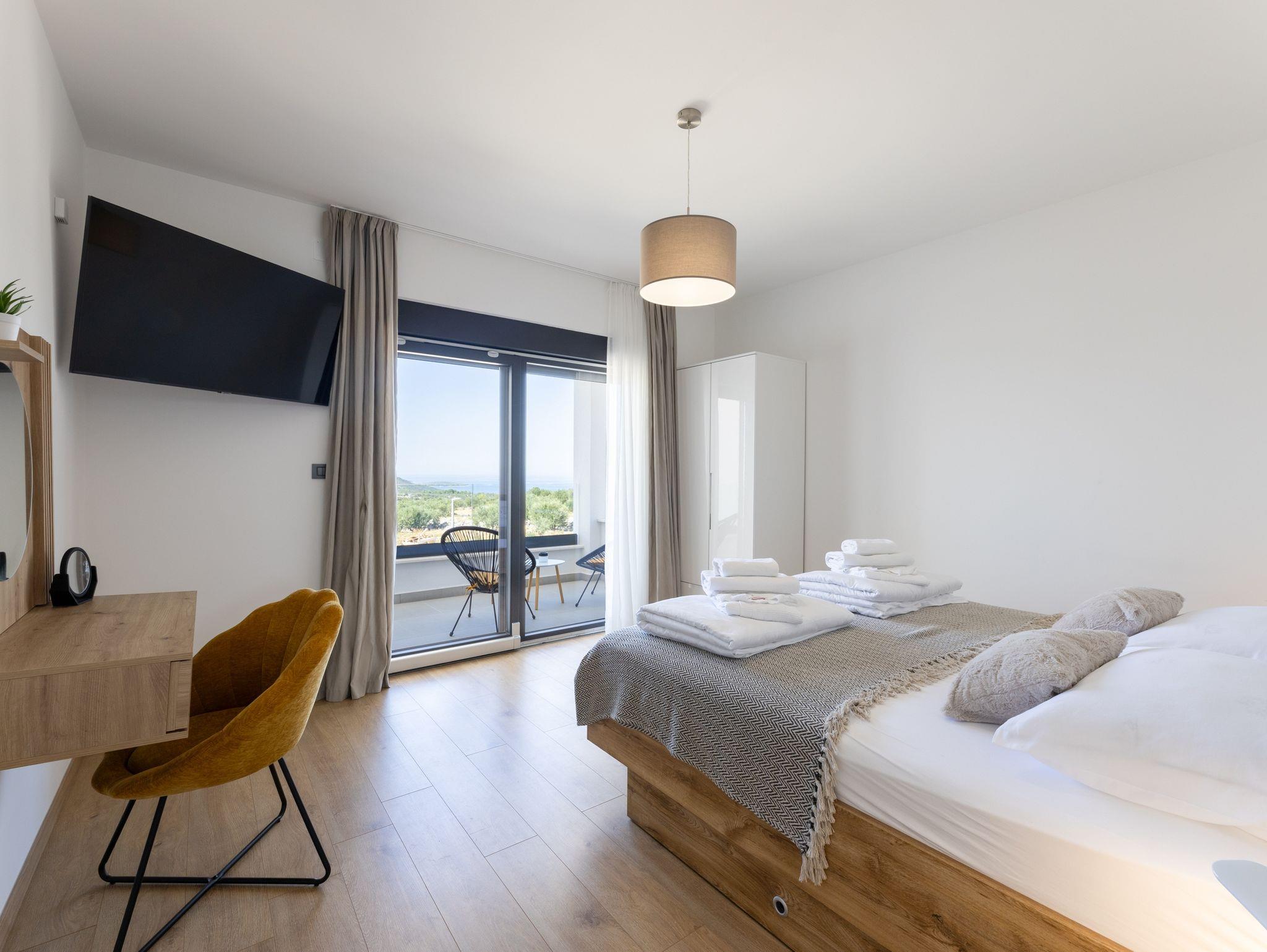 Haus bietet Platz für 10 Gäste. Die Betten sind in Schlafzimmern, die es 5 gibt, innerhalb einer Gesamtfläche von 181m2, angeordnet. Die Gäste haben eine eigene Terrasse zur Verfügung, auf der sie in warmen Sommernächten genießen können. Das Haus bietet Meerblick. Für vollen Genuss und Entspannung gibt es einen privaten Grill für Gäste dieser Unterkunft. Während ihres Aufenthalts können sich Gäste im privaten Schwimmbad entspannen. In der Unterkunftseinheit besteht die Möglichkeit des Mitbringens von Haustieren gegen Aufpreis. IM PREIS INBEGRIFFEN: Kurtaxe, Endreinigung, Klimatisierung, Pool, Parkplatz, Internet, Kinderbett, Zusatzbett, Bügeleisen, Bügelbrett, Föhn, Liegestühle. UNVERBINDLICHE ZUSÄTZLICHE KOSTEN: Haustiere (15,00 € pro Nacht). Die Verfügbarkeit zusätzlicher Dienstleistungen in Ihrem reservierten Termin und die Preise derselben (falls nicht aufgeführt) müssen im Voraus überprüft werden. Zusätzliche Dienstleistungen die in der Zahlungsaufforderung nicht aufgeführt sind werden direkt beim Vermieter bezahlt, angenommen der Gast nutzt auch diese. Ermäßigung auf den Grundpreis: Gratistag 28=25 (bei einem Aufenthalt von 28 oder mehr Tagen erhalten Sie 3 kostenlose Tage für den Aufenthalt bis 31.12.26).