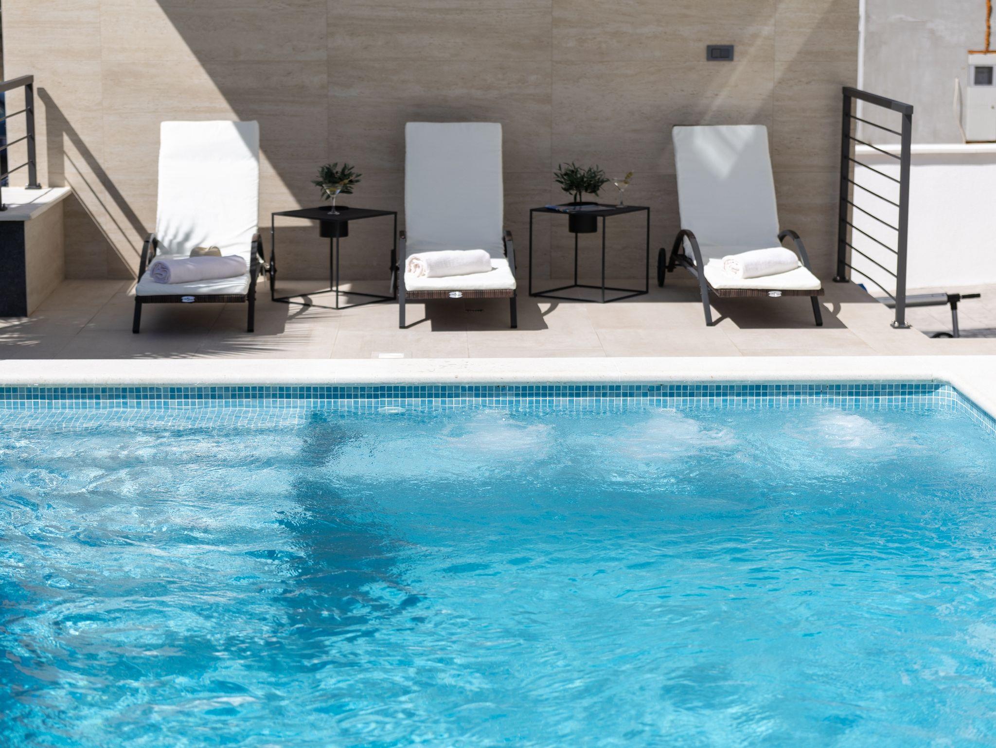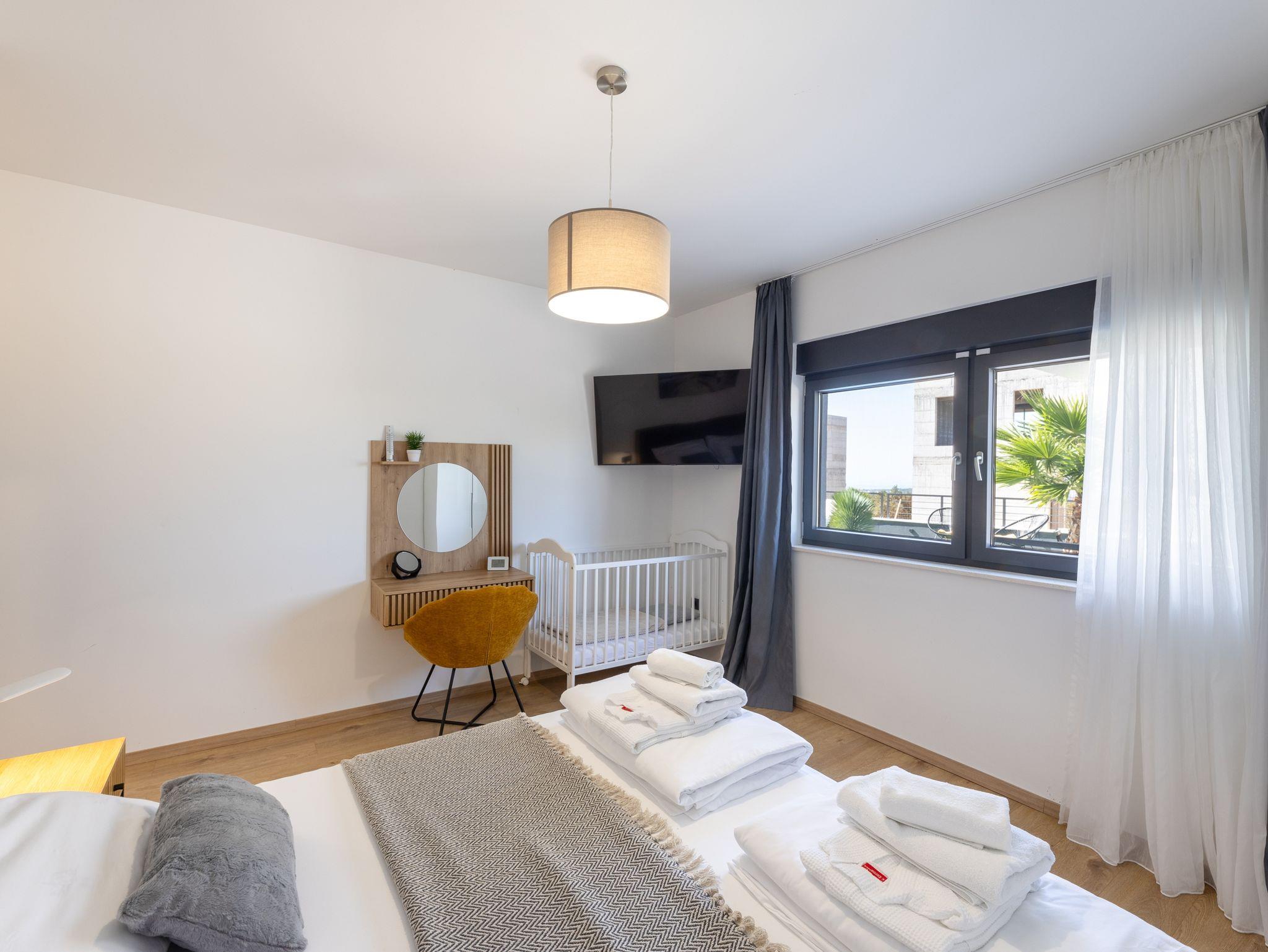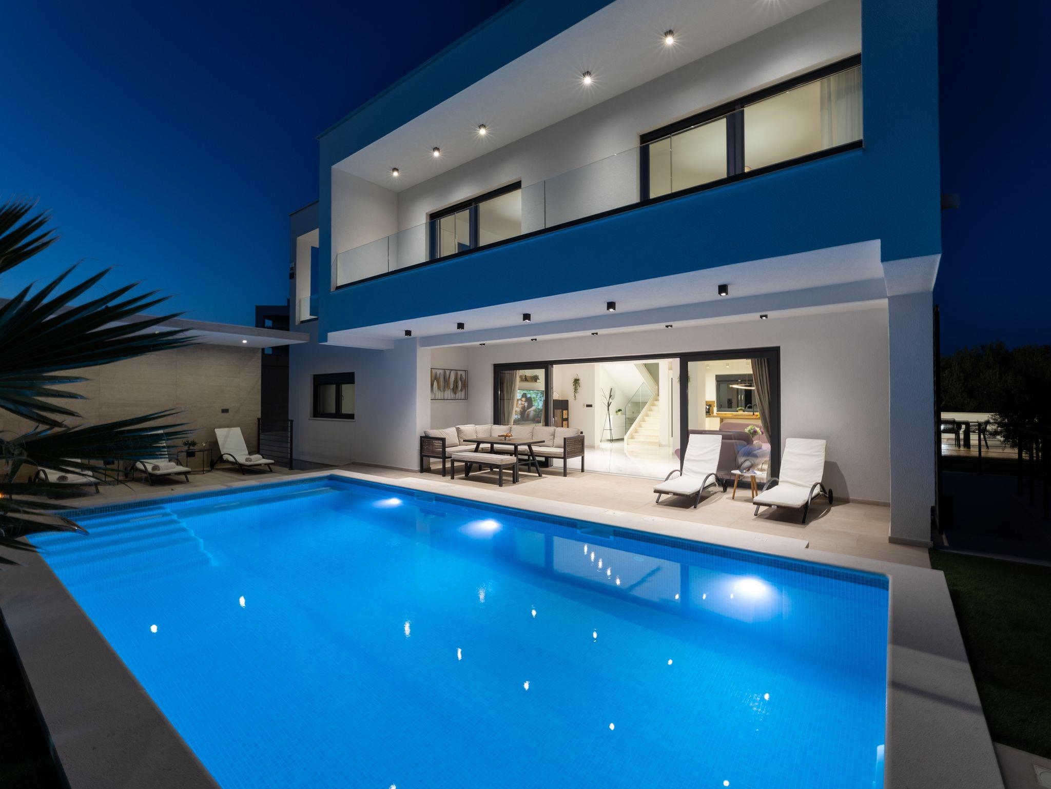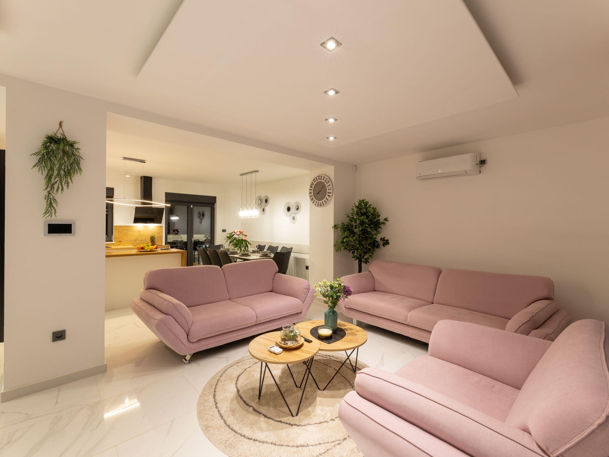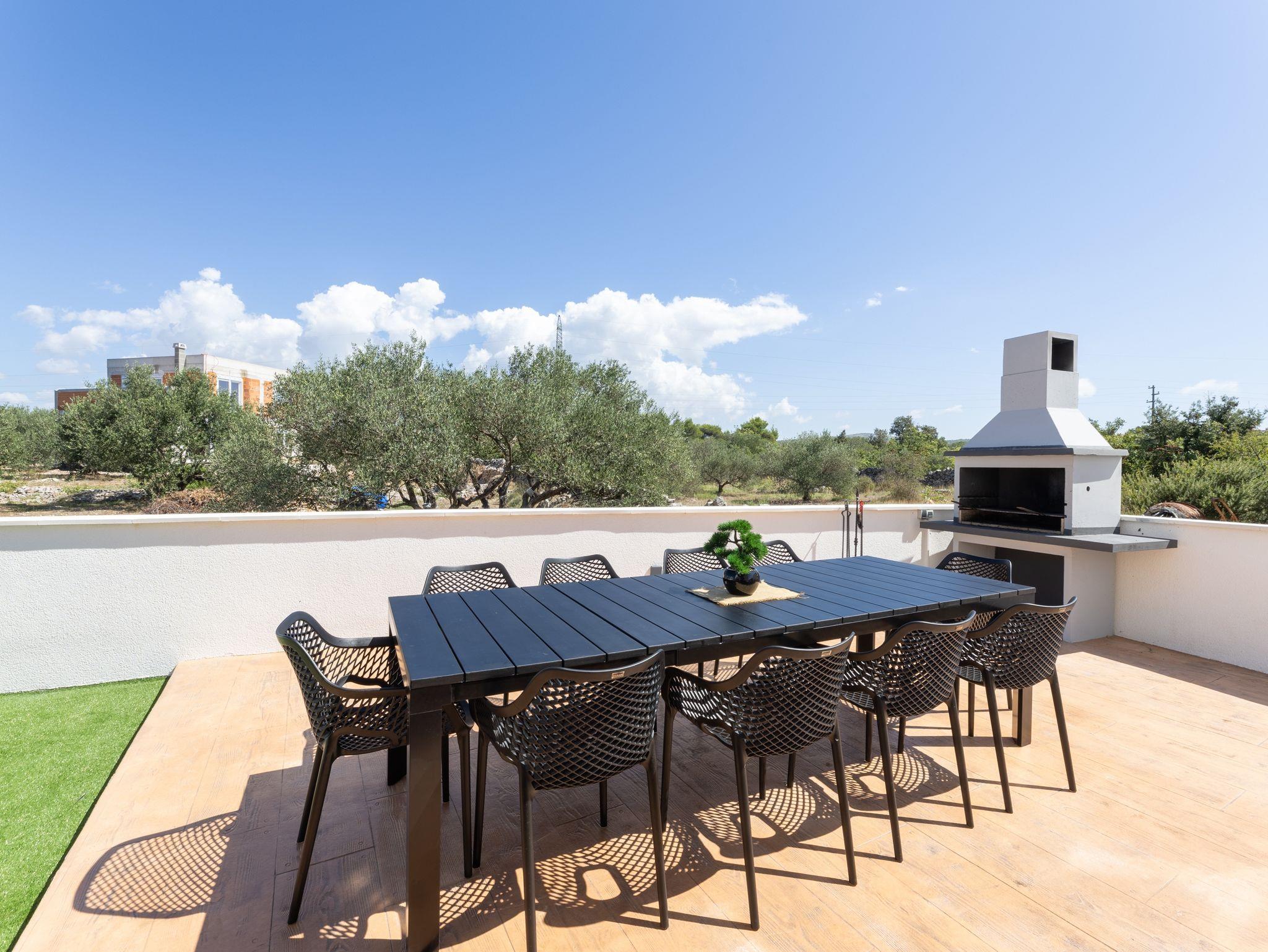 Haus bietet Platz für 10 Gäste. Die Betten sind in Schlafzimmern, die es 5 gibt, innerhalb einer Gesamtfläche von 181m2, angeordnet. Die Gäste haben eine eigene Terrasse zur Verfügung, auf der sie in warmen Sommernächten genießen können. Das Haus bietet Meerblick. Für vollen Genuss und Entspannung gibt es einen privaten Grill für Gäste dieser Unterkunft. Während ihres Aufenthalts können sich Gäste im privaten Schwimmbad entspannen. In der Unterkunftseinheit besteht die Möglichkeit des Mitbringens von Haustieren gegen Aufpreis. IM PREIS INBEGRIFFEN: Kurtaxe, Endreinigung, Klimatisierung, Pool, Parkplatz, Internet, Kinderbett, Zusatzbett, Bügeleisen, Bügelbrett, Föhn, Liegestühle. UNVERBINDLICHE ZUSÄTZLICHE KOSTEN: Haustiere (15,00 € pro Nacht). Die Verfügbarkeit zusätzlicher Dienstleistungen in Ihrem reservierten Termin und die Preise derselben (falls nicht aufgeführt) müssen im Voraus überprüft werden. Zusätzliche Dienstleistungen die in der Zahlungsaufforderung nicht aufgeführt sind werden direkt beim Vermieter bezahlt, angenommen der Gast nutzt auch diese. Ermäßigung auf den Grundpreis: Gratistag 28=25 (bei einem Aufenthalt von 28 oder mehr Tagen erhalten Sie 3 kostenlose Tage für den Aufenthalt bis 31.12.26).