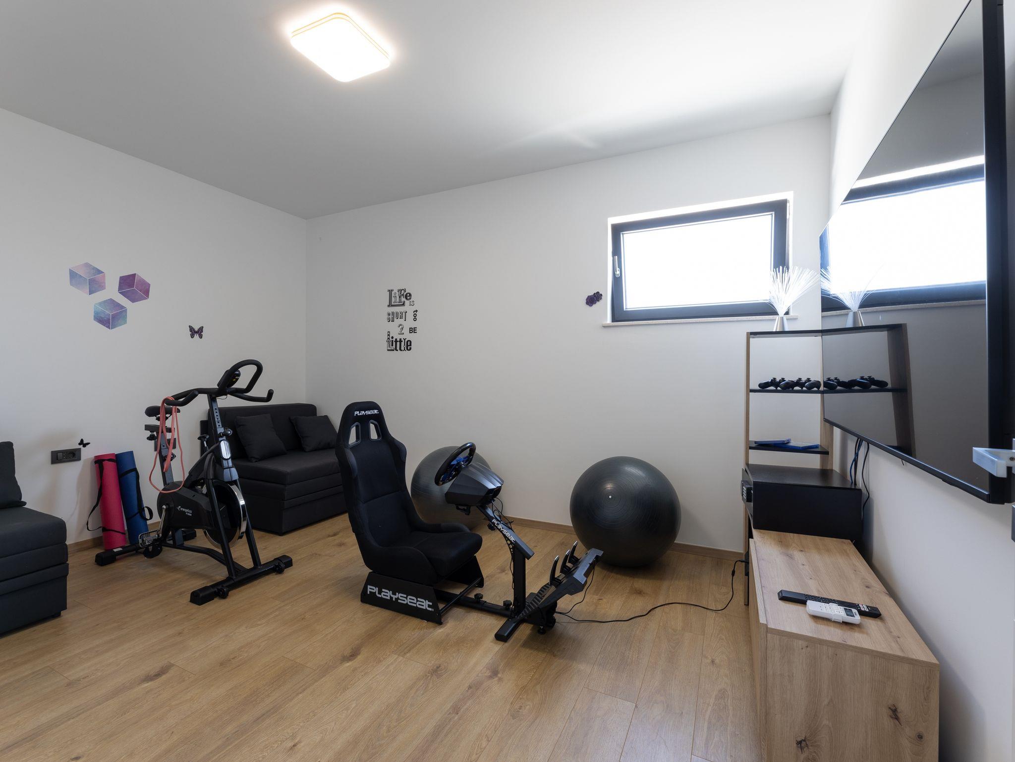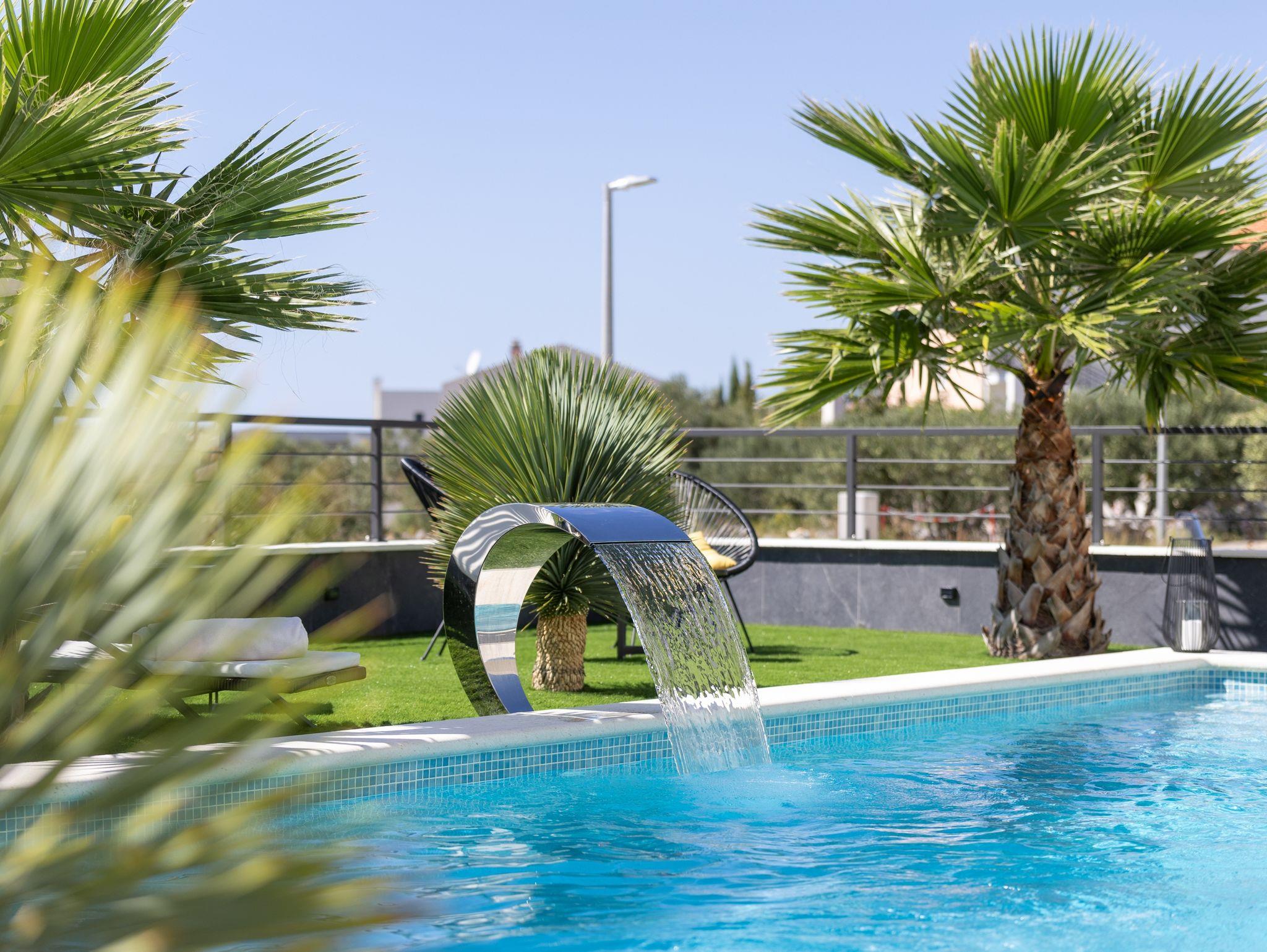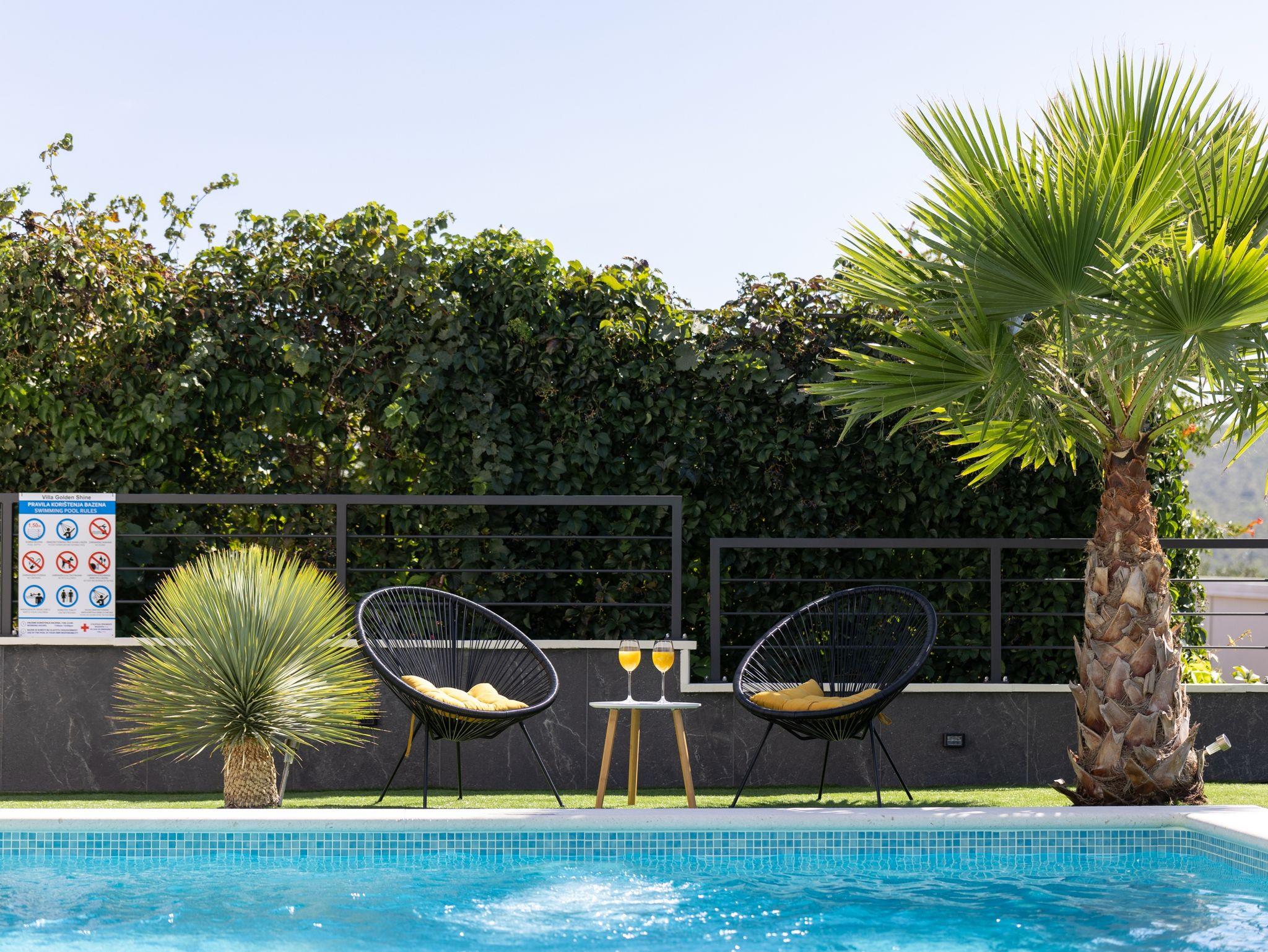Hof (500m2, Kinderbereich, Sitzbereich), Parkplatz (Anzahl der Parkplätze: 4, Entfernung vom Objekt: im Hof), Pool: privat, Dimensionen: 8m x 4m x 1.5m, Wassertyp: Salzwasser, Heizung: Ja, WiFi Internet, Föhn, Bügeleisen, Bügelbrett, Liegestühle, Kinderbett