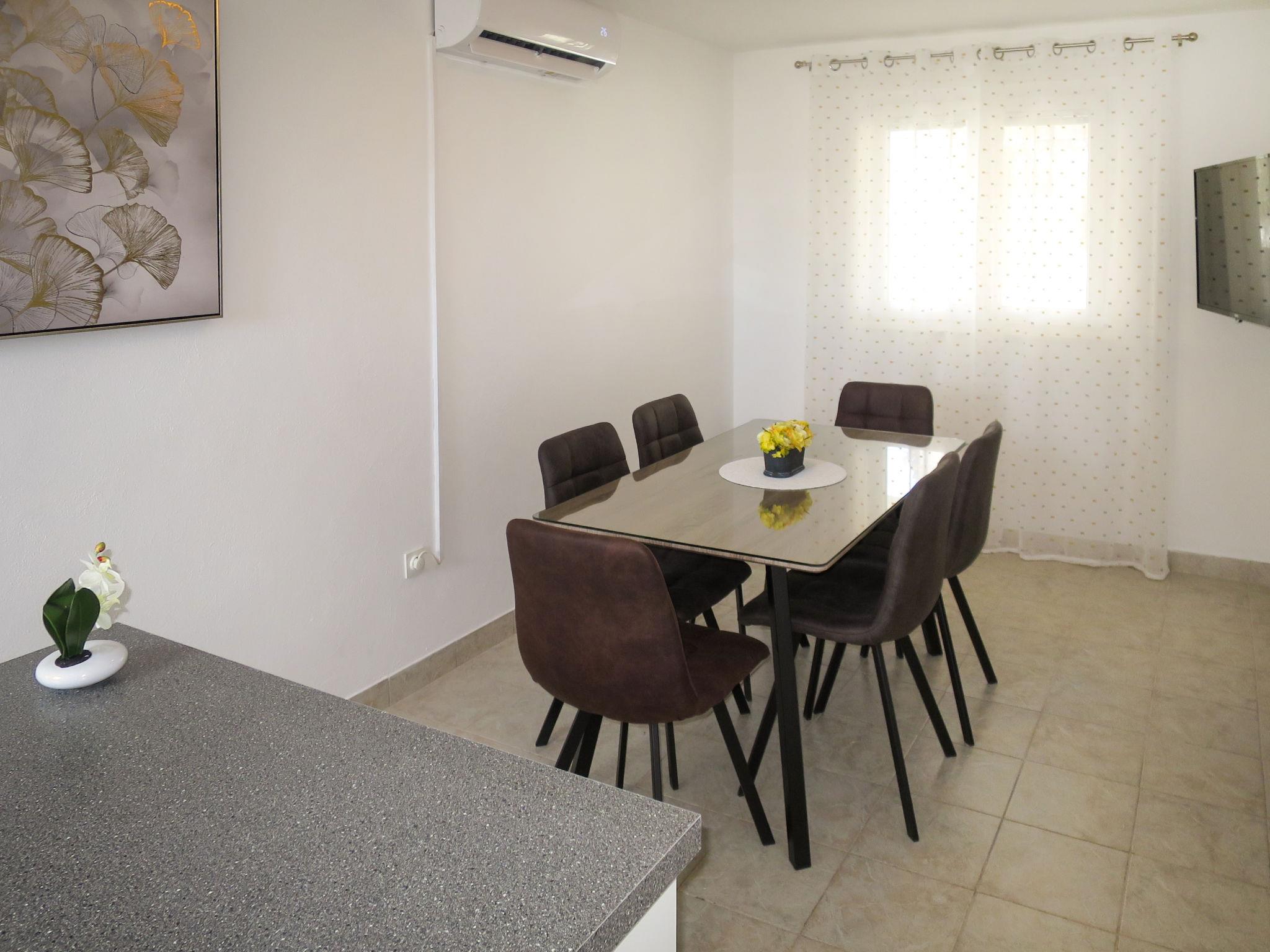 3-room house 65 m2 on 2 levels. Partly renovated in 2023, cosy furnishings: 1 room with 1 french bed (160 cm, length 200 cm). Open kitchen (oven, dishwasher, 2 ceramic glass hob hotplates, 2 gas rings, toaster, kettle, microwave, freezer, electric coffee machine) with dining table, satellite TV and air conditioning. Shower/WC. Upper floor: (exterior staircase) living room with 1 double sofabed (130 cm, length 200 cm), satellite TV and air conditioning. 1 room with 1 french bed (160 cm, length 200 cm). Small, open kitchen (2 hot plates, kettle, electric coffee machine). Shower/WC. No heating option. Balcony 4 m2, terrace 10 m2, roofed. Terrace furniture. Facilities: baby cot. Internet (WiFi, free).