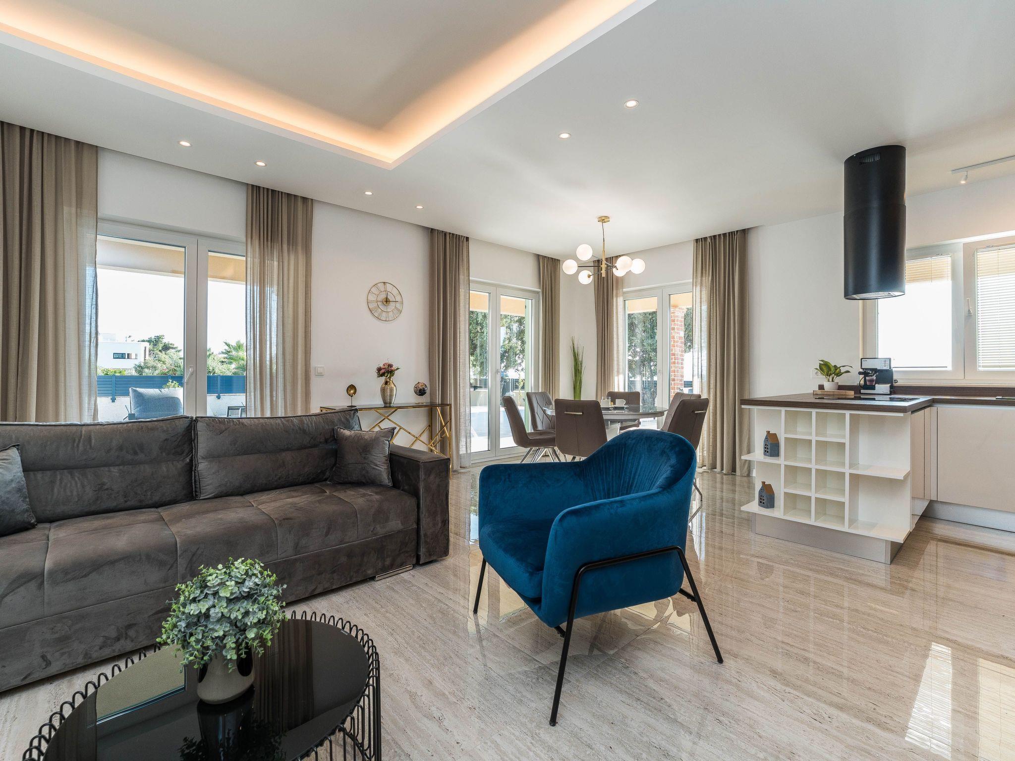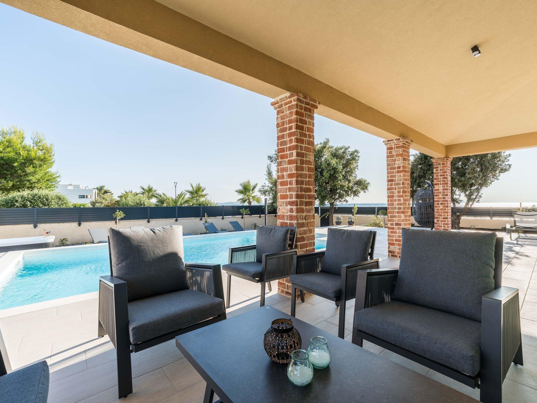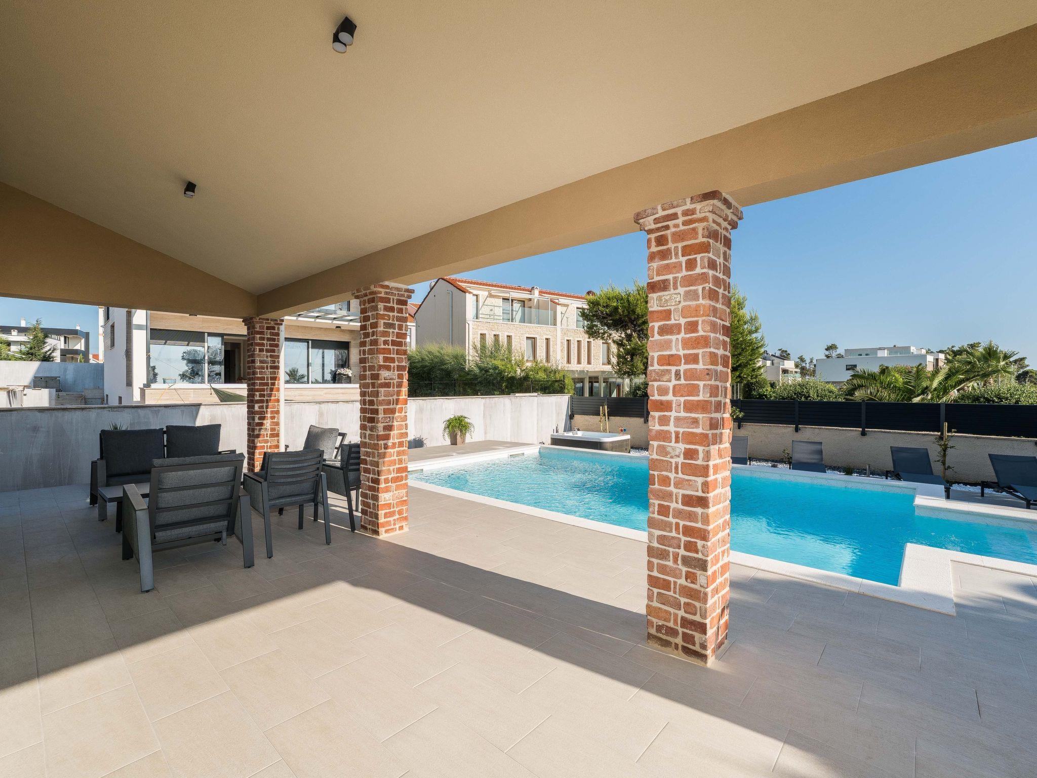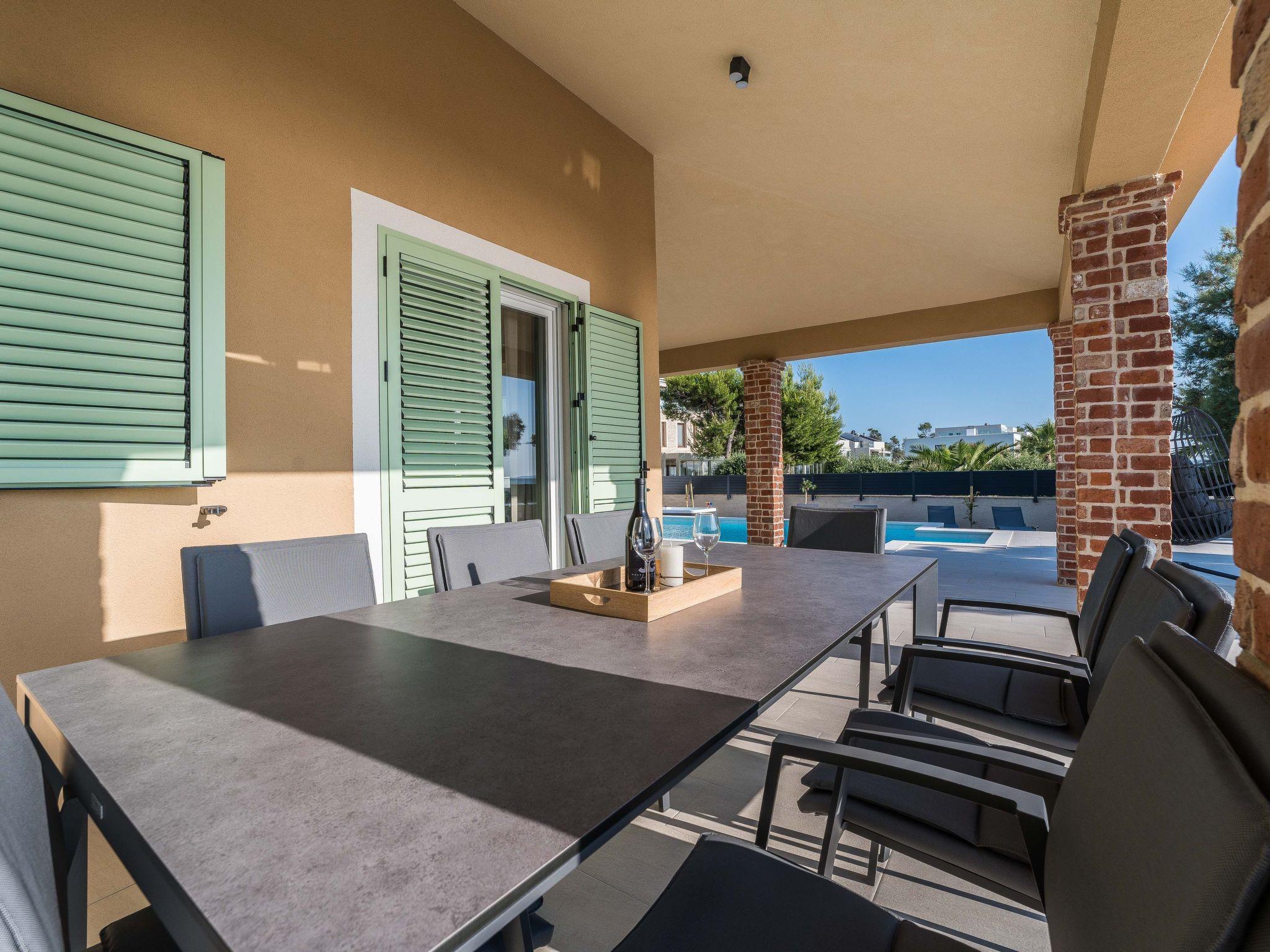 In the courtyard of the villa there is a swimming pool with sea water, while deckchairs, garden furniture and a jacuzzi are located next to it. On the spacious terrace you can enjoy summer evenings with your family and friends.