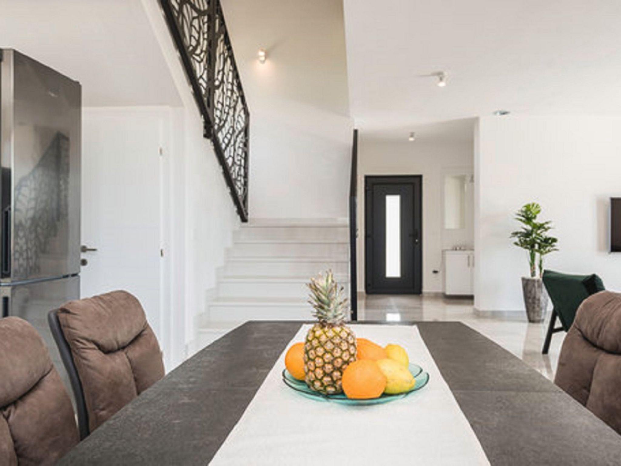 On the ground floor of the villa there is a fully equipped kitchen with pantry, a dining room that is connected to the living room with a corner furniture.