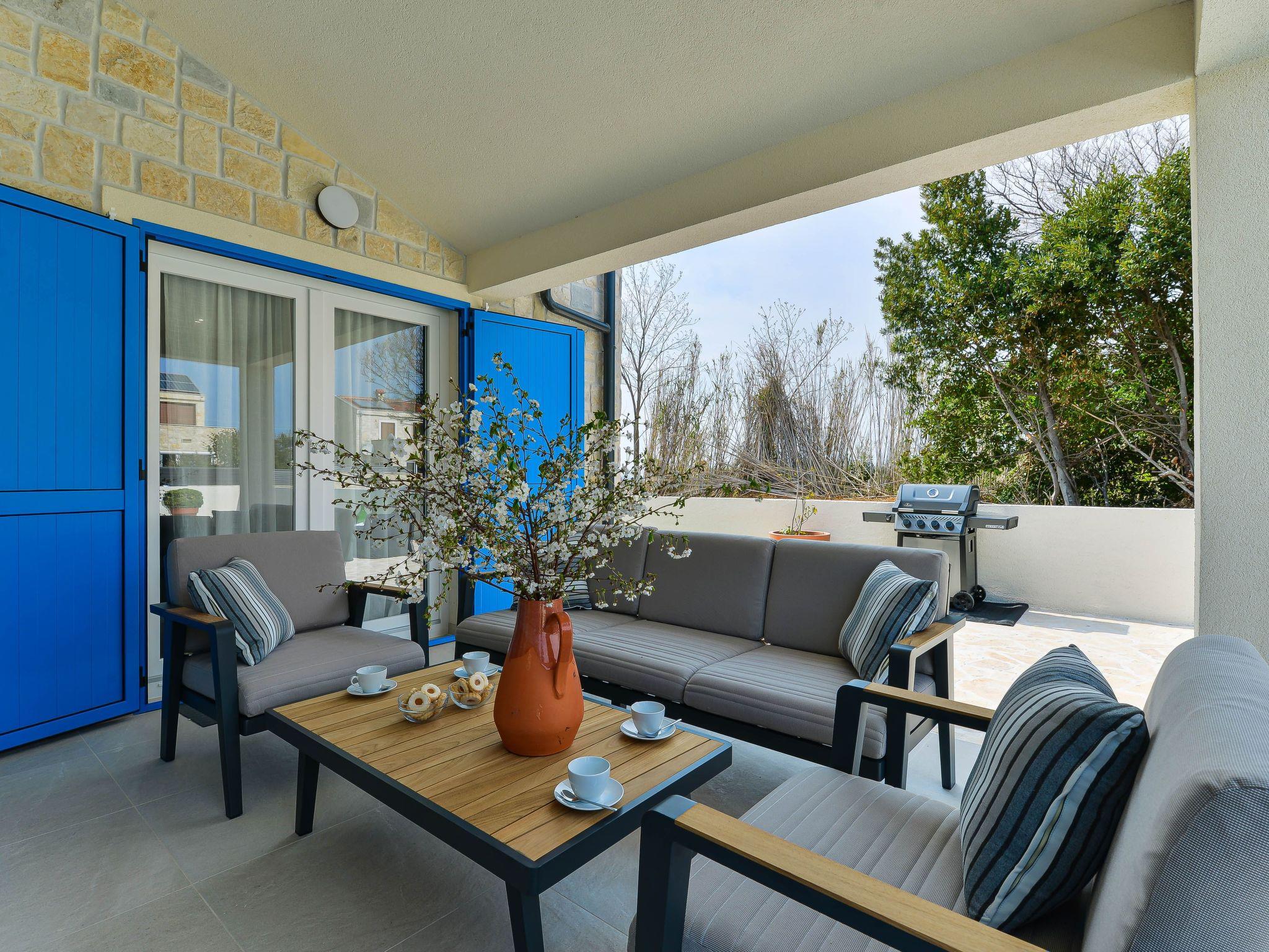 The exterior of Villa Moderna is as inviting as its interior. A highlight is the private pool, set within a large garden that offers both privacy and space for relaxation or play. The poolside is equipped with sun loungers, perfect for basking in the sun or indulging in a good book. An added luxury is the roof terrace, offering a secluded spot for quiet moments or evening gatherings. The ground floor terrace, outfitted with a table, chairs, and a barbecue, invites guests to enjoy al fresco dining amid the gentle Dalmatian breeze.