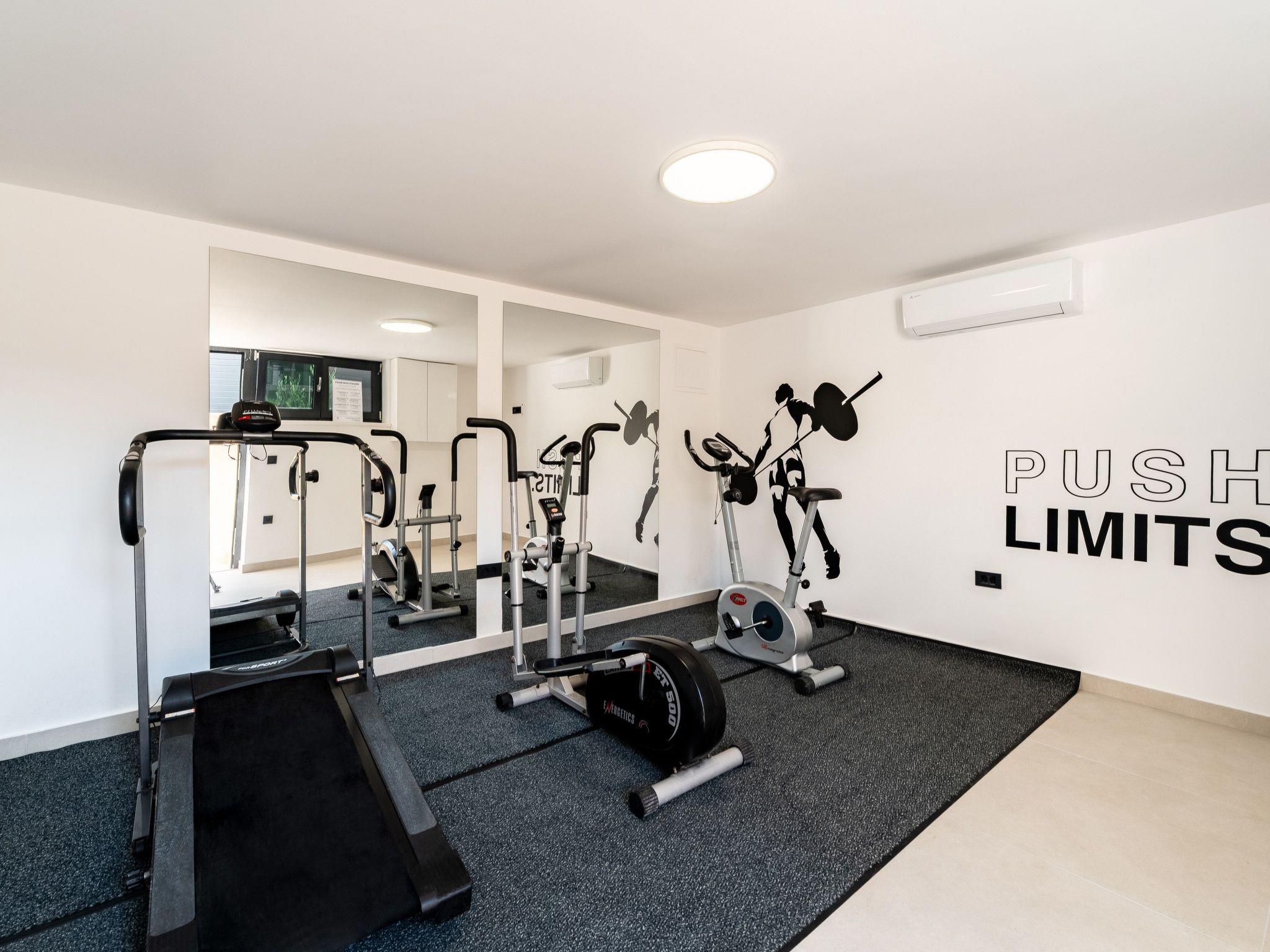 The 180 m² villa extends over the ground floor and offers a living room with fully equipped kitchen and dining area as well as three bedrooms with double beds, each with its own bathroom with shower. All bedrooms are air-conditioned and equipped with satellite TV. The villa has a 60 m² terrace overlooking the pool, which is equipped with parasol, sun loungers, table and chairs. The courtyard of the property has a heated swimming pool, a children's playground and a relaxation area with barbecue, outdoor shower, sun loungers, table and chairs. In the courtyard there is a pavilion with an outdoor kitchen and satellite TV. In the basement there is a fitness room (treadmill, cross trainer, exercise bike, weights), a sauna and a massage chair.